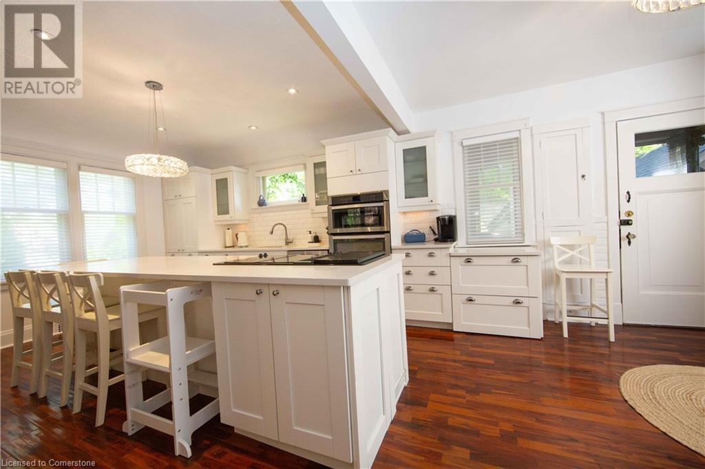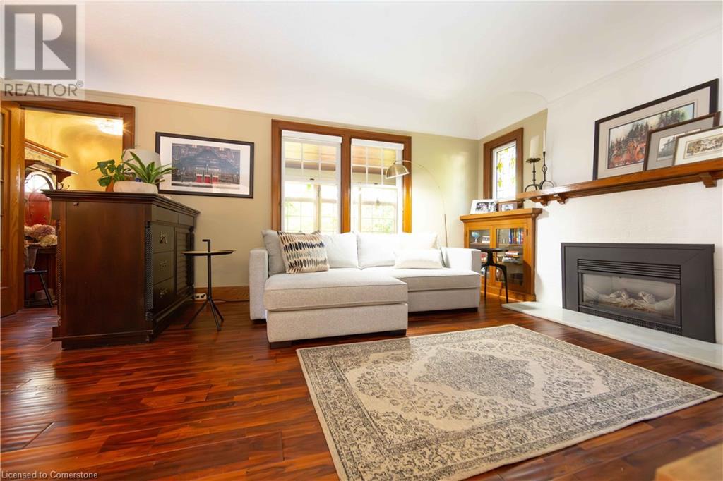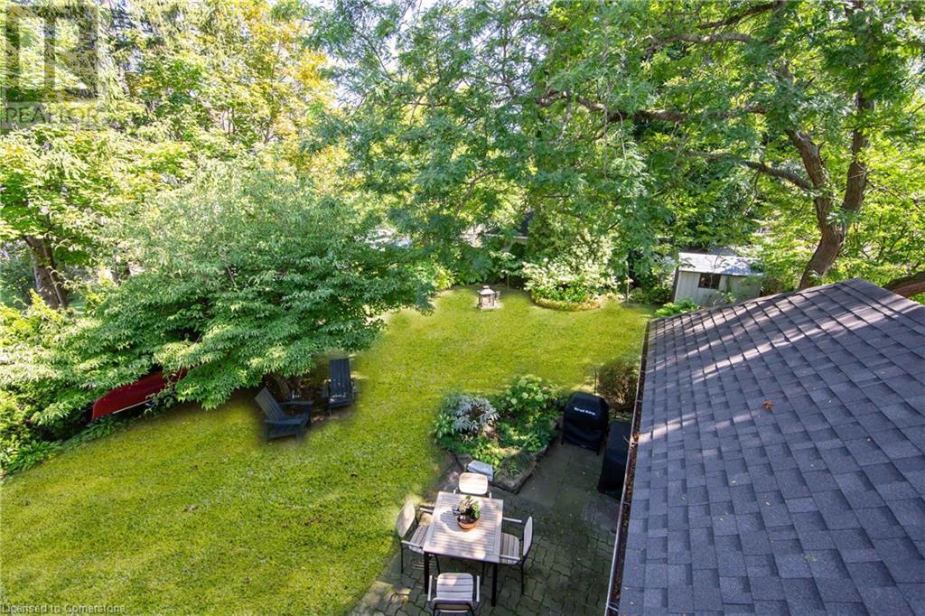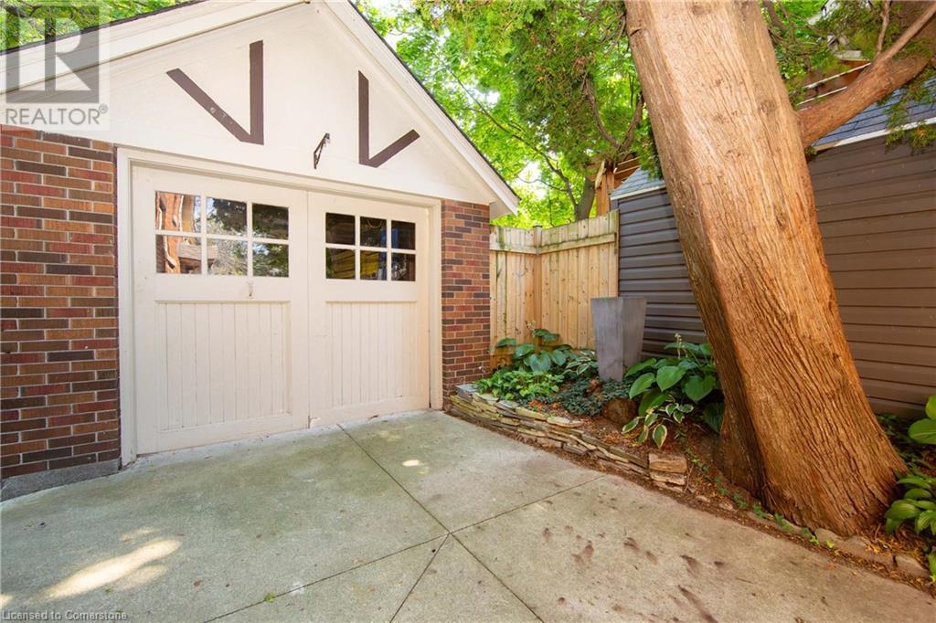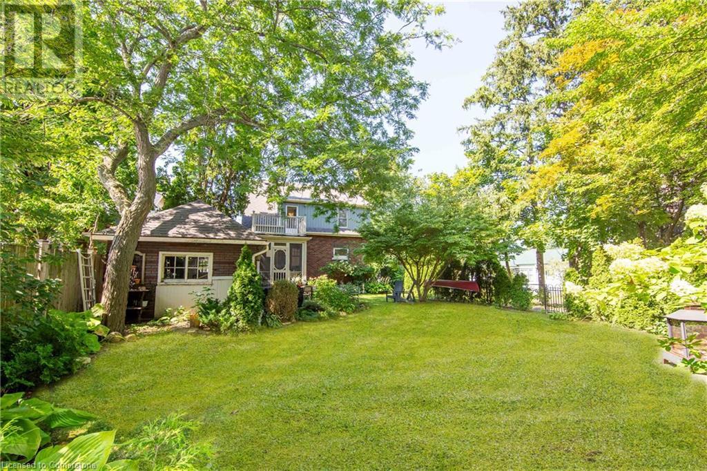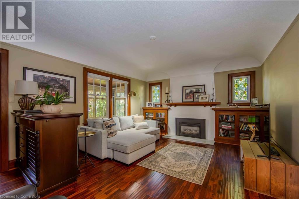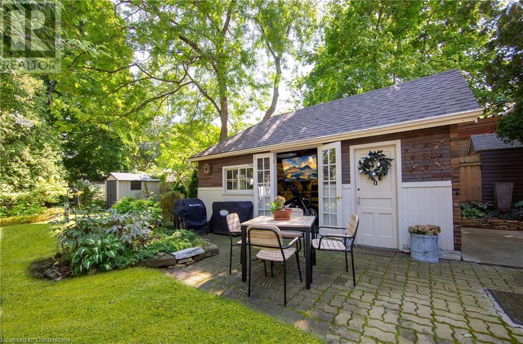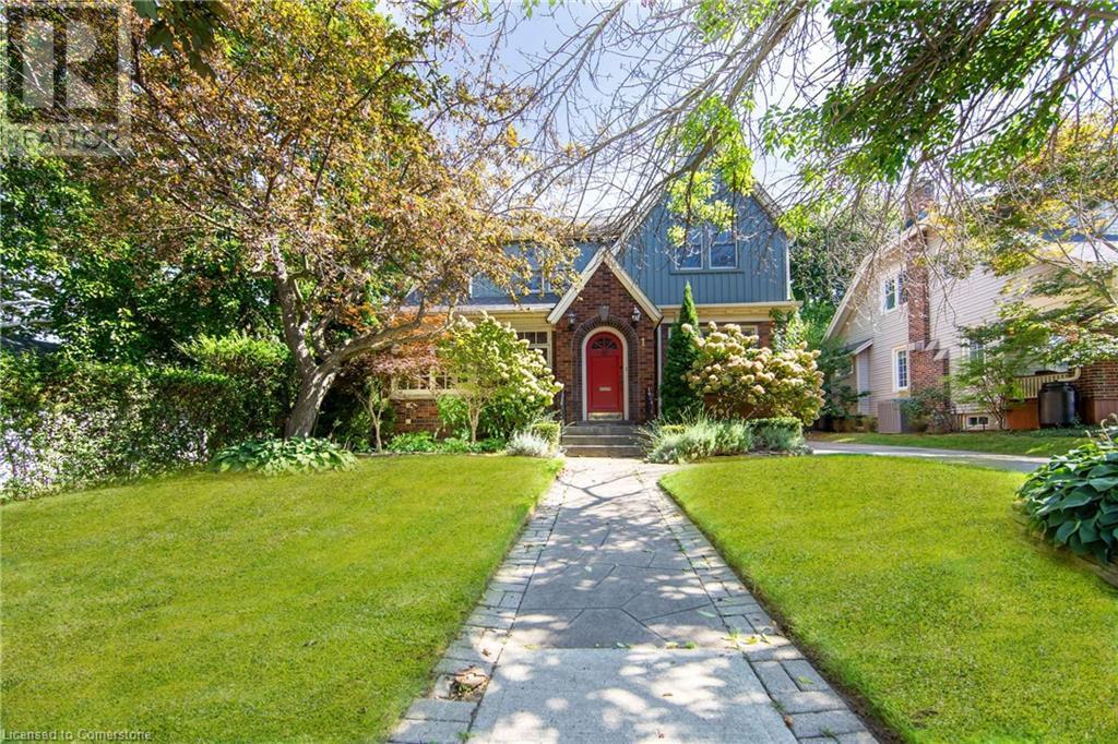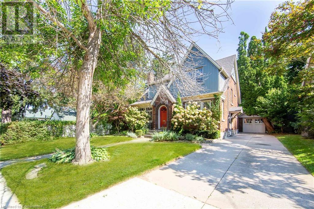 Welcome to this Classic Tudor style beauty in the historic Nelles Boulevard neighbourhood known as the Boulevard of Dreams. Built in 1938 by H.G. Schafer, this home exudes timeless charm with its lush gardens, mature trees and classic half-timber masonry. The gabled roof and detailed doorway add to its captivating curb appeal. Inside, you'll find a perfect blend of original features and modern updates. The home boasts refinished original hardwood floors, stained glass windows, and vintage glass knobs, complemented by built-ins that highlight its character. The bright open-concept kitchen is a true focal point, featuring Caesarstone quartz countertops, an oversized island, custom Italian pendant lighting, and a built-in JennAir electric cooktop with downdraft fant. The original ironing board, cleverly transformed into a sideboard, adds a charming touch. The separate dining room is perfect for formal occasions, while the cozy living room offers a temperature controlled gas fireplace. Enjoy your morning coffee or evening wine in the enclosed front sunroom, back sun porch, or on the upper level deck. This property features 3 spacious bedrooms, 1+1 baths, and a detached garage with unique sliding door. The private backyard even offers a retractable TV for outdoor movie nights under the stars. A truly unique and historic property-don't miss out! (id:55009)