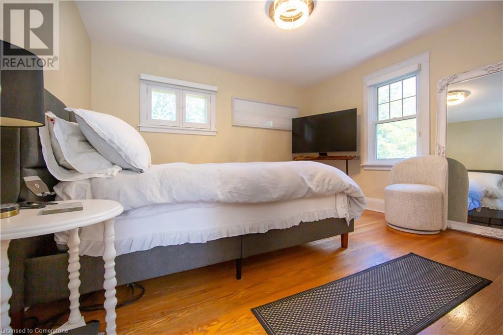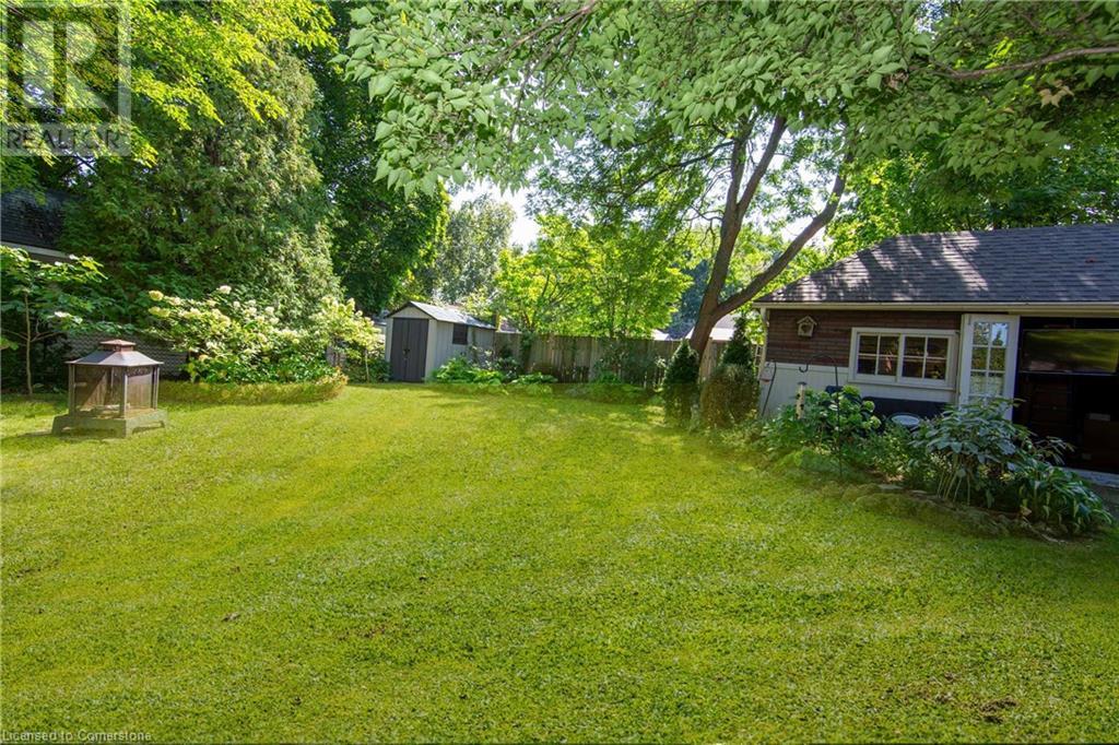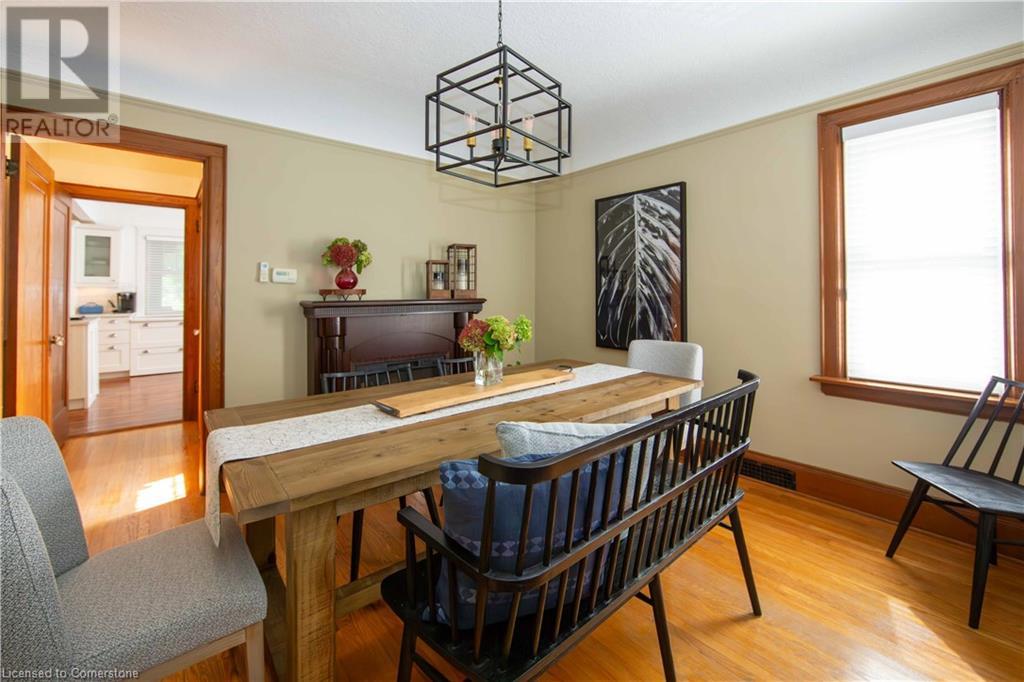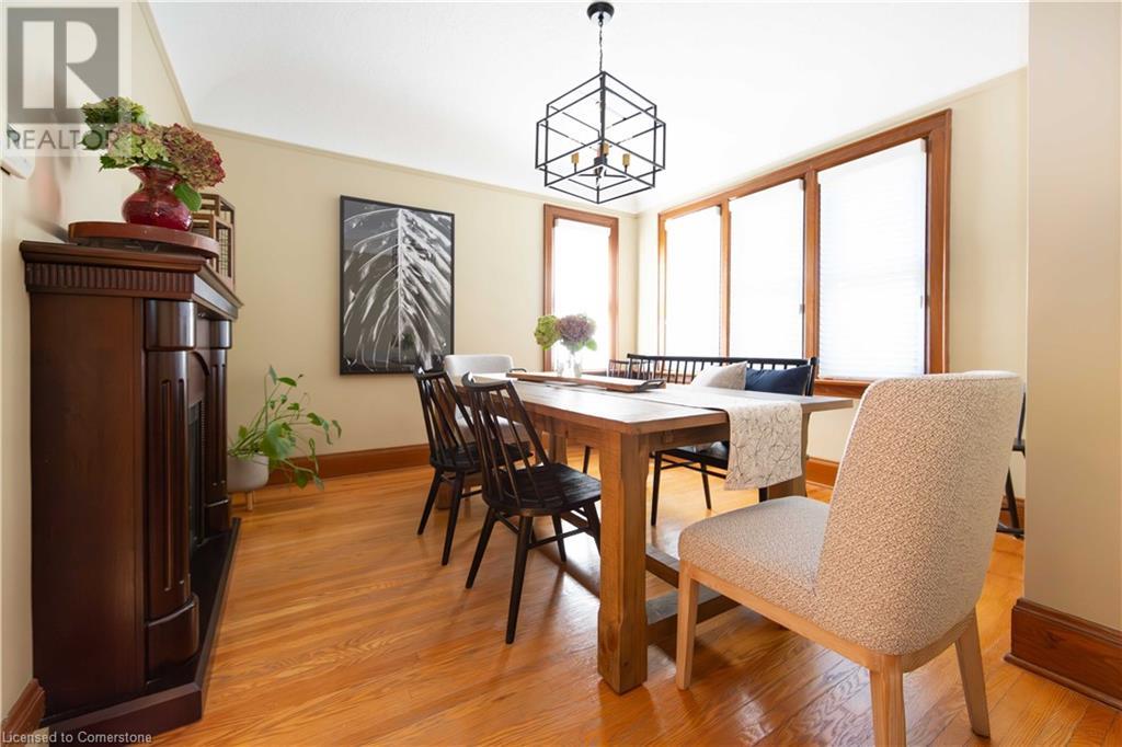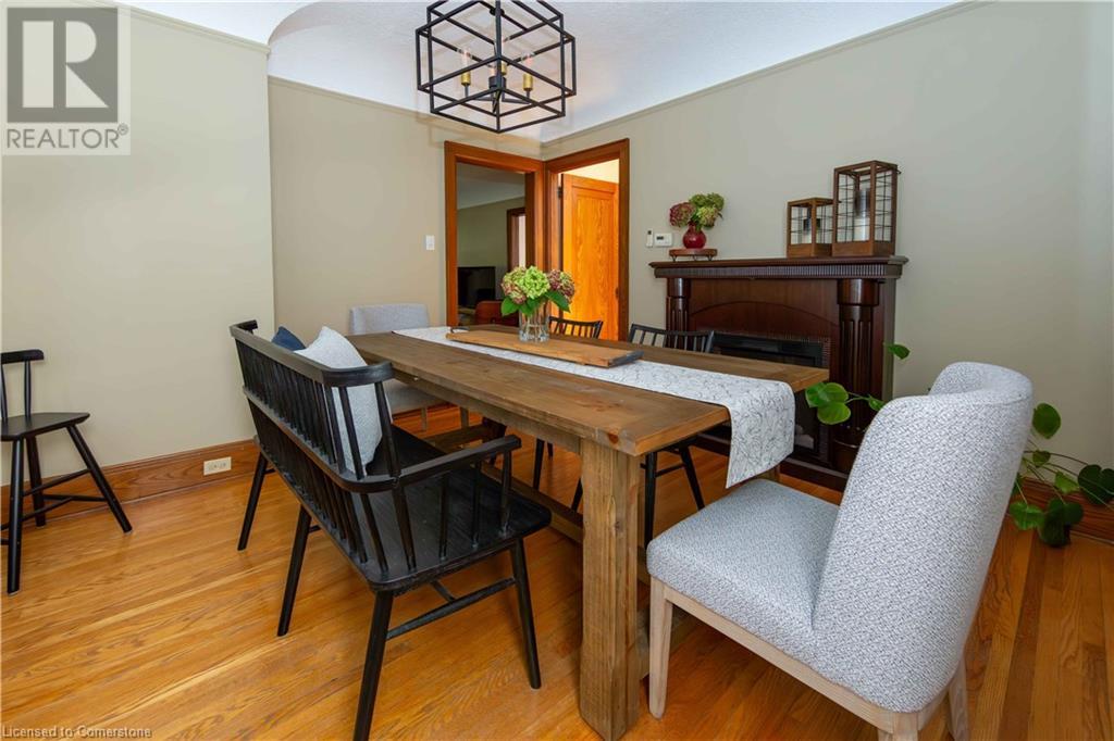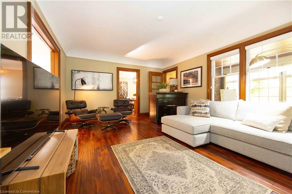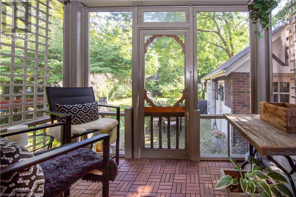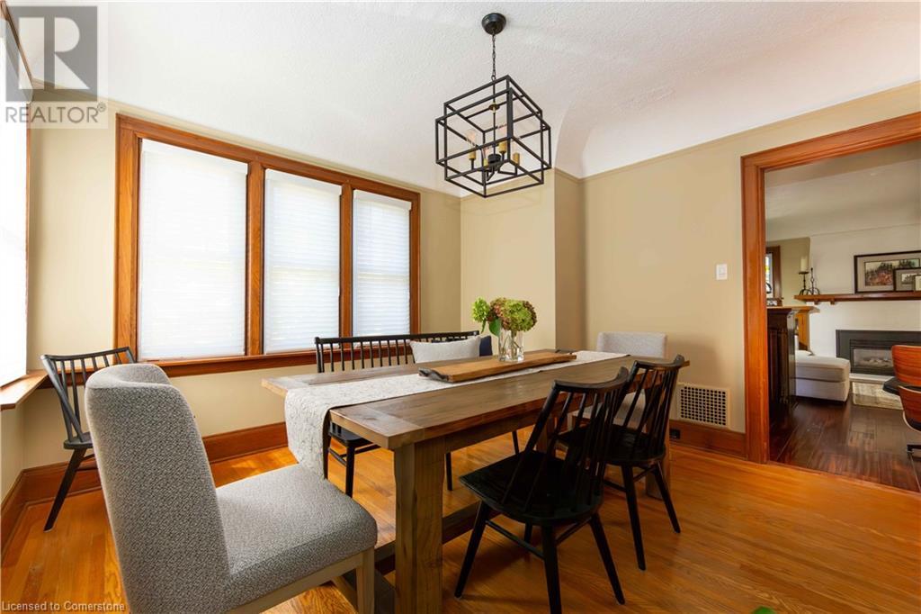Welcome to this Classic Tudor style beauty in the historic Nelles Boulevard neighbourhood known as the Boulevard of Dreams. Built in 1938 by H.G. Schafer, this home exudes timeless charm with its lush gardens, mature trees and classic half-timber masonry. The gabled roof and detailed doorway add to its captivating curb appeal. Inside, you'll find a perfect blend of original features and modern updates. The home boasts refinished original hardwood floors, stained glass windows, and vintage glass knobs, complemented by built-ins that highlight its character. The bright open-concept kitchen is a true focal point, featuring Caesarstone quartz countertops, an oversized island, custom Italian pendant lighting, and a built-in JennAir electric cooktop with downdraft fant. The original ironing board, cleverly transformed into a sideboard, adds a charming touch. The separate dining room is perfect for formal occasions, while the cozy living room offers a temperature controlled gas fireplace. Enjoy your morning coffee or evening wine in the enclosed front sunroom, back sun porch, or on the upper level deck. This property features 3 spacious bedrooms, 1+1 baths, and a detached garage with unique sliding door. The private backyard even offers a retractable TV for outdoor movie nights under the stars. A truly unique and historic property-don't miss out! (id:55009)