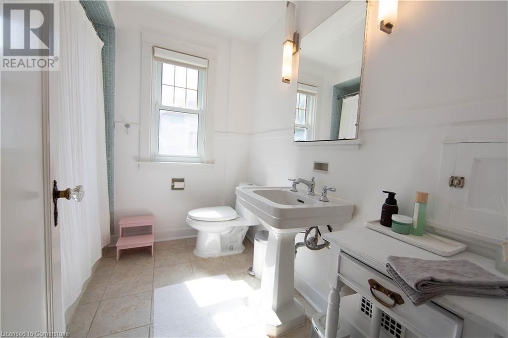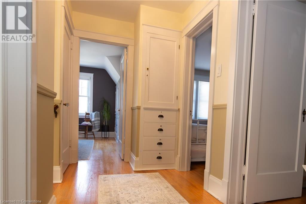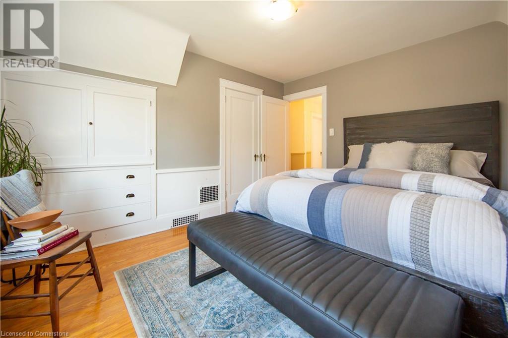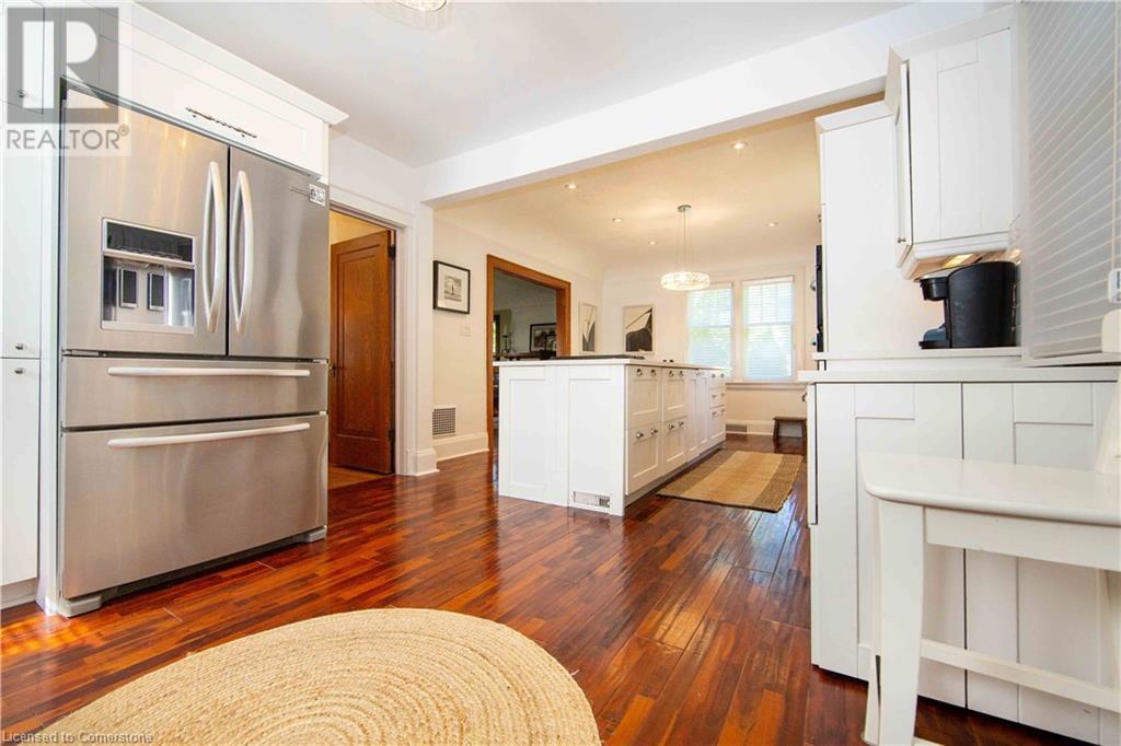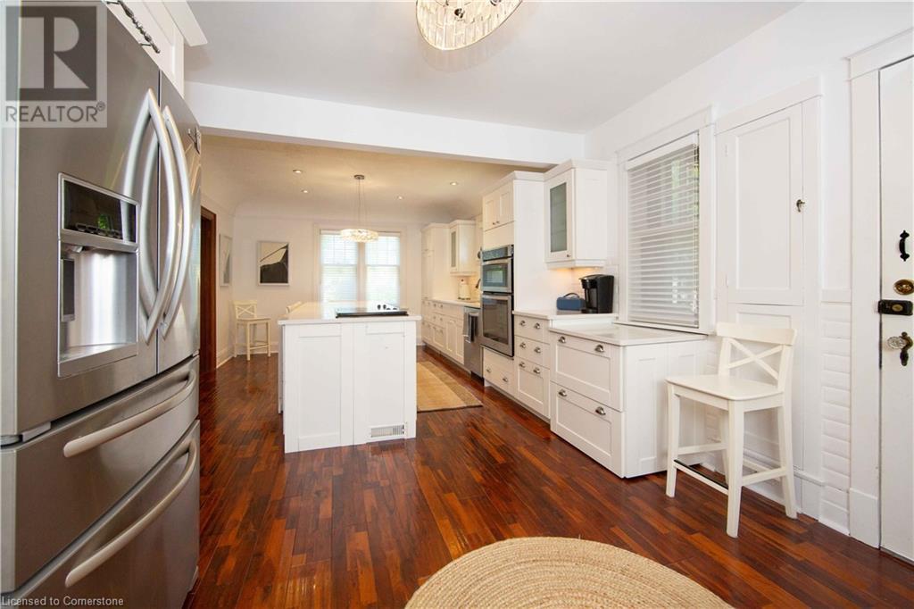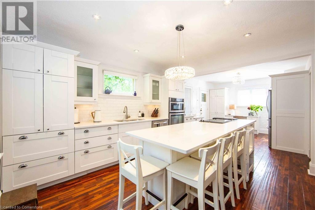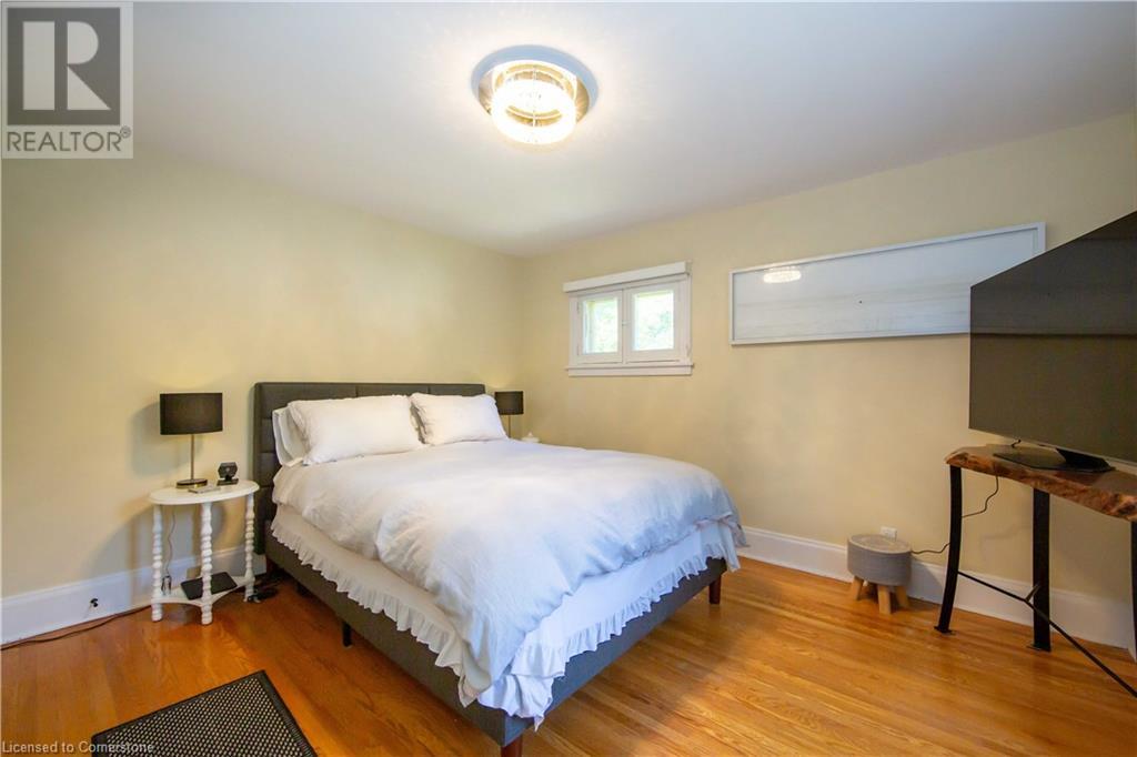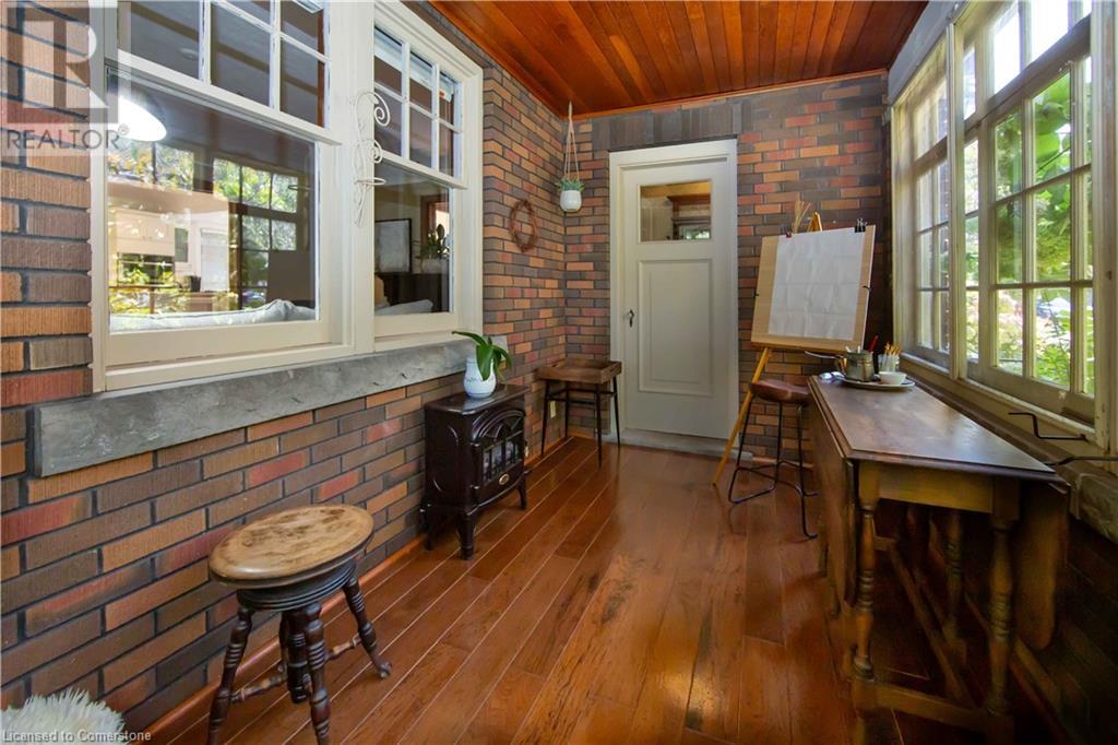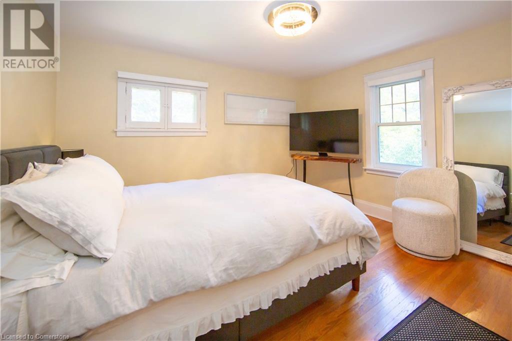 Welcome to this Classic Tudor style beauty in the historic Nelles Boulevard neighbourhood known as the Boulevard of Dreams. Built in 1938 by H.G. Schafer, this home exudes timeless charm with its lush gardens, mature trees and classic half-timber masonry. The gabled roof and detailed doorway add to its captivating curb appeal. Inside, you'll find a perfect blend of original features and modern updates. The home boasts refinished original hardwood floors, stained glass windows, and vintage glass knobs, complemented by built-ins that highlight its character. The bright open-concept kitchen is a true focal point, featuring Caesarstone quartz countertops, an oversized island, custom Italian pendant lighting, and a built-in JennAir electric cooktop with downdraft fant. The original ironing board, cleverly transformed into a sideboard, adds a charming touch. The separate dining room is perfect for formal occasions, while the cozy living room offers a temperature controlled gas fireplace. Enjoy your morning coffee or evening wine in the enclosed front sunroom, back sun porch, or on the upper level deck. This property features 3 spacious bedrooms, 1+1 baths, and a detached garage with unique sliding door. The private backyard even offers a retractable TV for outdoor movie nights under the stars. A truly unique and historic property-don't miss out! (id:55009)