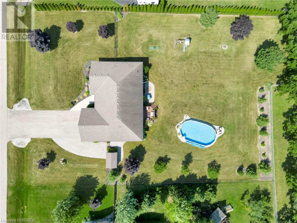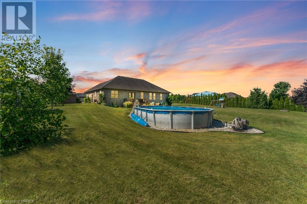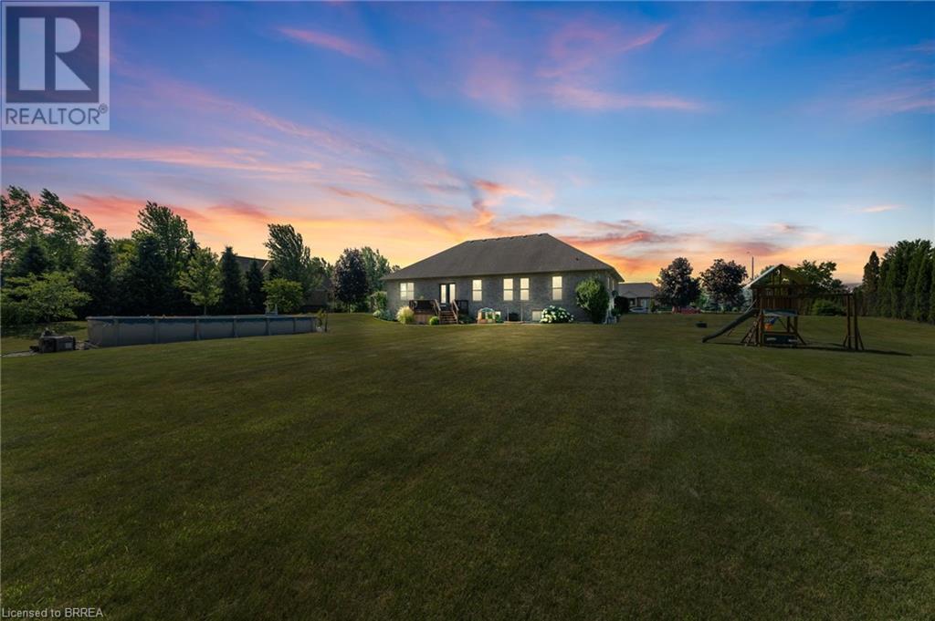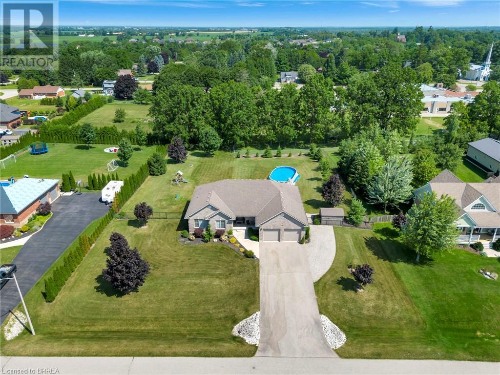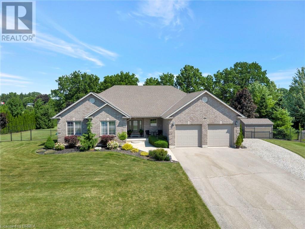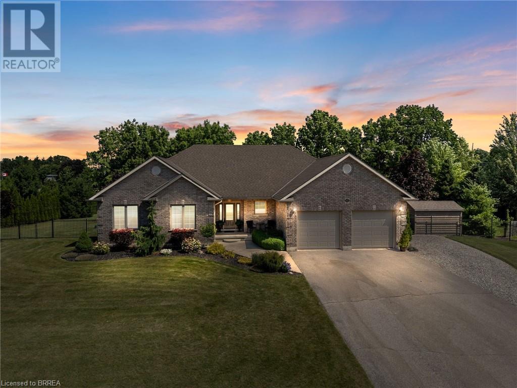 Dreaming of living in style? This exceptional all brick bungalow welcomes you with its quiet elegance. Impeccably maintained, situated on a 3/4 acre lot in a picturesque neighborhood in the tranquil village of Scotland. Exuding curb appeal with the striking front landscaping, rod iron fence, large driveway & a remarkable 152 foot frontage. Built in 2009 w. over 3000sq. ft. of finished living space this home will not disappoint. The large foyer will greet your guests. Open concept living on the main floor makes entertaining a breeze w. dining rm, living rm, kitchen & family rm. The kitchen offers abundant custom maple cabinets & gas stove for the serious cook, a breakfast bar, easy care flooring, carpet free. Convenient main floor laundry rm with access to the oversized 2 car garage. The primary bedroom entices w. a large walk-in closet plus ensuite with soaker tub & separate shower. Two spacious bedrooms share the 4pc bath. Still working from home? There is a main floor office. The finished basement is a treat w. oversized windows providing a ton of natural light. Stunningly large rec room, games room with bar for all your additional entertaining needs. Den or future bedroom/ office. Workshop, potential bedroom. A 2-pc bath, large utility room & cold storage complete the lower level. Beautifully landscaped, above ground pool, extensive yard. This is a beauty! Walking distance to Oakland/ Scotland Public School, Scotland Food Market/ LCBO & short 25- minute drive to downtown Brantford. (id:55009)