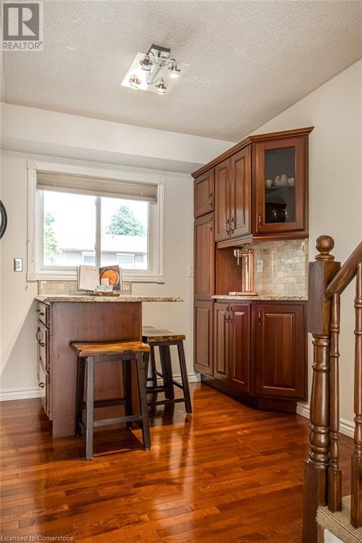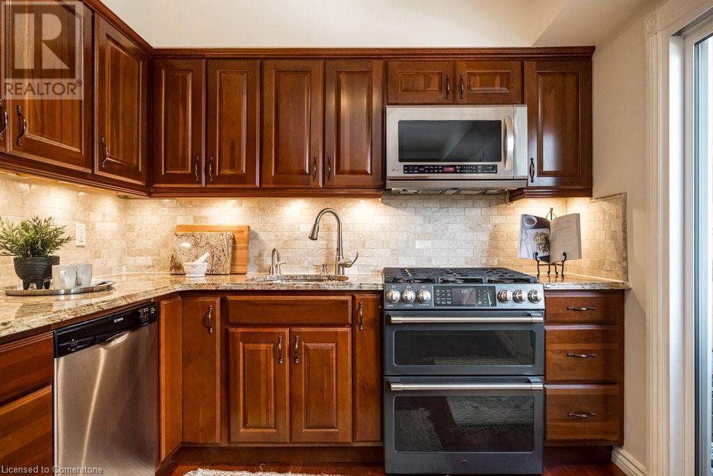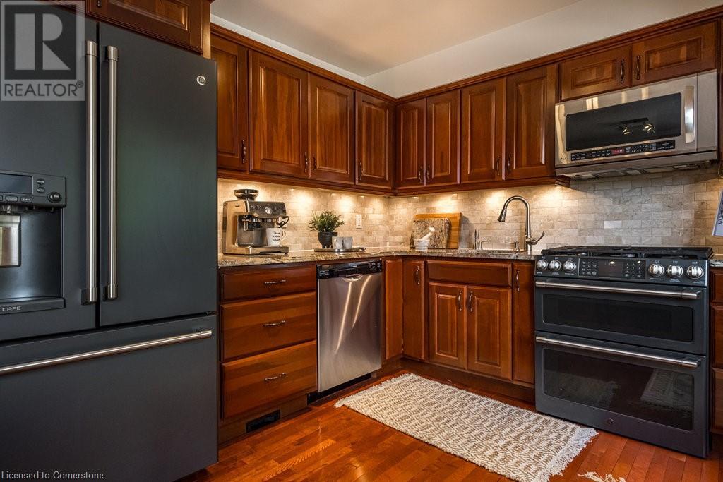 $406.02 MonthlyThis stunning end-unit townhome offers an exceptional blend of luxury and convenience. With 3 bedrooms, 2 baths, and over 1700 square feet of living space, this home is filled with high-end finishes and luxurious upgrades. The open-concept main floor is perfect for entertaining, featuring a spacious living room, a formal dining room, and a beautiful custom kitchen. The kitchen boasts an island, upgraded appliances including a Cafe series fridge and gas range, granite countertops, and completely upgraded cabinetry with convenient features such as pot/pan drawers, a pantry, spice drawers, and a recycling area. You can also access the balcony from the kitchen, making it ideal for outdoor grilling and relaxation. Upstairs, you'll find 3 generously sized bedrooms, each with ample closet space. The lower level offers a versatile space that can be used as a home office, recreation area, or peaceful retreat. It includes a gas fireplace with a thermostat and a walk-out to the fully fenced yard, which features a brand new aggregate patio. This family-friendly neighbourhood is truly unbeatable, backing onto shared green space ideal for children and pets. It's conveniently located near schools, a recreation center, a conservation area, and a golf course, with easy access to the Red Hill and Linc expressways. You'll also find all other amenities close by, including entertainment, restaurants, and shopping. (id:55009)