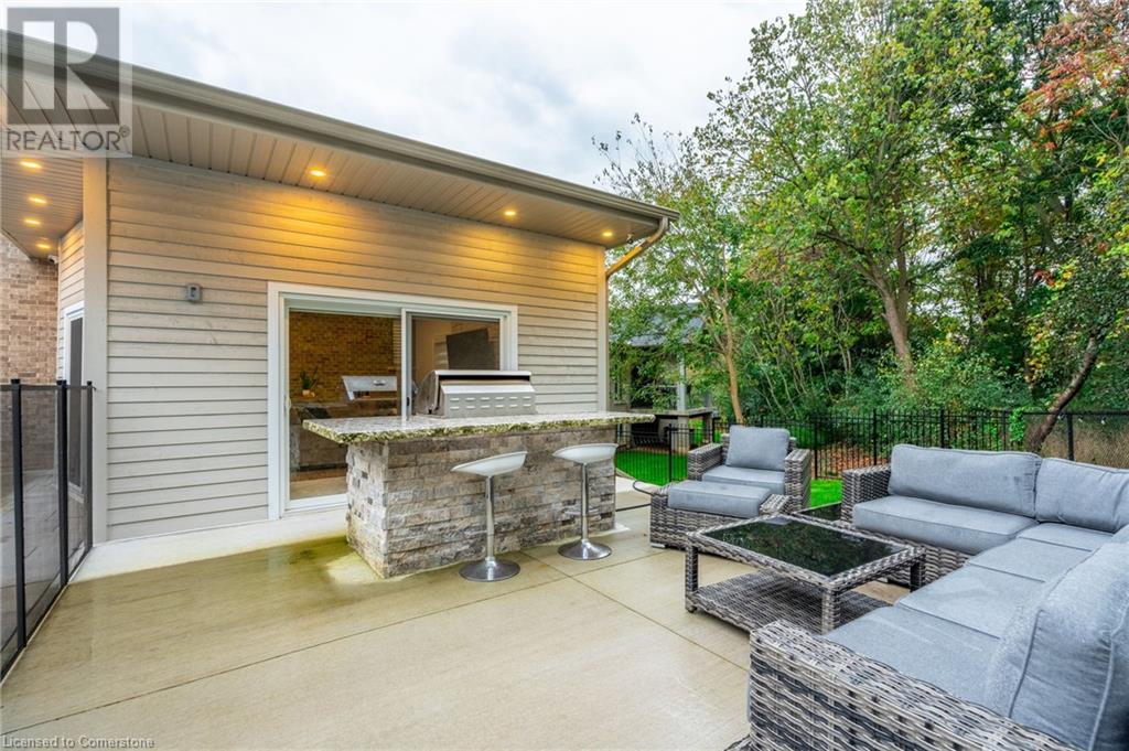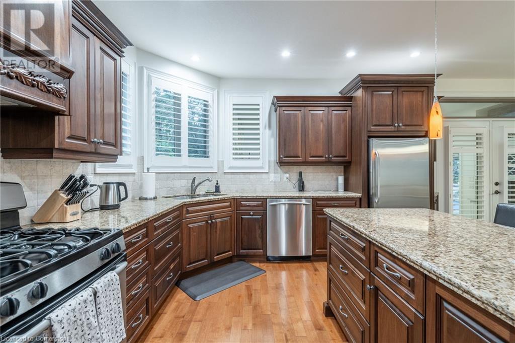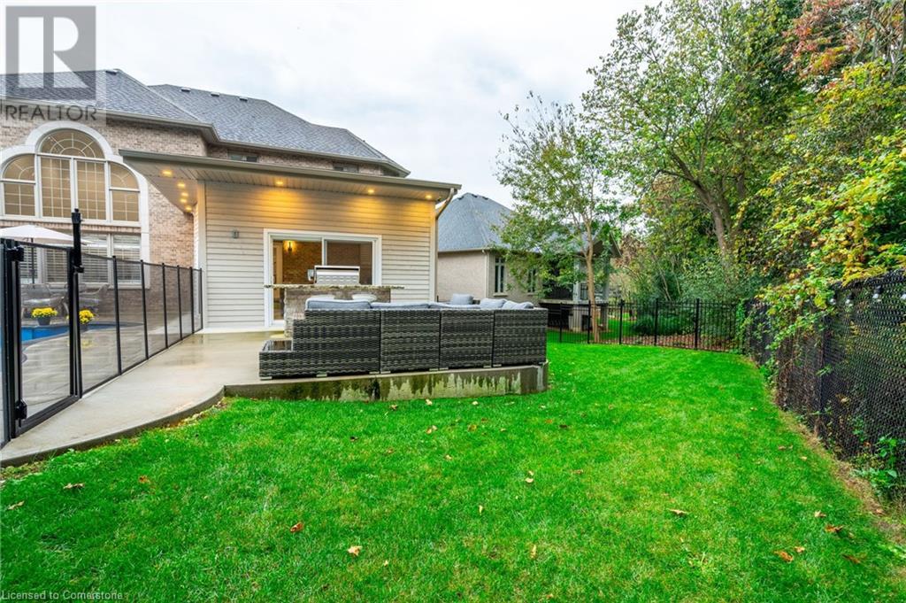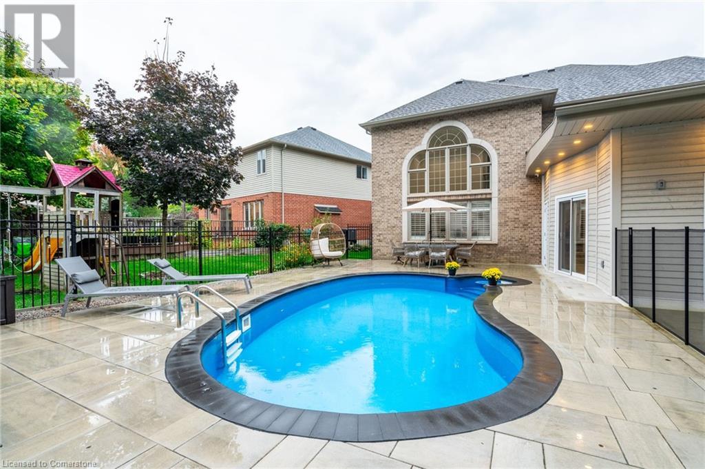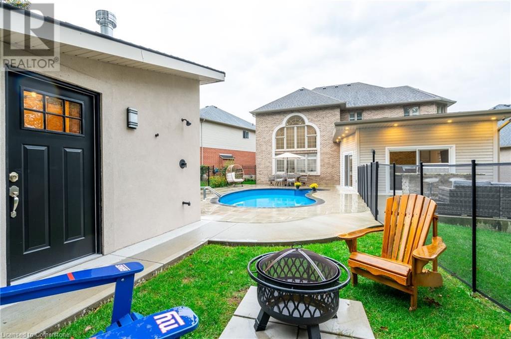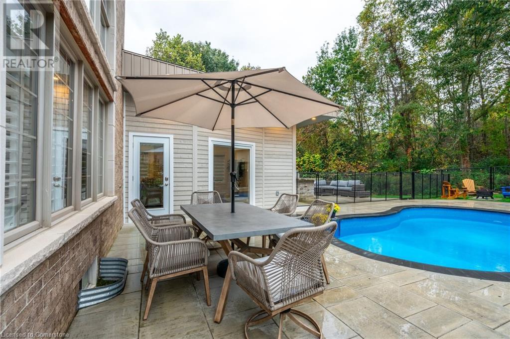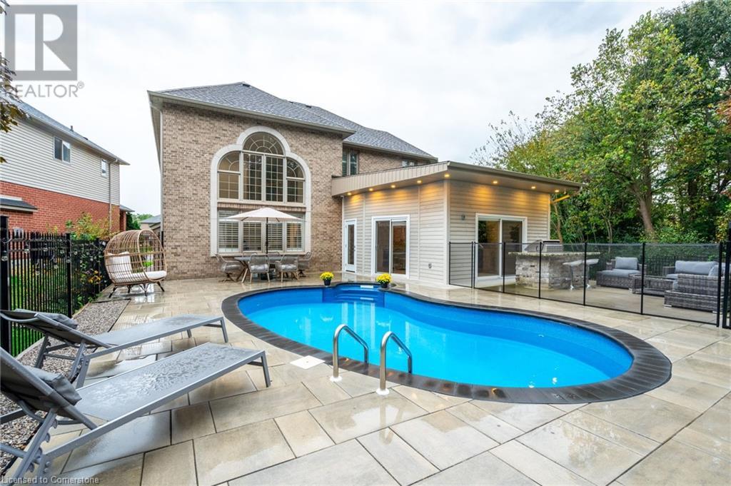 Custom-built home backing onto Dundas Conservation lands, offering a true backyard oasis. It features a new saltwater pool with custom paving stones, a pool house with a 2-piece bath, an outdoor shower, and a built-in BBQ. The newly built addition includes patio doors leading to the backyard, which boasts a wet bar, exposed brick, a TV, and a gas fireplace. Inside, this stunning, well-kept home offers over 3,400 sq. ft. of living space with hardwood floors on both the main and bedroom levels, pot lights, 9 ft ceilings, and vaulted 19 ft ceilings in the family room. The home also includes California shutters, an upgraded staircase and railings, a custom gourmet kitchen with stainless steel appliances, 3 bedrooms, bedroom-level laundry, a 5-piece primary ensuite, and a 4-piece guest bath. Located in a quiet court location with a 3-car garage (1 tandem space) , the property also features an aggregate concrete driveway and walkway. 200 AMP service. Enjoy leisurely walks to the nearby Dundas Conservation Area or tee off at the Dundas Valley Golf Course . (id:55009)