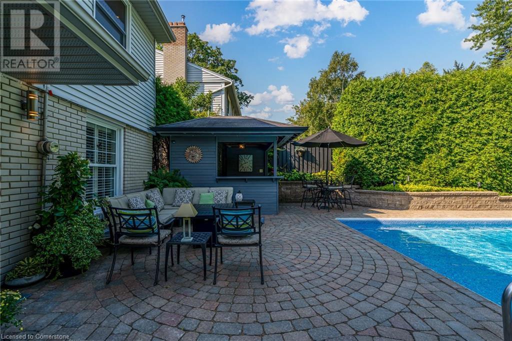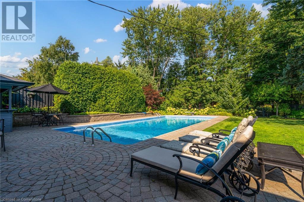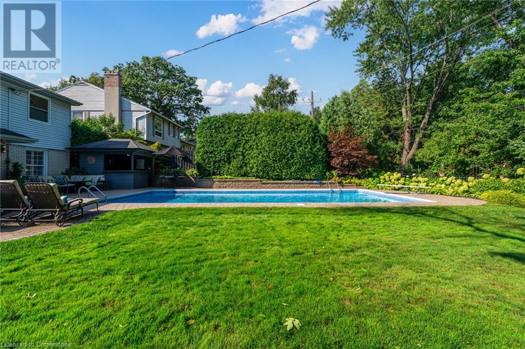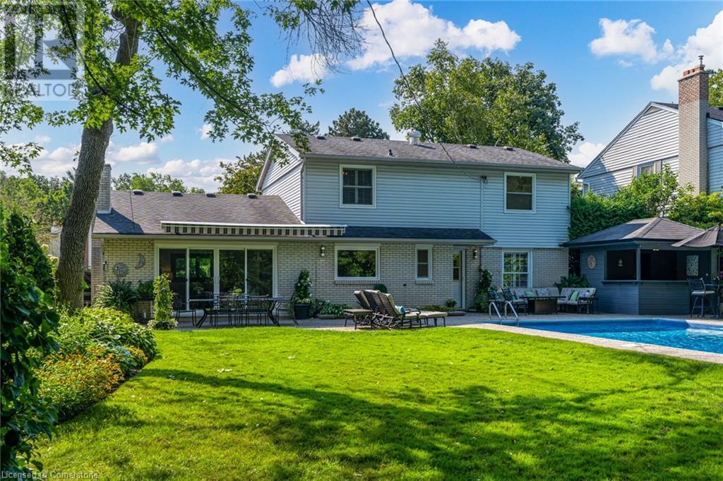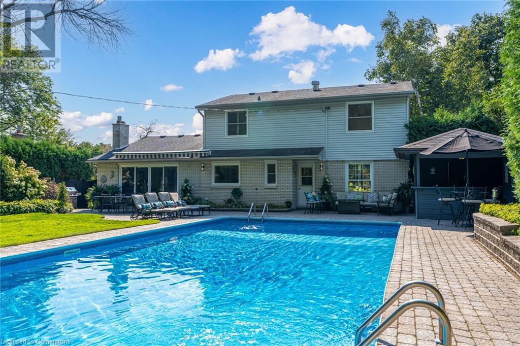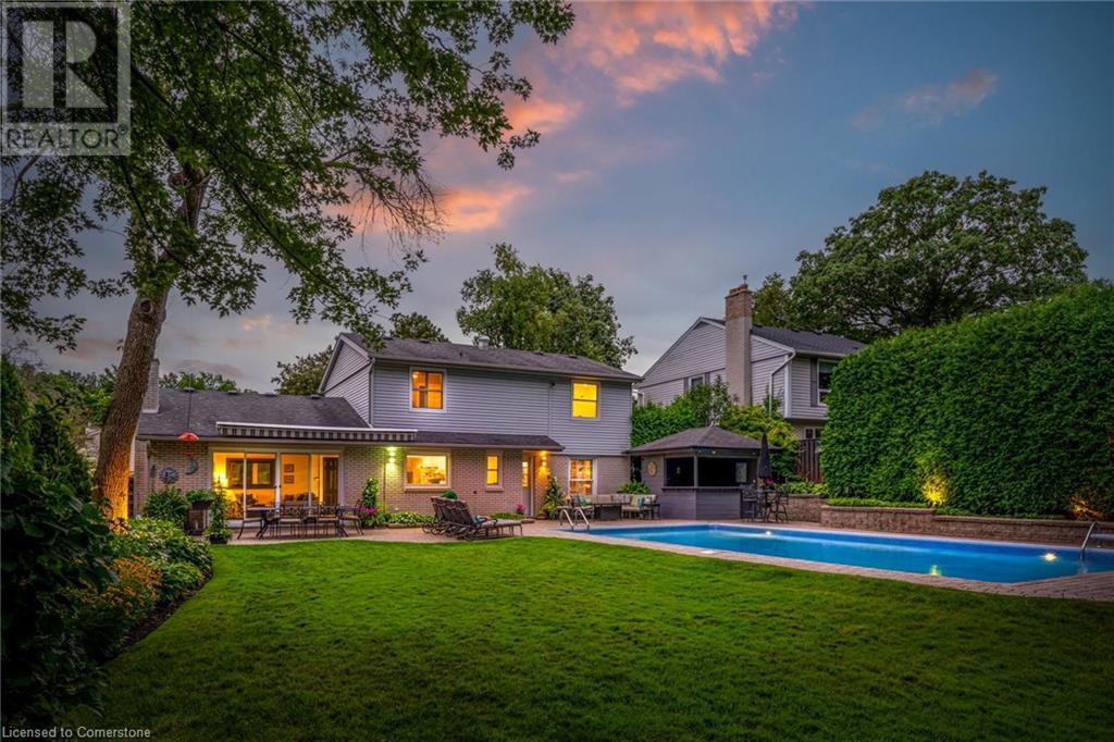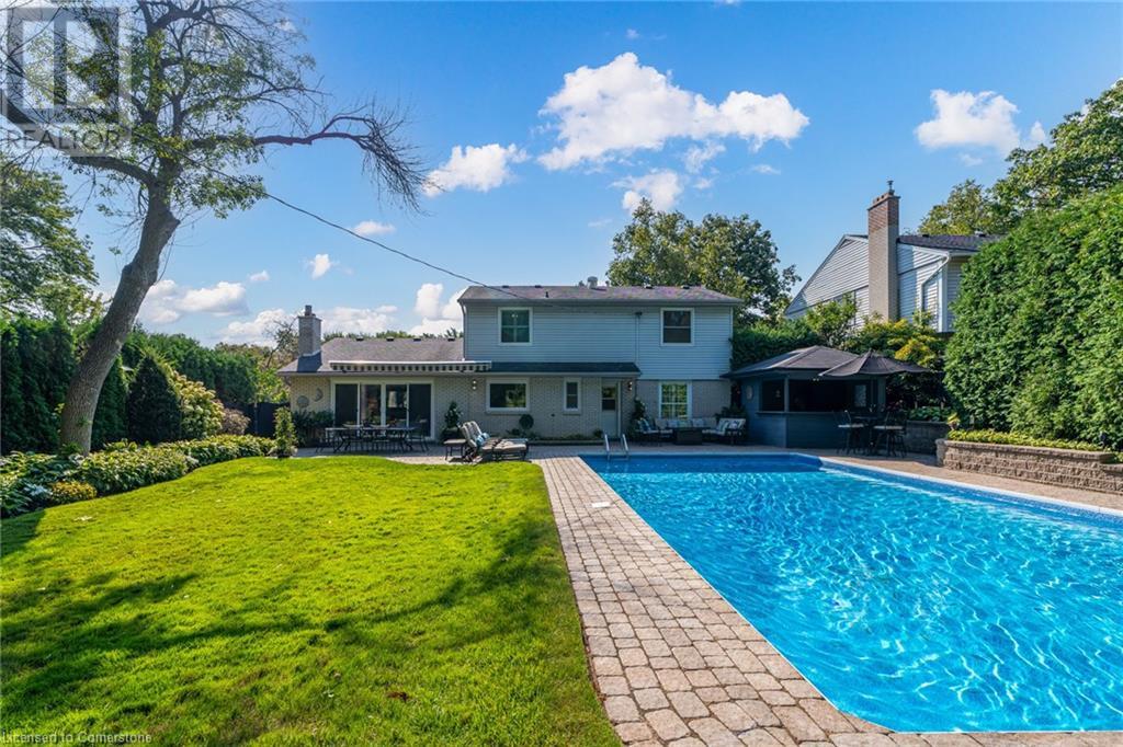 BEAUTIFUL 2-storey family home in the established Tyandaga neighbourhood impeccably maintained. This 3 bedrm, 2.5 bathrm home has just under 2000 sq ft, in-ground pool & backs onto Tyandaga Golf Course! The main floor marries a traditional floor plan with a formal living & dining room that opens up to the detailed contemporary elements of the kitchen & family room. The kitchen features honed black granite countertops, stainless steel appliances & linear tiled backsplash, with pot lights, a large window overlooking the pool & a peninsula that borders the family rm. The decorative wood beams & gas fireplace can be seen from the kitchen with convenient large glass sliding doors that add a vast amount of natural light & easy access to the backyard. The second level features 3 bedrms, hardwd floors & updated windows. The primary spa-like ensuite features a high-end white soaker tub, heated floors, large glass shower & custom white vanity with quartz countertops & a great amount of storage. The 2nd level is complete with a 2nd 4-piece bathrm with a double vanity & glass shower with subway tile. Basement features two great flex spaces & adds an additional 1000+ square feet of living space, perfect for a recreation room, theatre room, gym, home office, complete with patterned tiled flooring in the laundry & spacious storage room. Built-in wall of cabinet’s offers large storage options. The exterior of the home is fabulous with the very large PRIVATE backyard having incredible amenities such as a cedar bar/cabana & changing room, in-ground pool with a diving board, updated liner & pump, three lounge spaces on the interlock patio, TWO gas hook ups for BBQs, storage shed & a large grass area that all backs onto the Tyandaga Golf Course. The backyard is an entertainers dream. With a 2-car garage & 4-car concrete laneway this home is walking distance to parks and shops & a very short drive to all that Downtown Burlington has to offer, schools, Bruce Trail & all major highways. (id:55009)
