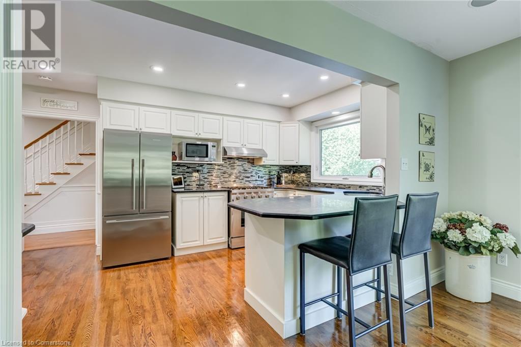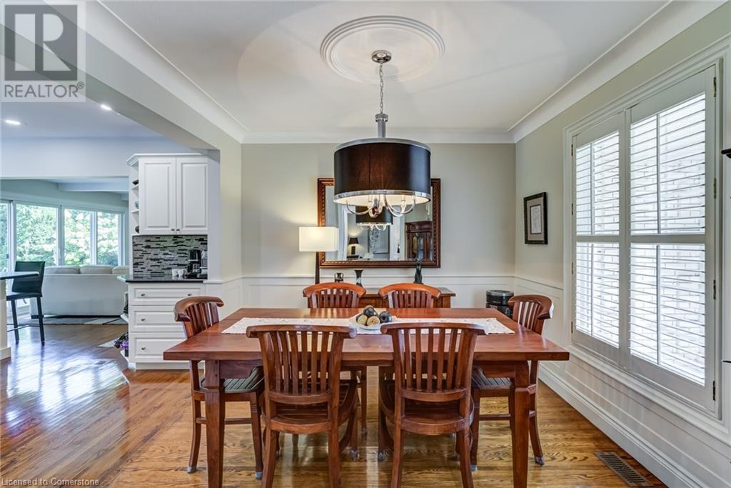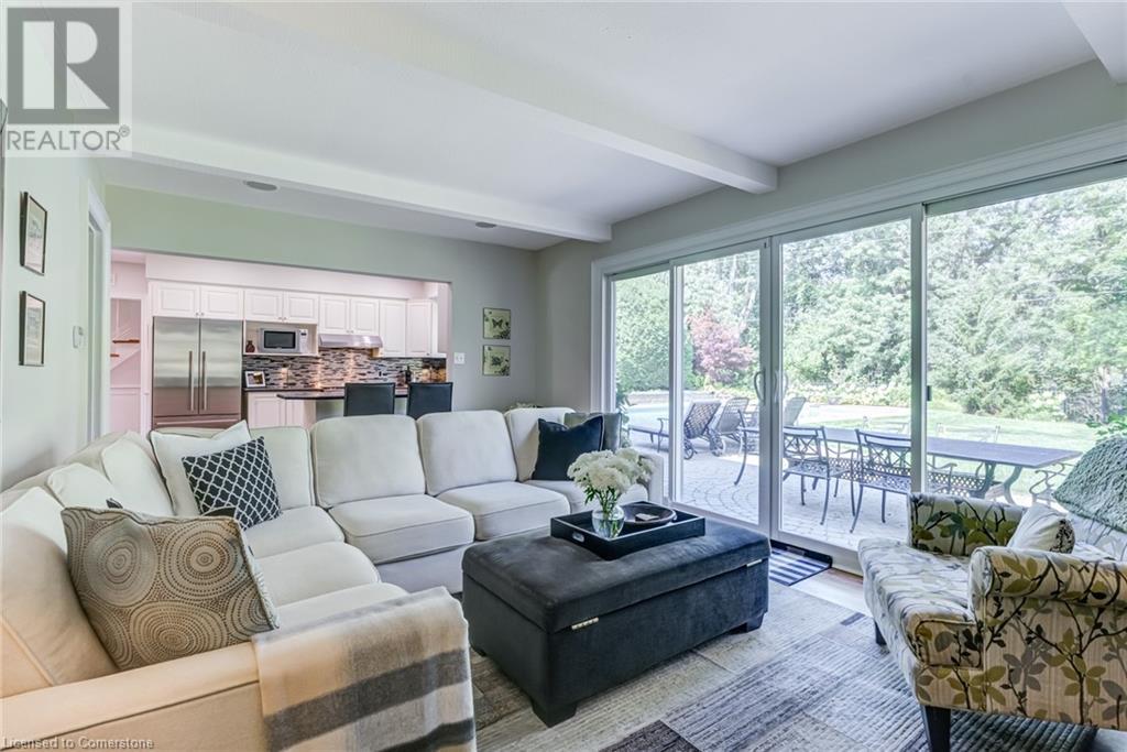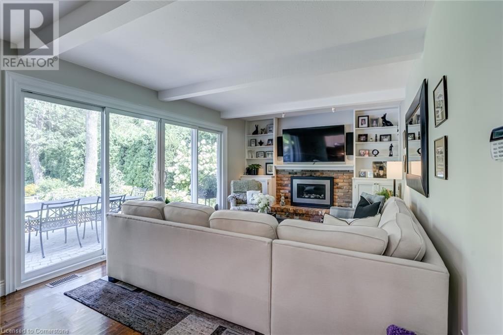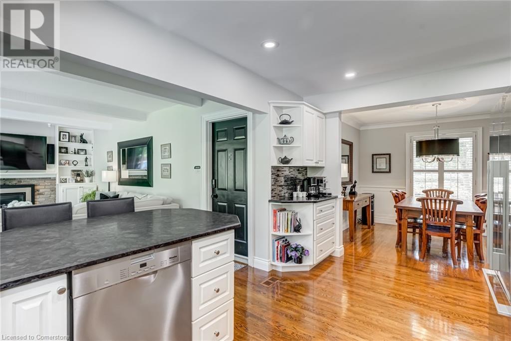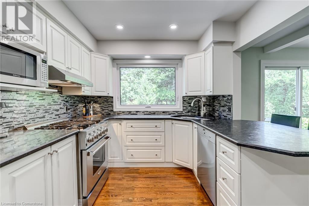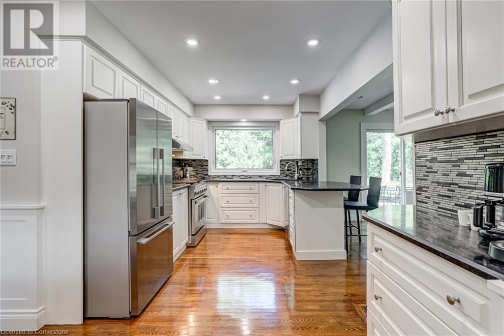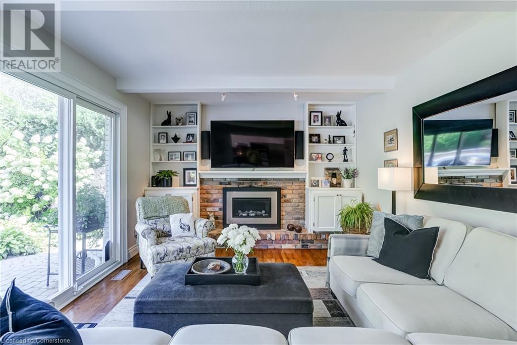 BEAUTIFUL 2-storey family home in the established Tyandaga neighbourhood impeccably maintained. This 3 bedrm, 2.5 bathrm home has just under 2000 sq ft, in-ground pool & backs onto Tyandaga Golf Course! The main floor marries a traditional floor plan with a formal living & dining room that opens up to the detailed contemporary elements of the kitchen & family room. The kitchen features honed black granite countertops, stainless steel appliances & linear tiled backsplash, with pot lights, a large window overlooking the pool & a peninsula that borders the family rm. The decorative wood beams & gas fireplace can be seen from the kitchen with convenient large glass sliding doors that add a vast amount of natural light & easy access to the backyard. The second level features 3 bedrms, hardwd floors & updated windows. The primary spa-like ensuite features a high-end white soaker tub, heated floors, large glass shower & custom white vanity with quartz countertops & a great amount of storage. The 2nd level is complete with a 2nd 4-piece bathrm with a double vanity & glass shower with subway tile. Basement features two great flex spaces & adds an additional 1000+ square feet of living space, perfect for a recreation room, theatre room, gym, home office, complete with patterned tiled flooring in the laundry & spacious storage room. Built-in wall of cabinet’s offers large storage options. The exterior of the home is fabulous with the very large PRIVATE backyard having incredible amenities such as a cedar bar/cabana & changing room, in-ground pool with a diving board, updated liner & pump, three lounge spaces on the interlock patio, TWO gas hook ups for BBQs, storage shed & a large grass area that all backs onto the Tyandaga Golf Course. The backyard is an entertainers dream. With a 2-car garage & 4-car concrete laneway this home is walking distance to parks and shops & a very short drive to all that Downtown Burlington has to offer, schools, Bruce Trail & all major highways. (id:55009)