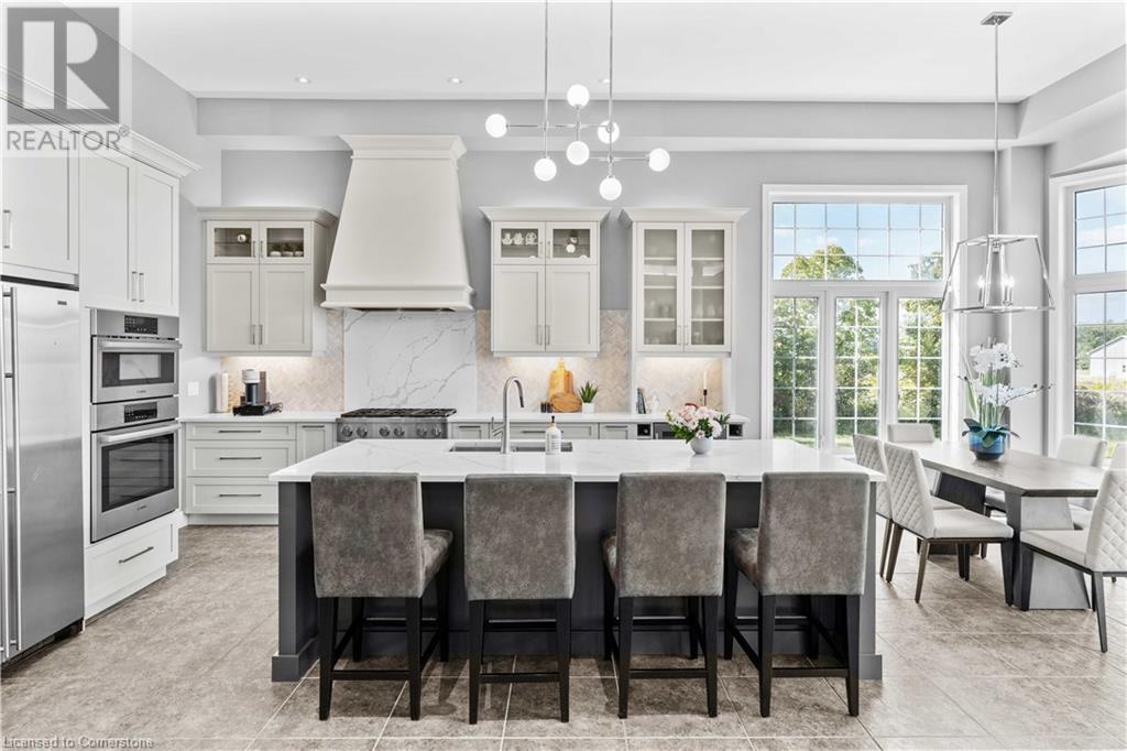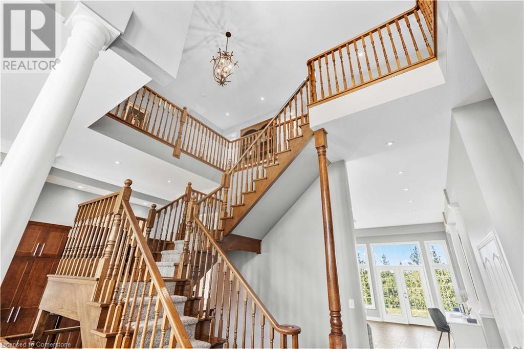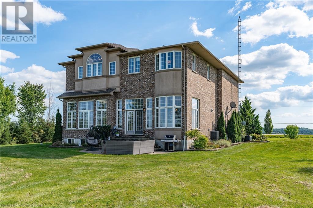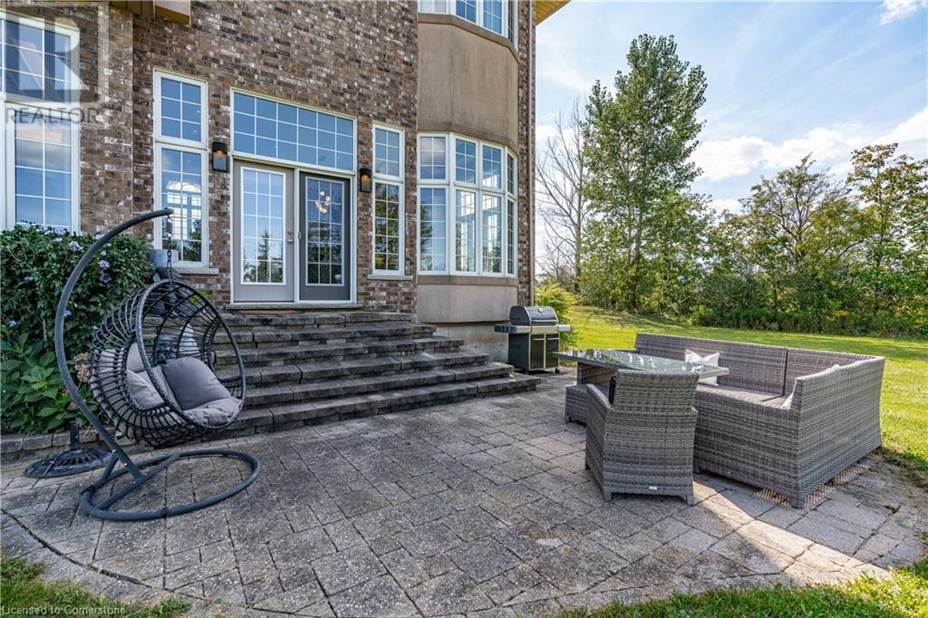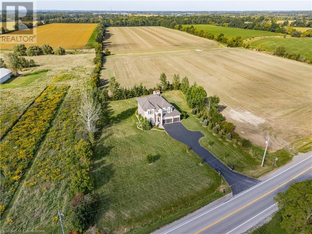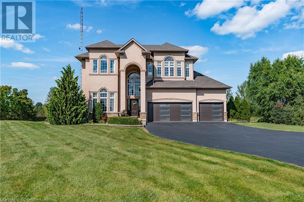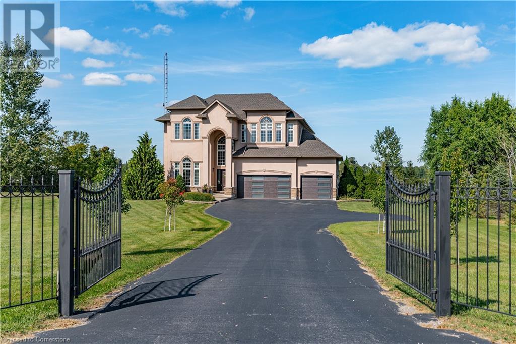 Discover your dream home in scenic Brant County! This luxurious 4-bdrm, 4-bath residence offers over 3,885 sq ft of above-grade living space, + a f-fin bsmt on a sprawling 1.334 A private property. As you approach, a gated entrance opens to a long driveway w/ parking for over 10 vehicles & a 4-car grg. Step inside to a grand foyer w/ soaring ceilings. The main flr boasts rich hrdwd flrs, a formal din rm w/ crown moulding & pot lighting, & a sophisticated butler’s servery. The renovated kitch ('19) feat white cabinetry, quartz countertops, JennAir fridge, Dacor gas range, Miele wall oven/microwave/dishwasher, a large island with seating for 4+ & a built-in custom desk. A cozy dinette area w/ oversized windows overlooks the rear yard. The adjoining great room impresses w/ tray ceilings, custom bench seating, & a gas FP. French doors lead to a lush backyard oasis, perfect for relaxation & entertaining. The upper lvl feat a serene primary retreat w/ a lavish 5-pc ensuite & oversized walk-in closet. 3 additional bdrms share a beautifully appointed 5-pc bath. The part-fin lower lvl offers a lrg rec rm w/ a stacked-stone accent wall, an office/den, & ample storage space. Outside, enjoy the interlock patio, fire pit, & mature foliage, offering privacy & tranquility with wildlife sightings. Located minutes from Caledonia, Brantford, Ancaster, & Hamilton, this home blends rural charm with urban convenience—a true sanctuary. (id:55009)