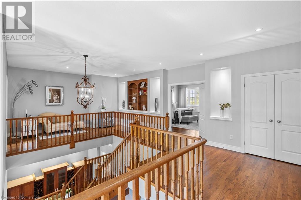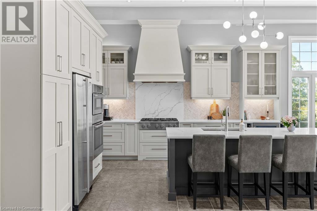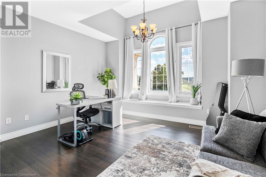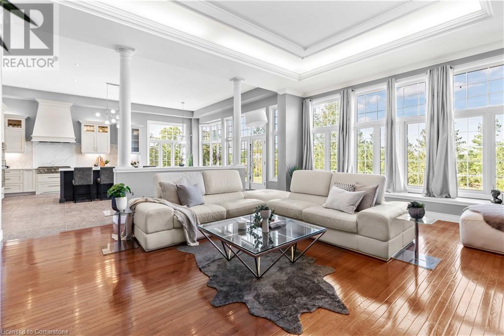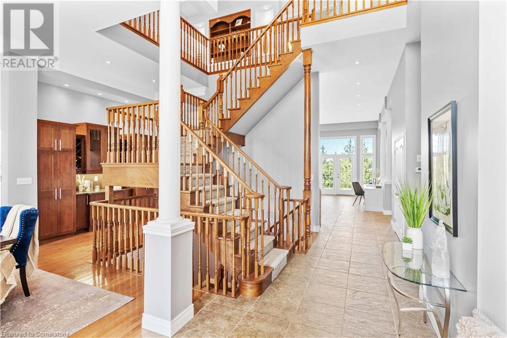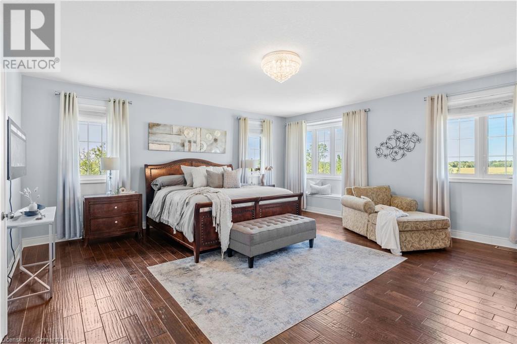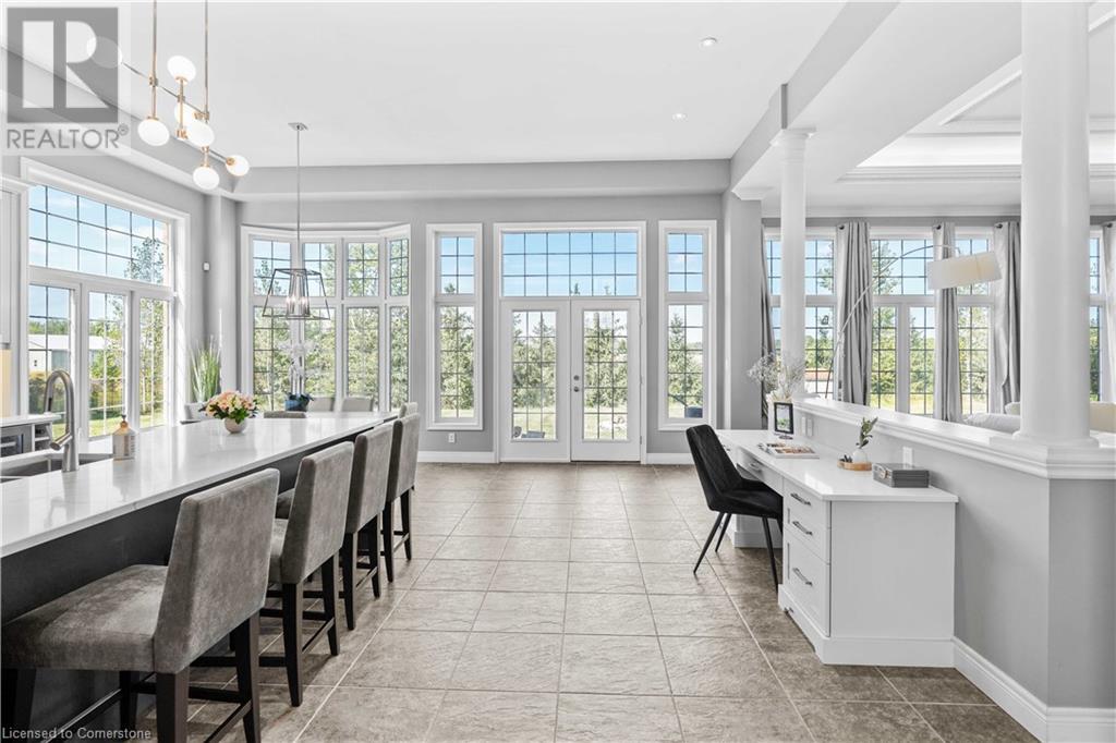 Discover your dream home in scenic Brant County! This luxurious 4-bdrm, 4-bath residence offers over 3,885 sq ft of above-grade living space, + a f-fin bsmt on a sprawling 1.334 A private property. As you approach, a gated entrance opens to a long driveway w/ parking for over 10 vehicles & a 4-car grg. Step inside to a grand foyer w/ soaring ceilings. The main flr boasts rich hrdwd flrs, a formal din rm w/ crown moulding & pot lighting, & a sophisticated butler’s servery. The renovated kitch ('19) feat white cabinetry, quartz countertops, JennAir fridge, Dacor gas range, Miele wall oven/microwave/dishwasher, a large island with seating for 4+ & a built-in custom desk. A cozy dinette area w/ oversized windows overlooks the rear yard. The adjoining great room impresses w/ tray ceilings, custom bench seating, & a gas FP. French doors lead to a lush backyard oasis, perfect for relaxation & entertaining. The upper lvl feat a serene primary retreat w/ a lavish 5-pc ensuite & oversized walk-in closet. 3 additional bdrms share a beautifully appointed 5-pc bath. The part-fin lower lvl offers a lrg rec rm w/ a stacked-stone accent wall, an office/den, & ample storage space. Outside, enjoy the interlock patio, fire pit, & mature foliage, offering privacy & tranquility with wildlife sightings. Located minutes from Caledonia, Brantford, Ancaster, & Hamilton, this home blends rural charm with urban convenience—a true sanctuary. (id:55009)