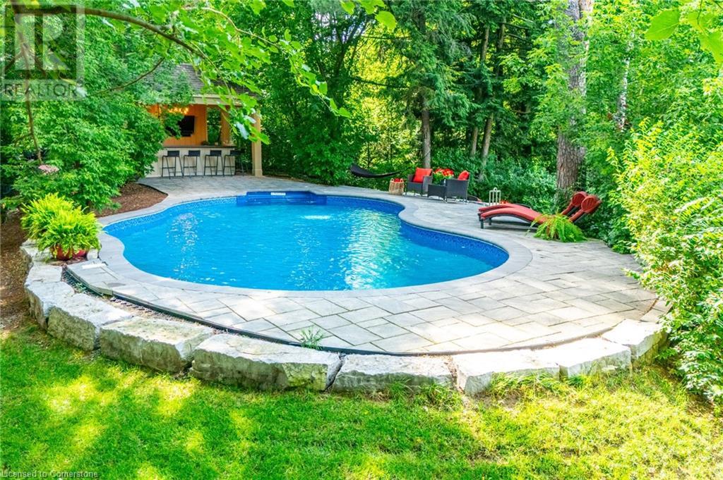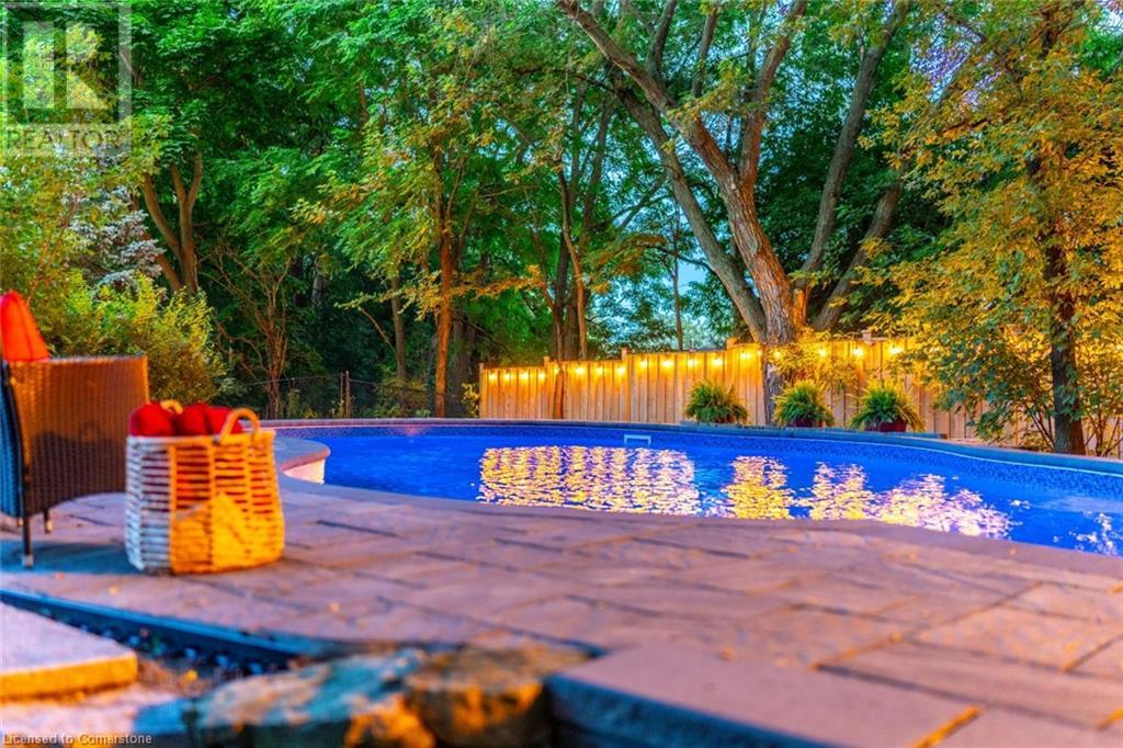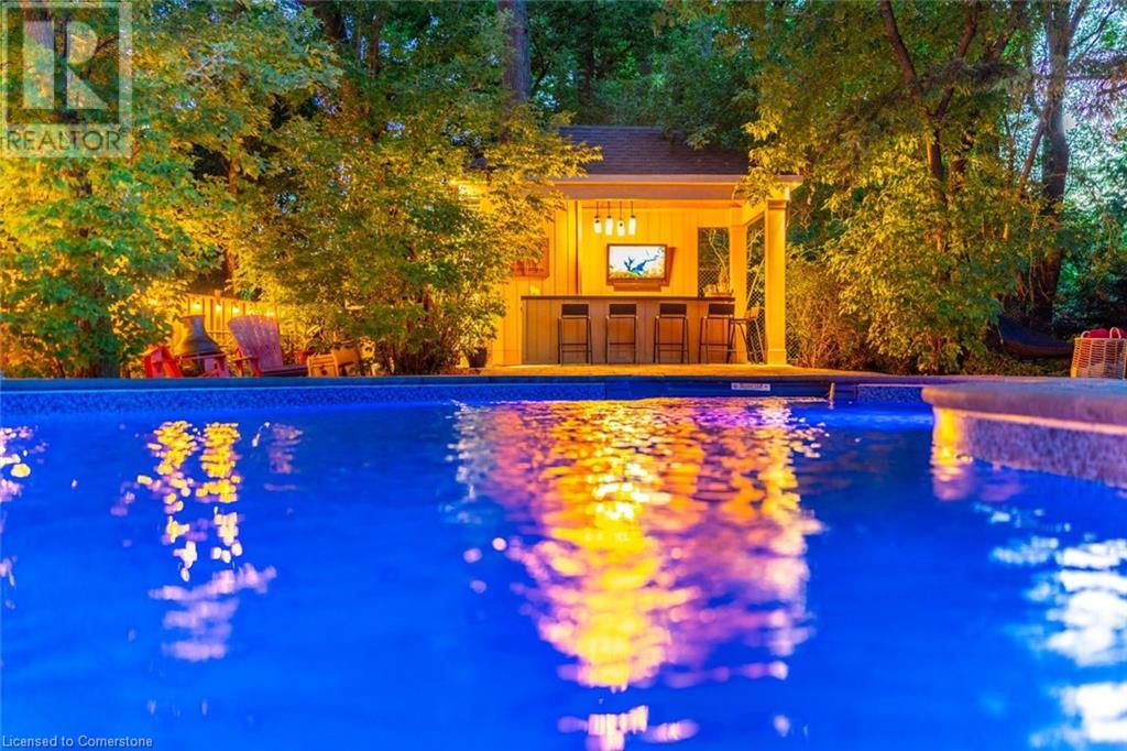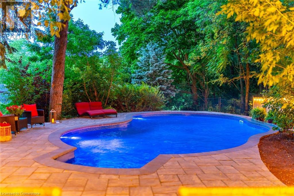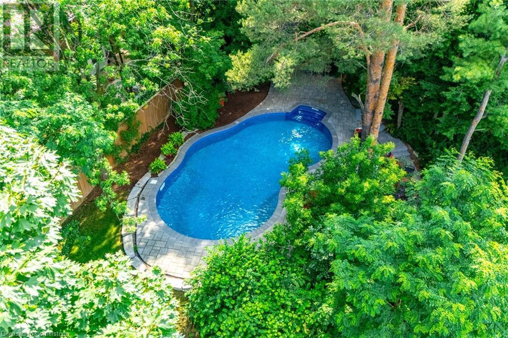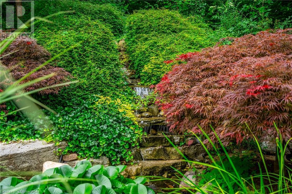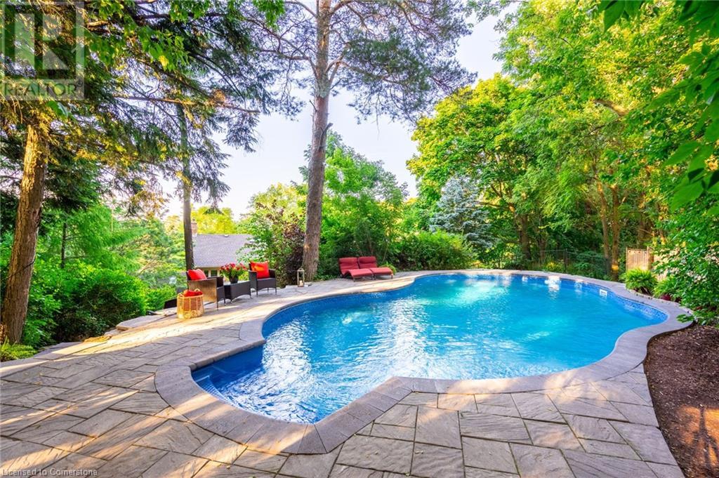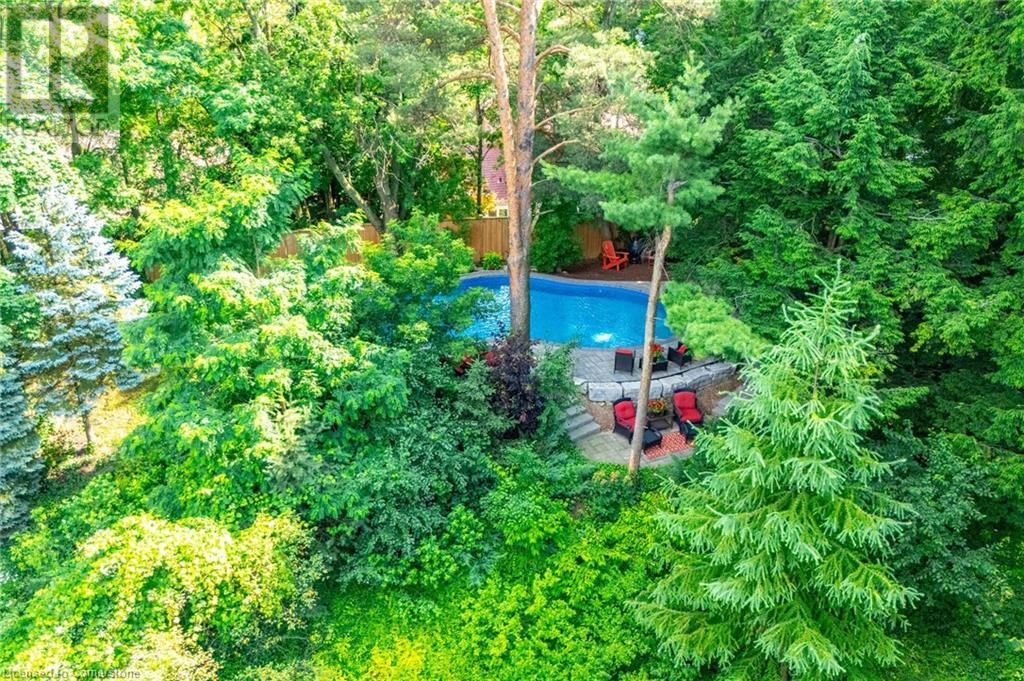 Stunning luxury 2stry home loc at the end of a quiet crt, set back from the road, on an oversized pie shaped lot in the heart of old Ancaster. This fairytale-like fenced-in property surrounded by mature trees offers incredible privacy. You can truly relax w its ingrnd saltwater pool & outdoor cabana w chandelier, TV & sound system ‘22. There is also ample grass space for kids & pets. Enjoy meals in the outdoor din area while taking in the breathtaking, but low-maintenance, perennial-gardens & beautifully designed 25ft waterfall tht flows into a lily-filled pond. Stepping inside the all-brick fully reno’d home you're met w beautiful engineered oak hdwd t’out ‘23, updated kitch w maple cabinets, quartz counters, gas cooktop & all new KitchenAid appl ‘23. Each window views a different angle of the yard, taking in hydrangeas, Japanese maples & lilacs to name a few. Heading to the great rm, which was transformed in 23 from a flat ceiling into a 13ft cathedral ceiling w skylights, is an instant favourite w its lrg size & wood burning fp. Upstairs are 4 spacious bdrms & 2 reno’d full bthrms. Heading to the bsmnt you have a wet bar for entertaining, gas fp, dedicated theatre rm w 150” screen, 4K projector & sound system ‘22, gym, sauna & 3pc bth. The home is a property to marvel at, an ideal family home w/i walking dist to conservation, hiking trails & Tiffany Falls, min bike ride to town, 5min walk to Rousseau Primary School, easy drive to the High School & min to The Linc & 403. (id:55009)