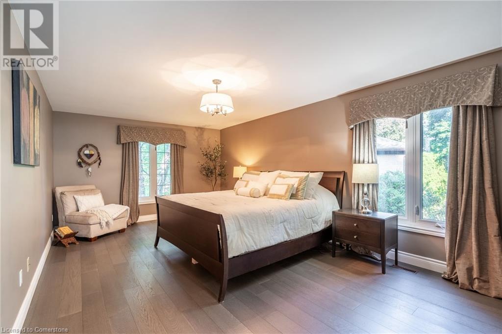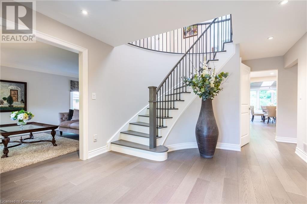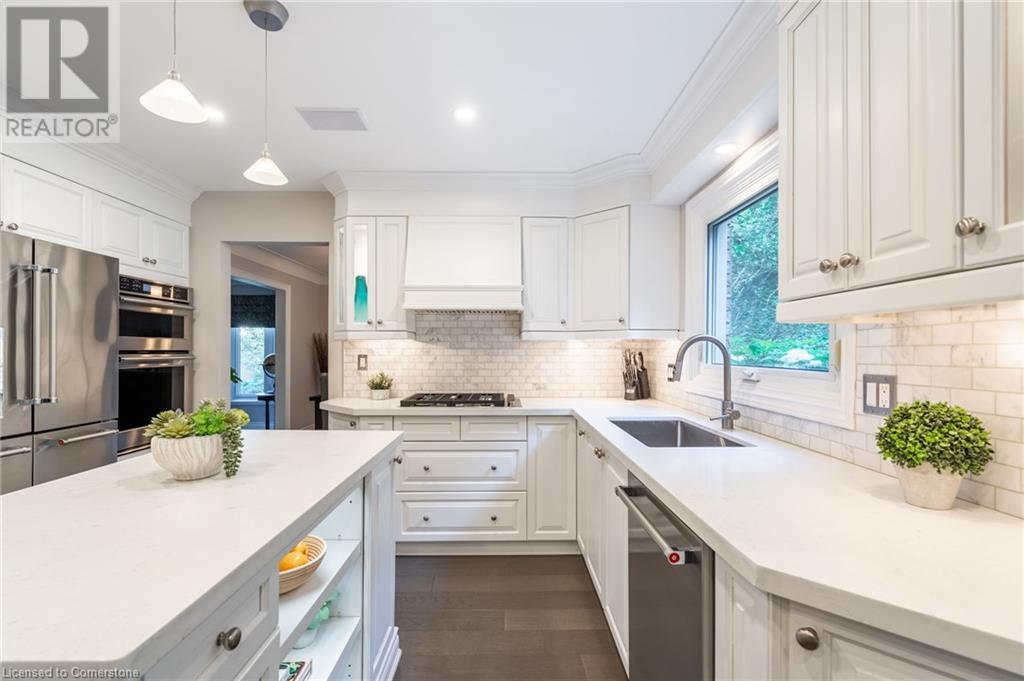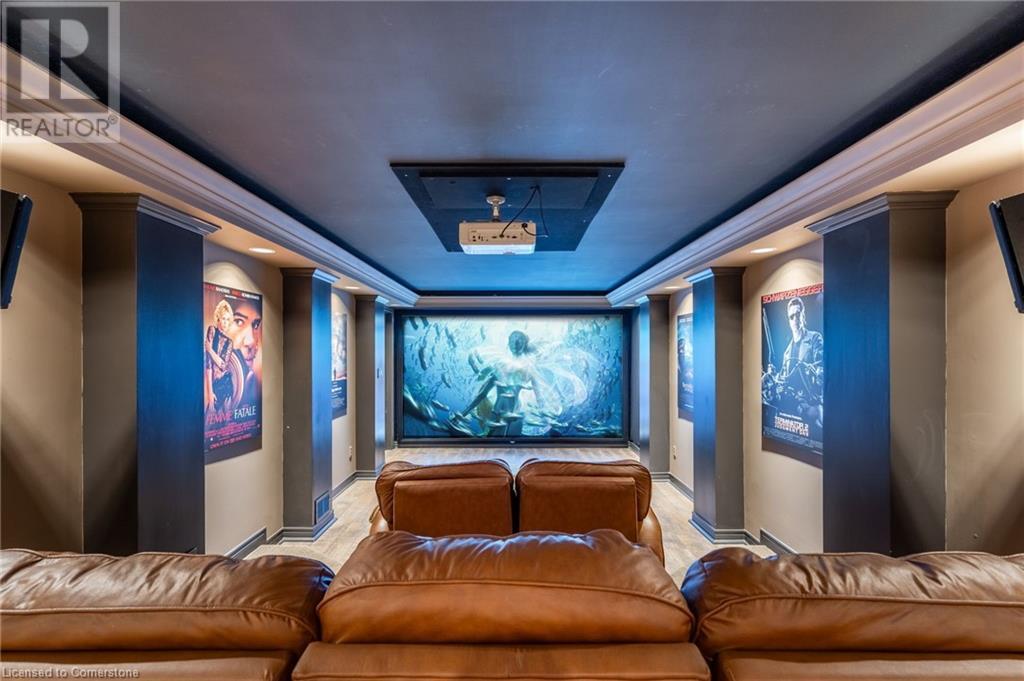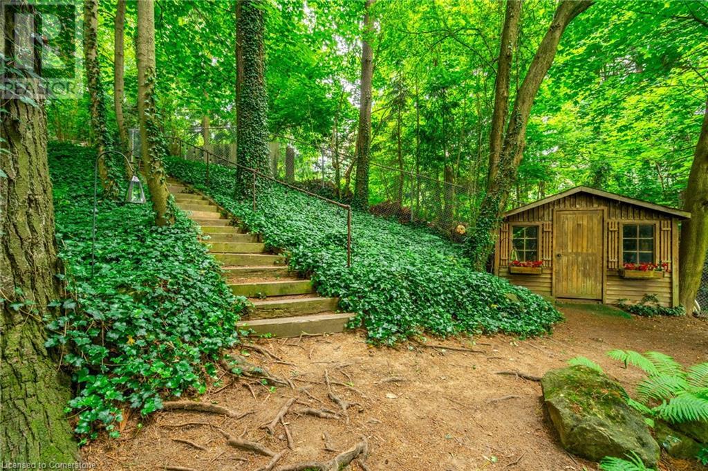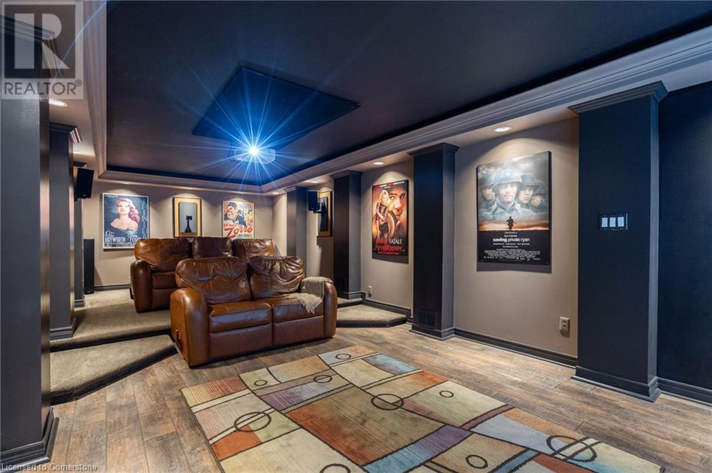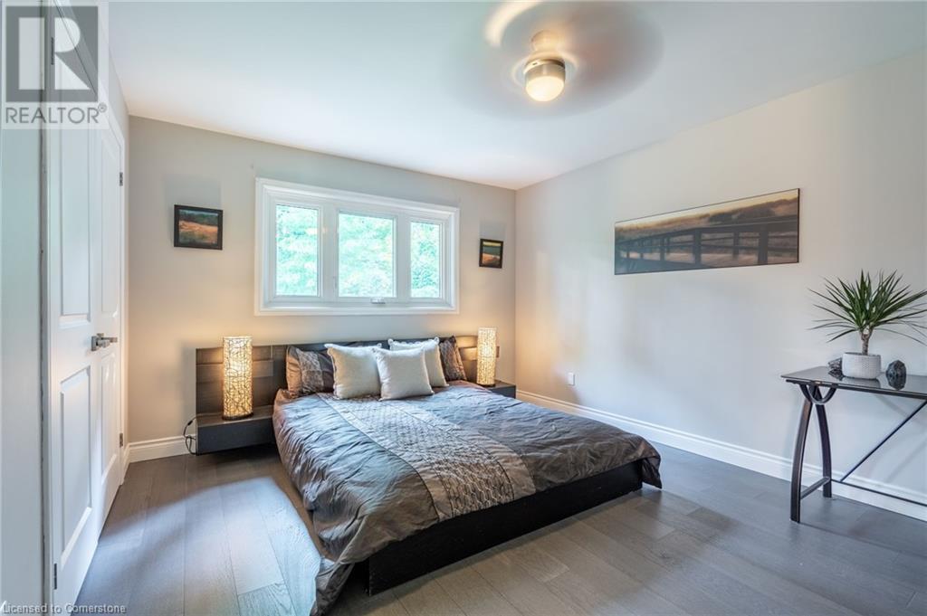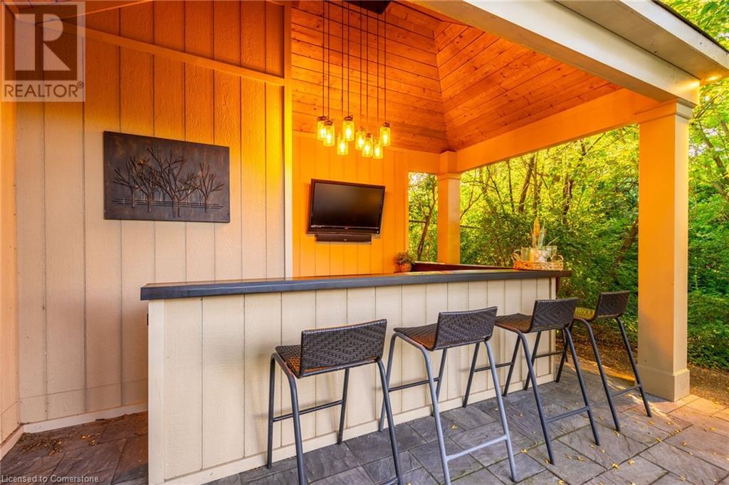 Stunning luxury 2stry home loc at the end of a quiet crt, set back from the road, on an oversized pie shaped lot in the heart of old Ancaster. This fairytale-like fenced-in property surrounded by mature trees offers incredible privacy. You can truly relax w its ingrnd saltwater pool & outdoor cabana w chandelier, TV & sound system ‘22. There is also ample grass space for kids & pets. Enjoy meals in the outdoor din area while taking in the breathtaking, but low-maintenance, perennial-gardens & beautifully designed 25ft waterfall tht flows into a lily-filled pond. Stepping inside the all-brick fully reno’d home you're met w beautiful engineered oak hdwd t’out ‘23, updated kitch w maple cabinets, quartz counters, gas cooktop & all new KitchenAid appl ‘23. Each window views a different angle of the yard, taking in hydrangeas, Japanese maples & lilacs to name a few. Heading to the great rm, which was transformed in 23 from a flat ceiling into a 13ft cathedral ceiling w skylights, is an instant favourite w its lrg size & wood burning fp. Upstairs are 4 spacious bdrms & 2 reno’d full bthrms. Heading to the bsmnt you have a wet bar for entertaining, gas fp, dedicated theatre rm w 150” screen, 4K projector & sound system ‘22, gym, sauna & 3pc bth. The home is a property to marvel at, an ideal family home w/i walking dist to conservation, hiking trails & Tiffany Falls, min bike ride to town, 5min walk to Rousseau Primary School, easy drive to the High School & min to The Linc & 403. (id:55009)