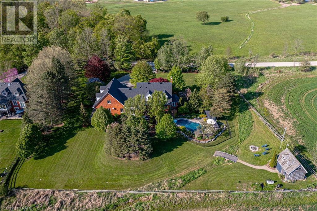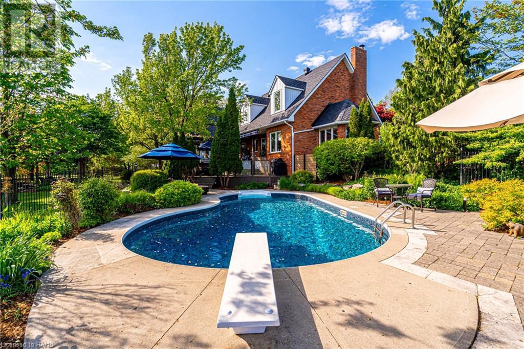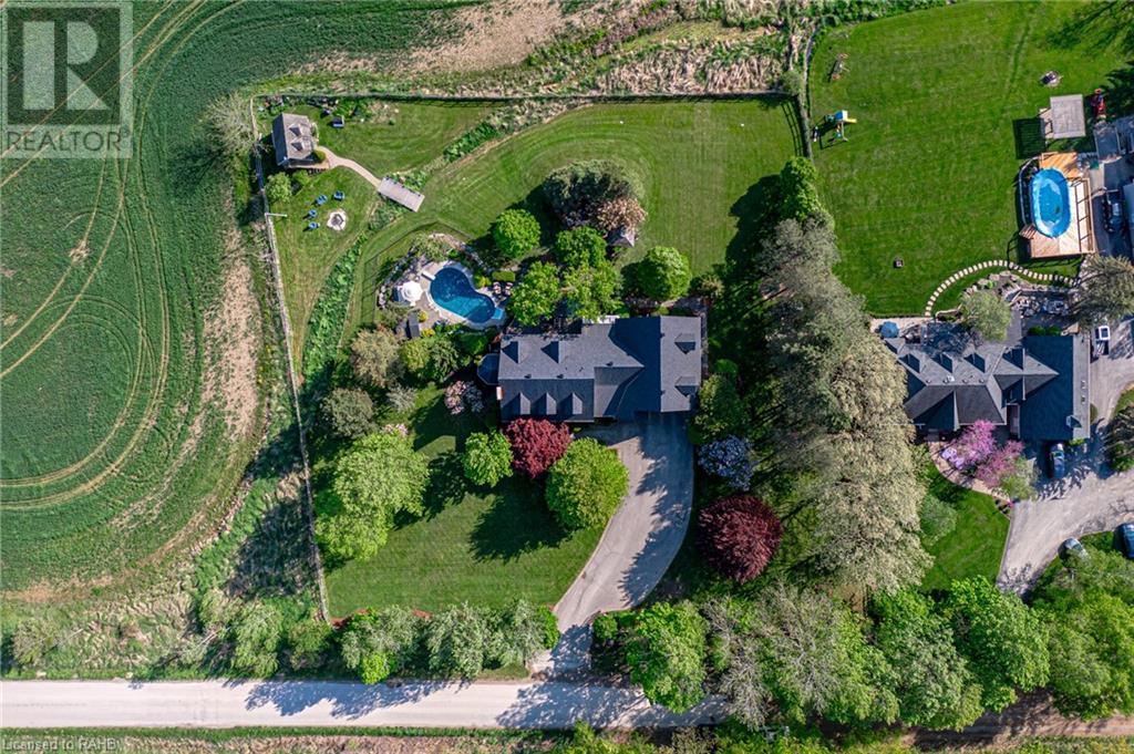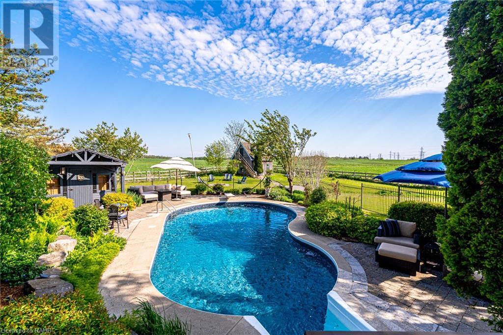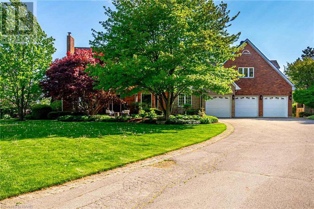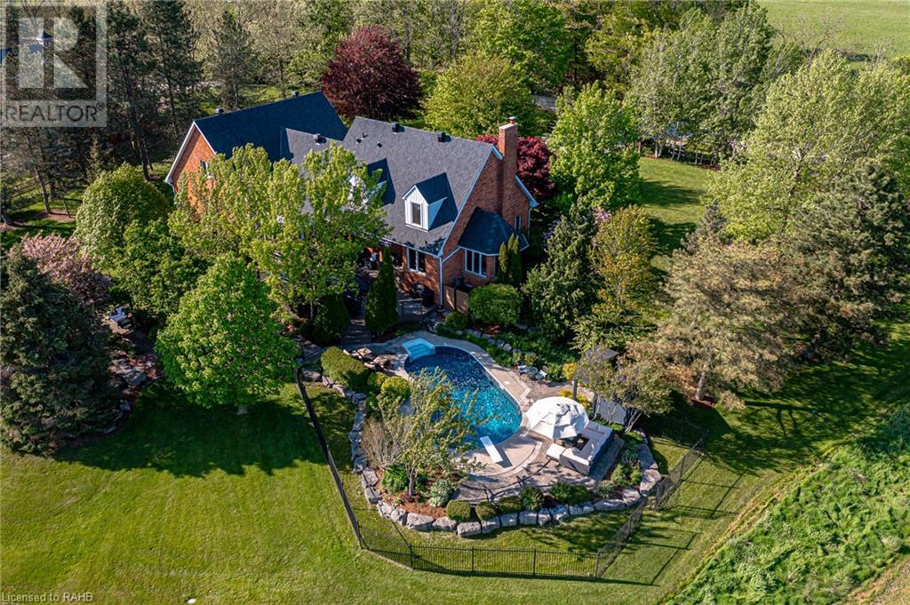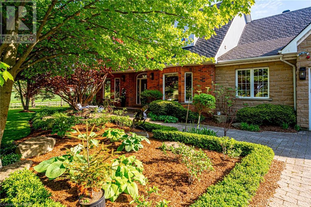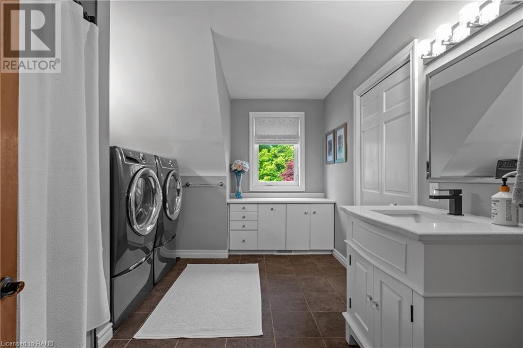 The gated grounds and sweeping driveway set the stage for this family friendly country estate just minutes to the Ancaster core! This reclaimed brick masterpiece boasts the rare combination of a main floor primary suite and 3 car garage. Inside, elegance meets functionality in the formal living and dining areas, a cozy sunroom nook, and a family room that is open to the custom off-white kitchen with designer appliances including a Subzero fridge. The aforementioned primary suite boasts views of the rear, a spa inspired ensuite with his and her vanities, and a large walk-in closet. This level is finished off by a home office with built-ins, powder room, laundry room, and a mudroom with garage access. Meanwhile, head upstairs via one of the two staircases and enjoy an oversized family rec space and bar. This level also boasts 4 bedrooms, 2 bathrooms, and an additional laundry room. Back outside, the rear yard has something for everyone in the family including a raised deck with hot tub, a saltwater pool surrounded by patio seating and beautiful perennial gardens, a pond, a firepit, 2 outbuildings, and ample grass. This home is completed as you head downstairs and discover a fully finished basement presenting 2 large rec rooms, a bathroom, a projector for family movie nights, and both a sprawling utility room and additional storage room. Meticulously maintained and tastefully upgraded, this geothermal heated home is also ultra efficient and waiting for its next stewards! (id:55009)