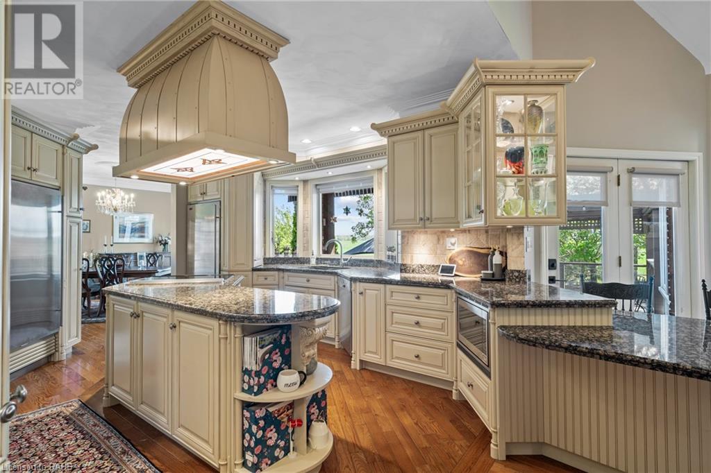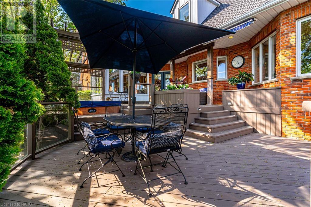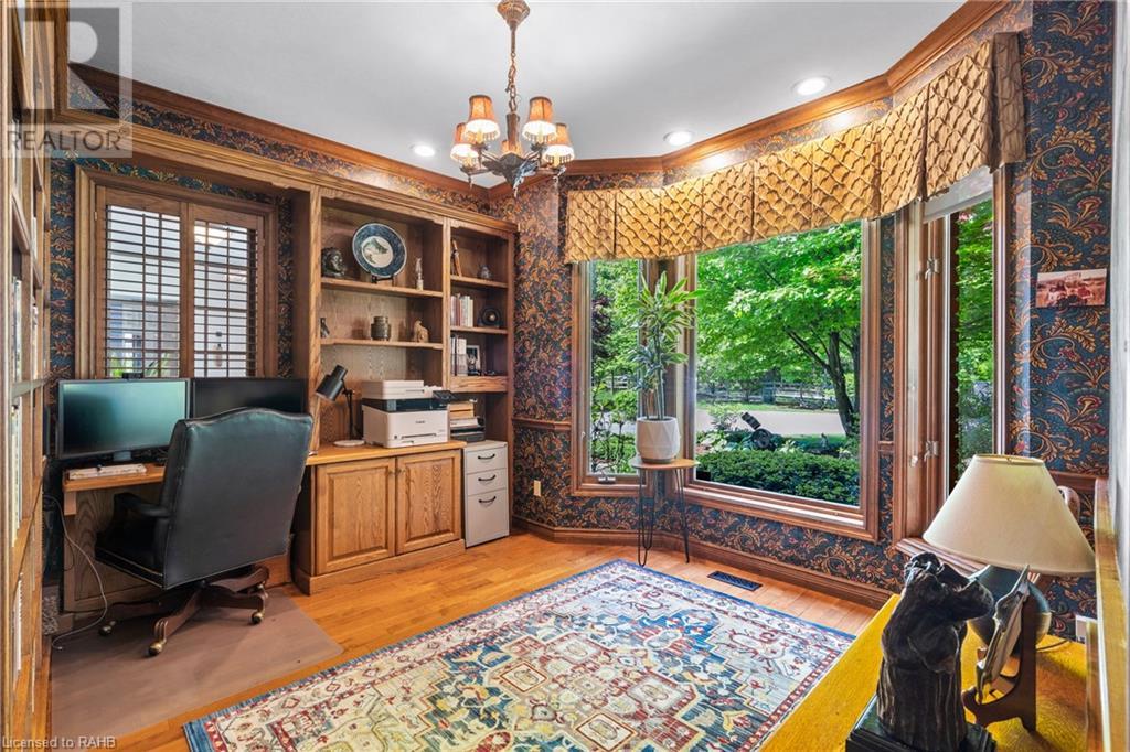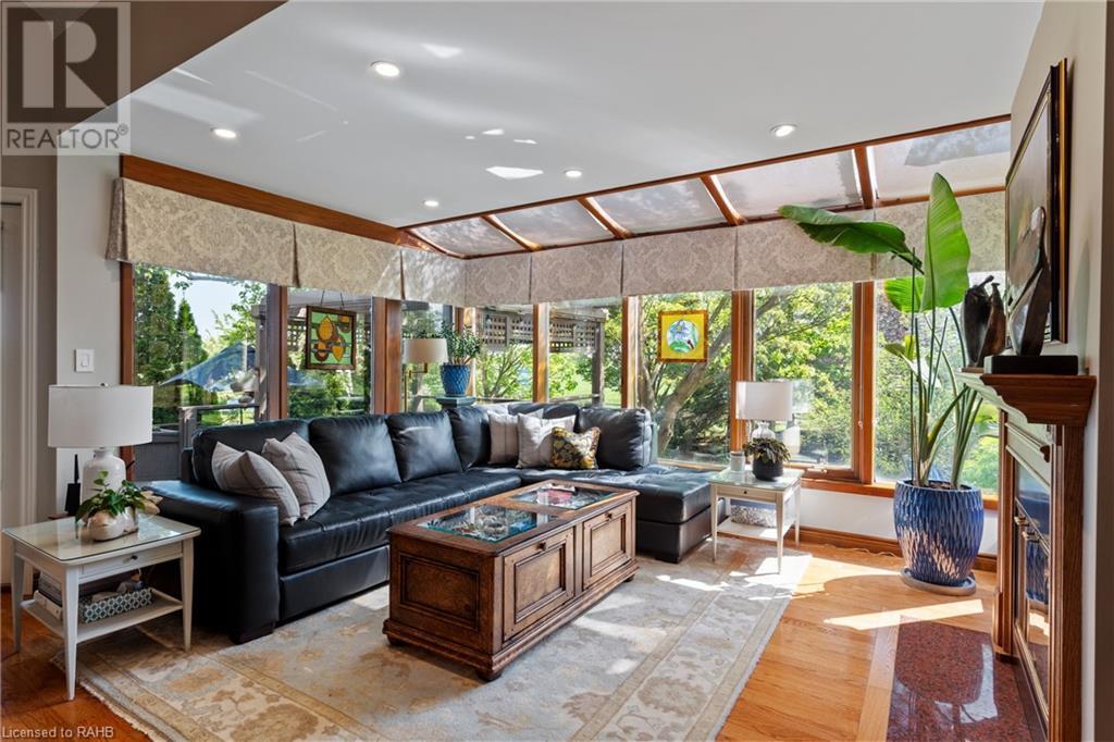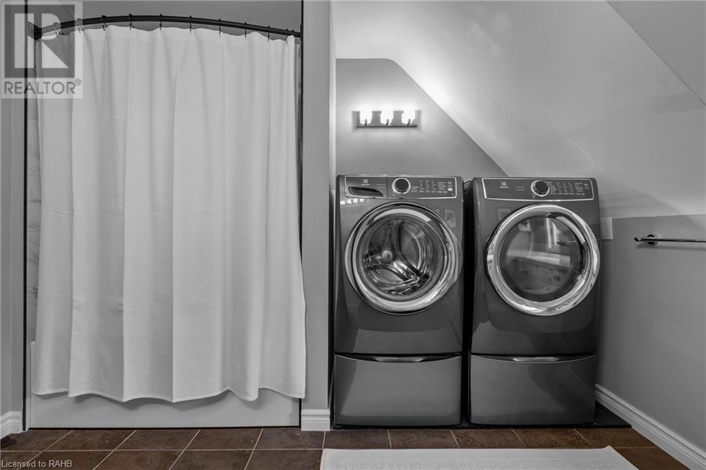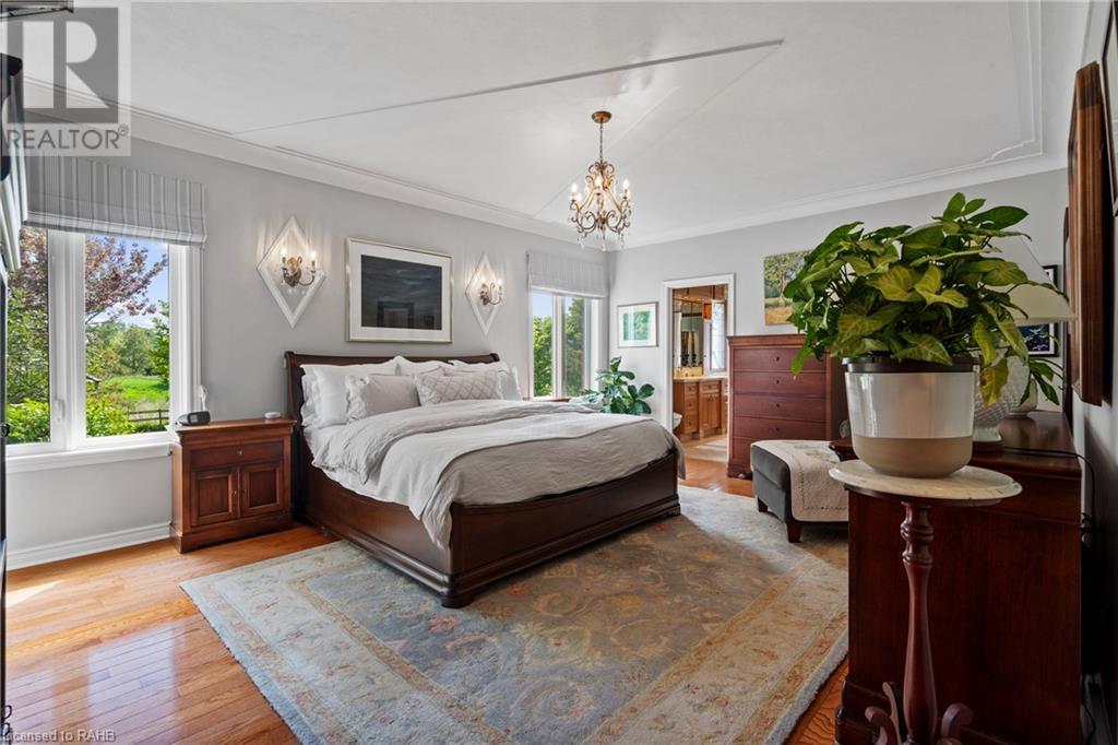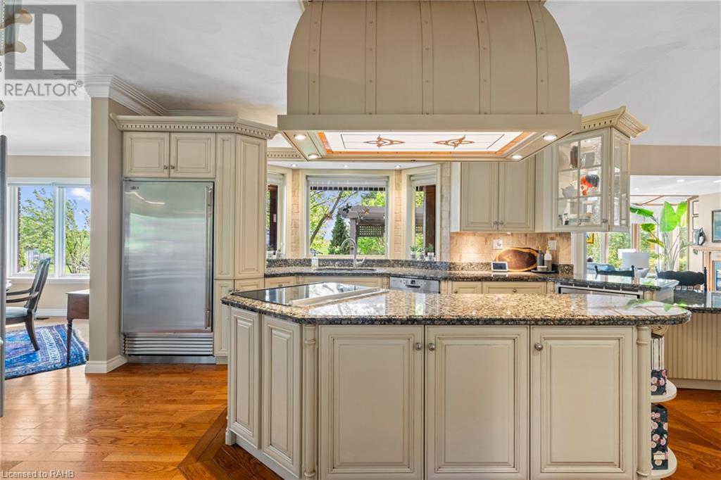 The gated grounds and sweeping driveway set the stage for this family friendly country estate just minutes to the Ancaster core! This reclaimed brick masterpiece boasts the rare combination of a main floor primary suite and 3 car garage. Inside, elegance meets functionality in the formal living and dining areas, a cozy sunroom nook, and a family room that is open to the custom off-white kitchen with designer appliances including a Subzero fridge. The aforementioned primary suite boasts views of the rear, a spa inspired ensuite with his and her vanities, and a large walk-in closet. This level is finished off by a home office with built-ins, powder room, laundry room, and a mudroom with garage access. Meanwhile, head upstairs via one of the two staircases and enjoy an oversized family rec space and bar. This level also boasts 4 bedrooms, 2 bathrooms, and an additional laundry room. Back outside, the rear yard has something for everyone in the family including a raised deck with hot tub, a saltwater pool surrounded by patio seating and beautiful perennial gardens, a pond, a firepit, 2 outbuildings, and ample grass. This home is completed as you head downstairs and discover a fully finished basement presenting 2 large rec rooms, a bathroom, a projector for family movie nights, and both a sprawling utility room and additional storage room. Meticulously maintained and tastefully upgraded, this geothermal heated home is also ultra efficient and waiting for its next stewards! (id:55009)