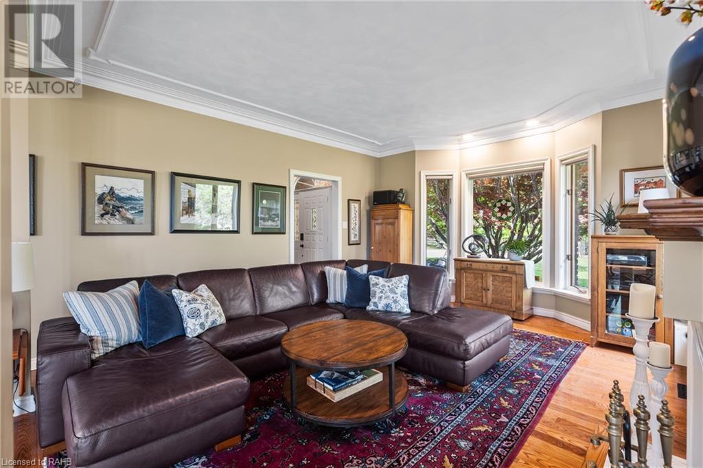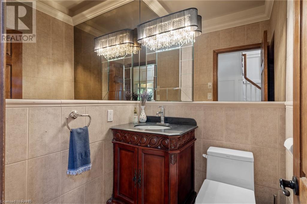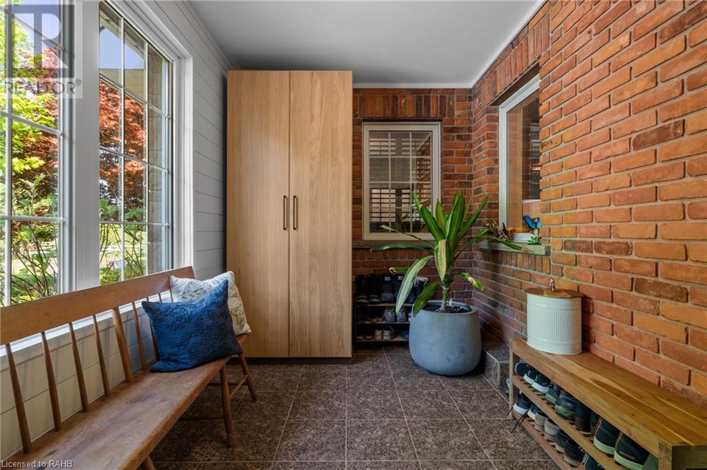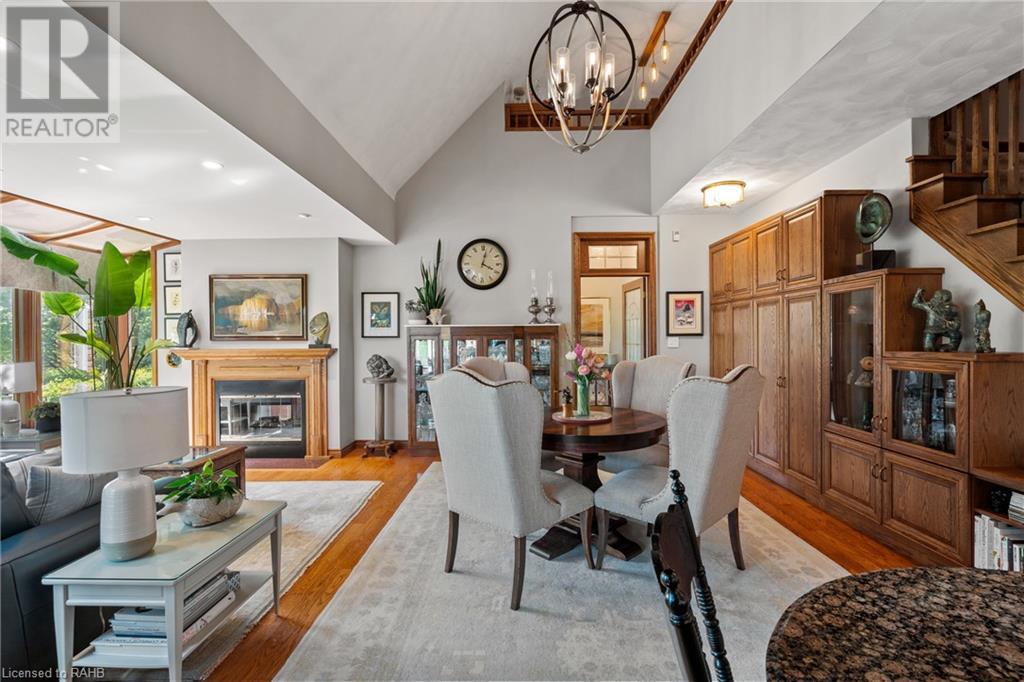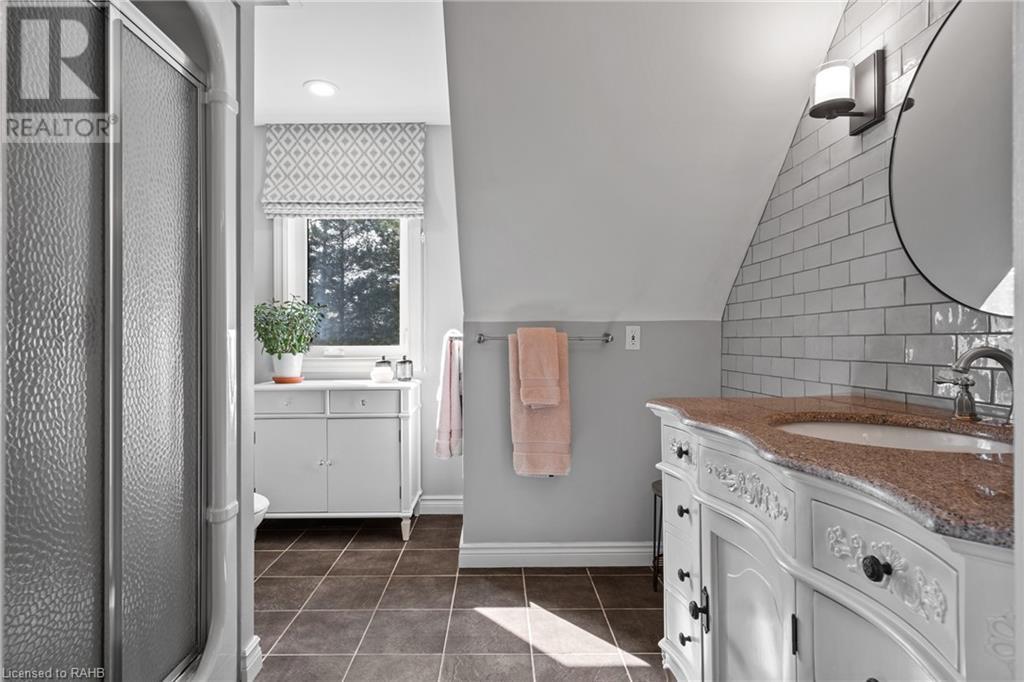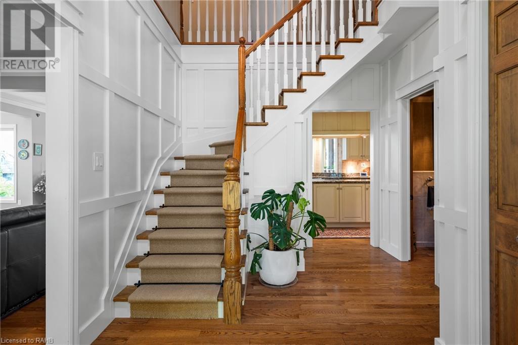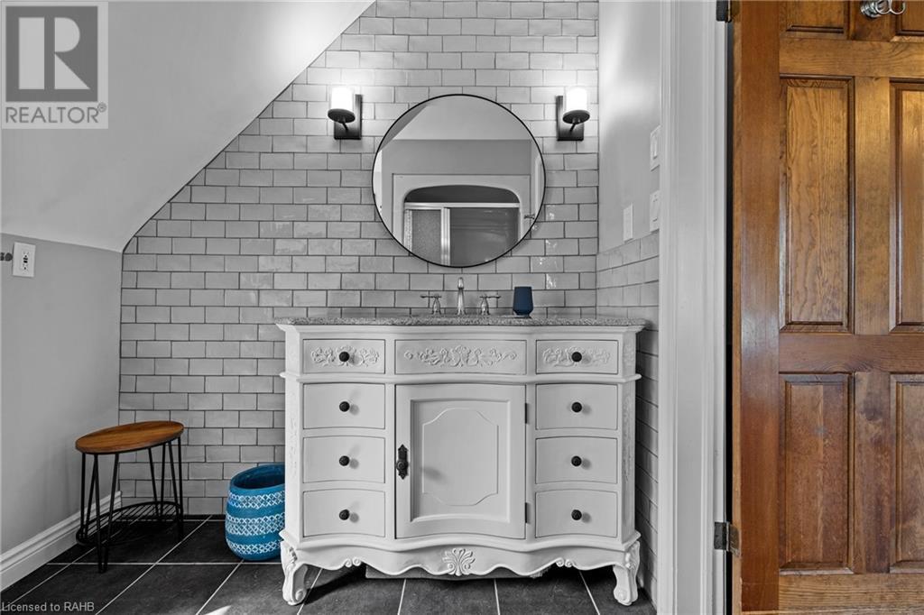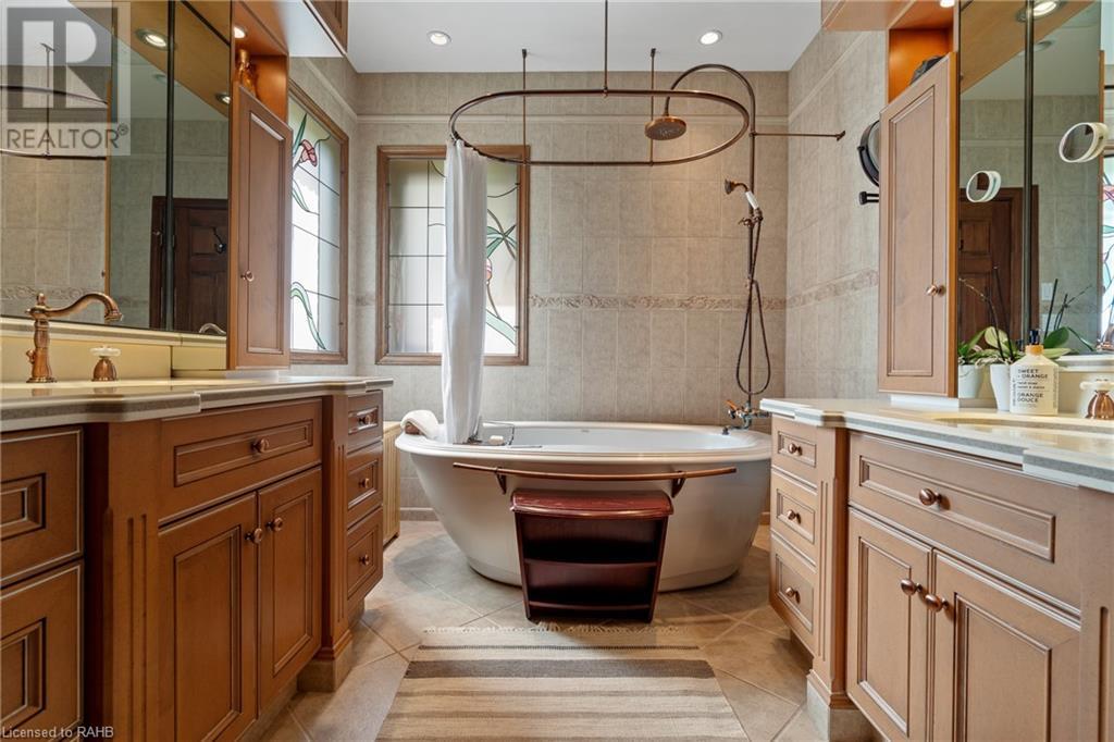 The gated grounds and sweeping driveway set the stage for this family friendly country estate just minutes to the Ancaster core! This reclaimed brick masterpiece boasts the rare combination of a main floor primary suite and 3 car garage. Inside, elegance meets functionality in the formal living and dining areas, a cozy sunroom nook, and a family room that is open to the custom off-white kitchen with designer appliances including a Subzero fridge. The aforementioned primary suite boasts views of the rear, a spa inspired ensuite with his and her vanities, and a large walk-in closet. This level is finished off by a home office with built-ins, powder room, laundry room, and a mudroom with garage access. Meanwhile, head upstairs via one of the two staircases and enjoy an oversized family rec space and bar. This level also boasts 4 bedrooms, 2 bathrooms, and an additional laundry room. Back outside, the rear yard has something for everyone in the family including a raised deck with hot tub, a saltwater pool surrounded by patio seating and beautiful perennial gardens, a pond, a firepit, 2 outbuildings, and ample grass. This home is completed as you head downstairs and discover a fully finished basement presenting 2 large rec rooms, a bathroom, a projector for family movie nights, and both a sprawling utility room and additional storage room. Meticulously maintained and tastefully upgraded, this geothermal heated home is also ultra efficient and waiting for its next stewards! (id:55009)