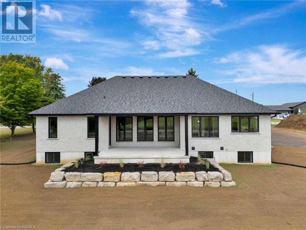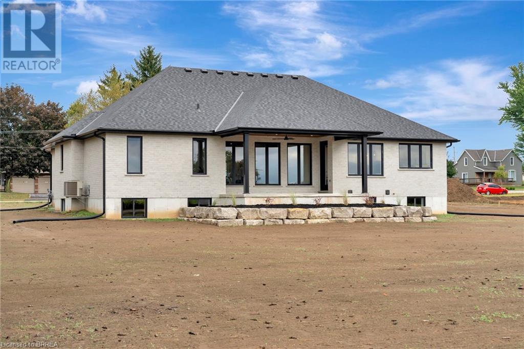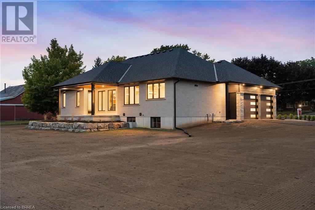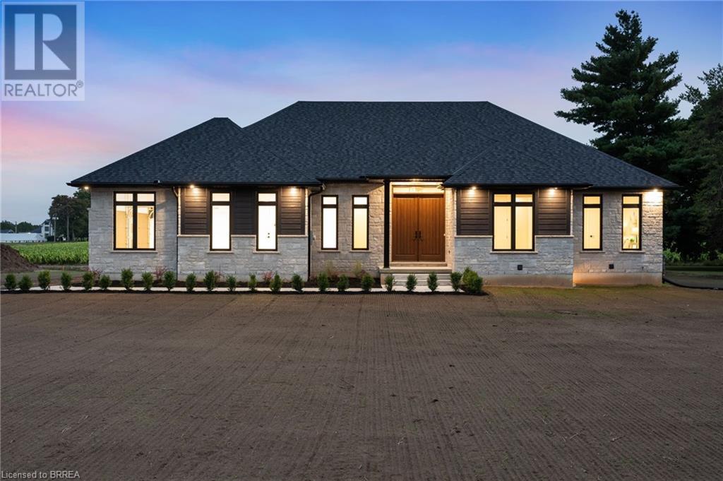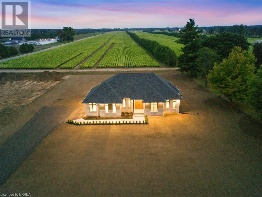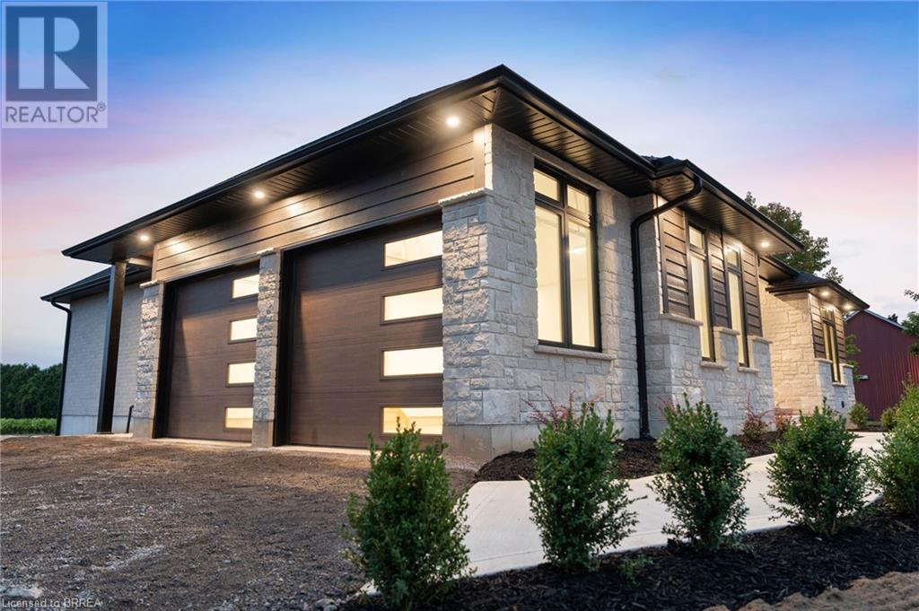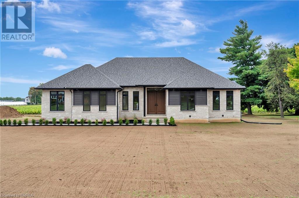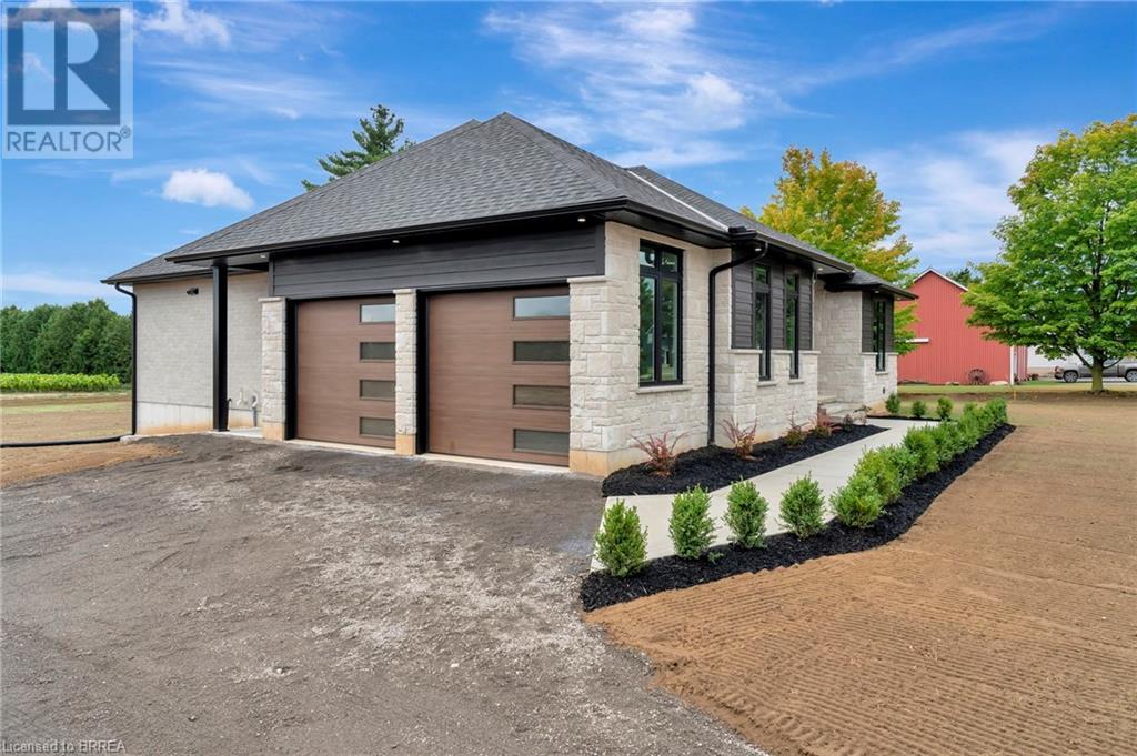 Nestled in the serene rural community of Our Lady of La Salette, just north of Delhi in Norfolk County, this executive-style bungalow by Wolf Homes offers a perfect blend of luxury and tranquility. Situated on a 0.9 acre lot, this home is designed with high-end finishes and modern elegance. The long driveway leads to a double garage, with a pathway and front entry that is awaiting your landscaping dreams. The striking stone exterior, accented with wood and sleek black details, welcomes you through a grand double-door entry. Inside, high ceilings, light-toned floors, and snow-white trim create a stunning contrast with black elements and recessed lighting, giving the home a contemporary yet warm feel. The heart of the home is the open-concept family room, featuring a gas fireplace, tray ceiling with exposed beams, and a wall of windows offering breathtaking views of the green fields beyond. Step out onto the covered back patio for seamless indoor-outdoor living. Adjacent to the family room, the spacious dining area is perfect for gatherings. The kitchen is a showstopper with floor-to-ceiling cabinetry, quartz countertops, a light wood breakfast bar island, and a sparkling backsplash. Black hardware and lighting add a sleek finish, while the large walk-in pantry ensures plenty of storage. The primary bedroom offers a peaceful retreat with a walk-in closet featuring built-in shelving and a luxurious 4 pc ensuite with a walk-in shower and double vanity. Two additional bedrooms share a stylish 4 pc bathroom. The lower level offers a rec room and two more bedrooms with deep windows, plush carpeting and a 3pc bathroom with a walk-in shower. Outside, the covered back porch with recessed lighting and fan is perfect for summer nights, offering serene views. Ditch the hustle and bustle of city life and embrace the beauty of this rural community, just 20 minutes from the City of Brantford and close to all necessary amenities. (id:55009)