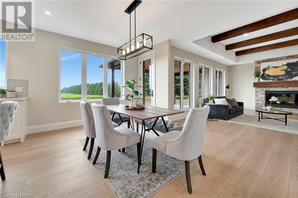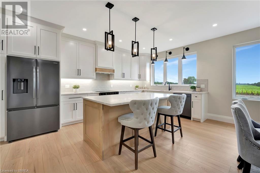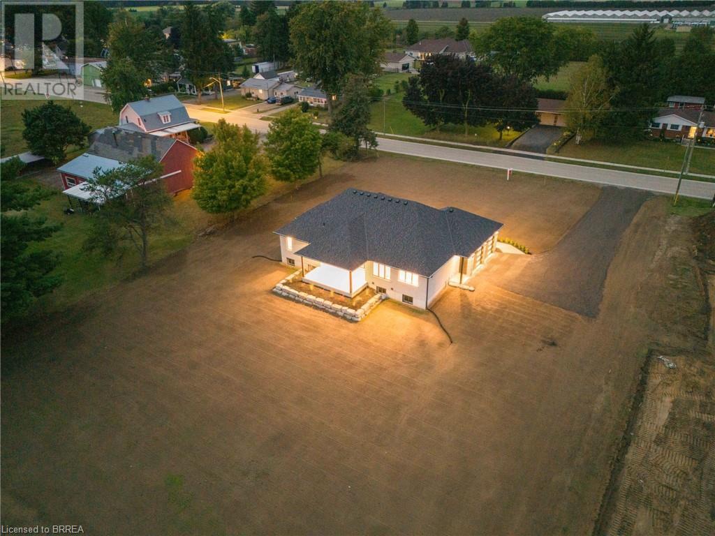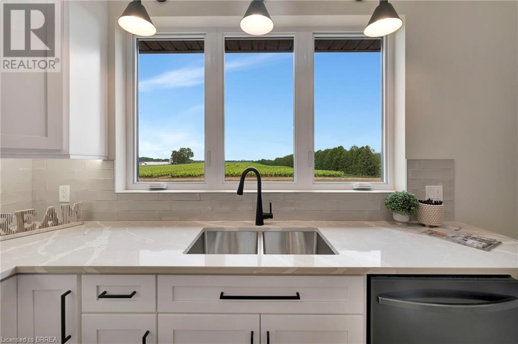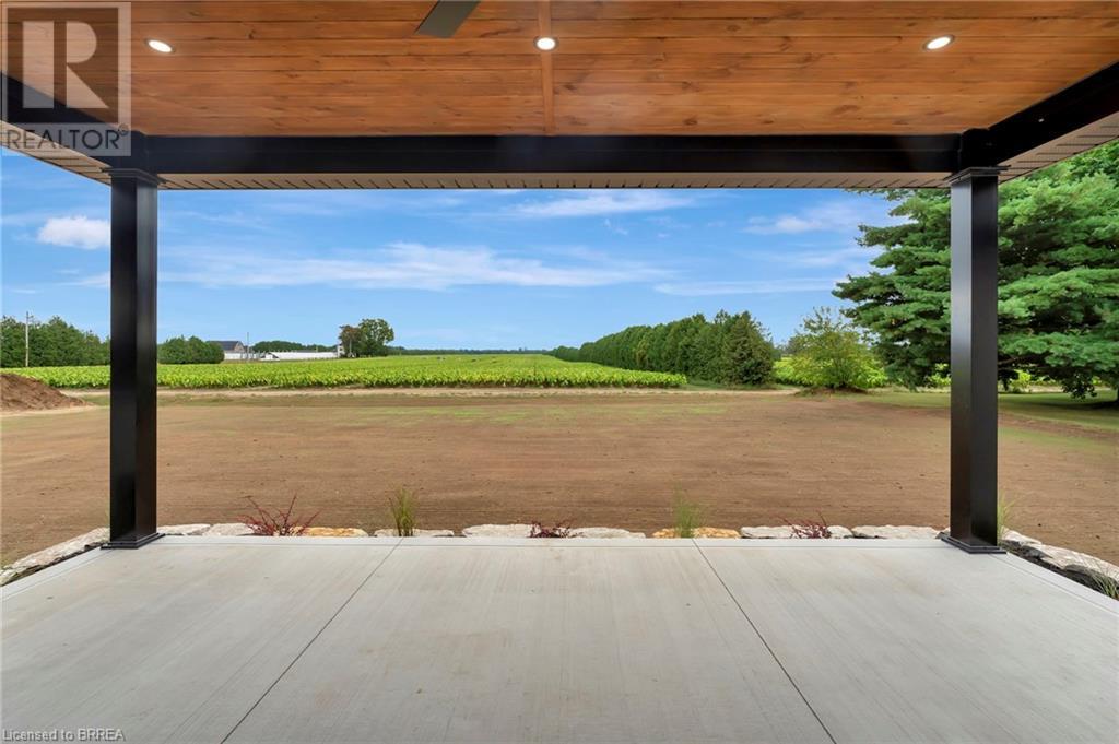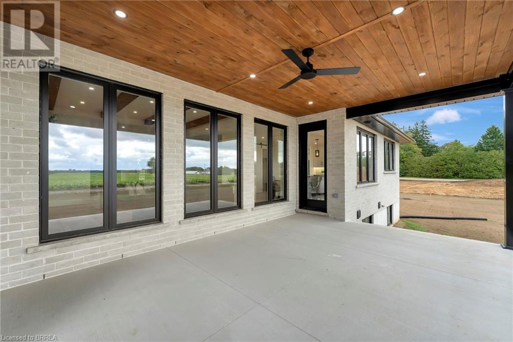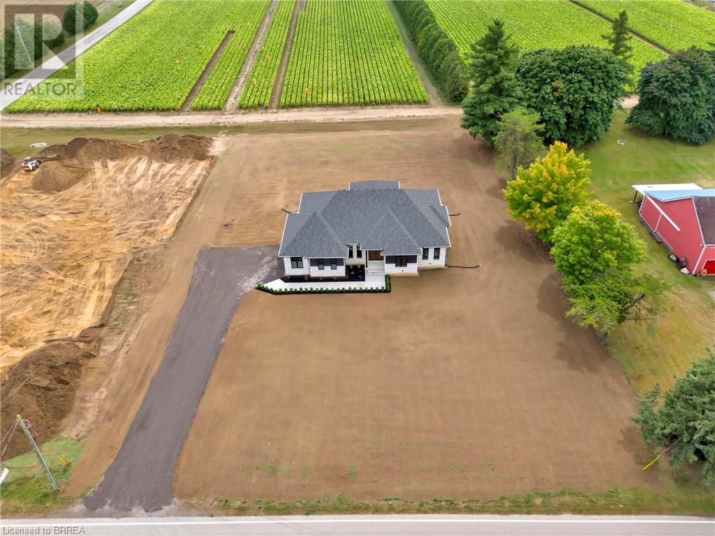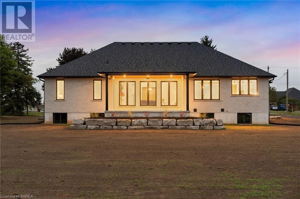 Nestled in the serene rural community of Our Lady of La Salette, just north of Delhi in Norfolk County, this executive-style bungalow by Wolf Homes offers a perfect blend of luxury and tranquility. Situated on a 0.9 acre lot, this home is designed with high-end finishes and modern elegance. The long driveway leads to a double garage, with a pathway and front entry that is awaiting your landscaping dreams. The striking stone exterior, accented with wood and sleek black details, welcomes you through a grand double-door entry. Inside, high ceilings, light-toned floors, and snow-white trim create a stunning contrast with black elements and recessed lighting, giving the home a contemporary yet warm feel. The heart of the home is the open-concept family room, featuring a gas fireplace, tray ceiling with exposed beams, and a wall of windows offering breathtaking views of the green fields beyond. Step out onto the covered back patio for seamless indoor-outdoor living. Adjacent to the family room, the spacious dining area is perfect for gatherings. The kitchen is a showstopper with floor-to-ceiling cabinetry, quartz countertops, a light wood breakfast bar island, and a sparkling backsplash. Black hardware and lighting add a sleek finish, while the large walk-in pantry ensures plenty of storage. The primary bedroom offers a peaceful retreat with a walk-in closet featuring built-in shelving and a luxurious 4 pc ensuite with a walk-in shower and double vanity. Two additional bedrooms share a stylish 4 pc bathroom. The lower level offers a rec room and two more bedrooms with deep windows, plush carpeting and a 3pc bathroom with a walk-in shower. Outside, the covered back porch with recessed lighting and fan is perfect for summer nights, offering serene views. Ditch the hustle and bustle of city life and embrace the beauty of this rural community, just 20 minutes from the City of Brantford and close to all necessary amenities. (id:55009)