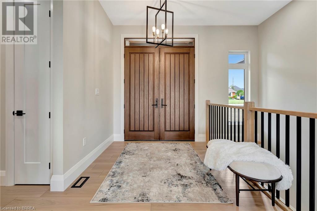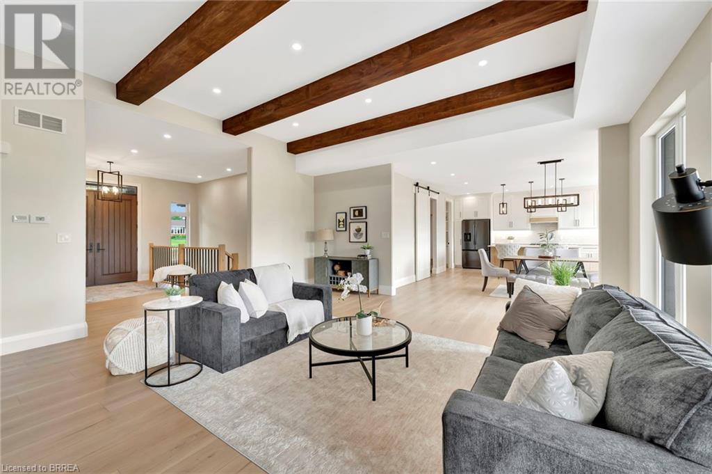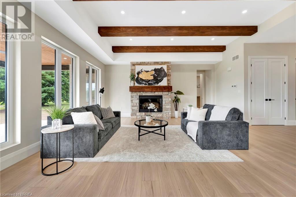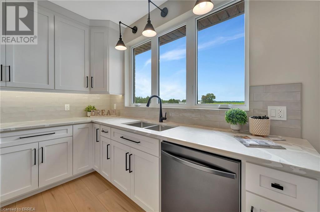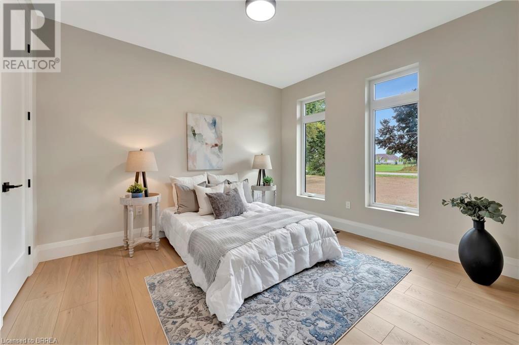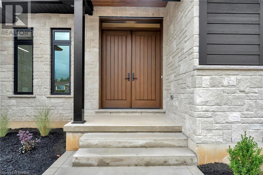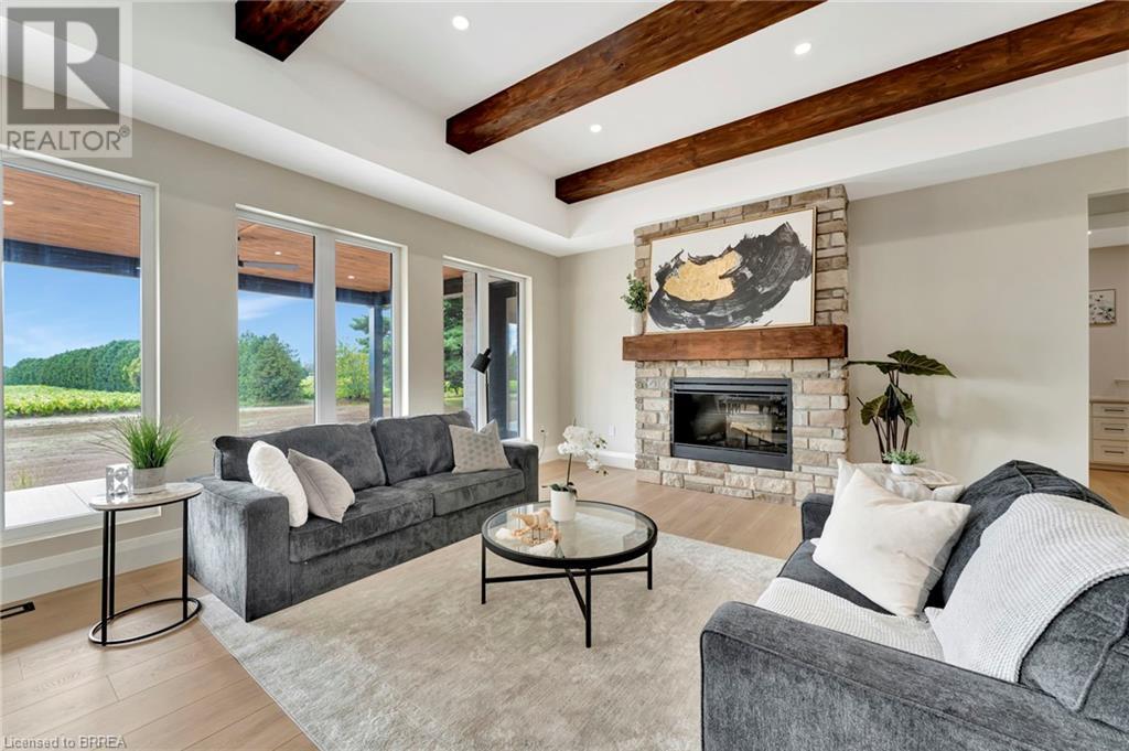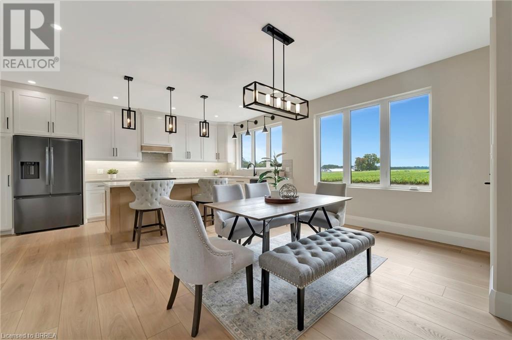 Nestled in the serene rural community of Our Lady of La Salette, just north of Delhi in Norfolk County, this executive-style bungalow by Wolf Homes offers a perfect blend of luxury and tranquility. Situated on a 0.9 acre lot, this home is designed with high-end finishes and modern elegance. The long driveway leads to a double garage, with a pathway and front entry that is awaiting your landscaping dreams. The striking stone exterior, accented with wood and sleek black details, welcomes you through a grand double-door entry. Inside, high ceilings, light-toned floors, and snow-white trim create a stunning contrast with black elements and recessed lighting, giving the home a contemporary yet warm feel. The heart of the home is the open-concept family room, featuring a gas fireplace, tray ceiling with exposed beams, and a wall of windows offering breathtaking views of the green fields beyond. Step out onto the covered back patio for seamless indoor-outdoor living. Adjacent to the family room, the spacious dining area is perfect for gatherings. The kitchen is a showstopper with floor-to-ceiling cabinetry, quartz countertops, a light wood breakfast bar island, and a sparkling backsplash. Black hardware and lighting add a sleek finish, while the large walk-in pantry ensures plenty of storage. The primary bedroom offers a peaceful retreat with a walk-in closet featuring built-in shelving and a luxurious 4 pc ensuite with a walk-in shower and double vanity. Two additional bedrooms share a stylish 4 pc bathroom. The lower level offers a rec room and two more bedrooms with deep windows, plush carpeting and a 3pc bathroom with a walk-in shower. Outside, the covered back porch with recessed lighting and fan is perfect for summer nights, offering serene views. Ditch the hustle and bustle of city life and embrace the beauty of this rural community, just 20 minutes from the City of Brantford and close to all necessary amenities. (id:55009)
