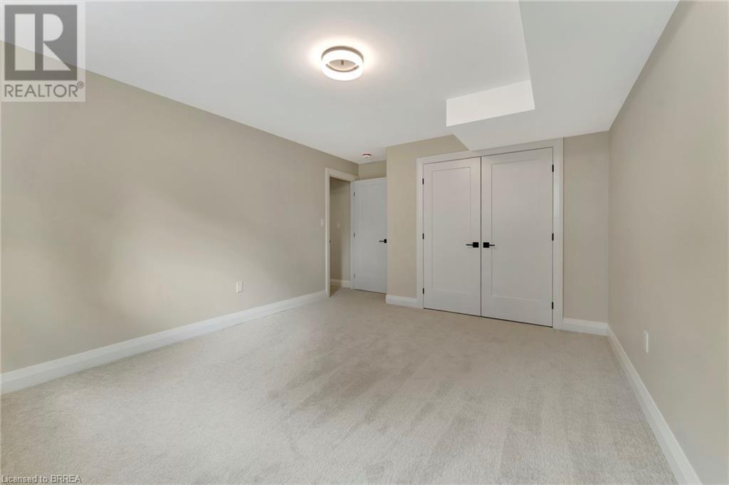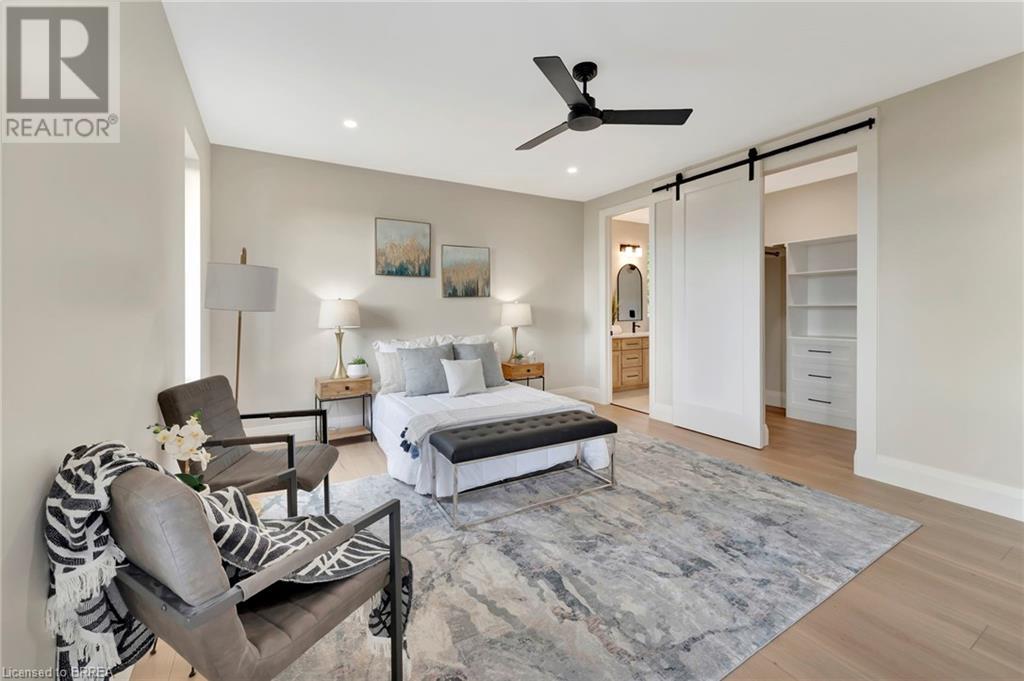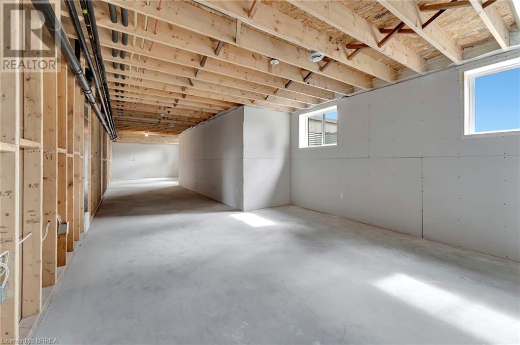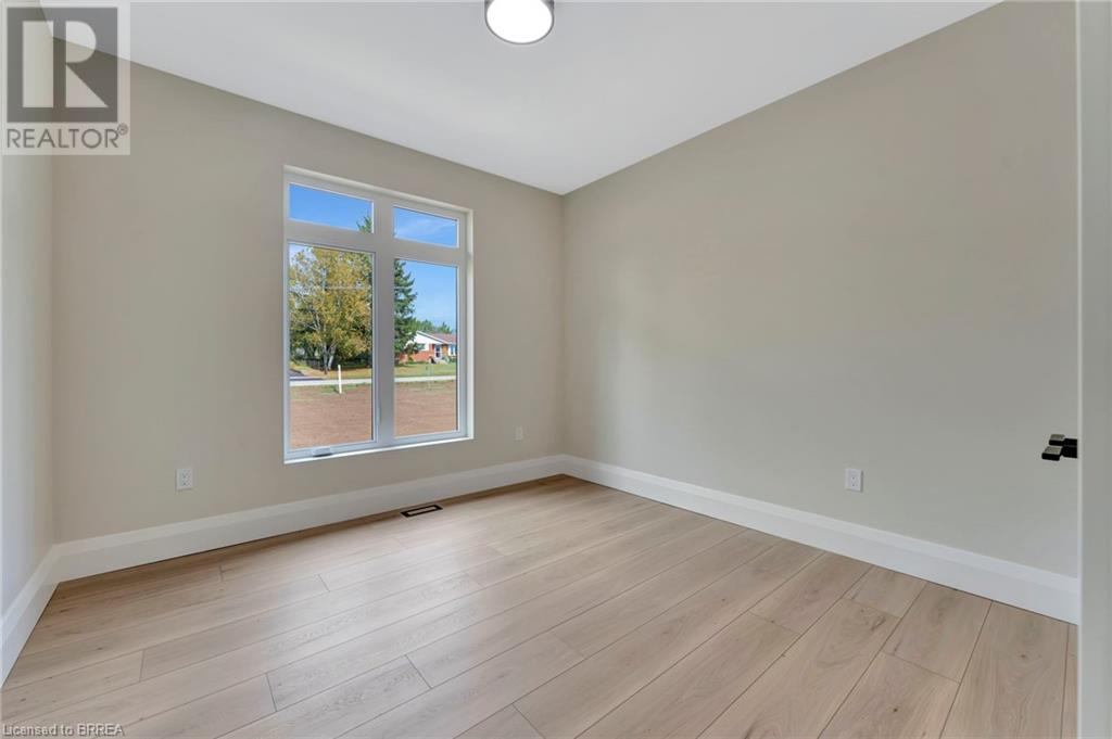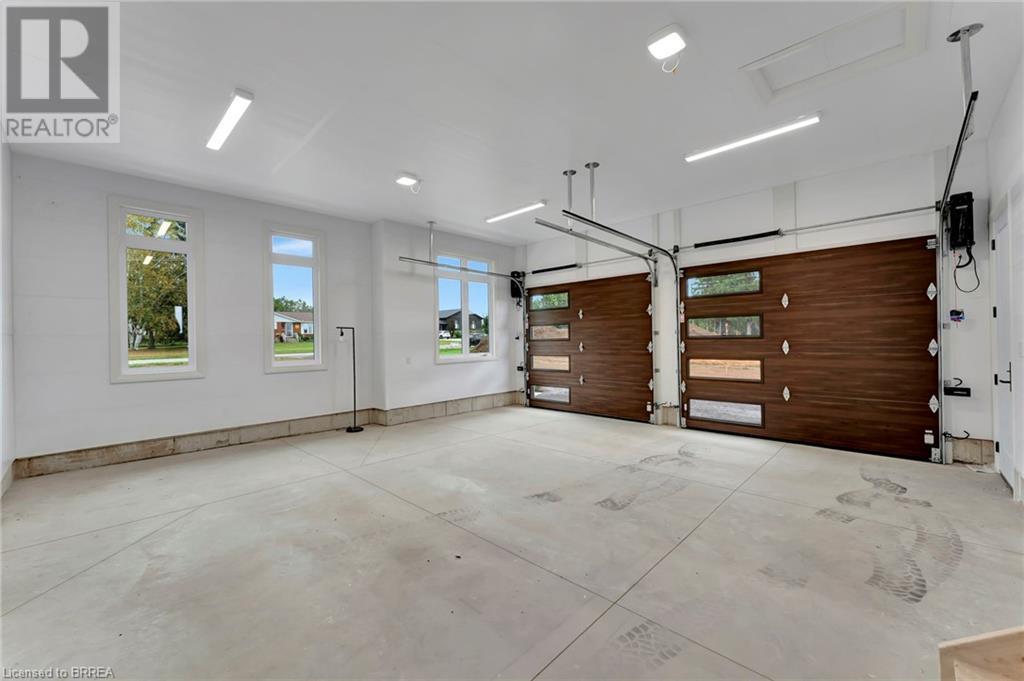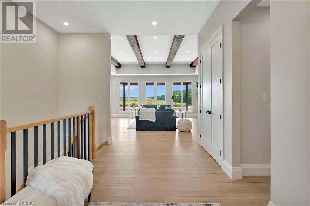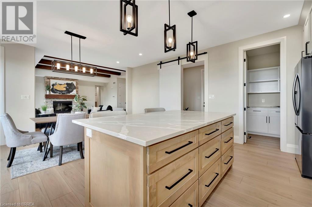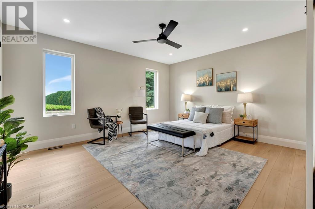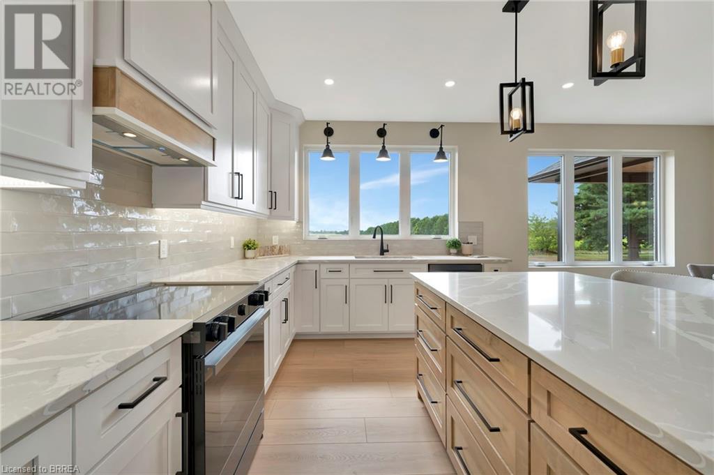 Nestled in the serene rural community of Our Lady of La Salette, just north of Delhi in Norfolk County, this executive-style bungalow by Wolf Homes offers a perfect blend of luxury and tranquility. Situated on a 0.9 acre lot, this home is designed with high-end finishes and modern elegance. The long driveway leads to a double garage, with a pathway and front entry that is awaiting your landscaping dreams. The striking stone exterior, accented with wood and sleek black details, welcomes you through a grand double-door entry. Inside, high ceilings, light-toned floors, and snow-white trim create a stunning contrast with black elements and recessed lighting, giving the home a contemporary yet warm feel. The heart of the home is the open-concept family room, featuring a gas fireplace, tray ceiling with exposed beams, and a wall of windows offering breathtaking views of the green fields beyond. Step out onto the covered back patio for seamless indoor-outdoor living. Adjacent to the family room, the spacious dining area is perfect for gatherings. The kitchen is a showstopper with floor-to-ceiling cabinetry, quartz countertops, a light wood breakfast bar island, and a sparkling backsplash. Black hardware and lighting add a sleek finish, while the large walk-in pantry ensures plenty of storage. The primary bedroom offers a peaceful retreat with a walk-in closet featuring built-in shelving and a luxurious 4 pc ensuite with a walk-in shower and double vanity. Two additional bedrooms share a stylish 4 pc bathroom. The lower level offers a rec room and two more bedrooms with deep windows, plush carpeting and a 3pc bathroom with a walk-in shower. Outside, the covered back porch with recessed lighting and fan is perfect for summer nights, offering serene views. Ditch the hustle and bustle of city life and embrace the beauty of this rural community, just 20 minutes from the City of Brantford and close to all necessary amenities. (id:55009)
