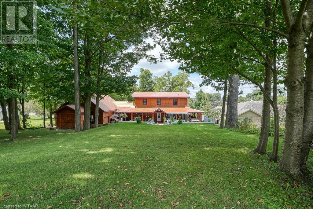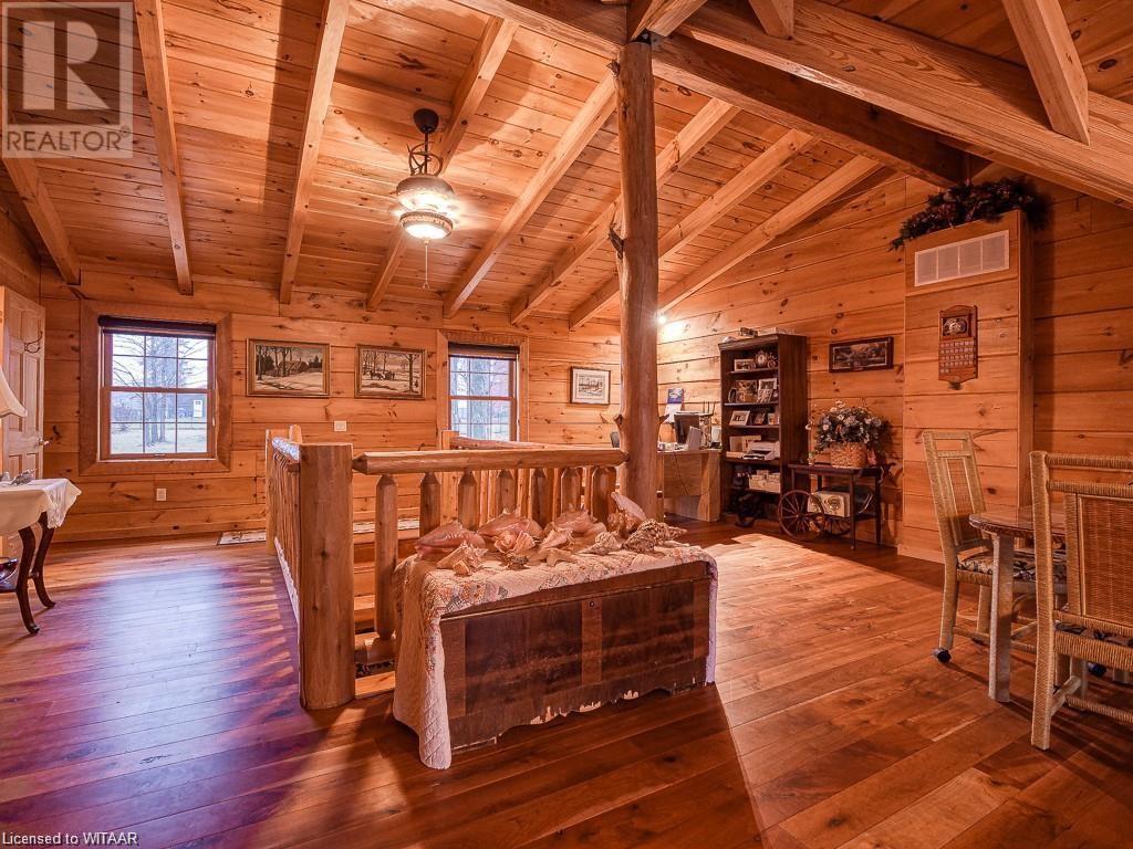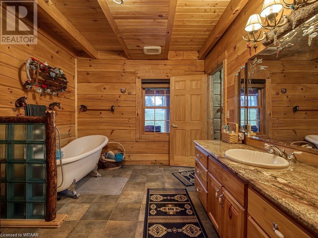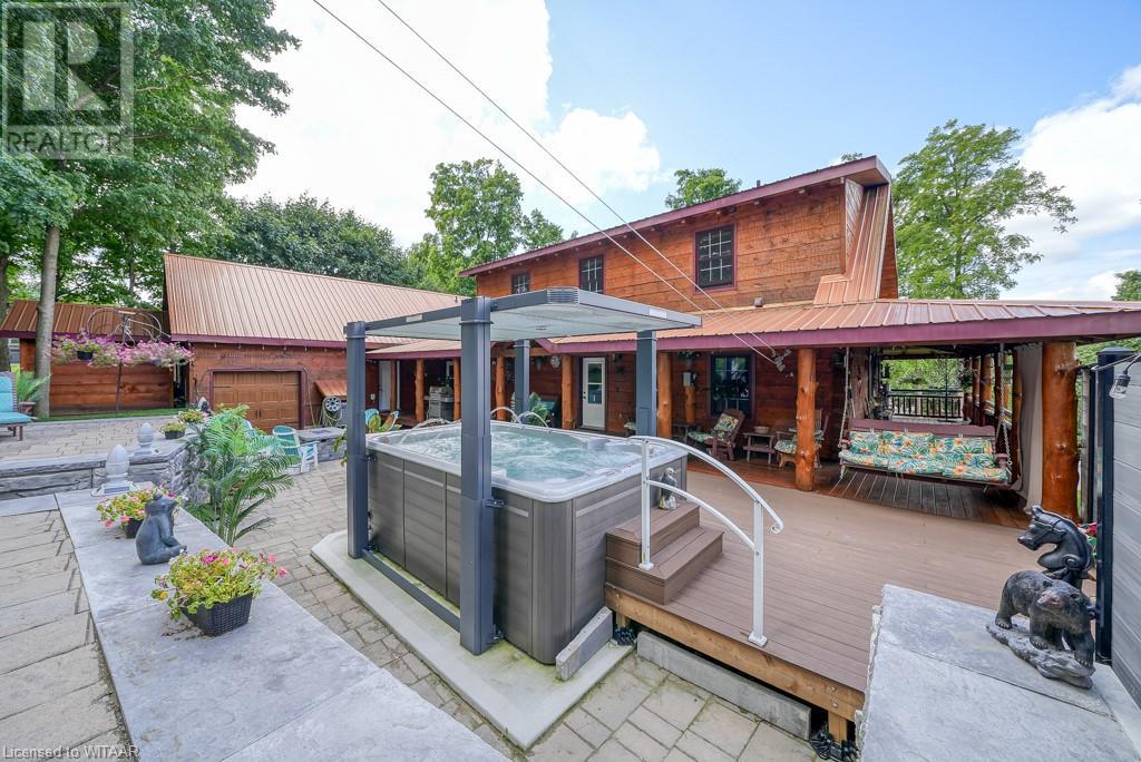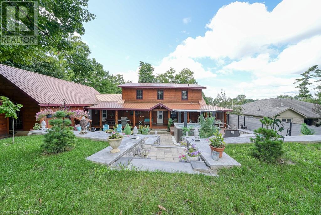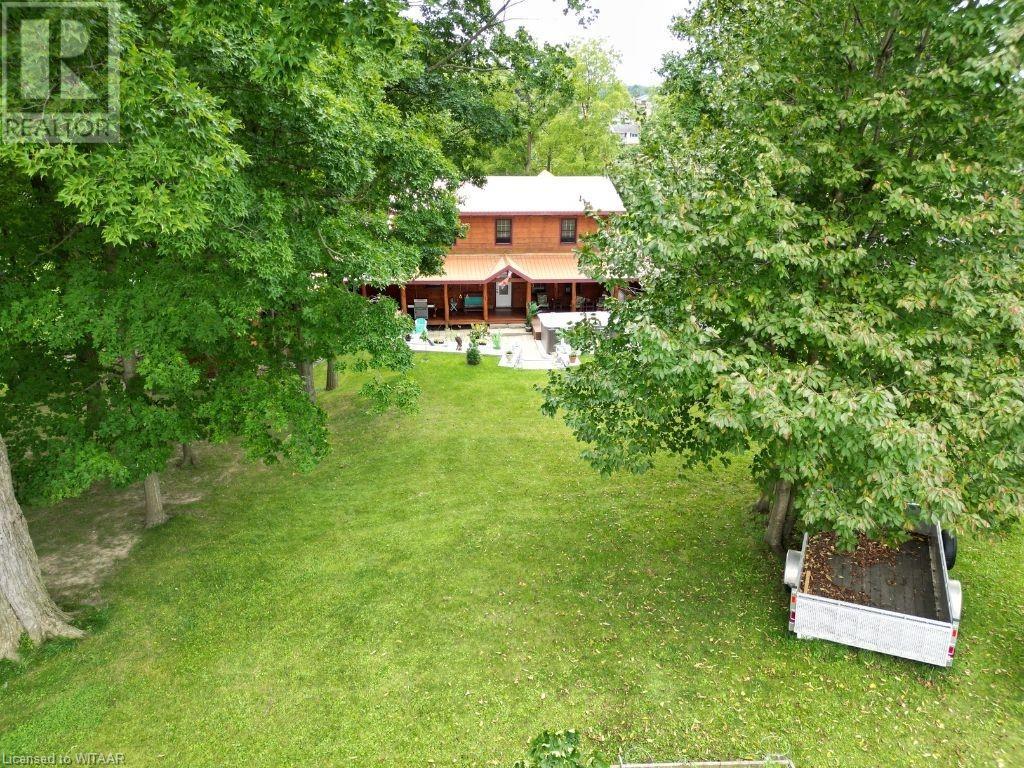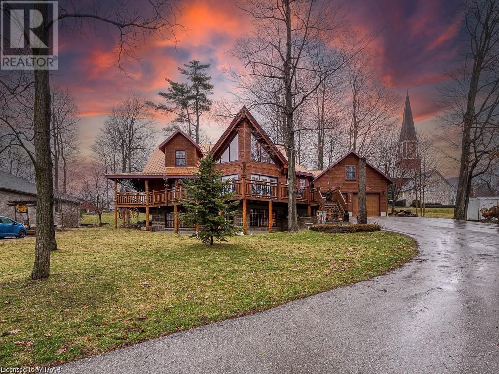 Almost $200k worth of upgrades have been added in the last year, including a regrarded and redone backyard with a swim spa featuring a power cover, a composite deck and fence, a 150,000 BTU built-in gas fireplace, and heated floors in both the garage and basement. This absolute showstopper is a custom log home located in Embro, a small community with all the amenities, less than 15 minutes from Woodstock, 20 minutes to Stratford, and 35 minutes to London. Situated on 0.6 acres with mature trees and a private backyard, the home offers a serene retreat. The garage is extra deep, accommodating parking for three vehicles with additional storage and a third garage door leading to the backyard. Enjoy a full wrap-around composite front porch, a fully finished walk-out basement, and a private back deck sitting area. Inside, the home exudes a cozy log cabin atmosphere with plenty of windows and a 20-foot great room that floods the space with natural light. The main floor features a primary bedroom with a walk-in closet and a cheater en-suite bathroom with a clawfoot soaker tub. The open kitchen boasts granite counters and ample space, including main floor laundry. Ascend the custom log staircase to an upstairs loft area with a large bedroom, walk-in closet, cheater en-suite with a walk-in shower, and an office loft area that could be enclosed to create additional bedrooms. The finished basement includes an additional bedroom with a walk-in closet and en-suite bathroom featuring a soaker tub. Additional upgrades include a steel roof, a stone gas fireplace, and cherry hardwood floors. This custom, well-thought-out home offers a true cottage lifestyle. (id:55009)