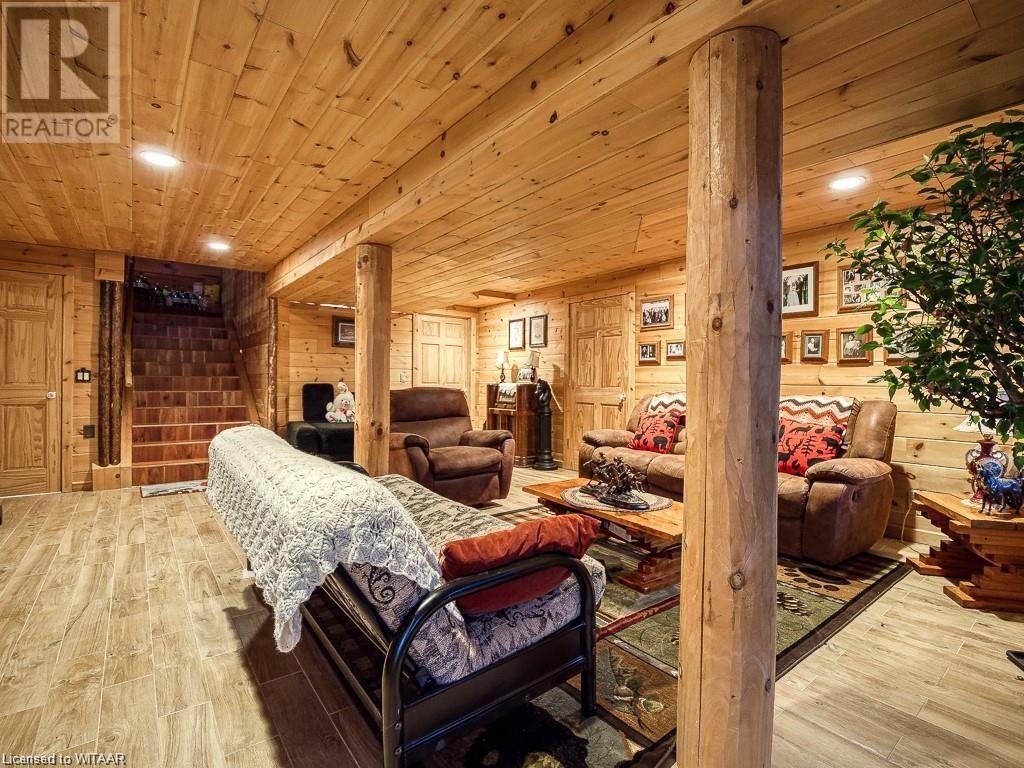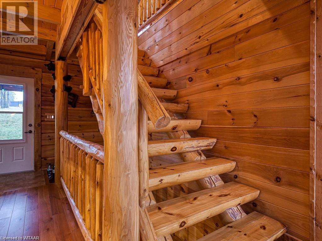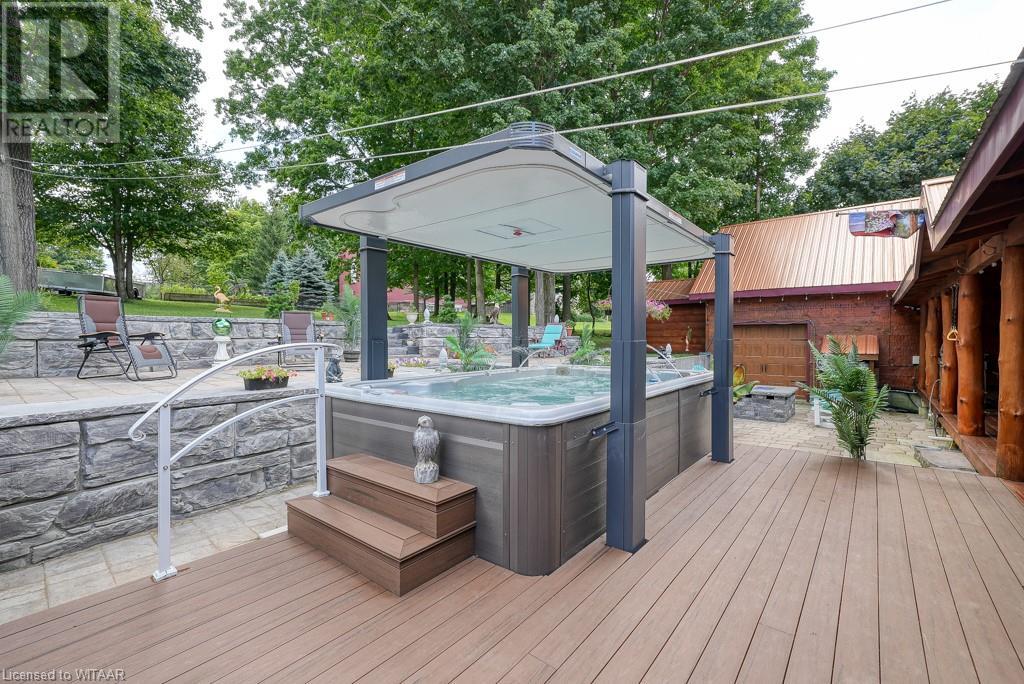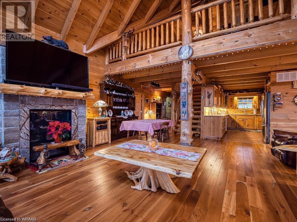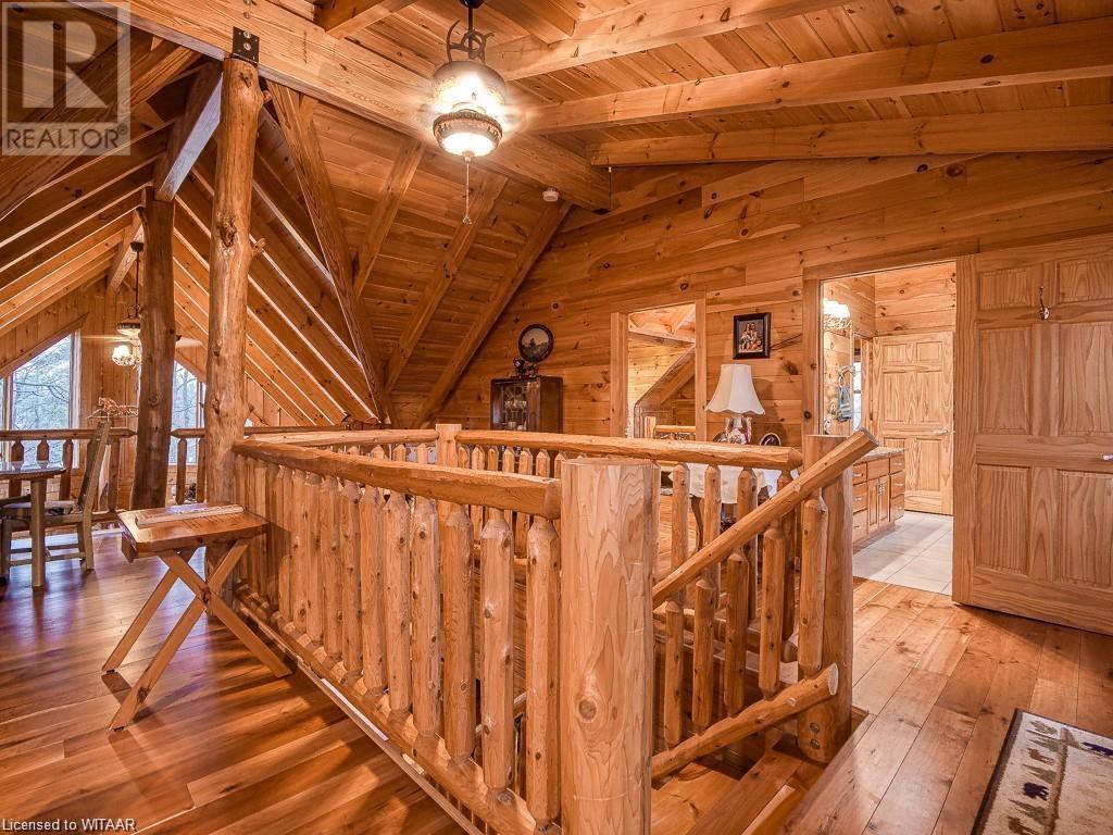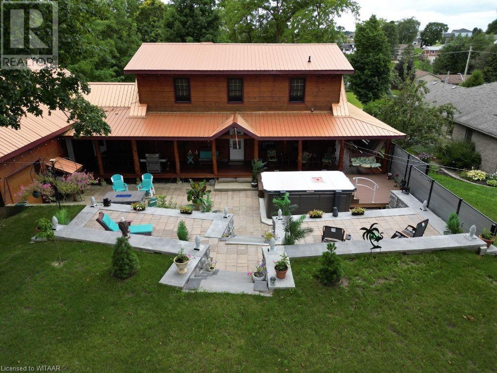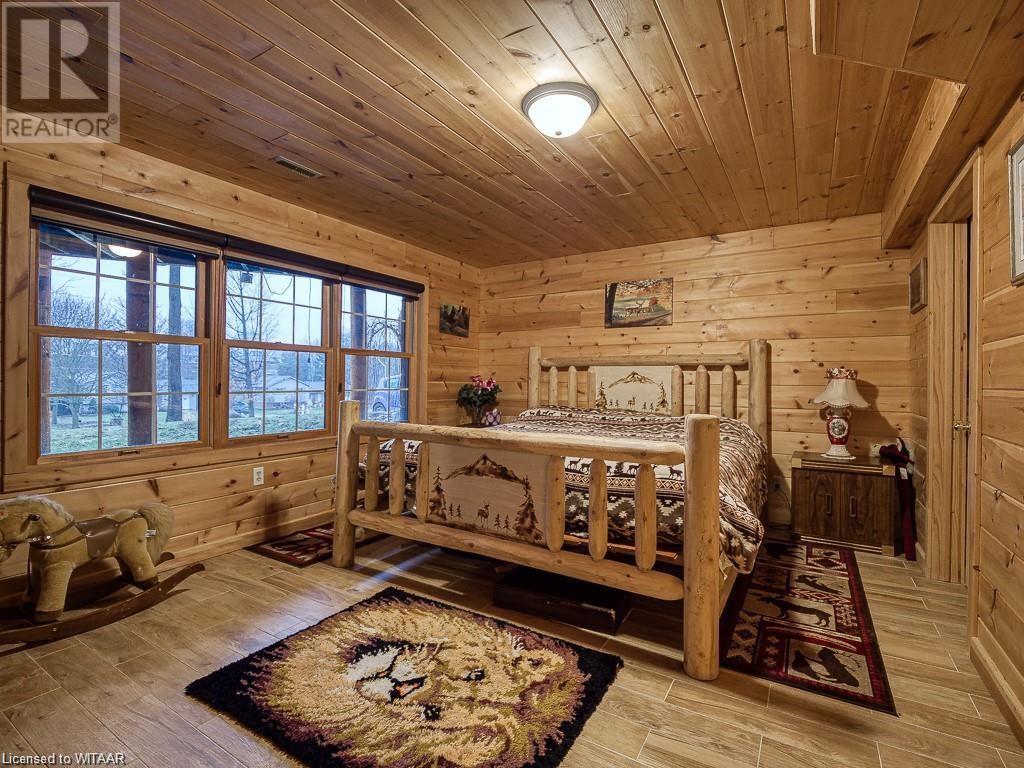 Almost $200k worth of upgrades have been added in the last year, including a regrarded and redone backyard with a swim spa featuring a power cover, a composite deck and fence, a 150,000 BTU built-in gas fireplace, and heated floors in both the garage and basement. This absolute showstopper is a custom log home located in Embro, a small community with all the amenities, less than 15 minutes from Woodstock, 20 minutes to Stratford, and 35 minutes to London. Situated on 0.6 acres with mature trees and a private backyard, the home offers a serene retreat. The garage is extra deep, accommodating parking for three vehicles with additional storage and a third garage door leading to the backyard. Enjoy a full wrap-around composite front porch, a fully finished walk-out basement, and a private back deck sitting area. Inside, the home exudes a cozy log cabin atmosphere with plenty of windows and a 20-foot great room that floods the space with natural light. The main floor features a primary bedroom with a walk-in closet and a cheater en-suite bathroom with a clawfoot soaker tub. The open kitchen boasts granite counters and ample space, including main floor laundry. Ascend the custom log staircase to an upstairs loft area with a large bedroom, walk-in closet, cheater en-suite with a walk-in shower, and an office loft area that could be enclosed to create additional bedrooms. The finished basement includes an additional bedroom with a walk-in closet and en-suite bathroom featuring a soaker tub. Additional upgrades include a steel roof, a stone gas fireplace, and cherry hardwood floors. This custom, well-thought-out home offers a true cottage lifestyle. (id:55009)