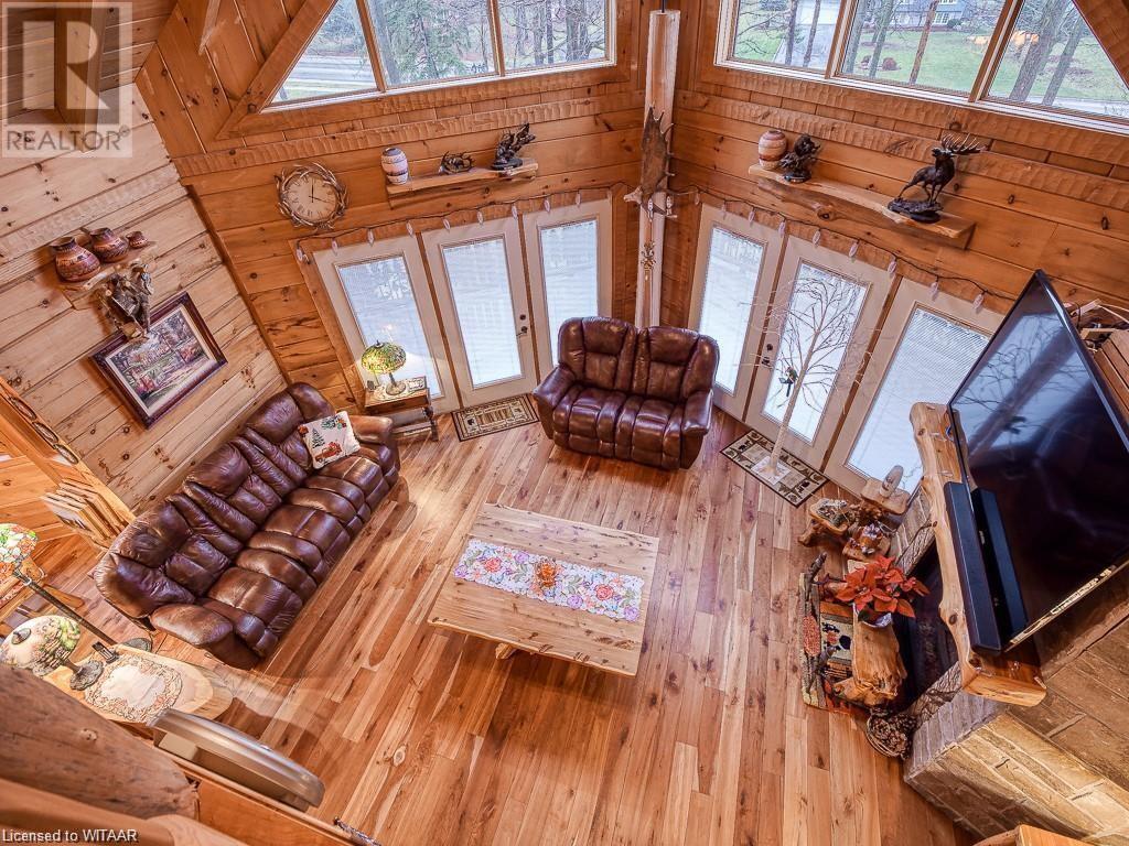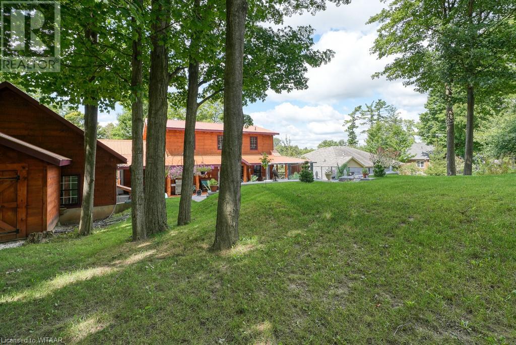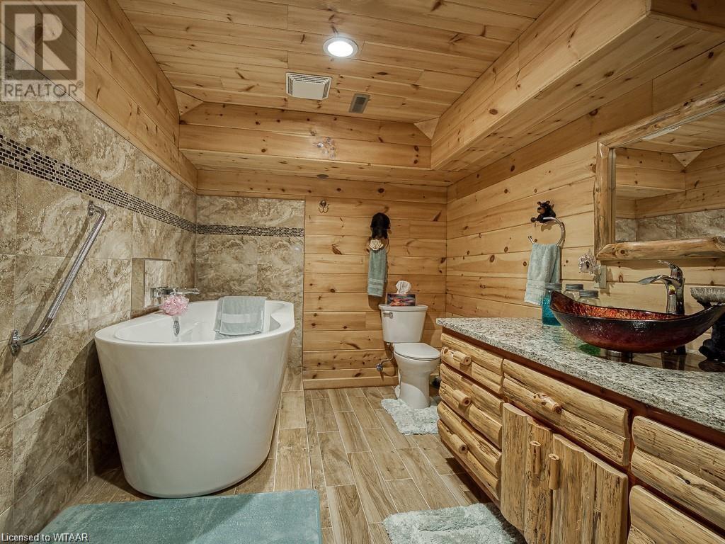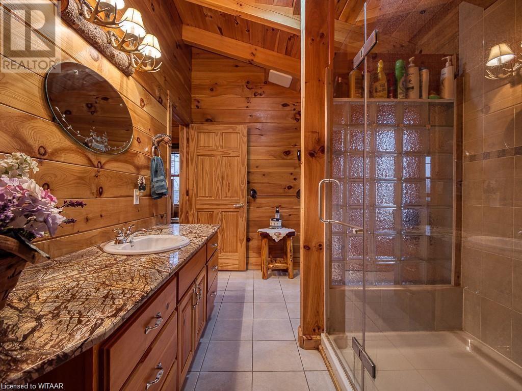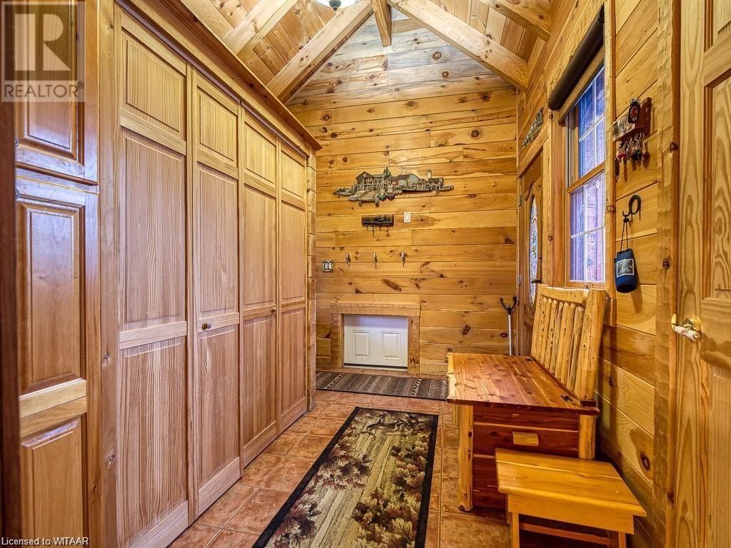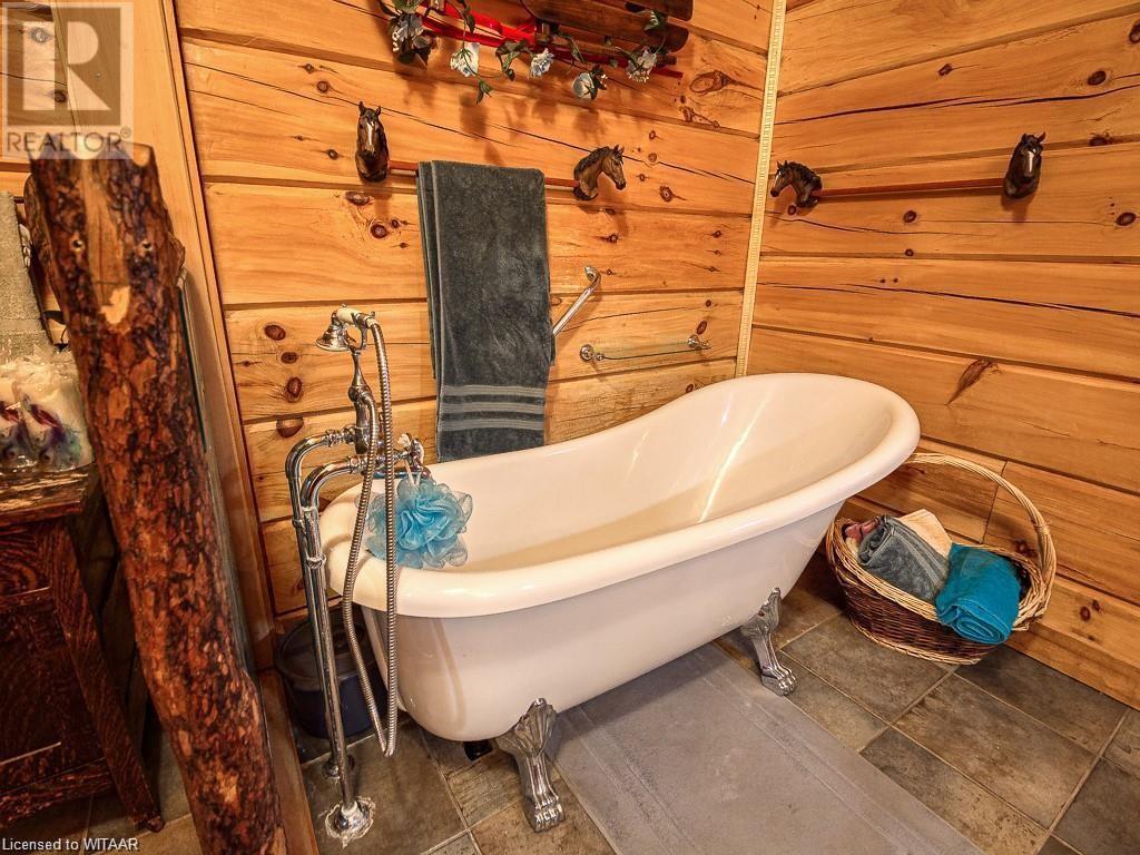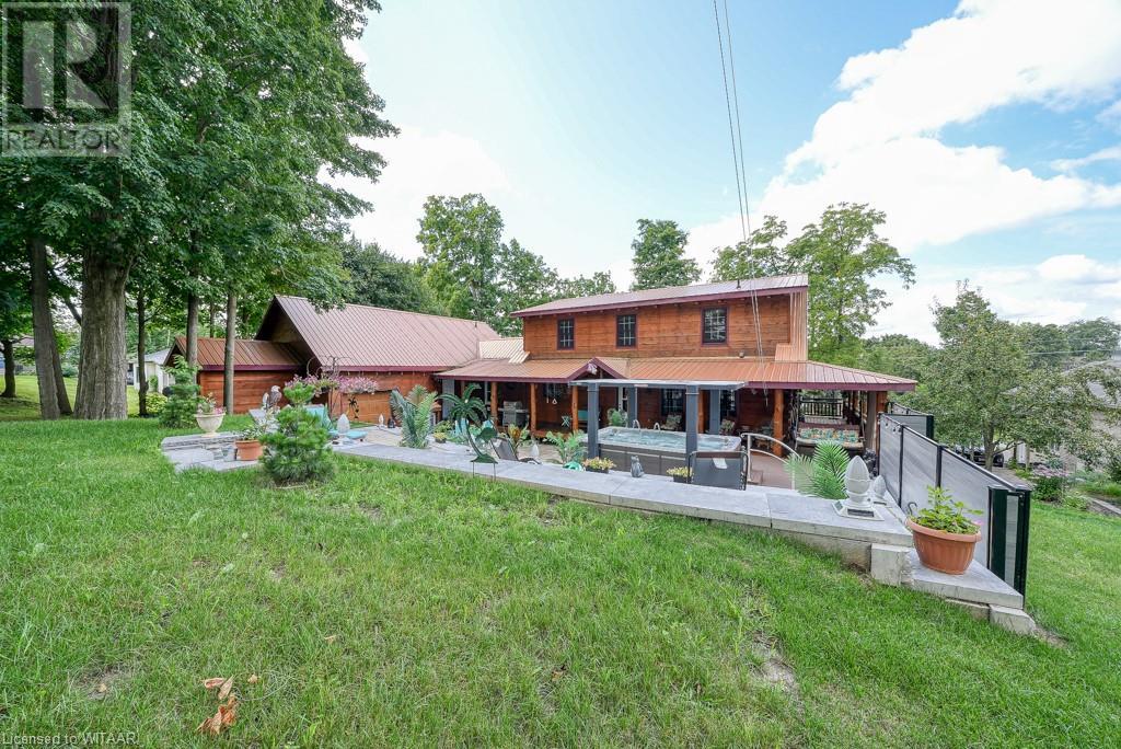 Almost $200k worth of upgrades have been added in the last year, including a regrarded and redone backyard with a swim spa featuring a power cover, a composite deck and fence, a 150,000 BTU built-in gas fireplace, and heated floors in both the garage and basement. This absolute showstopper is a custom log home located in Embro, a small community with all the amenities, less than 15 minutes from Woodstock, 20 minutes to Stratford, and 35 minutes to London. Situated on 0.6 acres with mature trees and a private backyard, the home offers a serene retreat. The garage is extra deep, accommodating parking for three vehicles with additional storage and a third garage door leading to the backyard. Enjoy a full wrap-around composite front porch, a fully finished walk-out basement, and a private back deck sitting area. Inside, the home exudes a cozy log cabin atmosphere with plenty of windows and a 20-foot great room that floods the space with natural light. The main floor features a primary bedroom with a walk-in closet and a cheater en-suite bathroom with a clawfoot soaker tub. The open kitchen boasts granite counters and ample space, including main floor laundry. Ascend the custom log staircase to an upstairs loft area with a large bedroom, walk-in closet, cheater en-suite with a walk-in shower, and an office loft area that could be enclosed to create additional bedrooms. The finished basement includes an additional bedroom with a walk-in closet and en-suite bathroom featuring a soaker tub. Additional upgrades include a steel roof, a stone gas fireplace, and cherry hardwood floors. This custom, well-thought-out home offers a true cottage lifestyle. (id:55009)