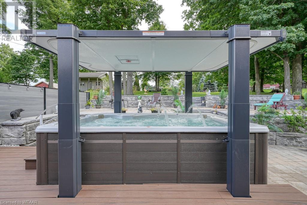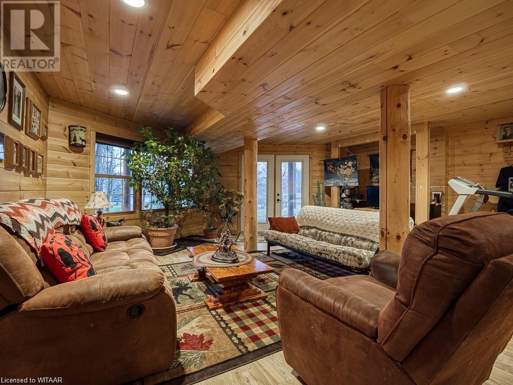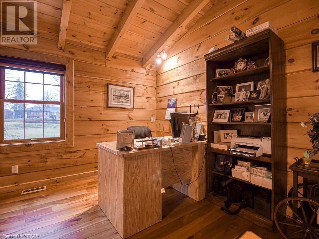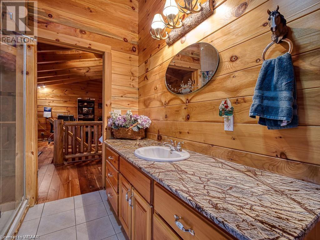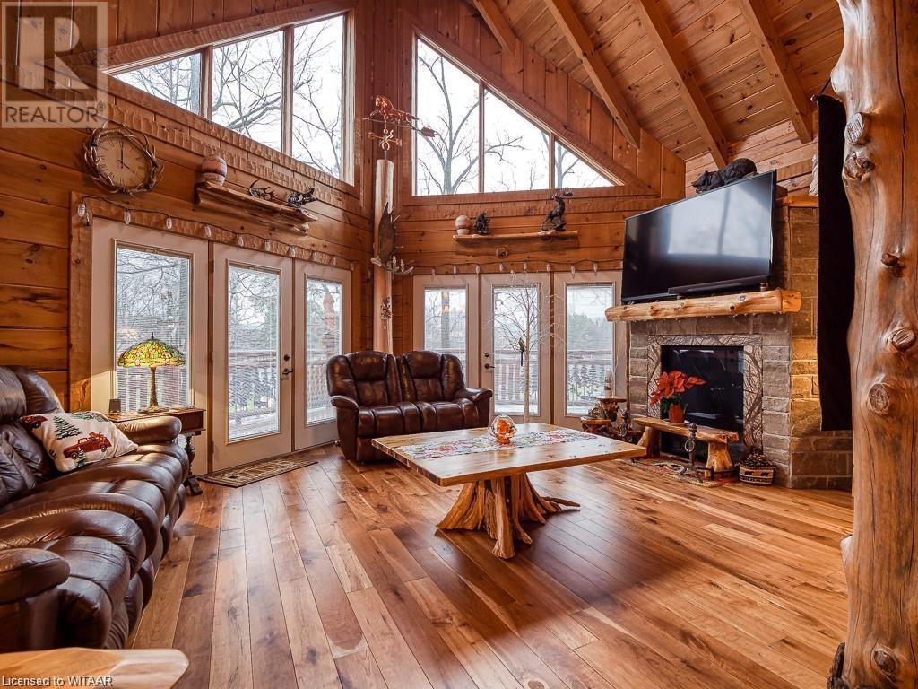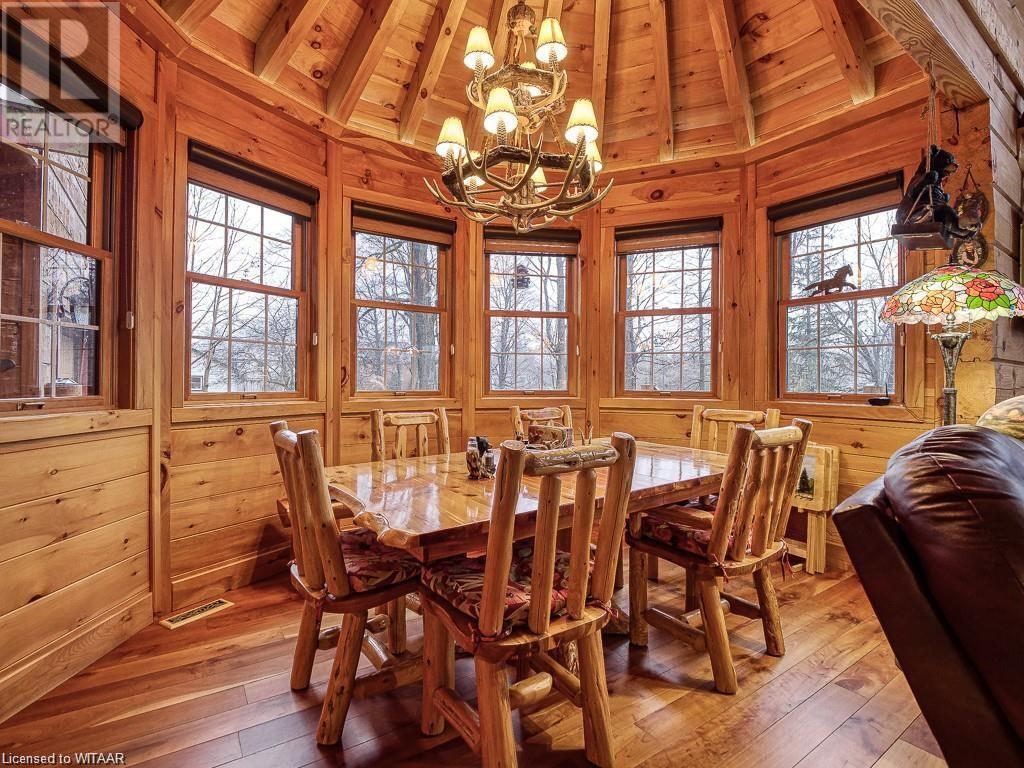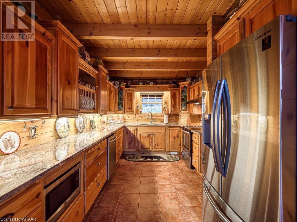 Almost $200k worth of upgrades have been added in the last year, including a regrarded and redone backyard with a swim spa featuring a power cover, a composite deck and fence, a 150,000 BTU built-in gas fireplace, and heated floors in both the garage and basement. This absolute showstopper is a custom log home located in Embro, a small community with all the amenities, less than 15 minutes from Woodstock, 20 minutes to Stratford, and 35 minutes to London. Situated on 0.6 acres with mature trees and a private backyard, the home offers a serene retreat. The garage is extra deep, accommodating parking for three vehicles with additional storage and a third garage door leading to the backyard. Enjoy a full wrap-around composite front porch, a fully finished walk-out basement, and a private back deck sitting area. Inside, the home exudes a cozy log cabin atmosphere with plenty of windows and a 20-foot great room that floods the space with natural light. The main floor features a primary bedroom with a walk-in closet and a cheater en-suite bathroom with a clawfoot soaker tub. The open kitchen boasts granite counters and ample space, including main floor laundry. Ascend the custom log staircase to an upstairs loft area with a large bedroom, walk-in closet, cheater en-suite with a walk-in shower, and an office loft area that could be enclosed to create additional bedrooms. The finished basement includes an additional bedroom with a walk-in closet and en-suite bathroom featuring a soaker tub. Additional upgrades include a steel roof, a stone gas fireplace, and cherry hardwood floors. This custom, well-thought-out home offers a true cottage lifestyle. (id:55009)