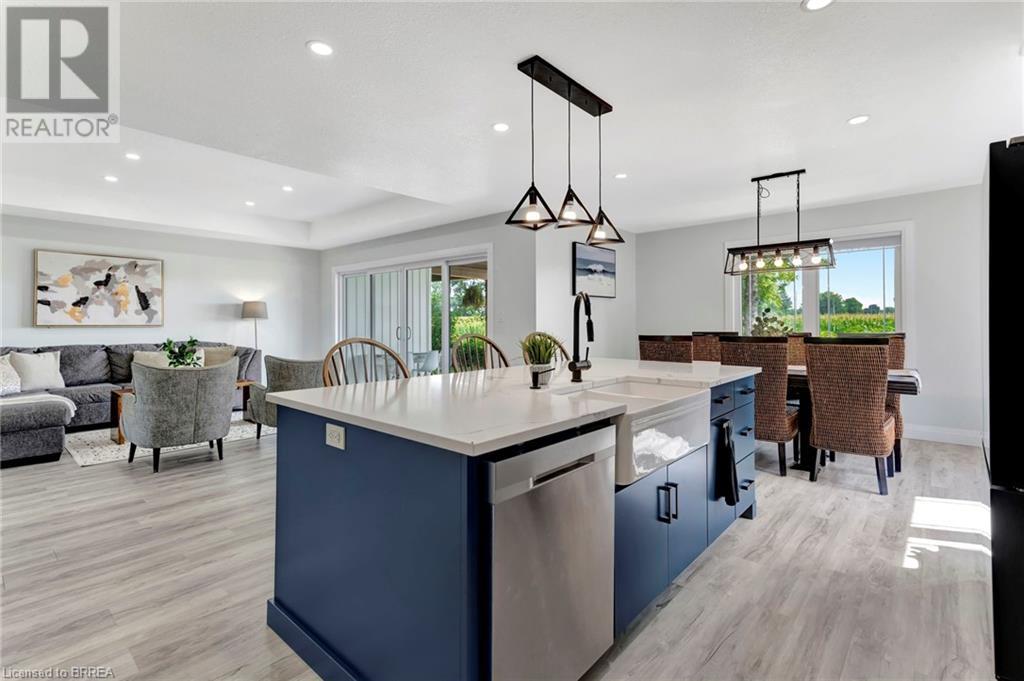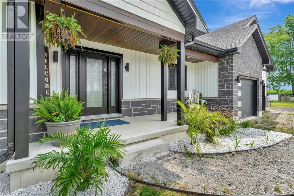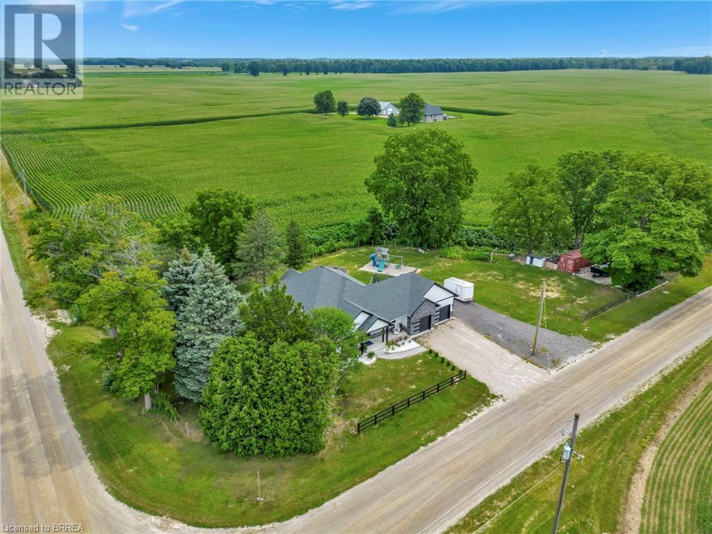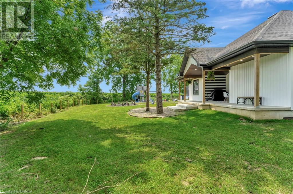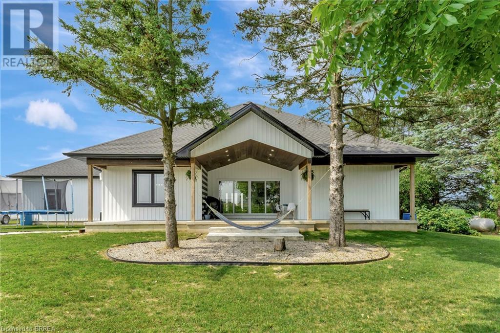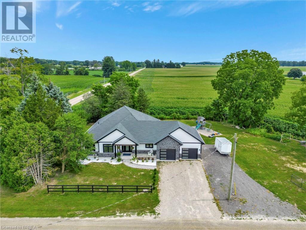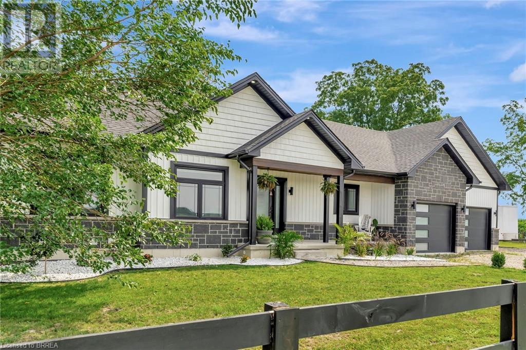 Discover the perfect blend of modern luxury and rural tranquility with this stunning bungalow resting amidst expansive fields of green. This home offers privacy, surrounded by mature trees and picturesque views with a chic exterior featuring black and stone accents, complemented by a double garage and an extended triple-wide driveway. The covered front entry with a full glass door, welcomes you into an open-concept foyer. Inside, the main floor boasts beautiful vinyl plank flooring that flows seamlessly throughout. The two-toned kitchen with blue island and base cabinets, white quartz counters, a farm-style sink, and stainless steel appliances is the heart of this home. Enjoy breakfast bar seating, recessed lighting, and modern fixtures as the kitchen extends into a spacious pantry equipped with an additional sink, counter, shelving, and ample prep space! The dining area showcases breathtaking views of the surrounding fields, while the living room features a tray ceiling and oversized walk-out access, flooding the space with natural light and providing access to indoor/outdoor living with ease. Step outside to the vaulted ceiling, covered porch that spans the width of the home, perfect for relaxing and entertaining. The primary bedroom is a serene retreat with a luxurious 5pc ensuite while two additional bedrooms share a 4pc bathroom. The main floor also includes a convenient laundry/mudroom with garage entry. The expansive finished basement, with deep windows makes it feel above grade and includes two more bedrooms as well as an office/den/playroom with glass french doors, and a 5pc bathroom, providing plenty of space for family and guests. The private yard is a blank canvas, ready for entertaining, outdoor activities, and more. Experience the best of rural living with modern conveniences in this exceptional property. Don't miss the opportunity to make this secluded, stylish bungalow your dream home. (id:55009)
