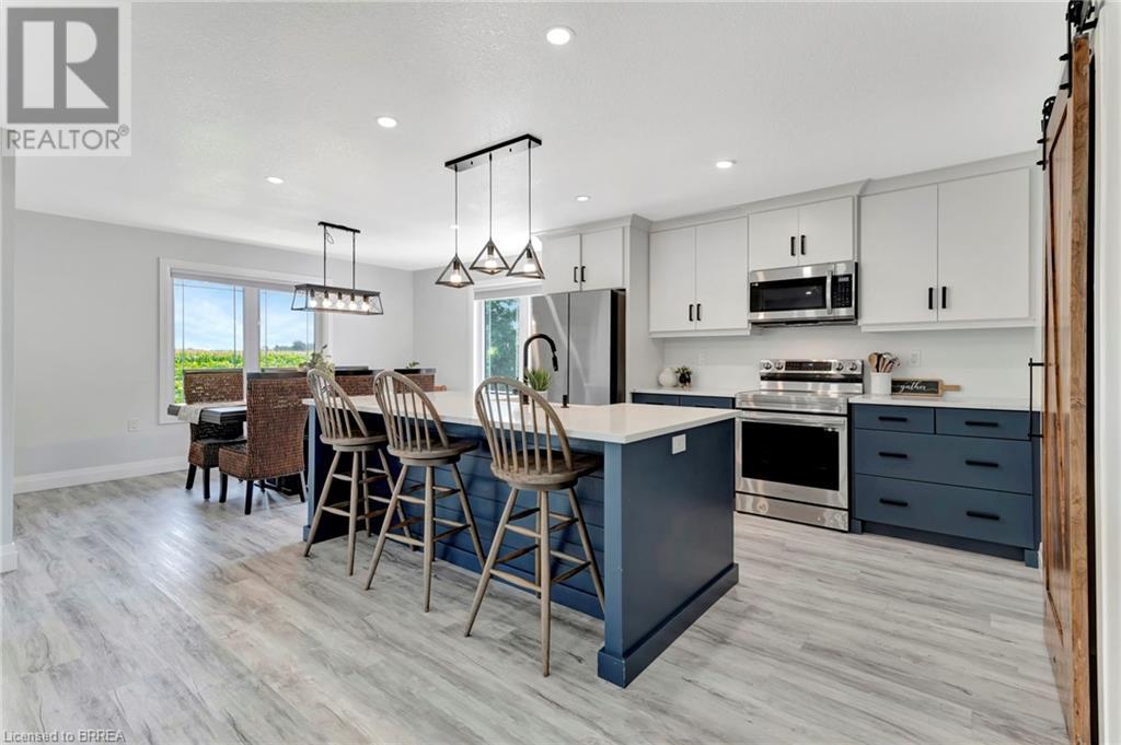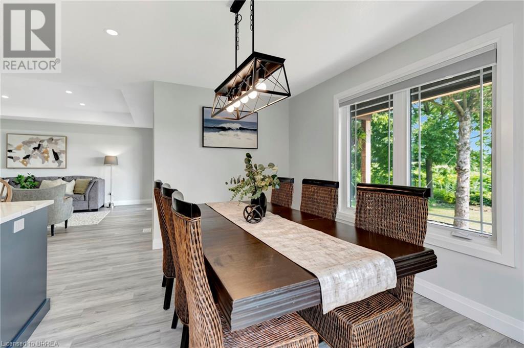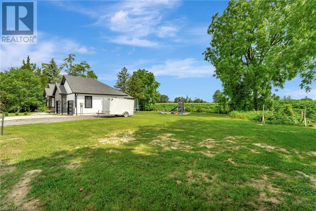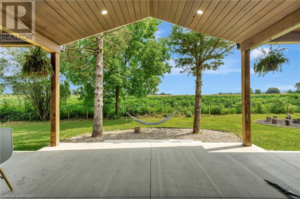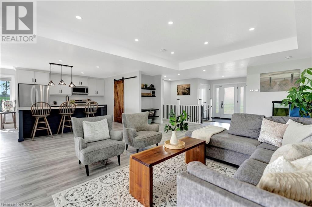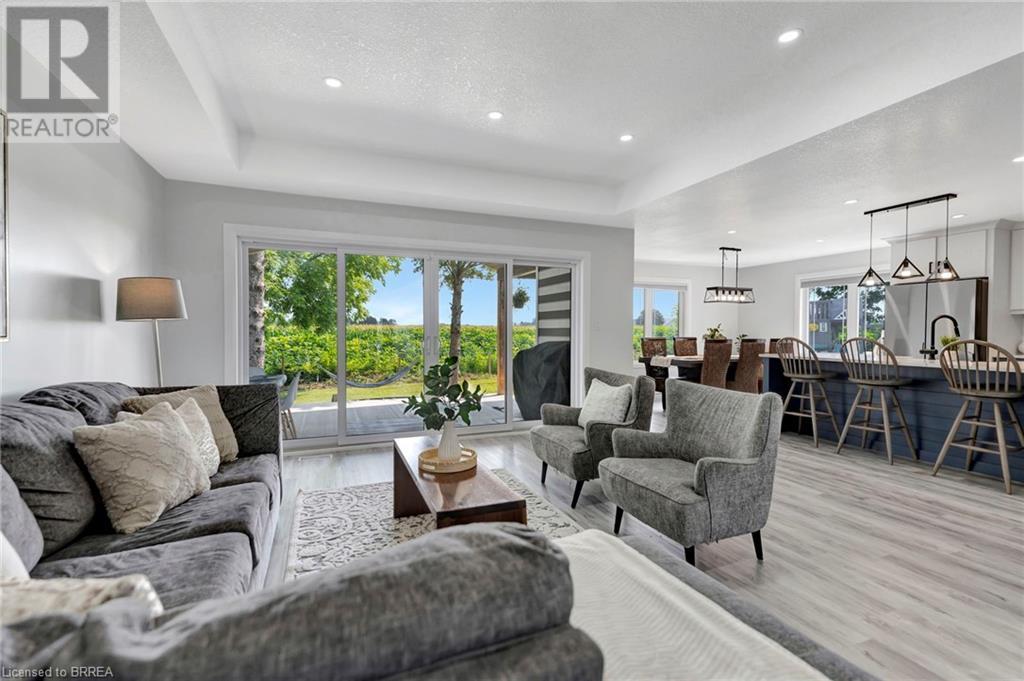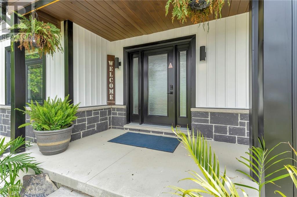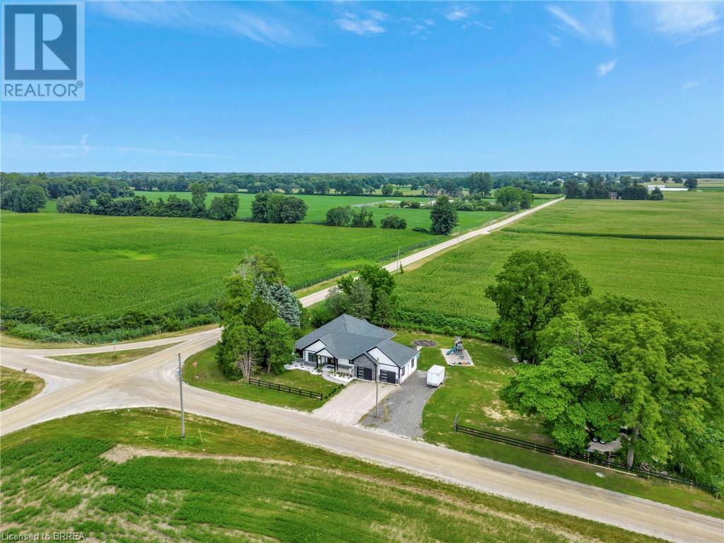 Discover the perfect blend of modern luxury and rural tranquility with this stunning bungalow resting amidst expansive fields of green. This home offers privacy, surrounded by mature trees and picturesque views with a chic exterior featuring black and stone accents, complemented by a double garage and an extended triple-wide driveway. The covered front entry with a full glass door, welcomes you into an open-concept foyer. Inside, the main floor boasts beautiful vinyl plank flooring that flows seamlessly throughout. The two-toned kitchen with blue island and base cabinets, white quartz counters, a farm-style sink, and stainless steel appliances is the heart of this home. Enjoy breakfast bar seating, recessed lighting, and modern fixtures as the kitchen extends into a spacious pantry equipped with an additional sink, counter, shelving, and ample prep space! The dining area showcases breathtaking views of the surrounding fields, while the living room features a tray ceiling and oversized walk-out access, flooding the space with natural light and providing access to indoor/outdoor living with ease. Step outside to the vaulted ceiling, covered porch that spans the width of the home, perfect for relaxing and entertaining. The primary bedroom is a serene retreat with a luxurious 5pc ensuite while two additional bedrooms share a 4pc bathroom. The main floor also includes a convenient laundry/mudroom with garage entry. The expansive finished basement, with deep windows makes it feel above grade and includes two more bedrooms as well as an office/den/playroom with glass french doors, and a 5pc bathroom, providing plenty of space for family and guests. The private yard is a blank canvas, ready for entertaining, outdoor activities, and more. Experience the best of rural living with modern conveniences in this exceptional property. Don't miss the opportunity to make this secluded, stylish bungalow your dream home. (id:55009)