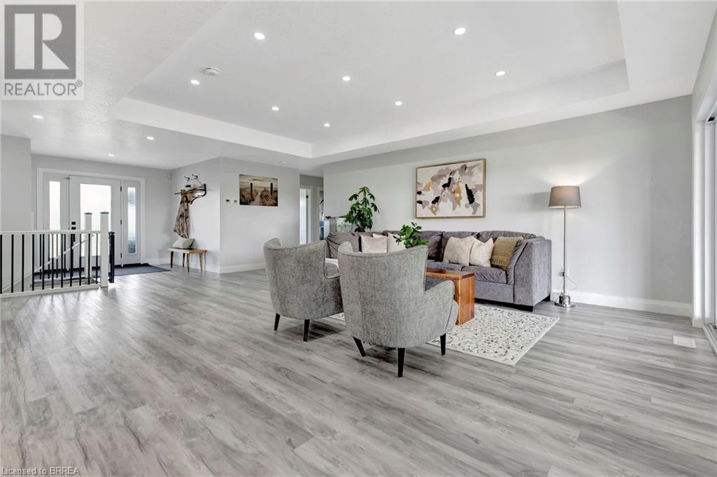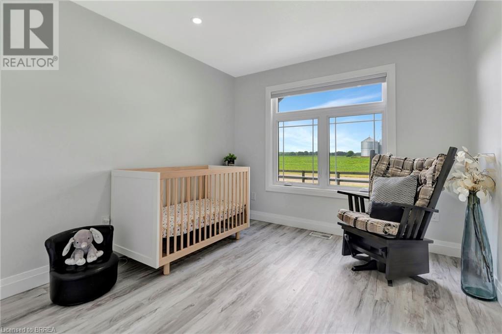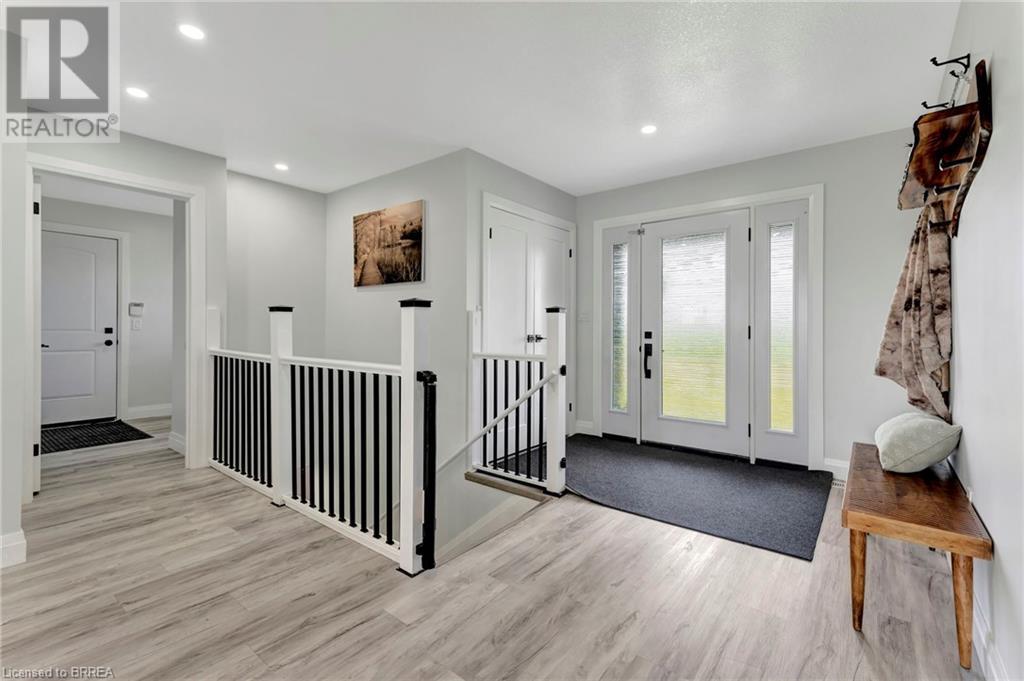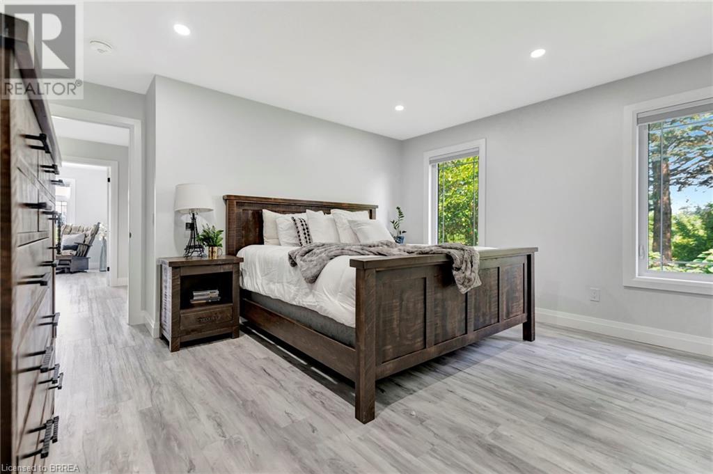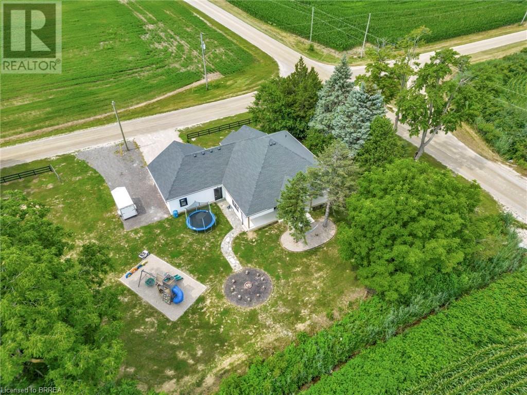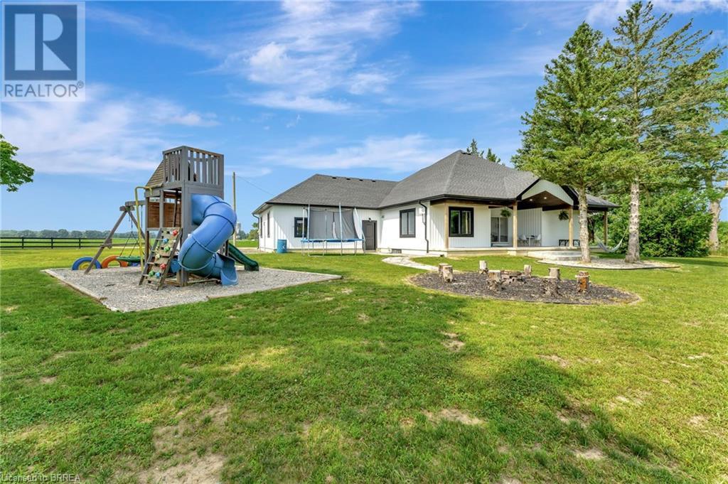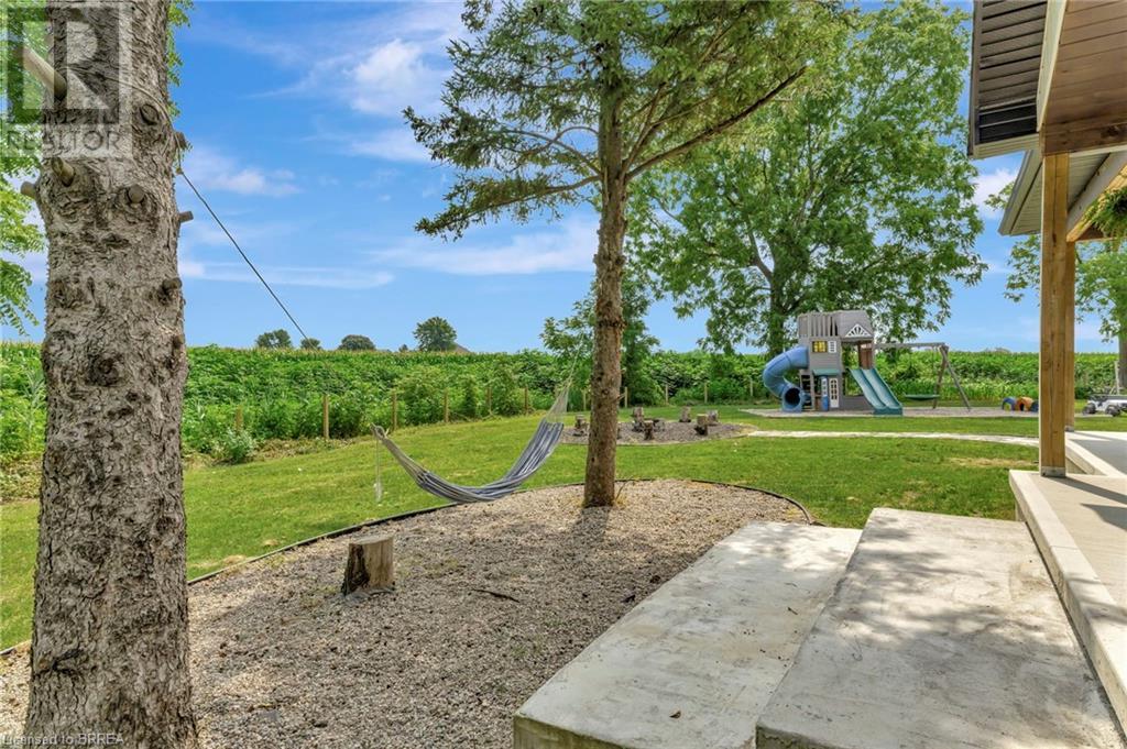 Discover the perfect blend of modern luxury and rural tranquility with this stunning bungalow resting amidst expansive fields of green. This home offers privacy, surrounded by mature trees and picturesque views with a chic exterior featuring black and stone accents, complemented by a double garage and an extended triple-wide driveway. The covered front entry with a full glass door, welcomes you into an open-concept foyer. Inside, the main floor boasts beautiful vinyl plank flooring that flows seamlessly throughout. The two-toned kitchen with blue island and base cabinets, white quartz counters, a farm-style sink, and stainless steel appliances is the heart of this home. Enjoy breakfast bar seating, recessed lighting, and modern fixtures as the kitchen extends into a spacious pantry equipped with an additional sink, counter, shelving, and ample prep space! The dining area showcases breathtaking views of the surrounding fields, while the living room features a tray ceiling and oversized walk-out access, flooding the space with natural light and providing access to indoor/outdoor living with ease. Step outside to the vaulted ceiling, covered porch that spans the width of the home, perfect for relaxing and entertaining. The primary bedroom is a serene retreat with a luxurious 5pc ensuite while two additional bedrooms share a 4pc bathroom. The main floor also includes a convenient laundry/mudroom with garage entry. The expansive finished basement, with deep windows makes it feel above grade and includes two more bedrooms as well as an office/den/playroom with glass french doors, and a 5pc bathroom, providing plenty of space for family and guests. The private yard is a blank canvas, ready for entertaining, outdoor activities, and more. Experience the best of rural living with modern conveniences in this exceptional property. Don't miss the opportunity to make this secluded, stylish bungalow your dream home. (id:55009)