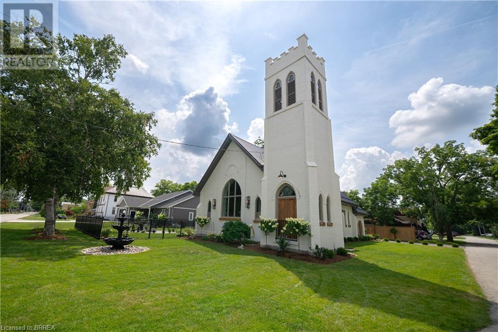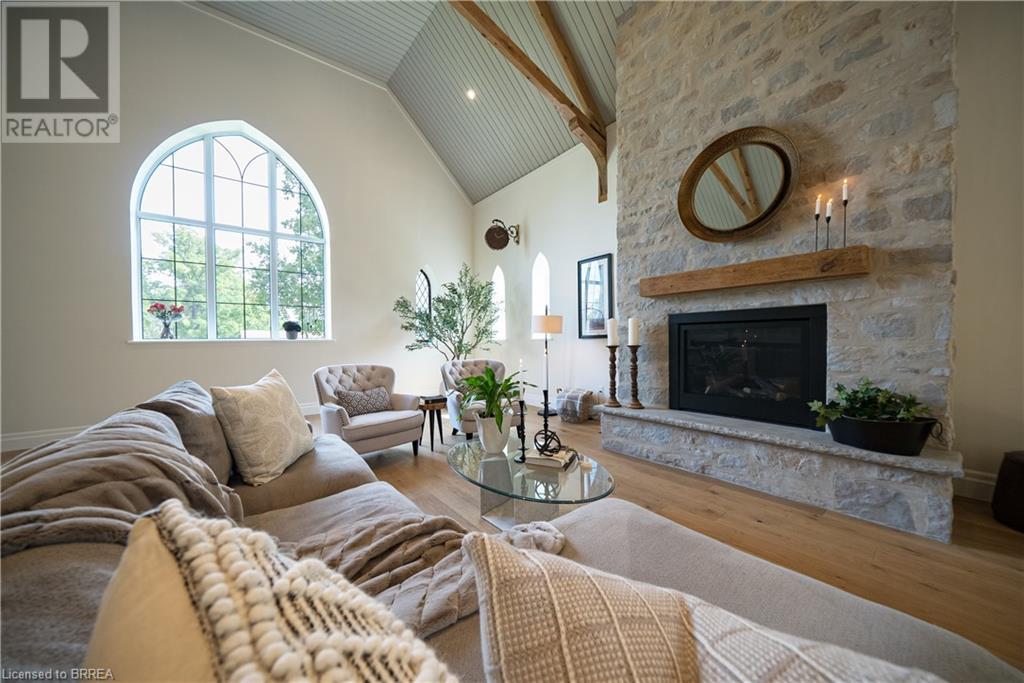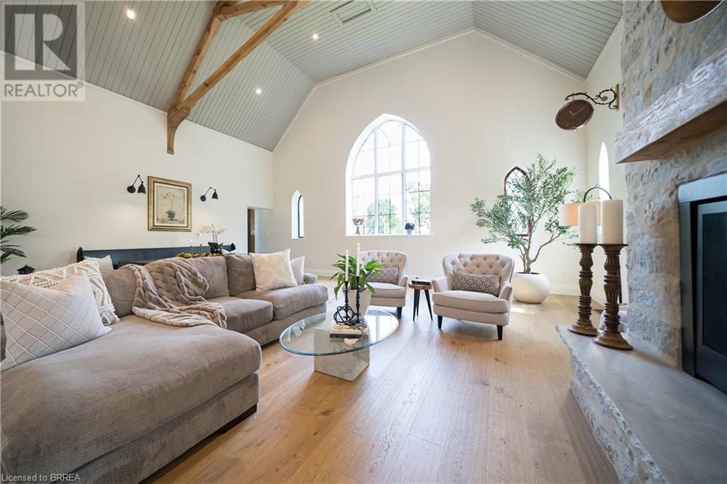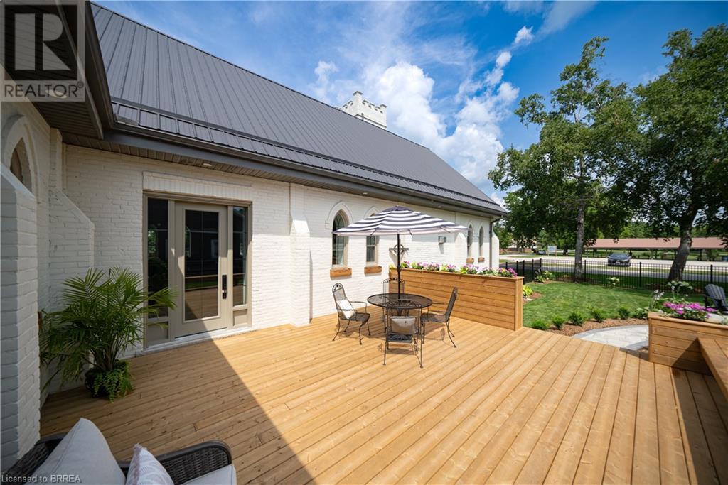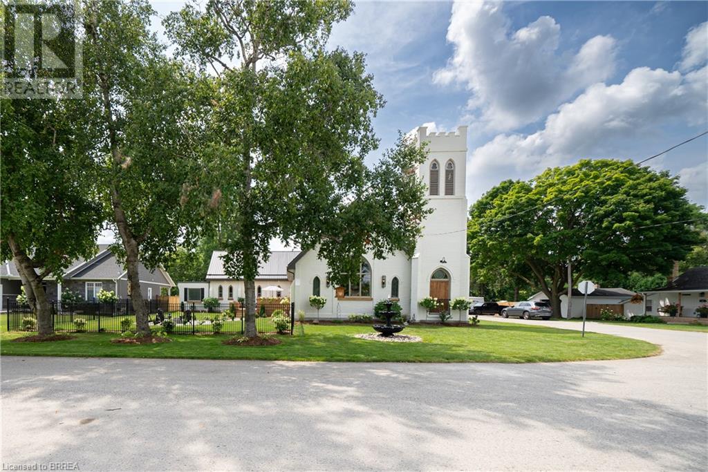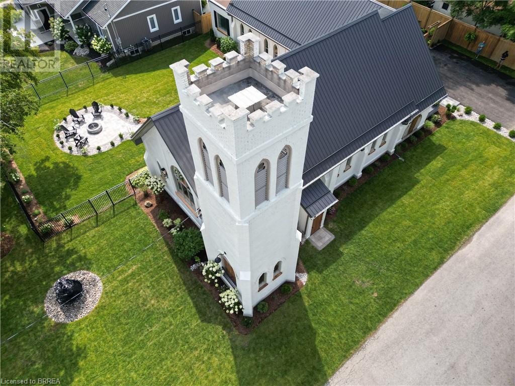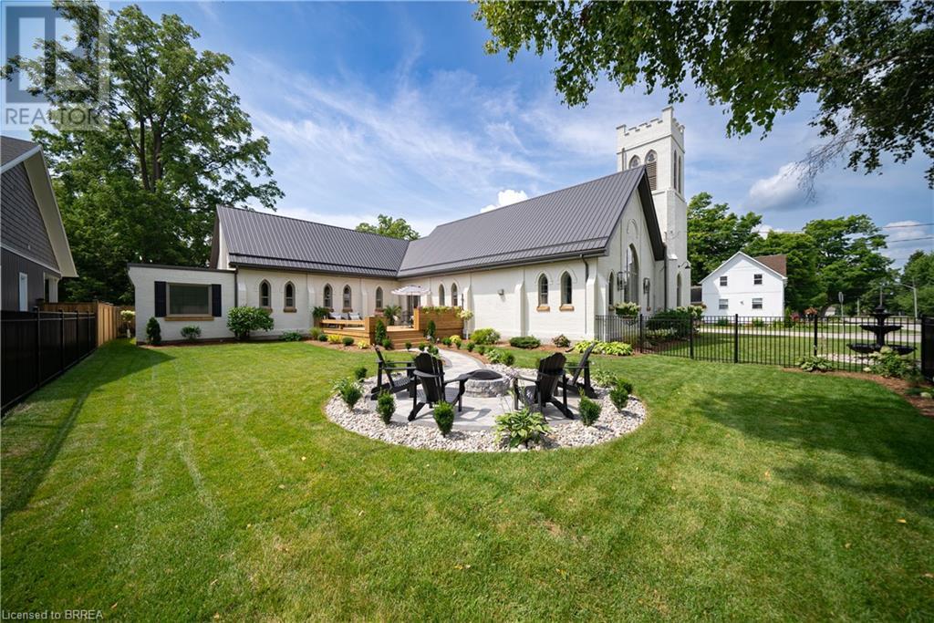 Own a piece of history in the quaint town of Parkhill, 15 min to the sandy beaches of Lake Huron. This landmark is a one of a kind church conversion to a luxury quality crafted home. Enter to a spacious foyer, graced with a striking light fixture and highlighted by custom millwork feature wall and secret door to cloak room. Jaw dropping great room featuring 18' ceilings of original tongue and groove construction with hand hewn beams and floor to ceiling stone gas fireplace. The gourmet kitchen features 10' x 5' island with quartz counter top, white oak cabinetry with co-ordinating custom china cabinet, range hood and fluted dining table. Several custom conveniences can be found including an appliance pantry with tuck away doors, oil and spice pull outs, cutlery organizer and many more surprises for you to find. Leading off the great room is the original 1914 Bell Tower room with Menelly Bell Troy, New York working bell and juliet balcony. Three generous bedrooms, a main floor laundry, and two full baths (one ensuite) that are beautifully appointed with spa like features complete this setting you will be proud to welcome friends and family to. Outside you will find multiple sitting areas including an expansive deck and patio with family fire pit you can enjoy year round in this charming community. A rare home you'll fall in love with. (id:55009)