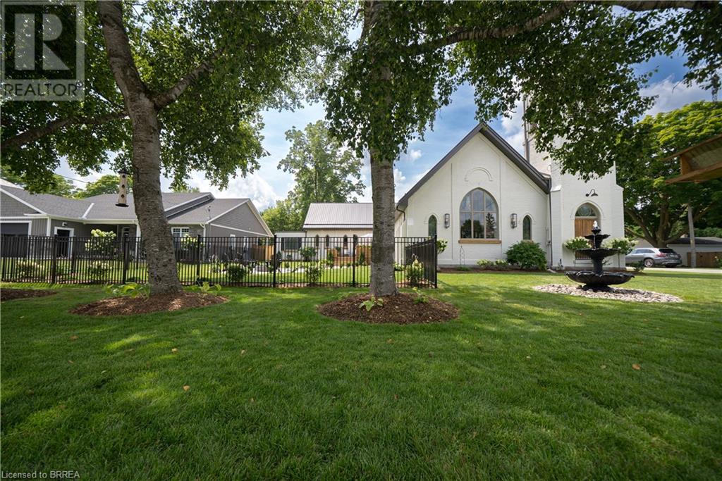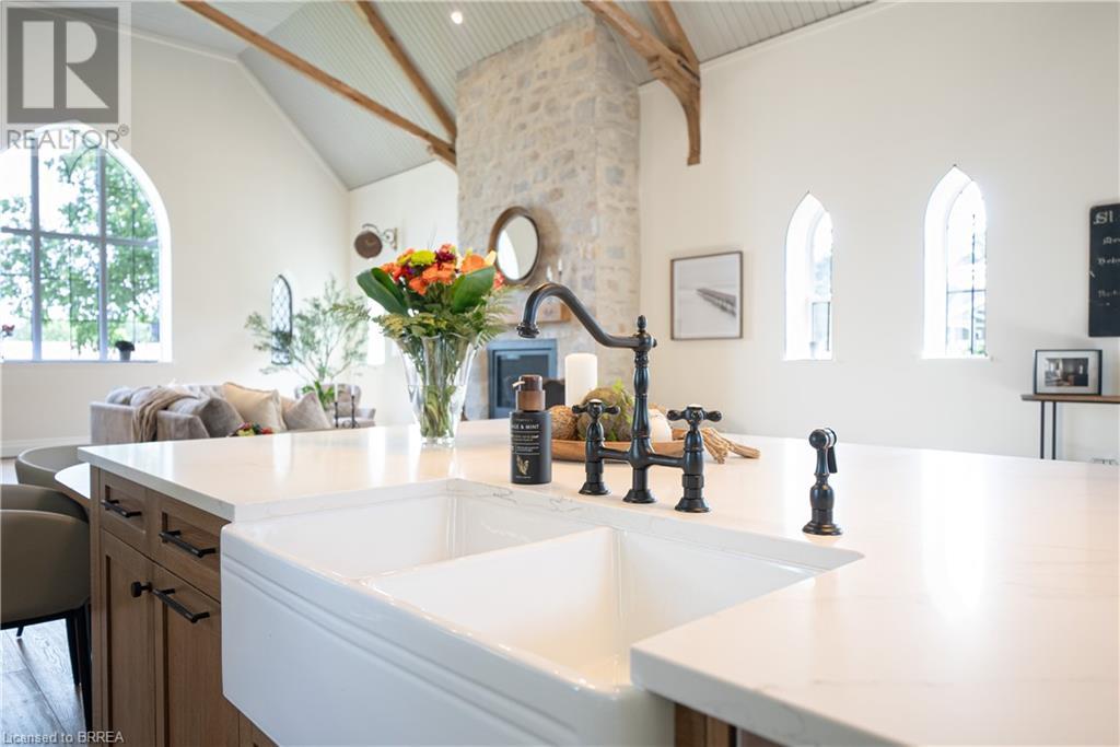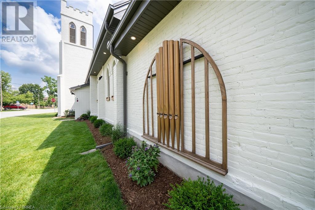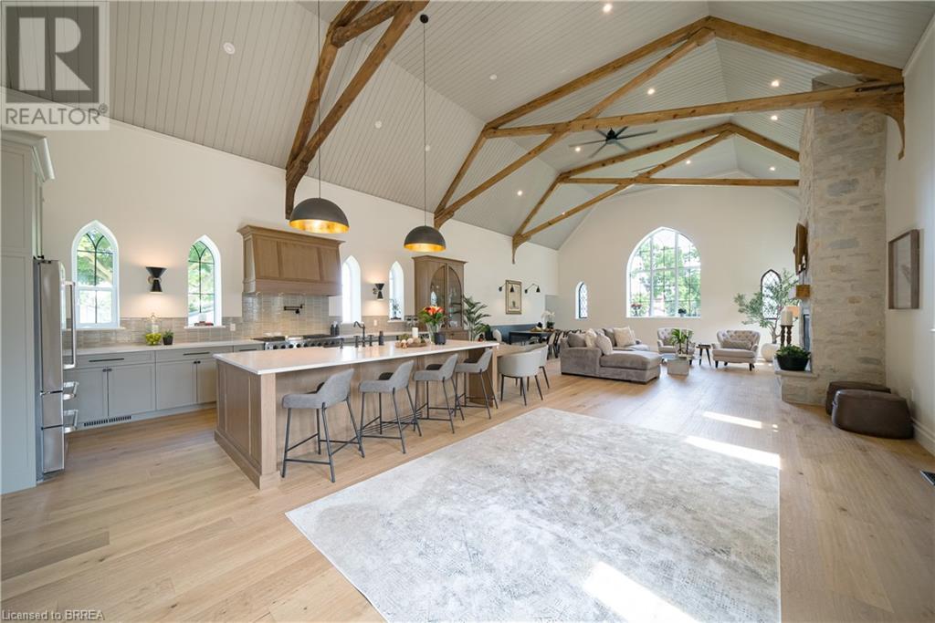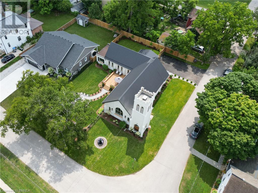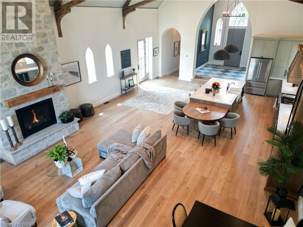 Own a piece of history in the quaint town of Parkhill, 15 min to the sandy beaches of Lake Huron. This landmark is a one of a kind church conversion to a luxury quality crafted home. Enter to a spacious foyer, graced with a striking light fixture and highlighted by custom millwork feature wall and secret door to cloak room. Jaw dropping great room featuring 18' ceilings of original tongue and groove construction with hand hewn beams and floor to ceiling stone gas fireplace. The gourmet kitchen features 10' x 5' island with quartz counter top, white oak cabinetry with co-ordinating custom china cabinet, range hood and fluted dining table. Several custom conveniences can be found including an appliance pantry with tuck away doors, oil and spice pull outs, cutlery organizer and many more surprises for you to find. Leading off the great room is the original 1914 Bell Tower room with Menelly Bell Troy, New York working bell and juliet balcony. Three generous bedrooms, a main floor laundry, and two full baths (one ensuite) that are beautifully appointed with spa like features complete this setting you will be proud to welcome friends and family to. Outside you will find multiple sitting areas including an expansive deck and patio with family fire pit you can enjoy year round in this charming community. A rare home you'll fall in love with. (id:55009)