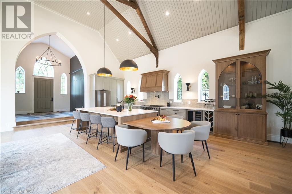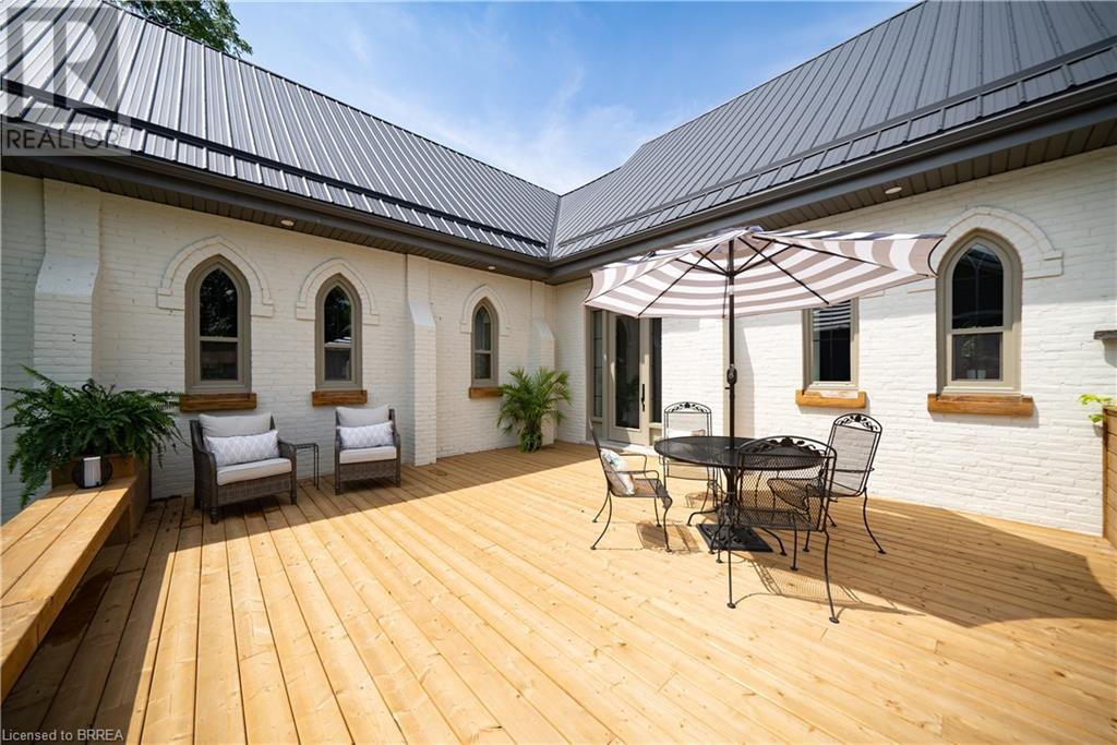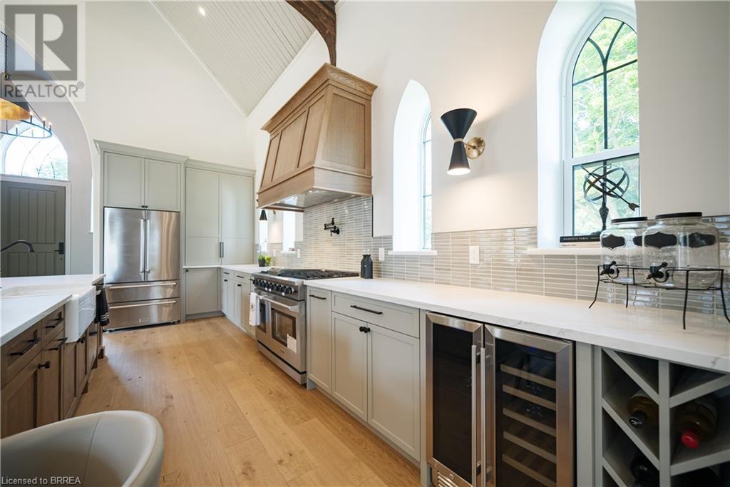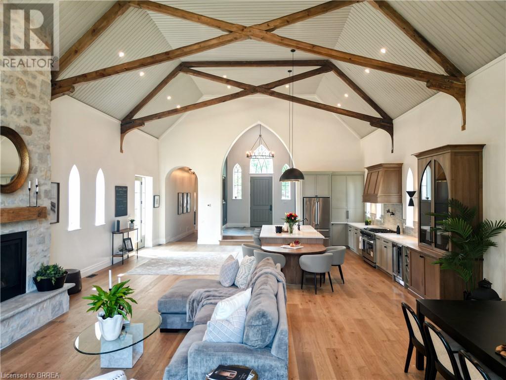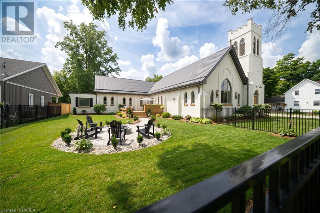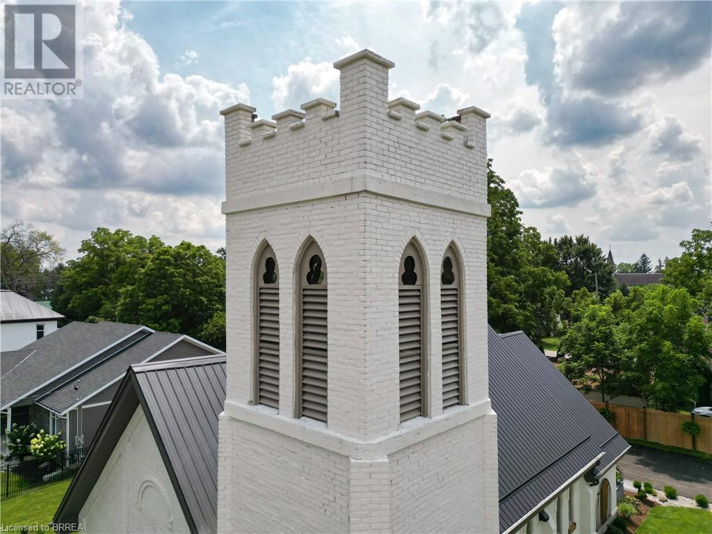 Own a piece of history in the quaint town of Parkhill, 15 min to the sandy beaches of Lake Huron. This landmark is a one of a kind church conversion to a luxury quality crafted home. Enter to a spacious foyer, graced with a striking light fixture and highlighted by custom millwork feature wall and secret door to cloak room. Jaw dropping great room featuring 18' ceilings of original tongue and groove construction with hand hewn beams and floor to ceiling stone gas fireplace. The gourmet kitchen features 10' x 5' island with quartz counter top, white oak cabinetry with co-ordinating custom china cabinet, range hood and fluted dining table. Several custom conveniences can be found including an appliance pantry with tuck away doors, oil and spice pull outs, cutlery organizer and many more surprises for you to find. Leading off the great room is the original 1914 Bell Tower room with Menelly Bell Troy, New York working bell and juliet balcony. Three generous bedrooms, a main floor laundry, and two full baths (one ensuite) that are beautifully appointed with spa like features complete this setting you will be proud to welcome friends and family to. Outside you will find multiple sitting areas including an expansive deck and patio with family fire pit you can enjoy year round in this charming community. A rare home you'll fall in love with. (id:55009)