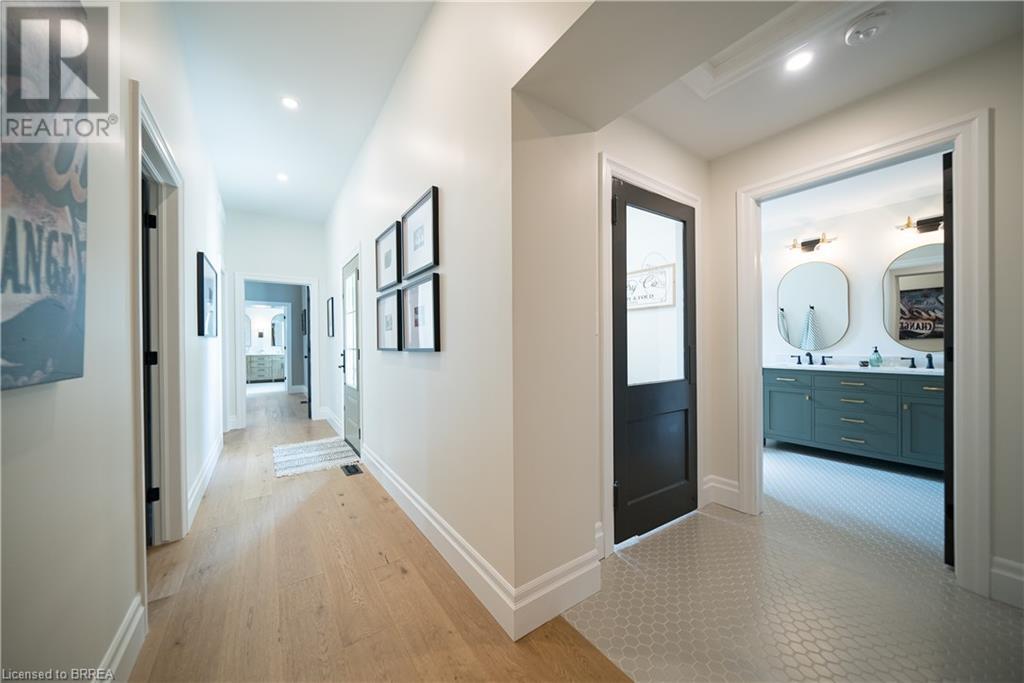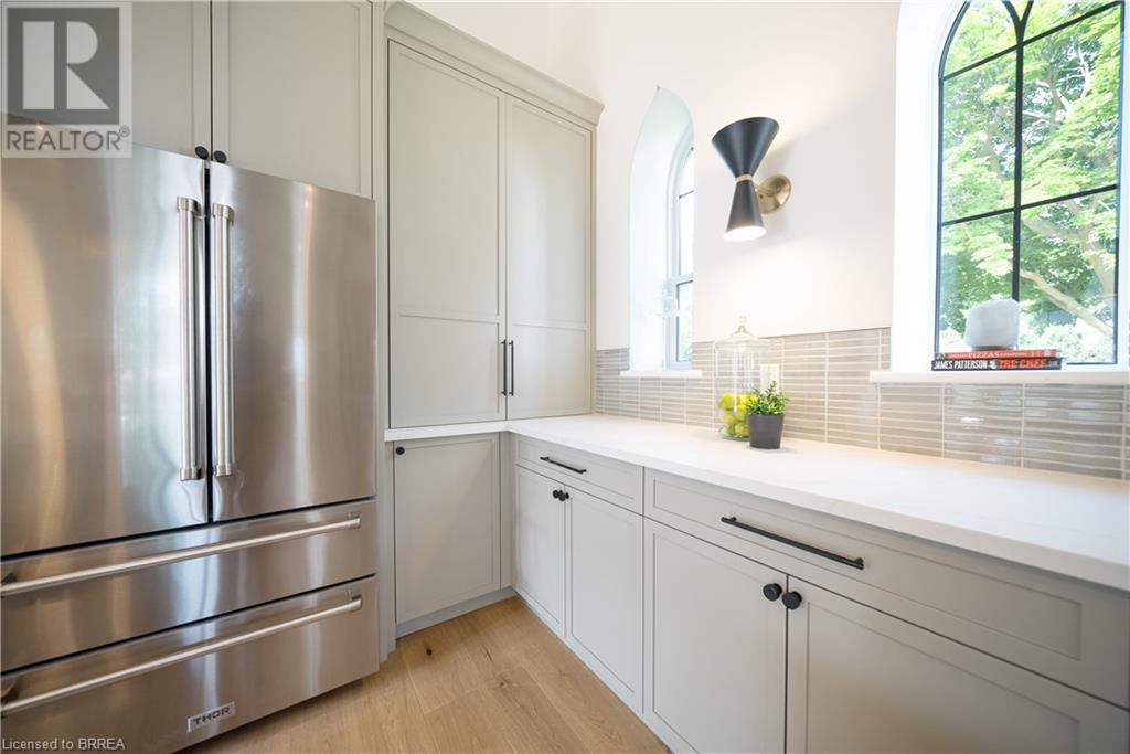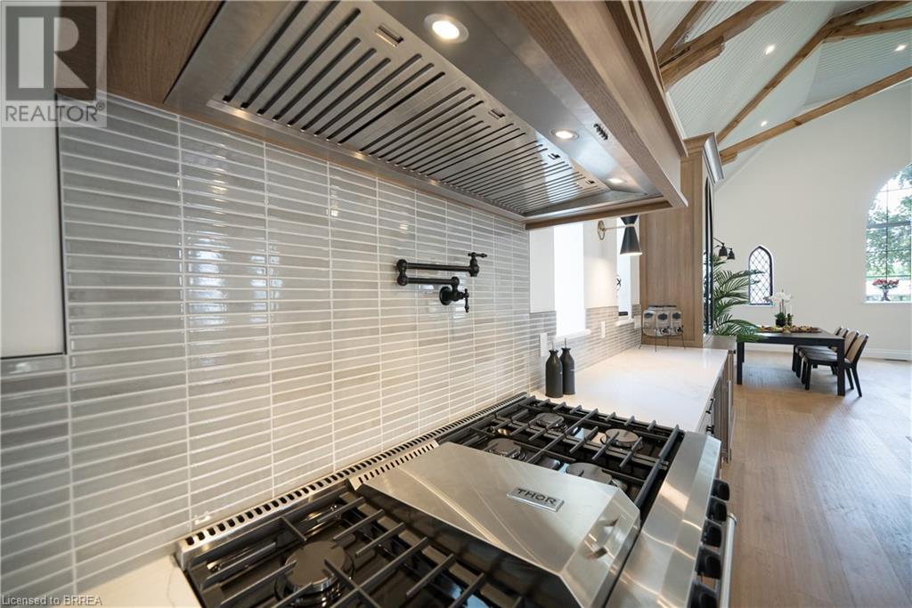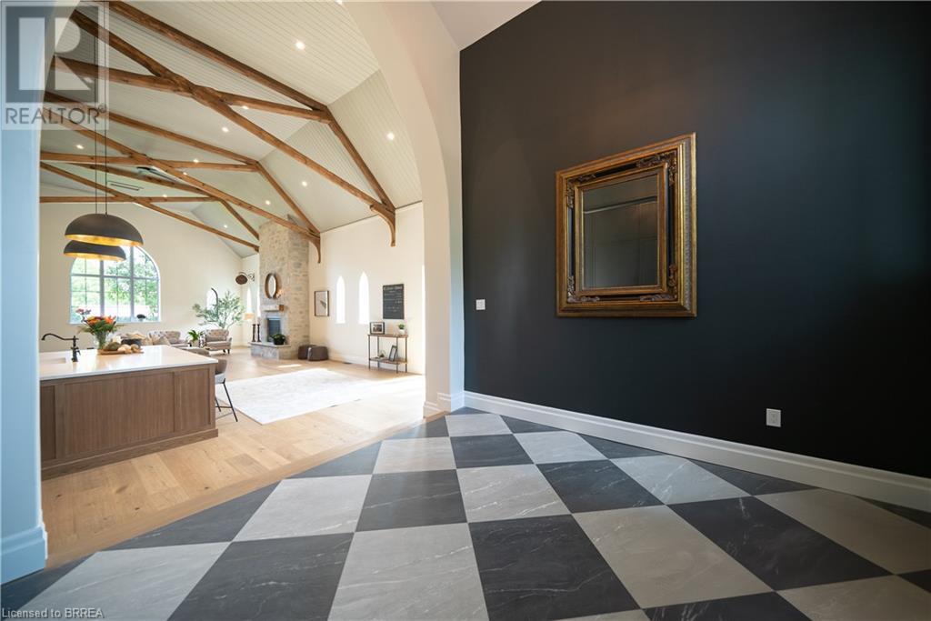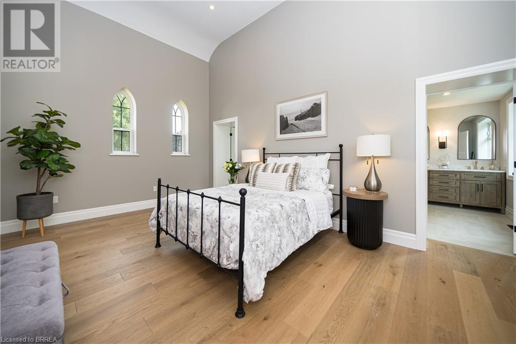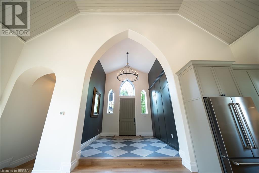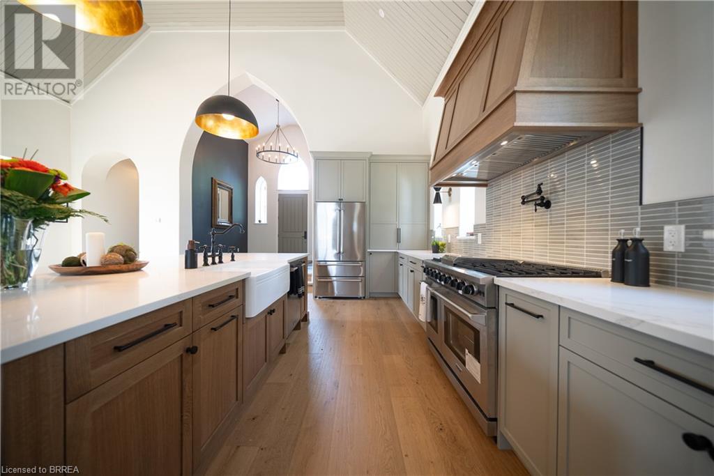 Own a piece of history in the quaint town of Parkhill, 15 min to the sandy beaches of Lake Huron. This landmark is a one of a kind church conversion to a luxury quality crafted home. Enter to a spacious foyer, graced with a striking light fixture and highlighted by custom millwork feature wall and secret door to cloak room. Jaw dropping great room featuring 18' ceilings of original tongue and groove construction with hand hewn beams and floor to ceiling stone gas fireplace. The gourmet kitchen features 10' x 5' island with quartz counter top, white oak cabinetry with co-ordinating custom china cabinet, range hood and fluted dining table. Several custom conveniences can be found including an appliance pantry with tuck away doors, oil and spice pull outs, cutlery organizer and many more surprises for you to find. Leading off the great room is the original 1914 Bell Tower room with Menelly Bell Troy, New York working bell and juliet balcony. Three generous bedrooms, a main floor laundry, and two full baths (one ensuite) that are beautifully appointed with spa like features complete this setting you will be proud to welcome friends and family to. Outside you will find multiple sitting areas including an expansive deck and patio with family fire pit you can enjoy year round in this charming community. A rare home you'll fall in love with. (id:55009)