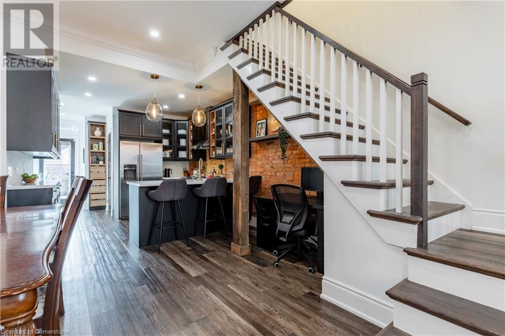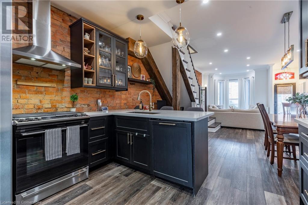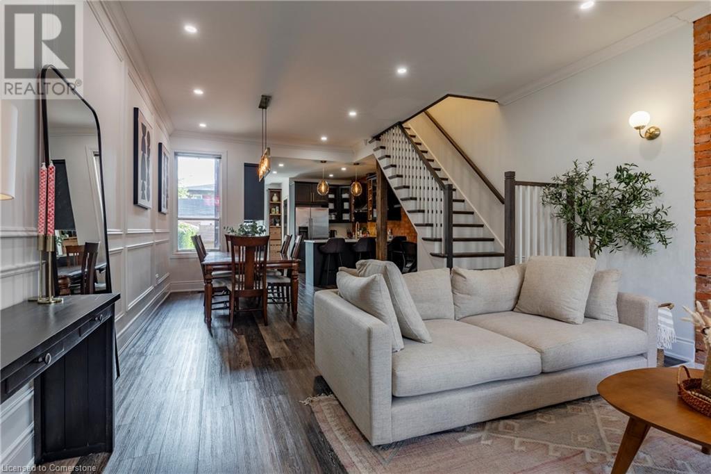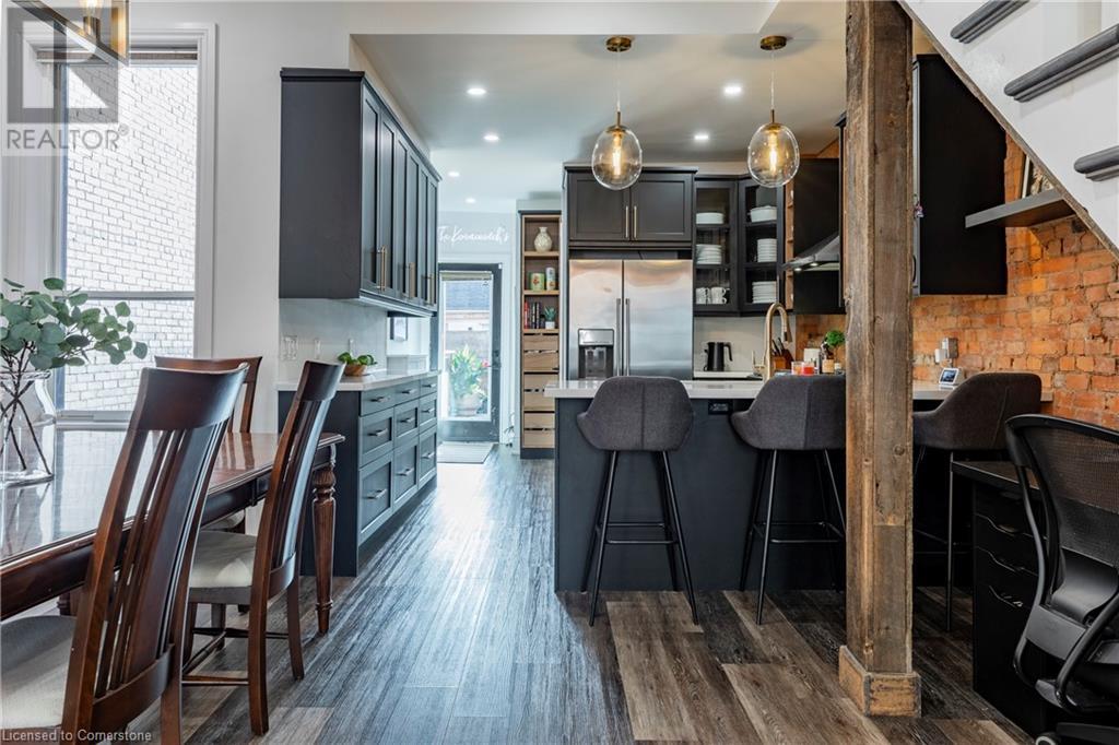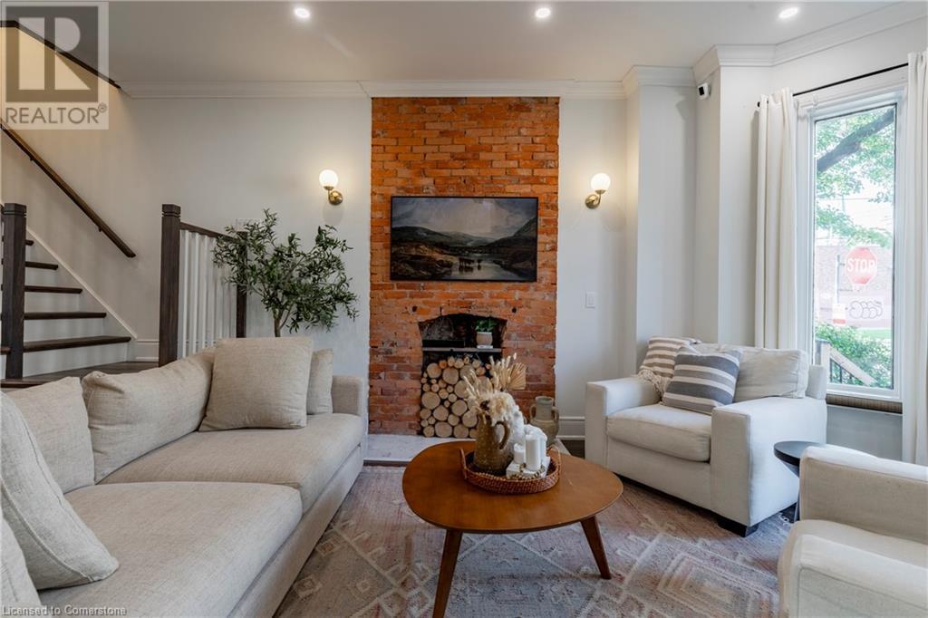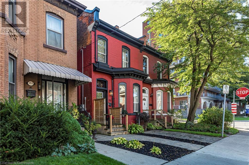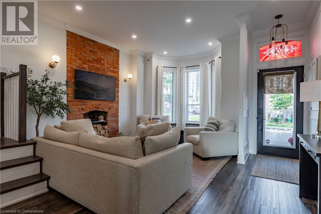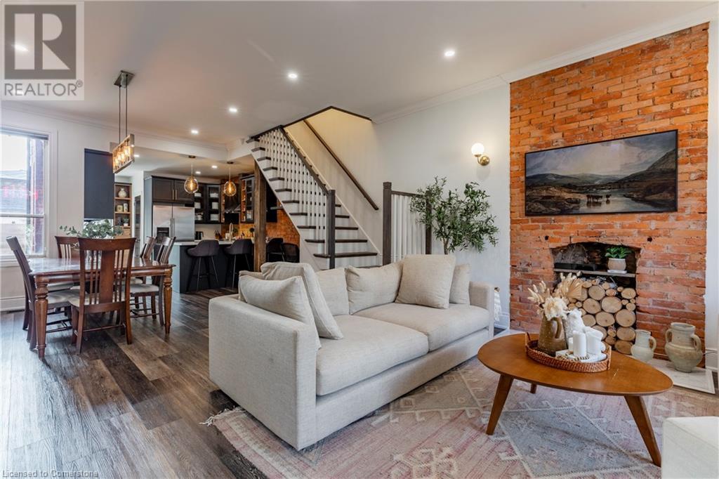 Step into the heart of Corktown w/ this beautifully maintained circa 1892 red-brick semi-det home, offering 1,418 sq ft of historic charm & modern elegance. This 3-bdrm, 2-bath residence combines style & convenience in one of Hamilton's most cherished neighbourhoods. The timeless red-brick ext, low-maint front garden, & interlock driveway for 1 small vehicle lead to an updated glass front door w/ a transom window. Inside, the open-concept main lvl feat 9.5-ft ceil, a spacious foyer, a form liv rm w/ a bay window & exp brick centrepiece, & an adjacent din rm. The stunning kitch incl dark cab, quartz countertops, S/S app, & a peninsula w/ seating for 3. Added cabinetry, crown moulding, pot lighting, & exposed brick accents complete this stylish space. A 3-pc bath w/ a glass shower & laund facilities offer convenience. Upstairs, the primary suite boasts an oversized closet & mirrored wardrobe. 2 add bdrms, one w/ access to an upper balcony, provide versatility. A 4-pc bath w/ a shower/tub combo & a recently installed linen closet add practical comforts. The low-maint rear yard feat an upper deck, lower interlock terrace, & privacy panel, perfect for entertaining or relaxing. Updates incl roof shing (21), insulation, electrical, furnace, & plumbing. Located within walking distance to Augusta Street's vibrant restaurants, GO transit, parks, and downtown Hamilton, this home blends historic character with modern upgrades, offering a perfect Corktown lifestyle. (id:55009)