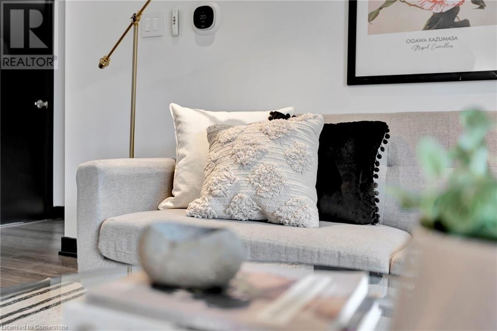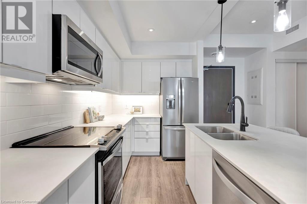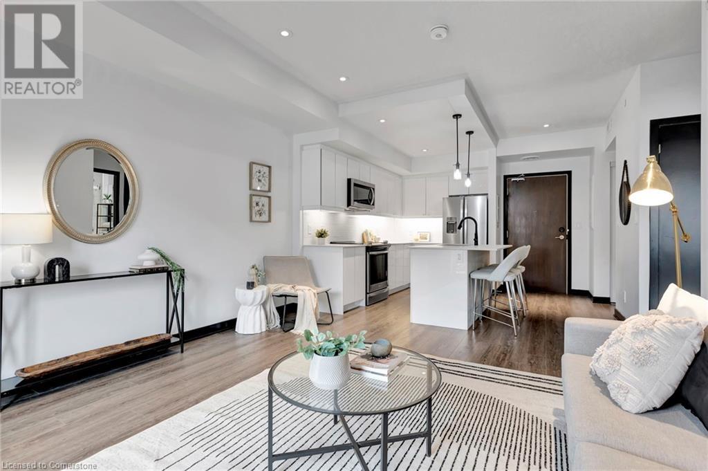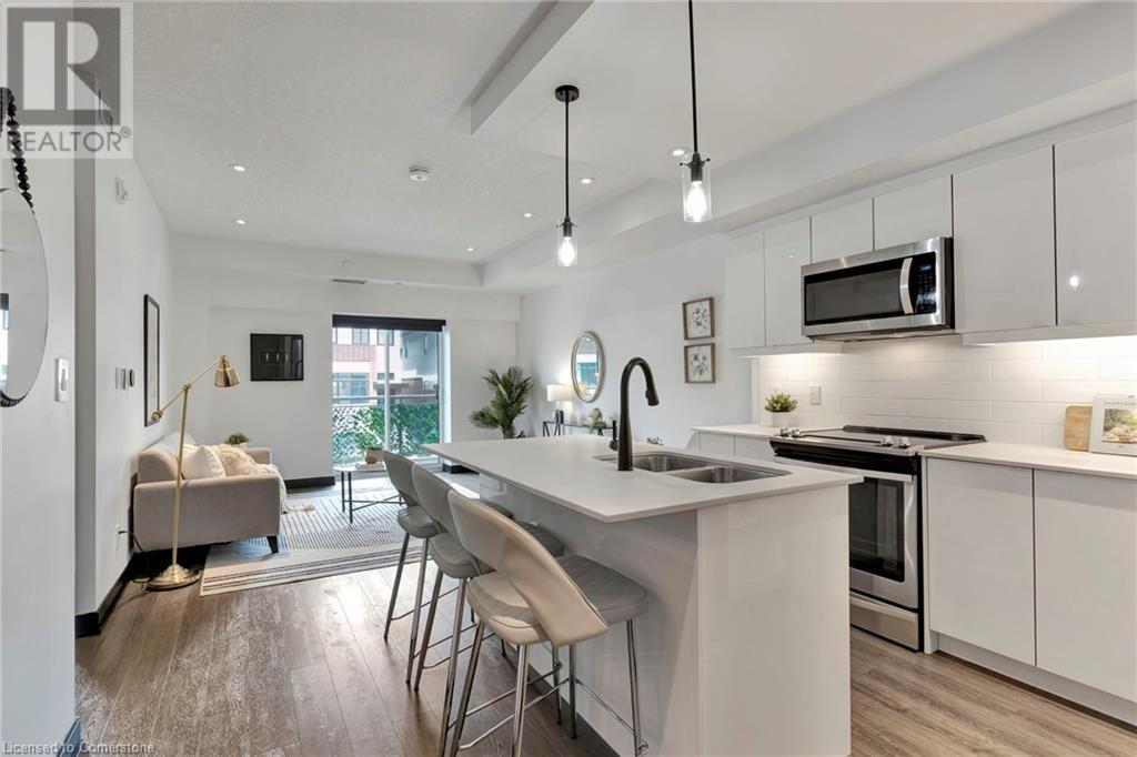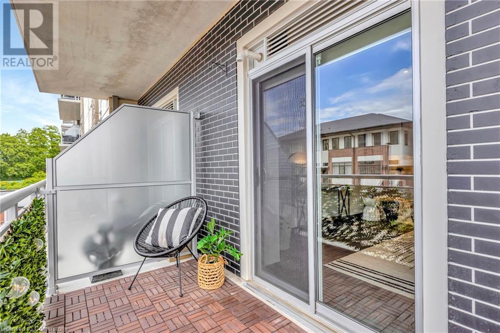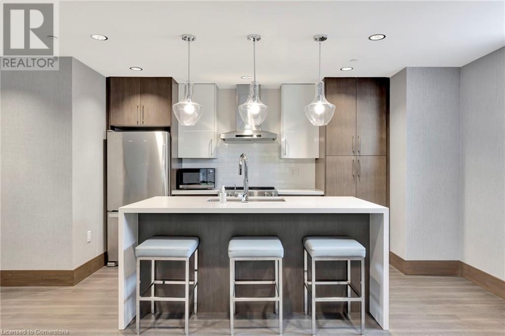 $460 MonthlyWelcome to the prestigious Monetary Heights Community built by Dicenzo homes in Ancaster. This Venice Model features 1 Bedroom+ Den, 1 Bathroom and 738 sq.ft of living space with 72 sq.ft of outdoor space. This unit features multiple upgrades including kitchen cabinets with quartz countertops, upgraded stainless steel appliances and a large island with a voice controlled (Alexa) kitchen sink faucet. The den is currently used as a flex space with custom built-ins for extra storage as well as being used as an office if you're working from home. Off the kitchen you have your open concept living room with automatic blinds and access to your balcony. This beautiful unit also features an upgraded 4-piece bathroom with subway tile surround and glass sliding doors. Off the bathroom you have your bedroom with custom automatic blackout blinds. The entire condo has been painted including black doors and black accent baseboards. This unit includes a RARE opportunity for 2 parking spaces (#21 underground and #21 outside) as well as a locker space for additional storage. Walking distance to all of the amenities Ancaster has to offer as well as schools and public transit! Don’t miss this opportunity!! (id:55009)