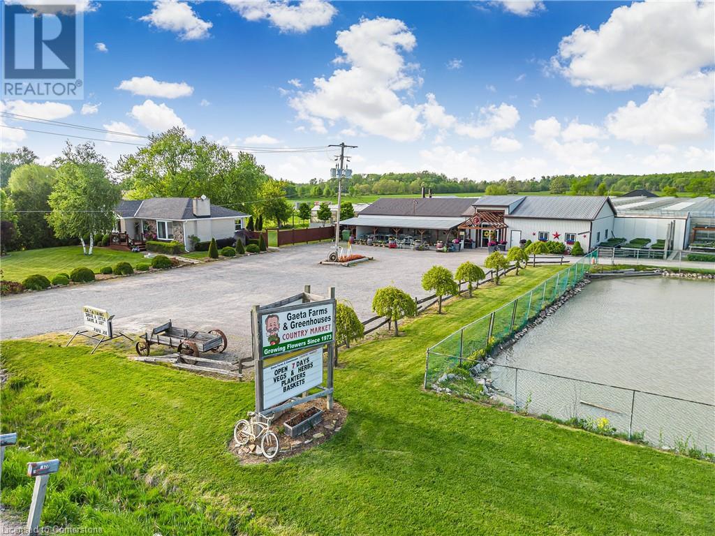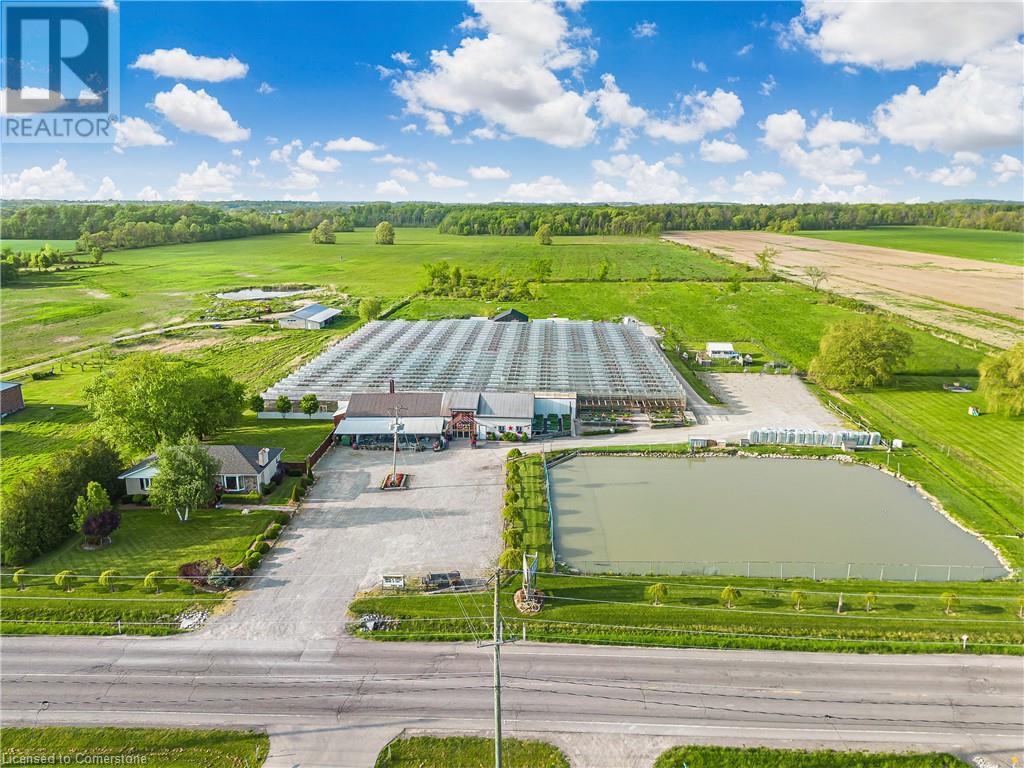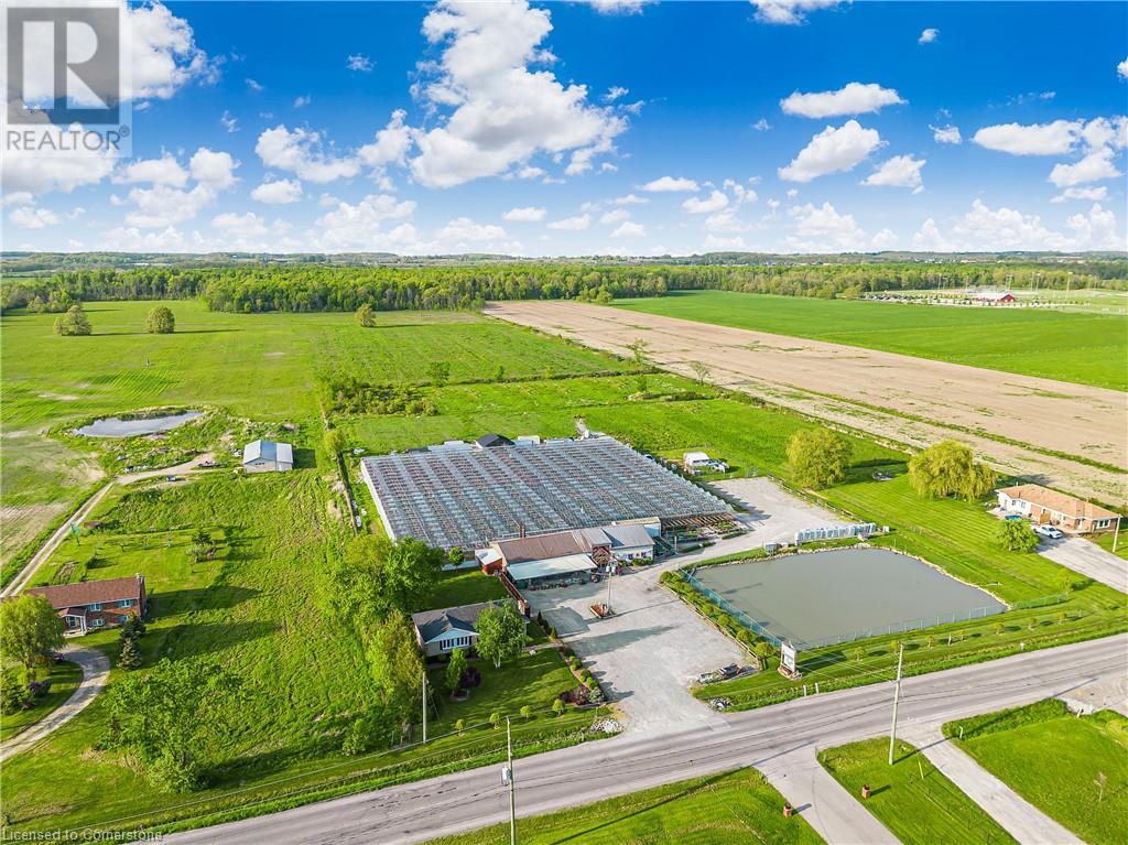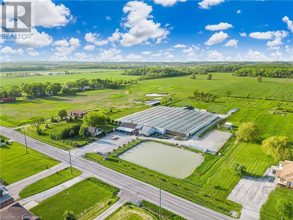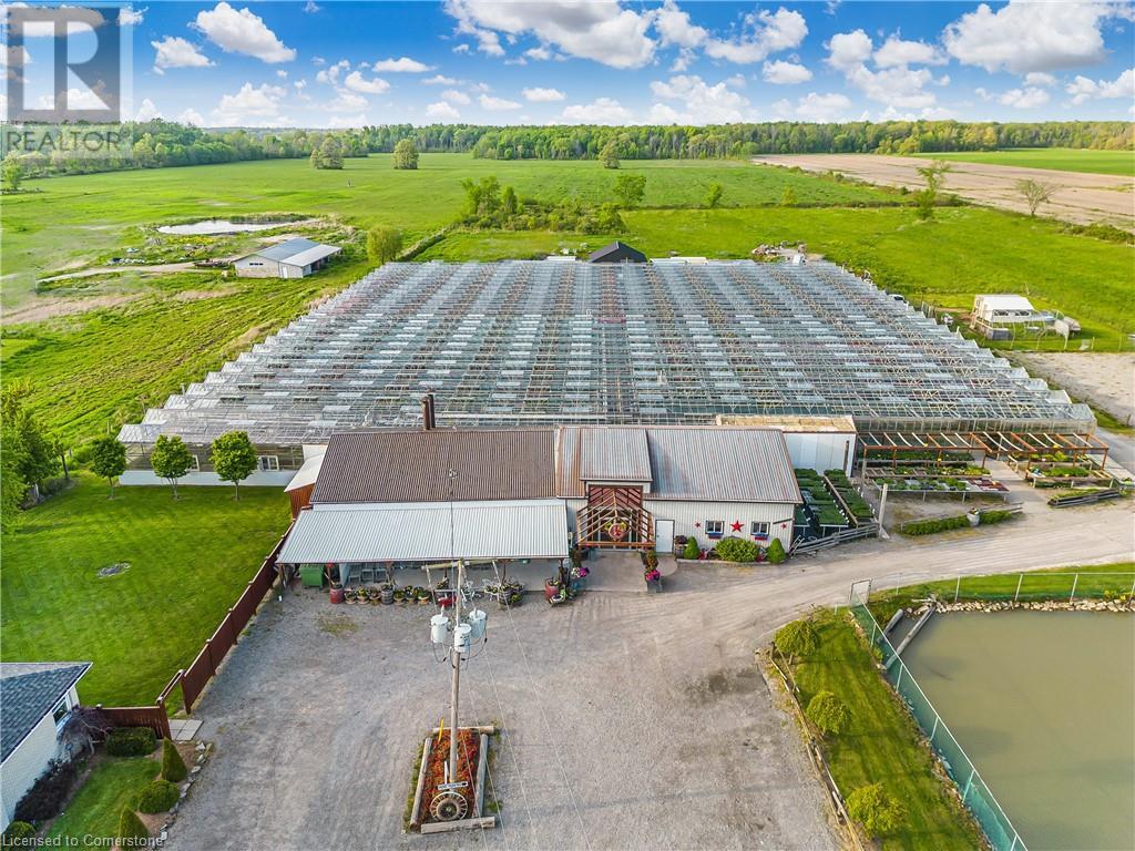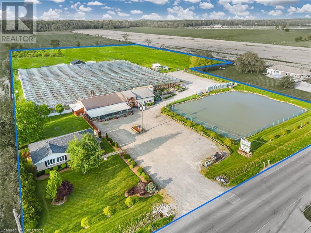 Welcome to this expansive 9 acre property offering a unique blend of residential comfort, a commercial greenhouse and acres of fertile land strategically located near main roads and transport routes for convenient access and only 10 mins from the QEW. Boasting 351 ft of frontage and 874 ft of depth providing ample space for various endeavours. The main residence, a charming 1,315 sq ft home with an unfinished basement, features hardwood and tile flooring throughout its 3 bedrooms and 1 bathroom. Modern amenities include an updated breaker panel, a 1800-gallon cistern, and fiber high-speed internet connectivity. Adjacent to the residence lies a remarkable glass Venlo greenhouse allowing year round growing opportunities and spanning 54,000 sq ft, equipped with natural gas furnaces, 600V 3-phase electrical service and a 3200 sq ft insulated Barn/Storefront with office space, lunch room, two cashier stations, a Walk-in insulated cooler, ideal for agricultural pursuits. The property also includes two gravel car parking lots, a back gravel loading area, an outdoor covered area and bench area for added convenience and a 140’x110’ deep pond feeding the greenhouse. Additional features comprise 2 sea cans, a 2 Bay Loading Area with ample storage and a fenced-in chicken coop area spanning 6,000 sq ft. With its versatile infrastructure and expansive grounds, this property presents a rare opportunity for those seeking a harmonious blend of rural living and commercial enterprise. (id:55009)