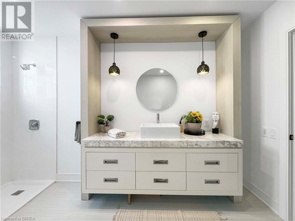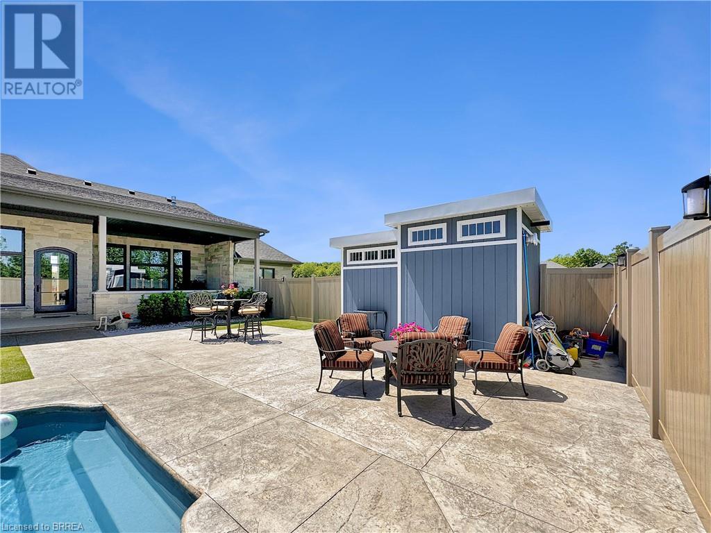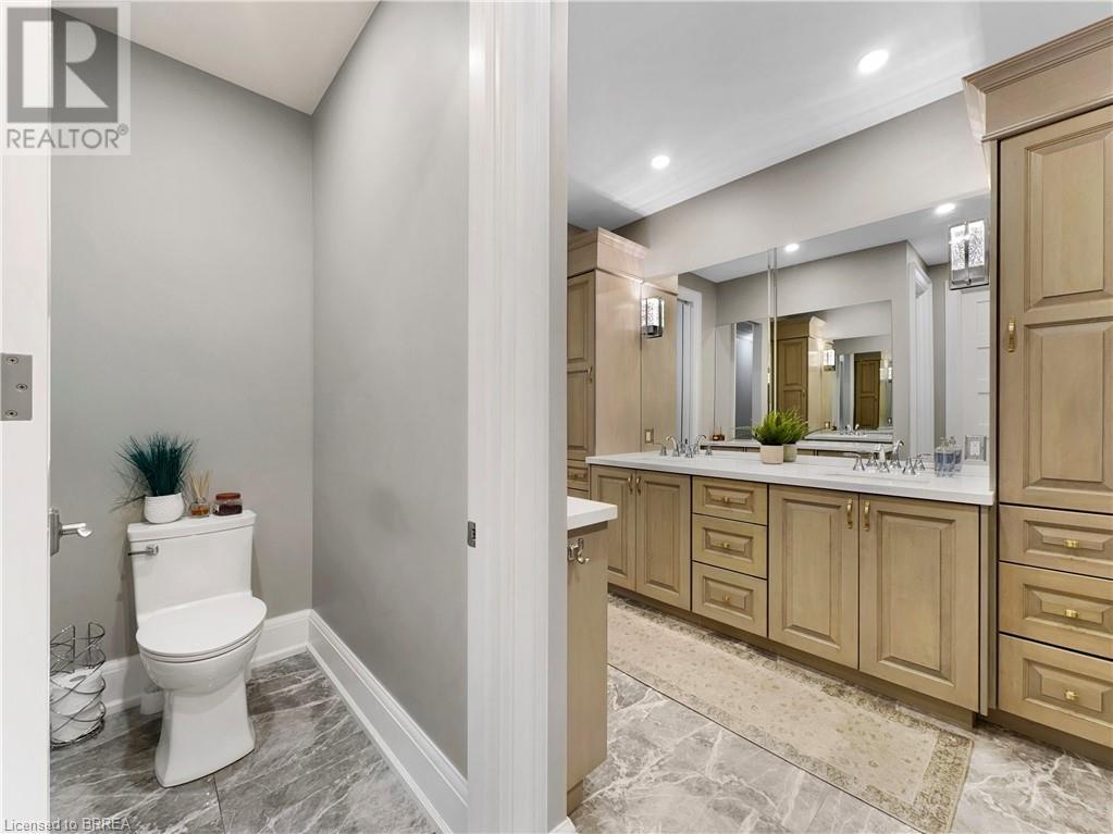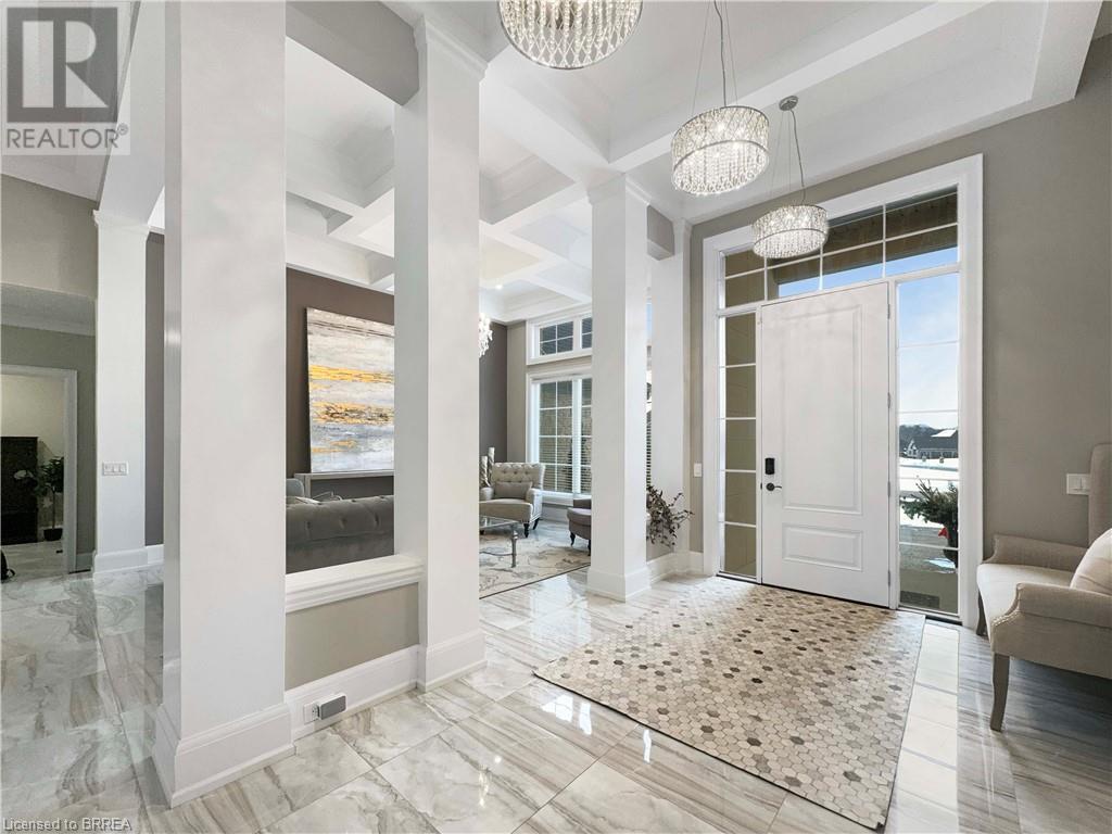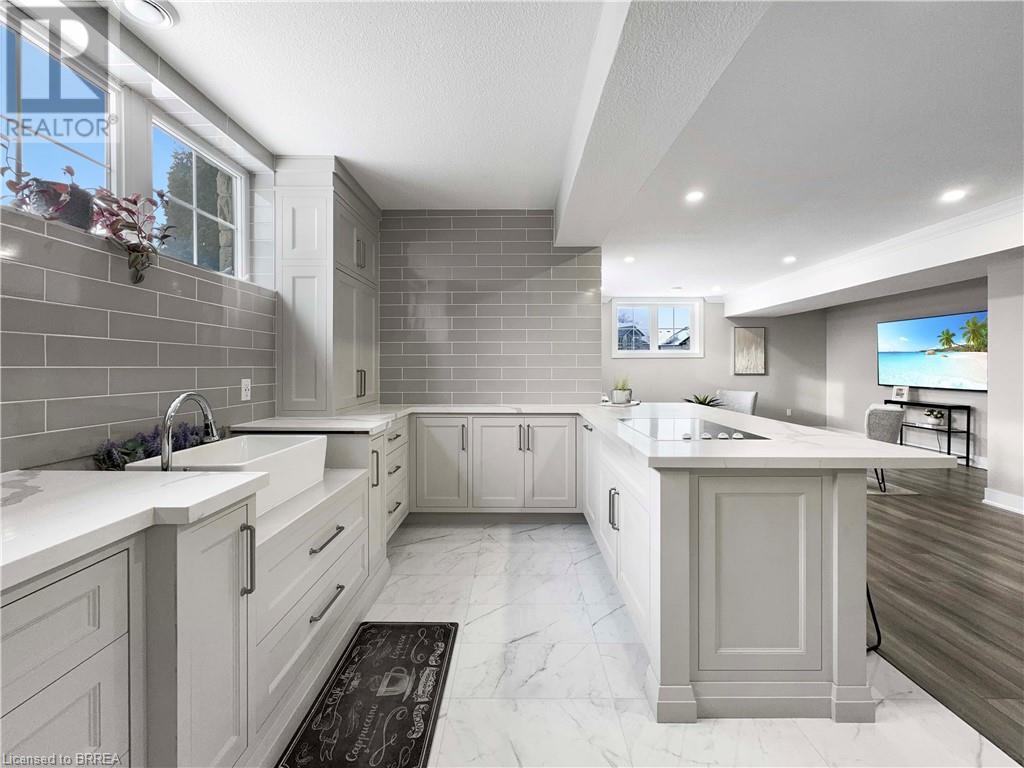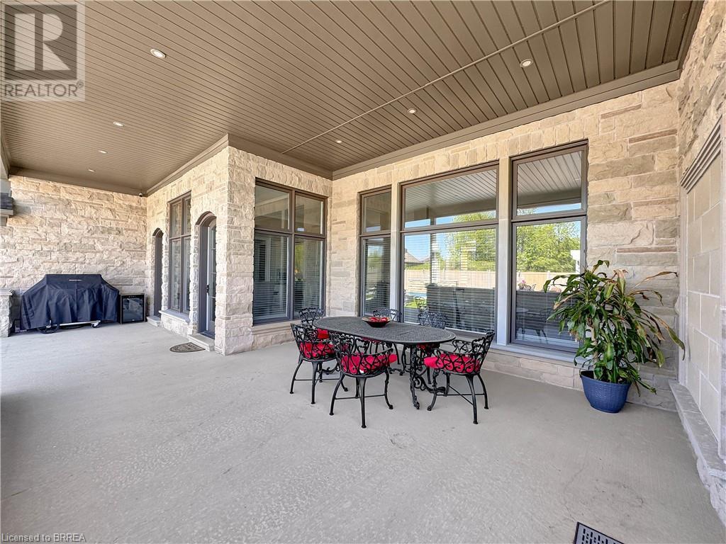 Welcome to 18 Harper Blvd, a luxurious 5-bed, 4-bath stone bungalow nestled on an expansive three-quarter-acre estate in Brantford, Ontario. Step inside to discover a grand entry leading to a bright living area adorned with coffered ceilings and elegant marble tile. The open kitchen, with soaring 15-ft ceilings, is equipped with state-of-the-art appliances, including a Wolf gas stove, Sub-Zero fridge, and custom cabinetry with hidden fridge and dishwasher. Enjoy the convenience of a wet bar and a walk-in pantry. The main level houses four spacious bedrooms, with the master suite offering a large spa-like ensuite and a walk-in closet. The basement adds versatility with a second kitchen, living room, additional bedroom, and bathroom, heated floors, accompanied by ample storage space. This stunning property boasts a backyard oasis backing onto serene green space, featuring an inviting inground pool with a fountain, a lush turf area, a gas fireplace, a concrete pad, a covered porch, and a convenient pool house with a bathroom. An irrigation system ensures the lush landscape stays vibrant. With a 4-car garage completing this exceptional property, 18 Harper Blvd presents a rare opportunity to indulge in luxury living and unparalleled comfort. (id:55009)