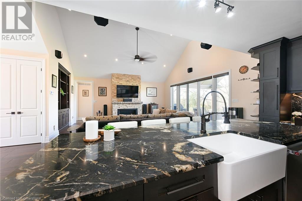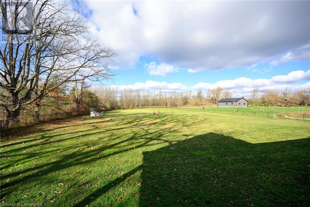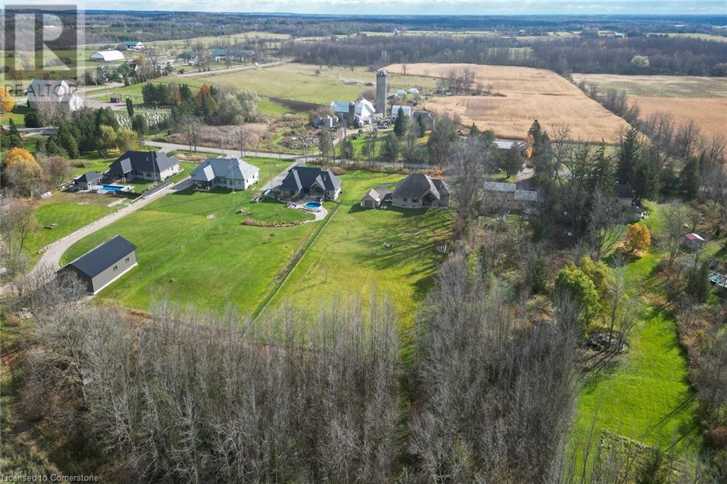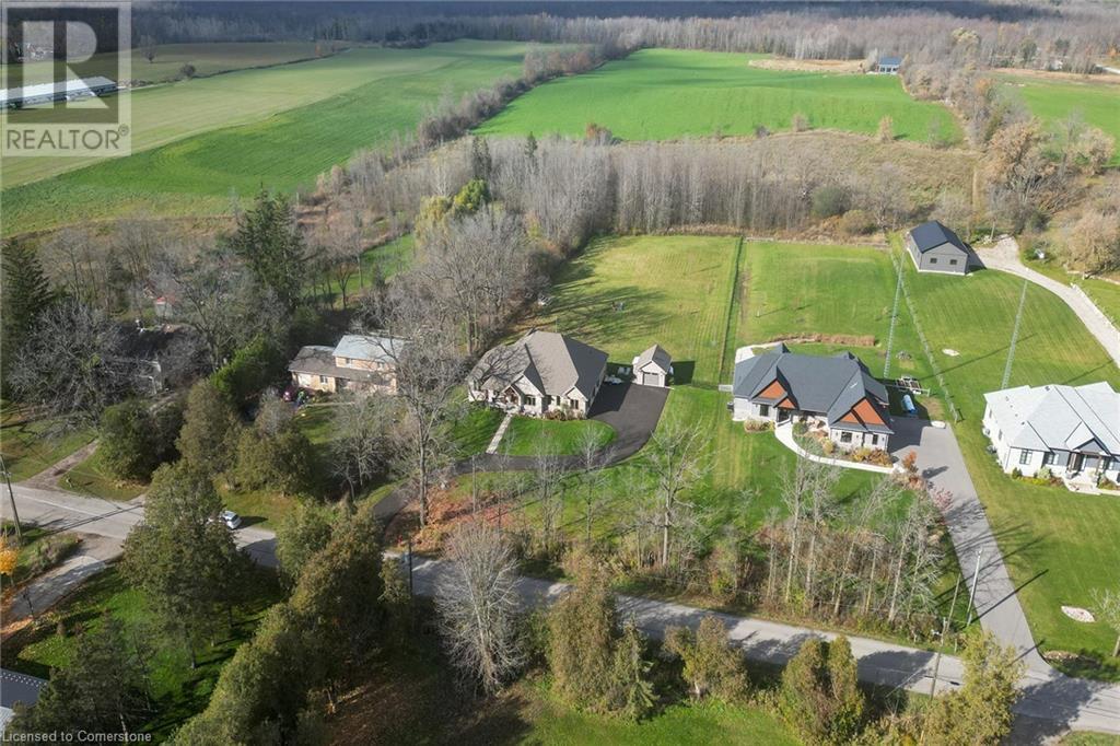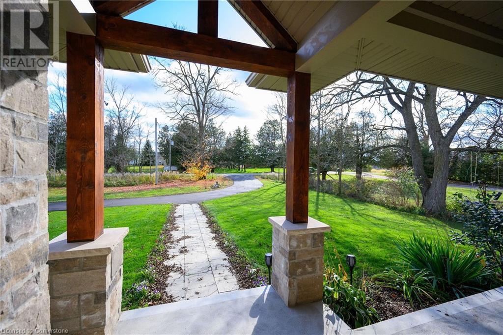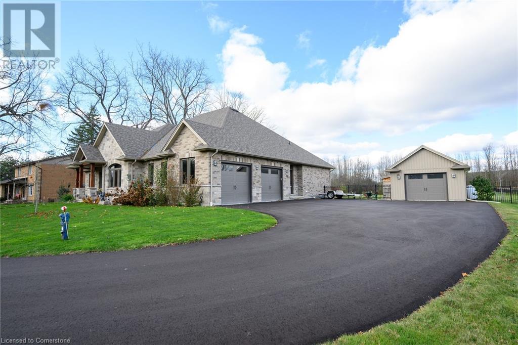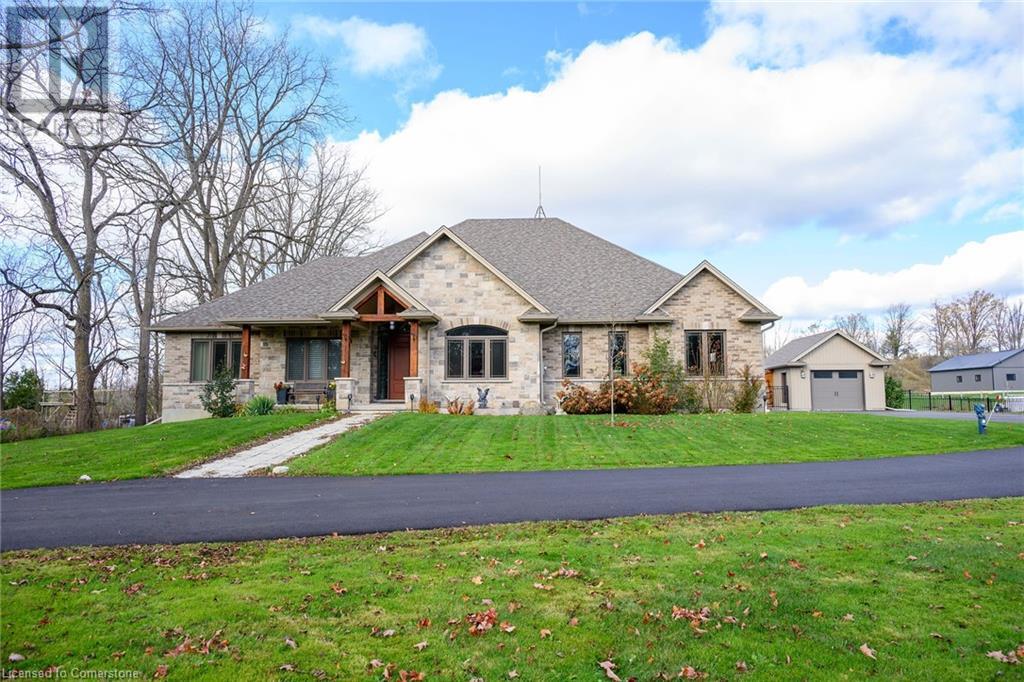Experience the epitome of luxury living. Discover your private sanctuary in this exquisite custom-built bungalow on a picturesque 1.8 acre lot. Perfectly situated between Cambridge, Guelph, & Hamilton, with easy access to amenities & highways. This stunning home offers the best of both worlds; tranquility & convenience. Energy Star Certified & over 5000 sq ft of liveable space! Breathtaking open-concept great room features 15 ft vaulted ceiling with stone fireplace. Unleash your inner chef in the exquisite kitchen with Kitchen Aid appliances, granite, centre island with seating, custom cabinets & walk in pantry. Main floor boasts 9 ft ceilings, dedicated office, dining room, 3 spacious beds & 2.5 baths. Primary retreat showcases incredible views of the property, a spa-inspired ensuite with double sinks, soaker tub, glass shower & generous walk-in closet. Laundry with pet spa, mud room & access to the oversized double garage. Lower level is an expansive space with 9 ft+ ceilings, massive rec room, 2 large bedrooms, full bath with glass shower, ample storage & impressive utility room. Unfinished space could be converted to a self-contained in-law suite. Peace of mind comes with the most energy-efficient geothermal heating & cooling, ICF foundation for superior insulation, 200 amp service & UV/reverse osmosis water system with pressurizing tank. Additional detached garage with electricity & pass through. Fully fenced yard! Stone fire pit. Extensive list of upgrades is available. (id:55009)
