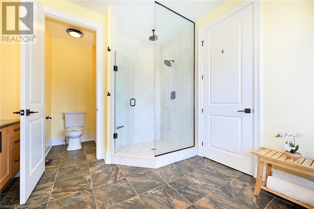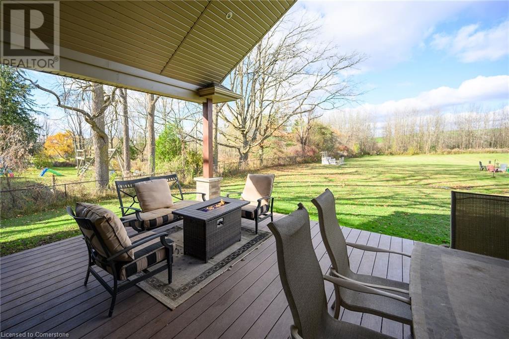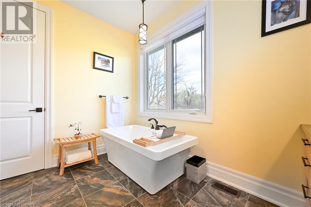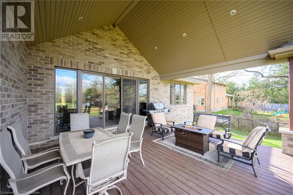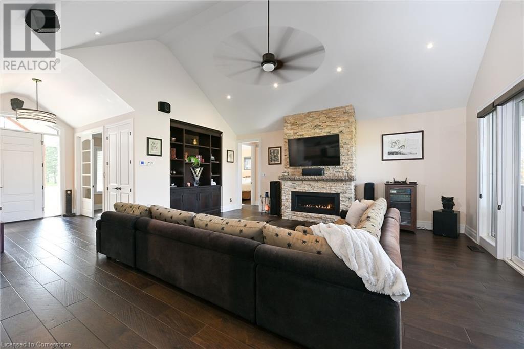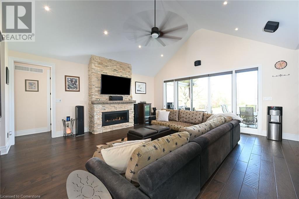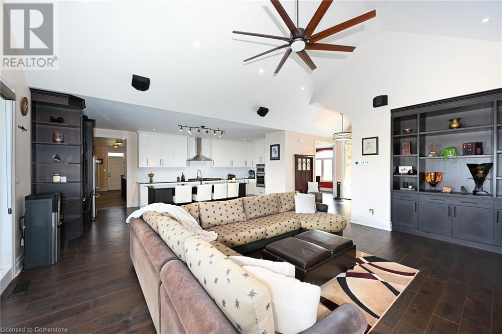 Experience the epitome of luxury living. Discover your private sanctuary in this exquisite custom-built bungalow on a picturesque 1.8 acre lot. Perfectly situated between Cambridge, Guelph, & Hamilton, with easy access to amenities & highways. This stunning home offers the best of both worlds; tranquility & convenience. Energy Star Certified & over 5000 sq ft of liveable space! Breathtaking open-concept great room features 15 ft vaulted ceiling with stone fireplace. Unleash your inner chef in the exquisite kitchen with Kitchen Aid appliances, granite, centre island with seating, custom cabinets & walk in pantry. Main floor boasts 9 ft ceilings, dedicated office, dining room, 3 spacious beds & 2.5 baths. Primary retreat showcases incredible views of the property, a spa-inspired ensuite with double sinks, soaker tub, glass shower & generous walk-in closet. Laundry with pet spa, mud room & access to the oversized double garage. Lower level is an expansive space with 9 ft+ ceilings, massive rec room, 2 large bedrooms, full bath with glass shower, ample storage & impressive utility room. Unfinished space could be converted to a self-contained in-law suite. Peace of mind comes with the most energy-efficient geothermal heating & cooling, ICF foundation for superior insulation, 200 amp service & UV/reverse osmosis water system with pressurizing tank. Additional detached garage with electricity & pass through. Fully fenced yard! Stone fire pit. Extensive list of upgrades is available. (id:55009)