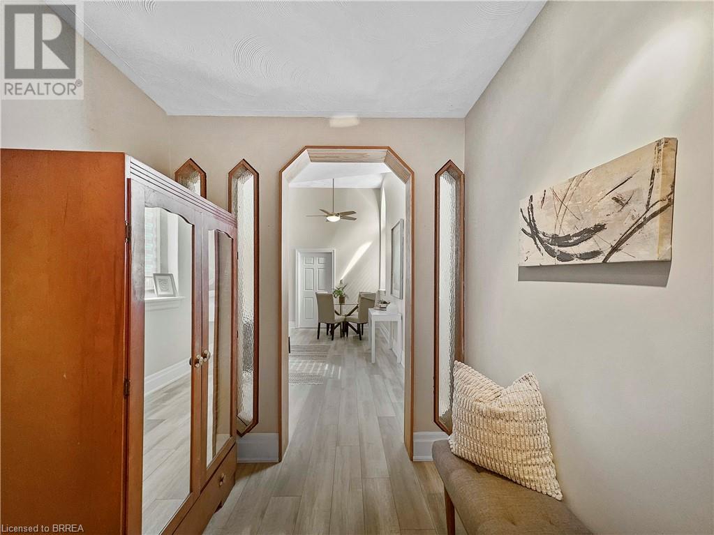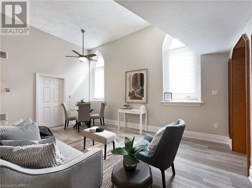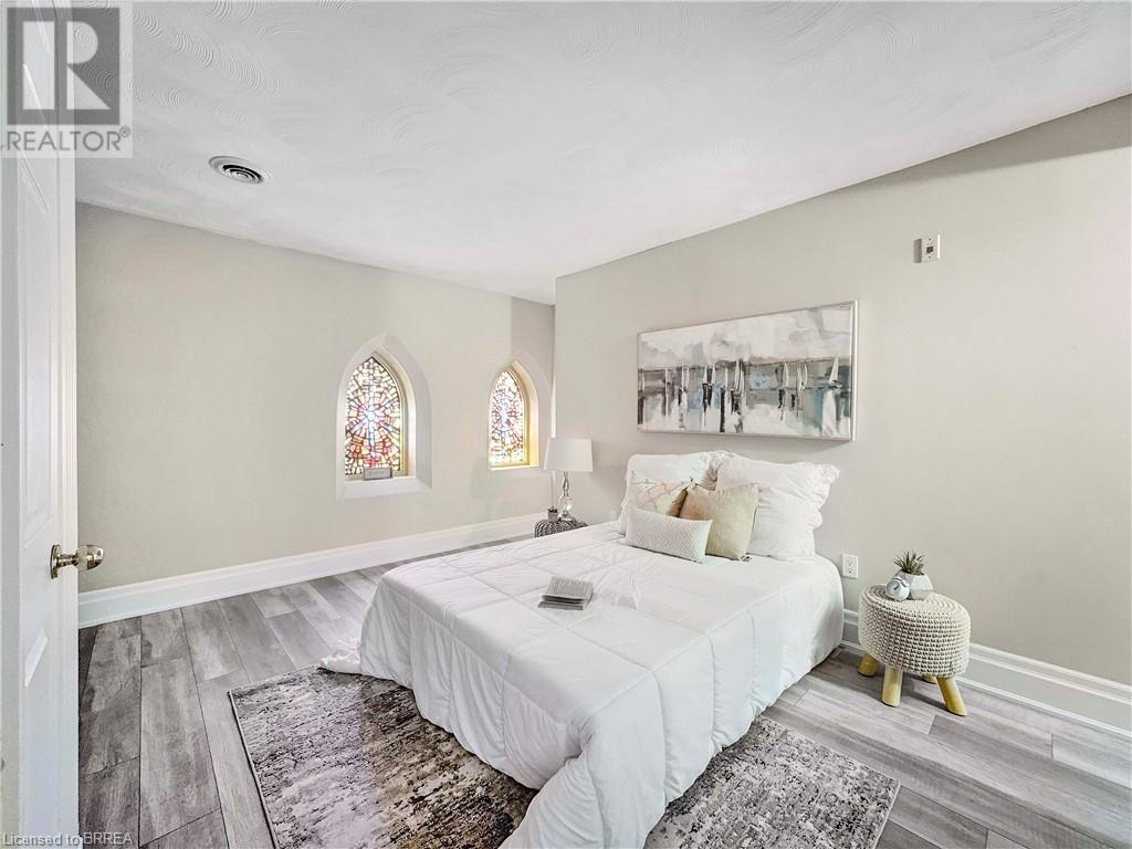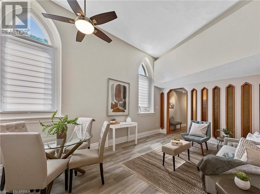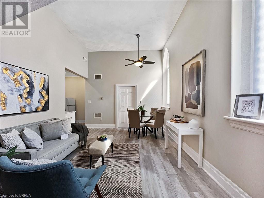 This converted church-to-condo unit stands as the tip top tier of Brantford's housing market! With original stained glass windows to illuminate your bedroom every morning and a spacious living/dining room featuring 2 original cathedral windows which allow light to flood into the space from 12 ft above. Aesthetically planned flooring, baseboards and tiling, Wooden highlights around the 11 glass interior windows and around the foyer entrance PLUS a solid wooden reclaimed church door gives the unit an air of prestige. 21 Richmond st can be your centerpoint for Brantford city life, a short walk from the active downtown, steps down the road are popular dining options like Honeys Bistro, The healthy Rabbit and Brantford's own Altitude coffee Roasters! For leisure enjoy any of the many parks within walking distance, the Grand river and the trans Canada trail. (id:55009)