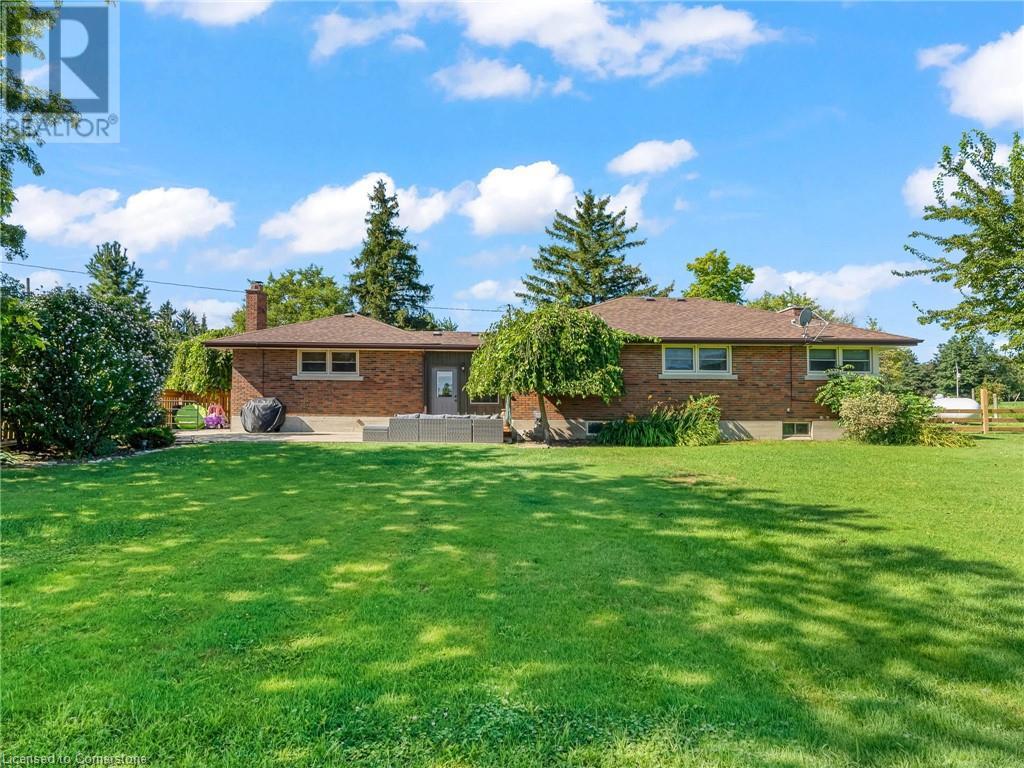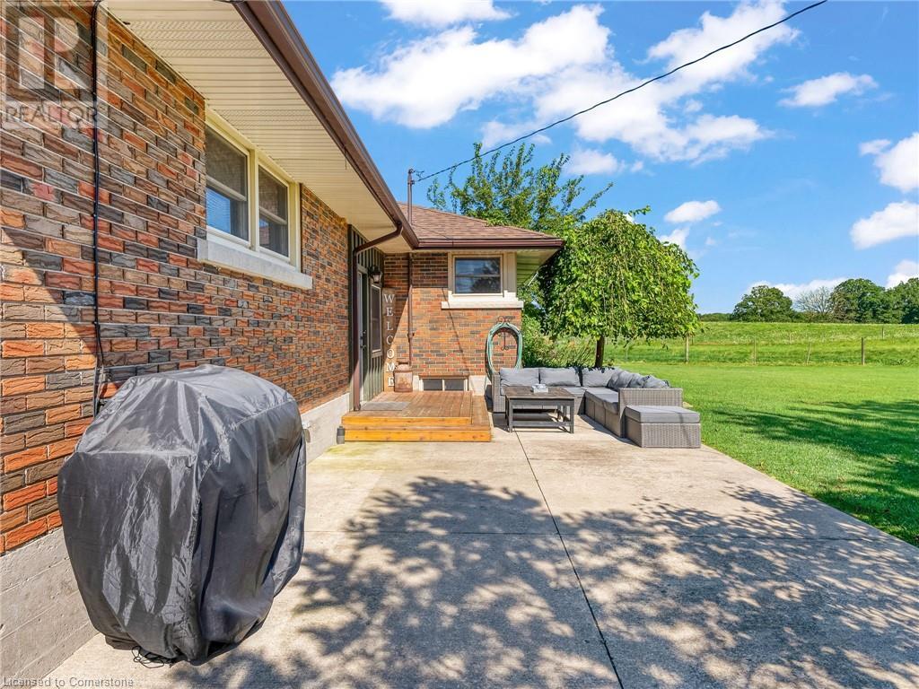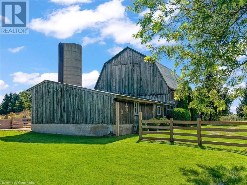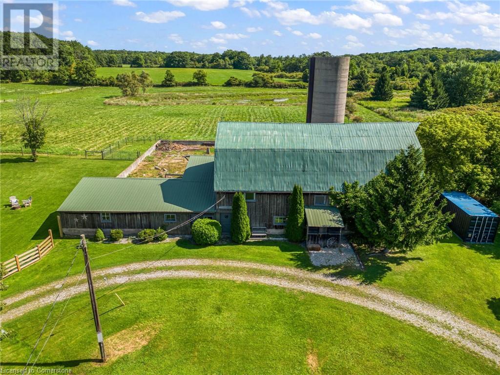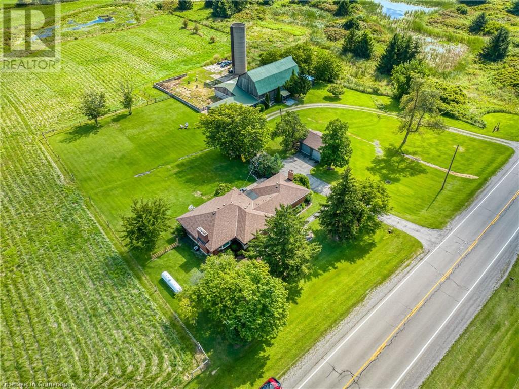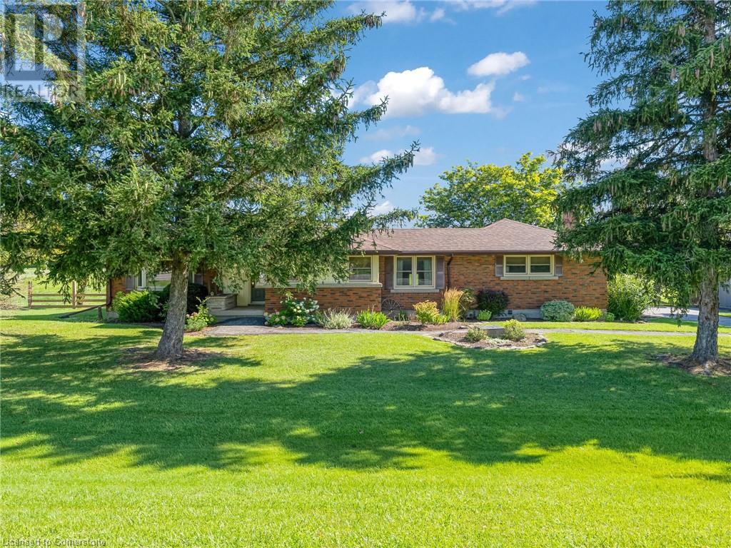 This extensively updated 3+1 bedroom bungalow is situated on a 5.78-acre property, perfect for a horse/hobby farm and nestled in a picturesque setting, surrounded by serene fields and forest landscapes. The property is rich in features, including a 24'x21' double garage, a sturdy 55'x29' hip roof barn with hay loft, and an attached 40'x19' single-story north section. Additional structures include an 18'x55' lean-to, a 10'x12' shed, a silo, a pond, and more. The charming brick bungalow has a spacious family room with a wood-burning fireplace, a living room with rustic wood ceiling, new flooring and propane fireplace, a bright kitchen with granite countertops, main floor laundry and an updated full bathroom. Basement offers the family even more living space with multiple storage spaces, partially finished rec room, and additional bedroom. This is a value packed package for someone looking for space/hobby farm. (id:55009)