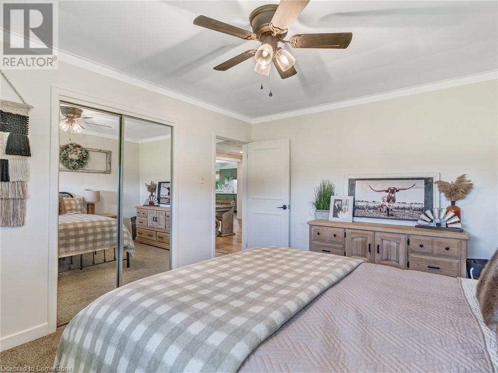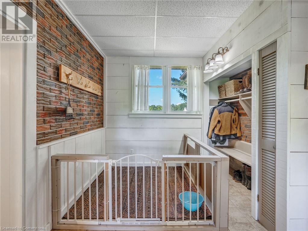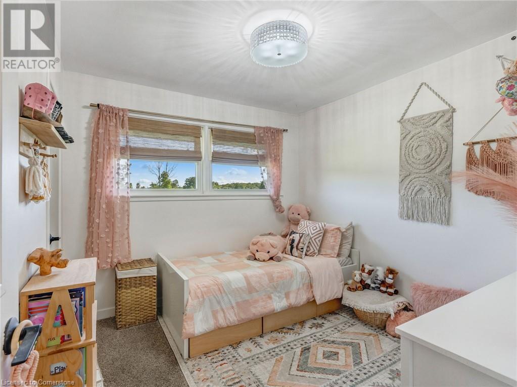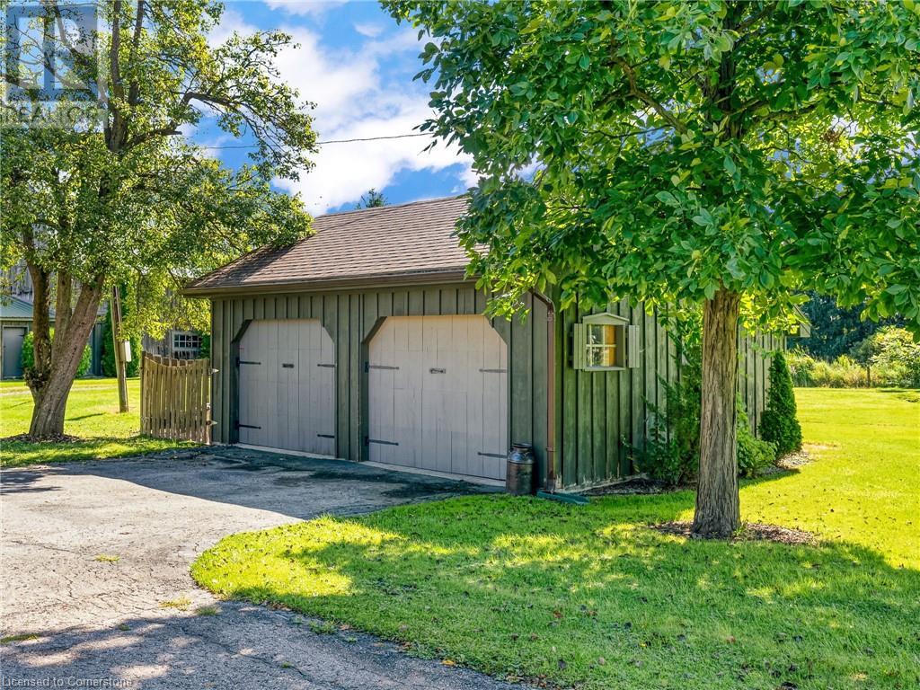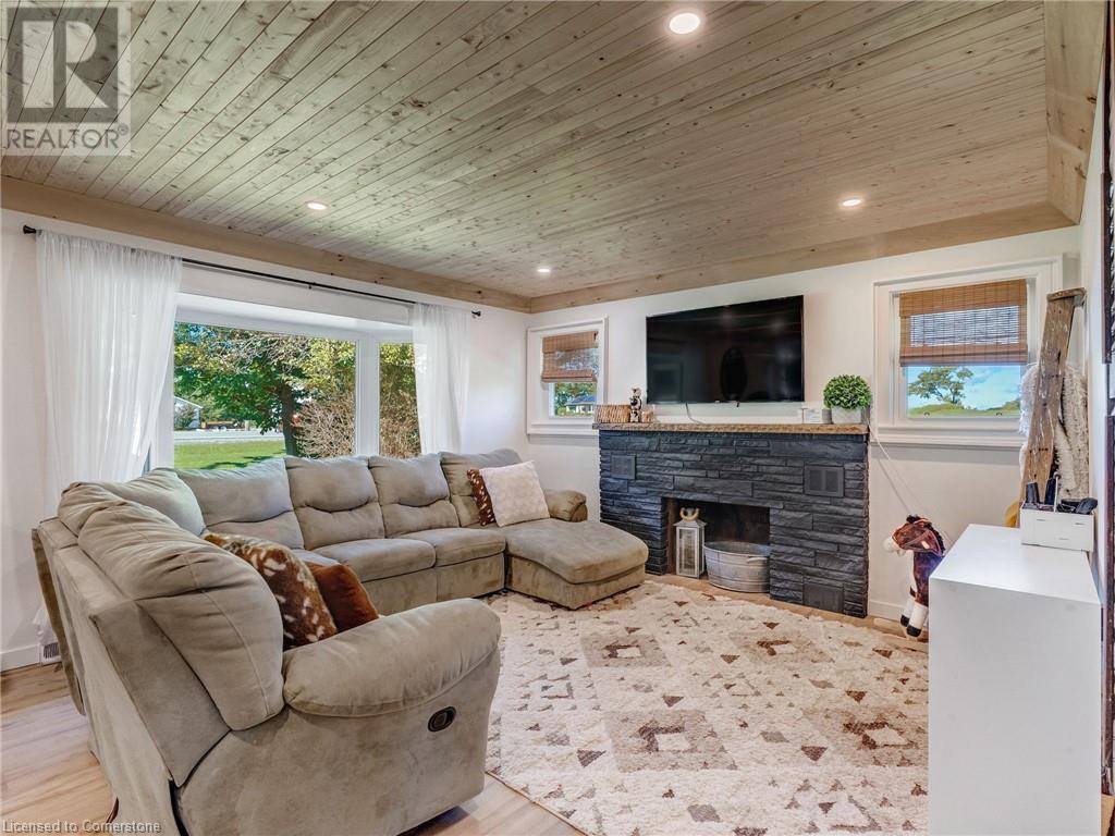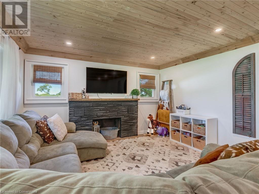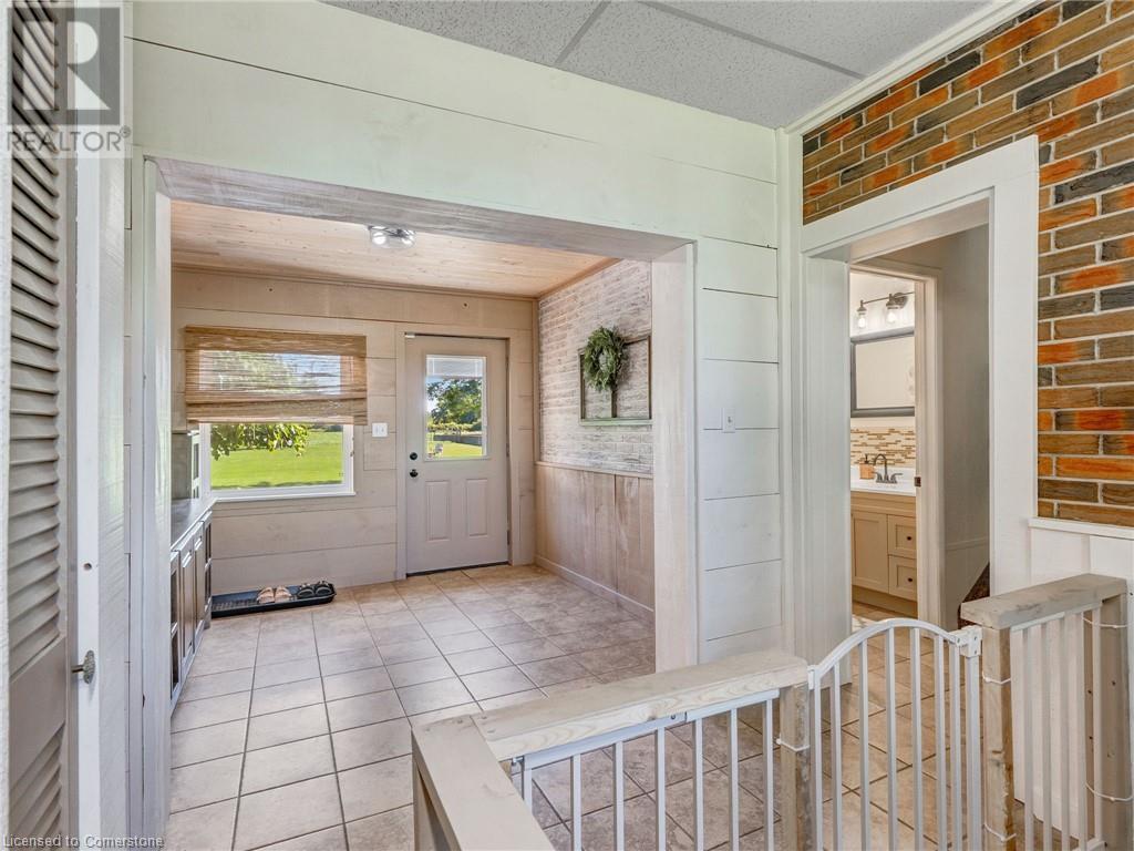 This extensively updated 3+1 bedroom bungalow is situated on a 5.78-acre property, perfect for a horse/hobby farm and nestled in a picturesque setting, surrounded by serene fields and forest landscapes. The property is rich in features, including a 24'x21' double garage, a sturdy 55'x29' hip roof barn with hay loft, and an attached 40'x19' single-story north section. Additional structures include an 18'x55' lean-to, a 10'x12' shed, a silo, a pond, and more. The charming brick bungalow has a spacious family room with a wood-burning fireplace, a living room with rustic wood ceiling, new flooring and propane fireplace, a bright kitchen with granite countertops, main floor laundry and an updated full bathroom. Basement offers the family even more living space with multiple storage spaces, partially finished rec room, and additional bedroom. This is a value packed package for someone looking for space/hobby farm. (id:55009)