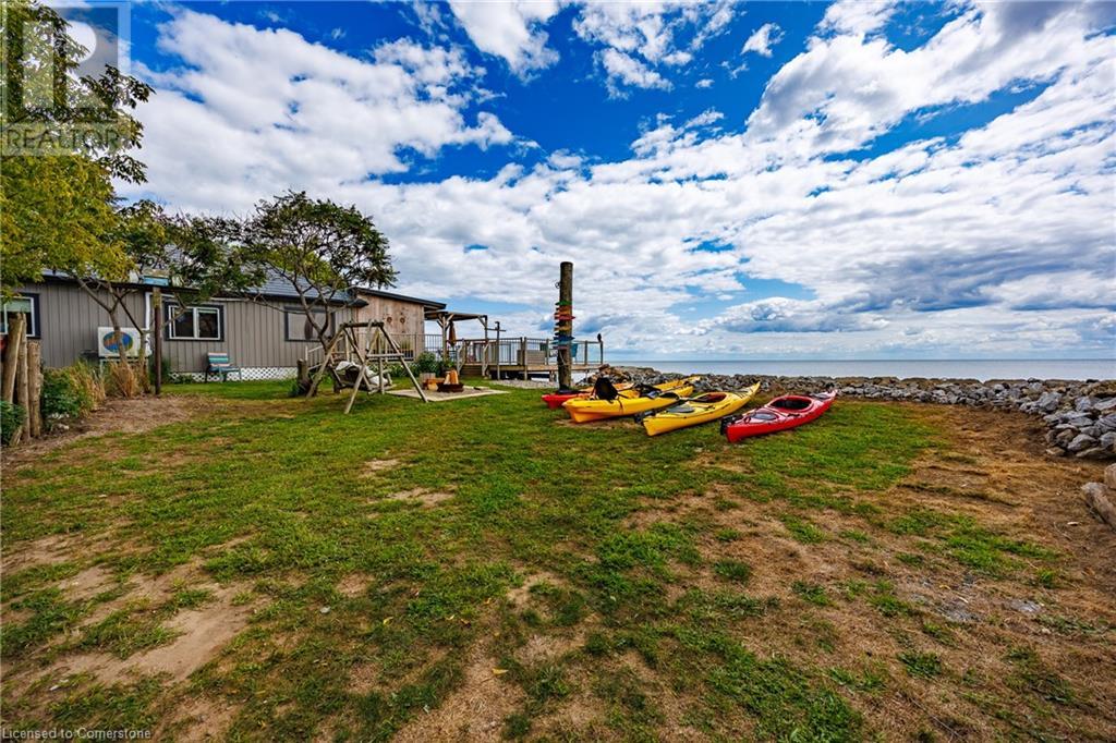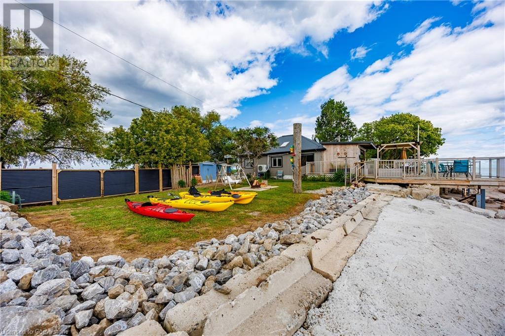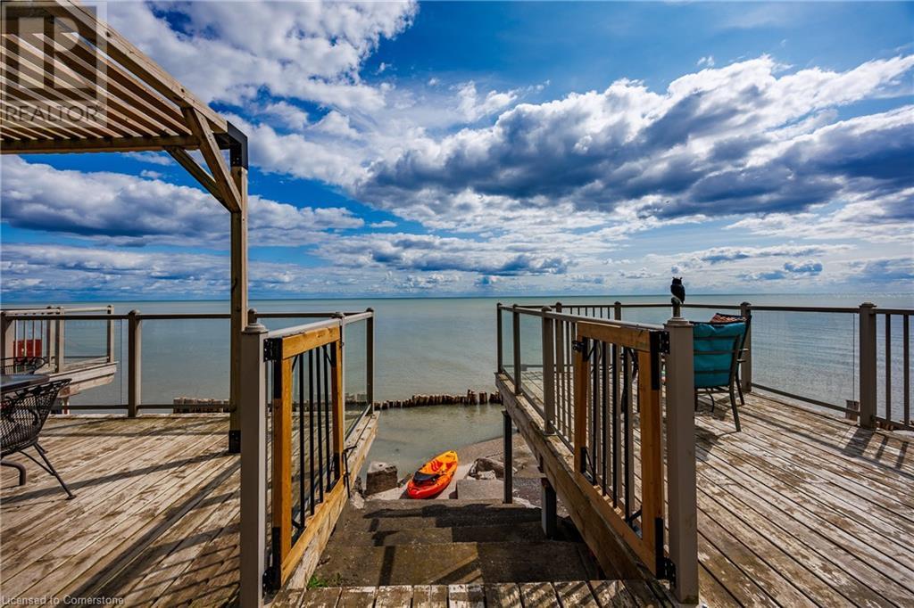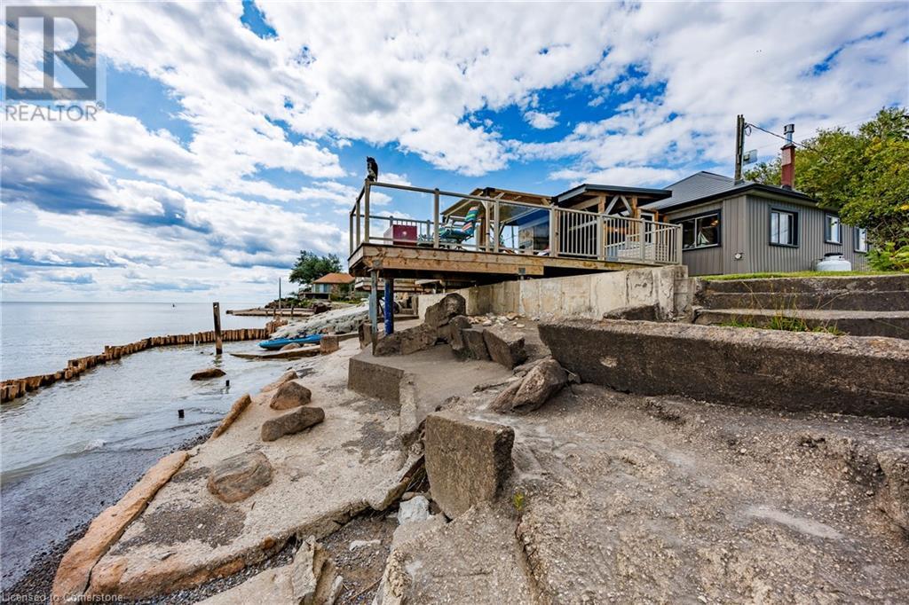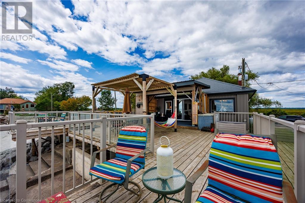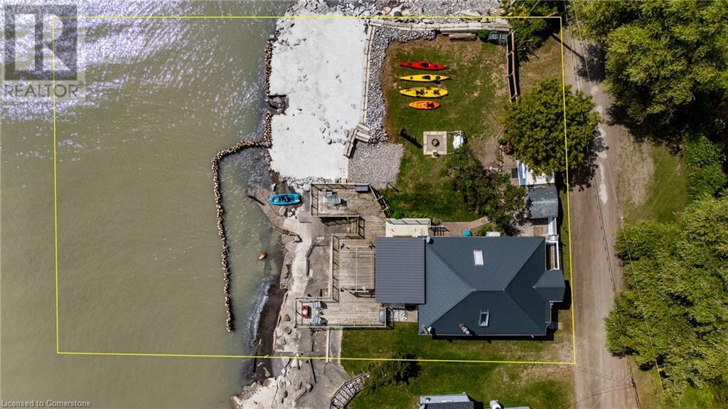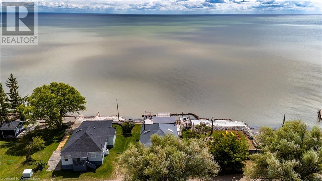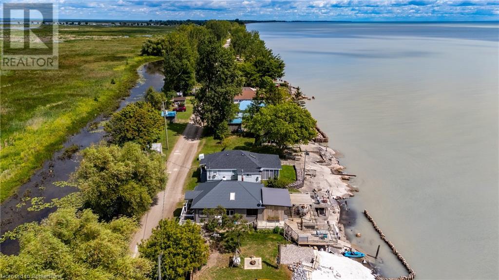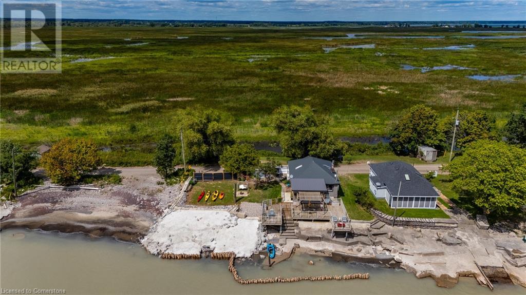 Fantastic lake views! Cute cottage on Hasting Drive - a retreat away from the crowds. Extensive outdoor living space with a deck perched on the edge of Lake Erie, and extending over 40 feet along the lakeshore. Extensive erosion protection with concrete blocks, boulders, and poured concrete along the shoreline with steps and launching space provided for kayaks or small boats. Open concept dining /living area with vaulted pine ceiling integrates nicely with a shaded outdoor sitting area. Updated kitchen with plenty of storage space as well as skylight to provide extra natural light. Stainless steel kitchen appliances included along with washer and dryer (all new in 2023). Two bedrooms (one with a vaulted ceiling) and a third room currently used as an office. Bathroom totally redone in 2023 with laundry space added. Heating and cooling provided by a ductless mini split heat pump. For those colder nights a free standing propane fireplace provides extra warmth. Extra lot provides space for a firepit, storage sheds and outdoor storage of water toys or other items. Adjacent to Big Creek National Wildlife Area - lots of opportunity for wildlife viewing with huge flocks of swans, cranes, ducks and more during migration and lots of turtles during the summer. The Sellers have directed that 221 Hastings Drive and 223 Hastings Drive must be purchased together. (id:55009)