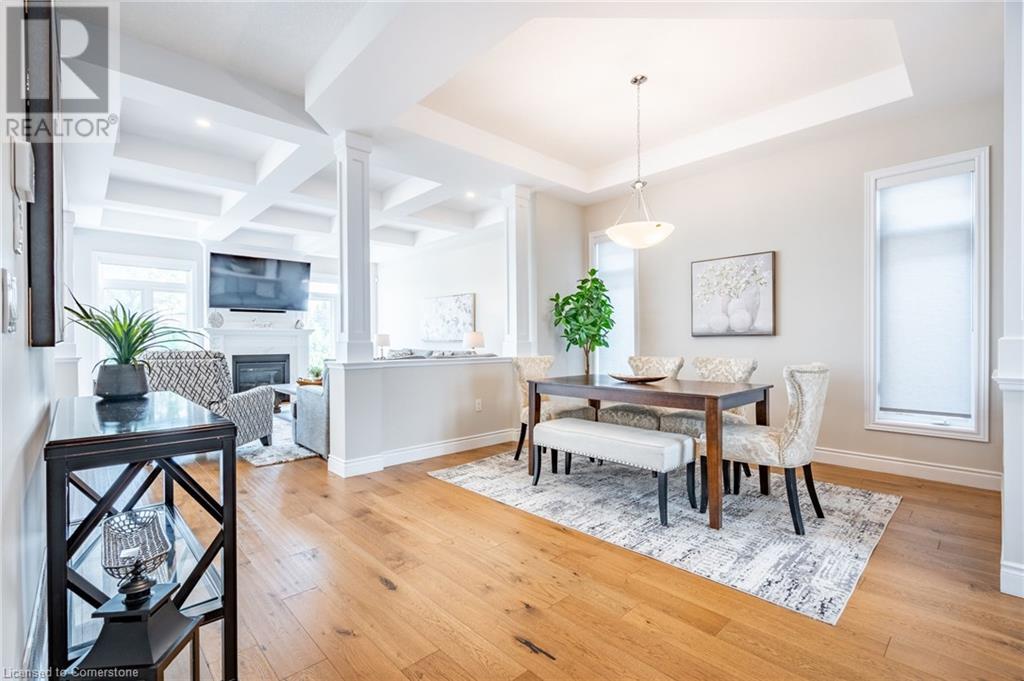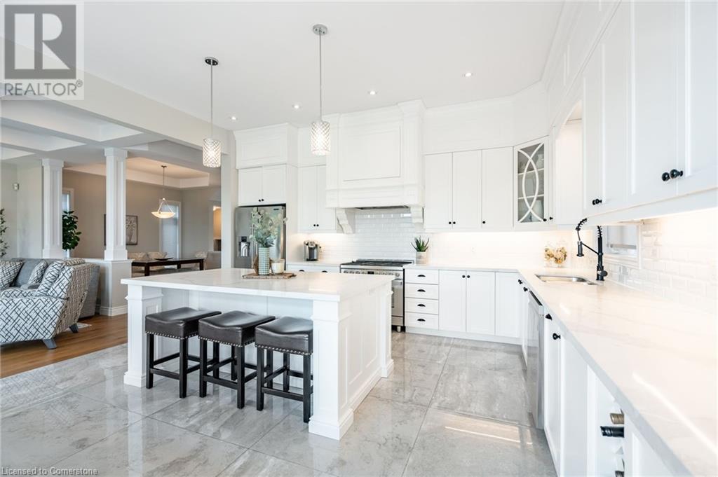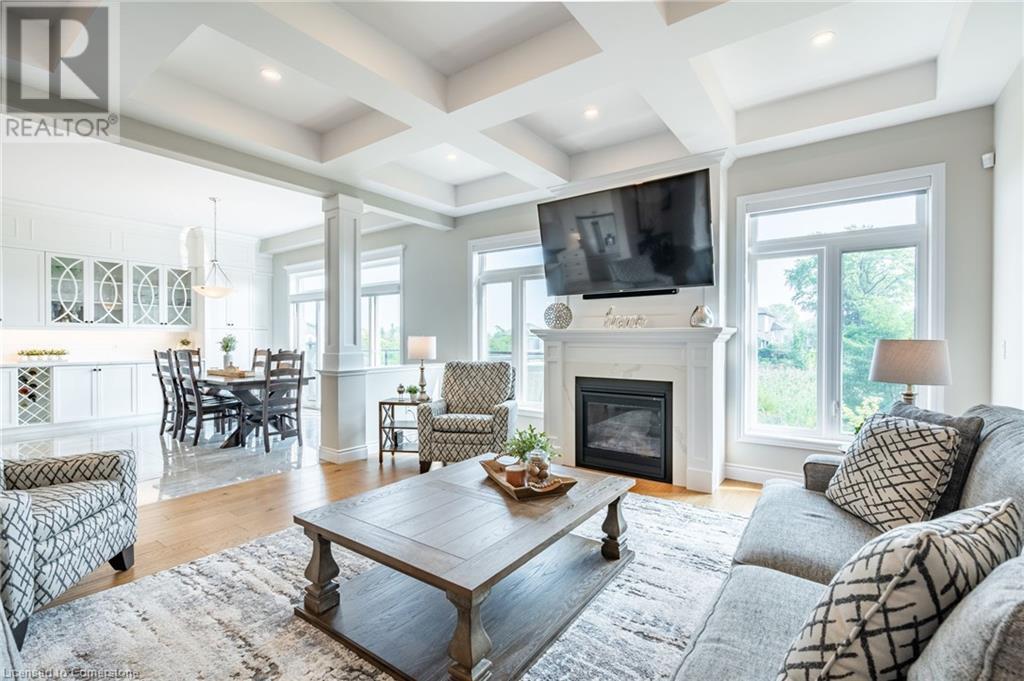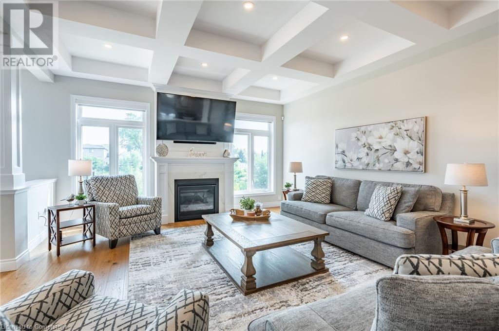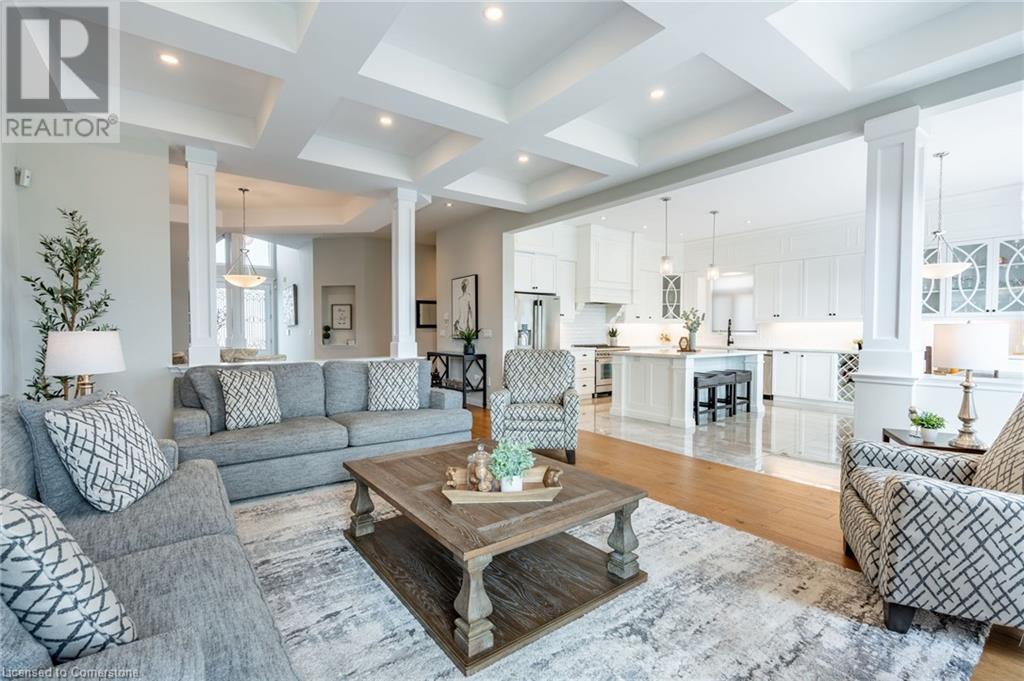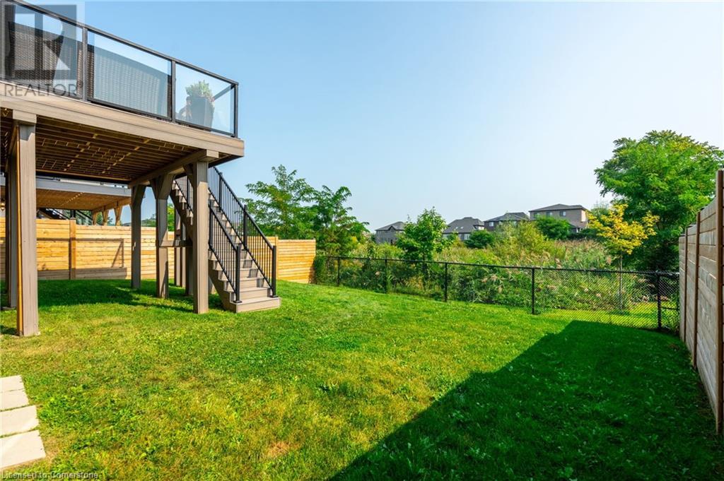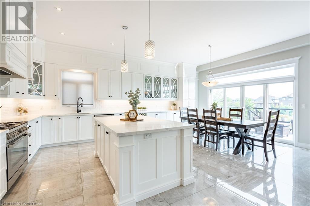 Welcome to 23 Deerfield Lane, nestled amongst luxury homes of distinction in a prestigious gated enclave in the Meadowlands of Ancaster. Offering over 3,700 sqft of beautiful living space with a perfect blend of elegance and serenity, backing onto lush greenspace and water pond. Boasting 4 beds, 4.5 baths, hardwood and porcelain throughout, fully finished basement with walk-out to private yard. The open-concept main level features wall-to-wall windows, breathtaking gourmet kitchen with stainless steel appliances, bright breakfast area with access to deck, large living room with 10 ft coffered ceiling and gas fireplace, formal dining room, powder room, laundry and mudroom with inside garage entry. Upper level offers a large primary suite with 5-piece spa bath and walk-in closet. 2 bedrooms with Jack-and-Jill bathroom access, plus a 4th spacious bedroom and a 4-piece main bath. The finished basement offers 9 ft ceilings, a 3-piece bath and a private walk-out entry, ideal for a potential in-law suite or tenant. Minutes to all amenities including great schools, parks, shopping, restaurants and easy highway access. (id:55009)