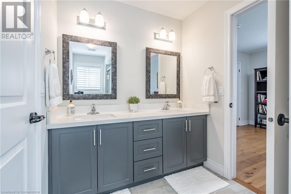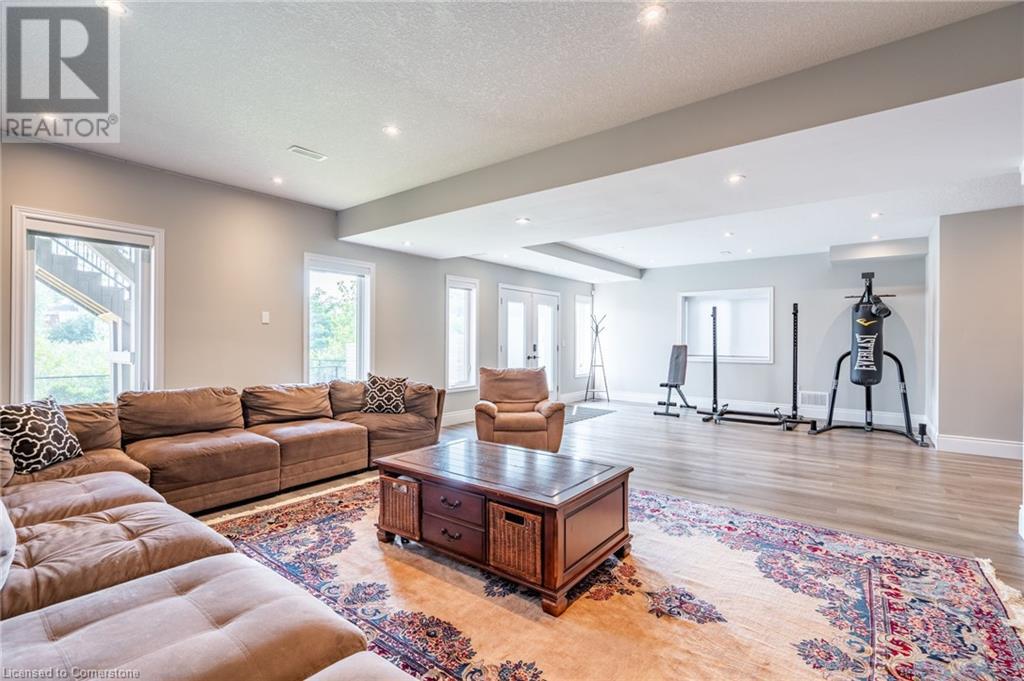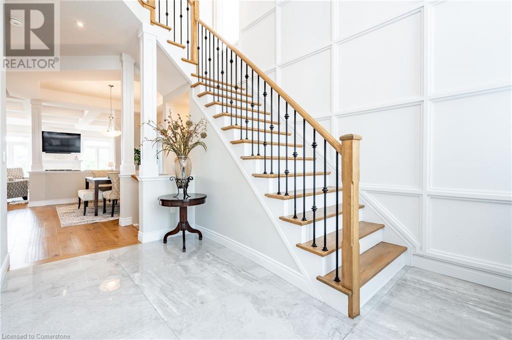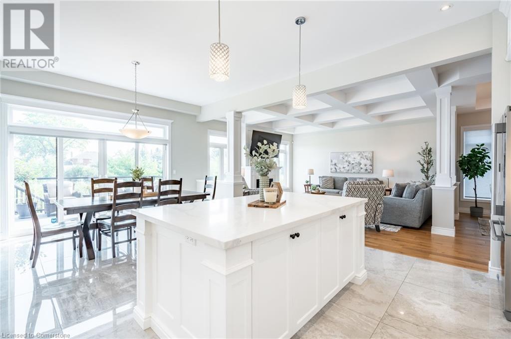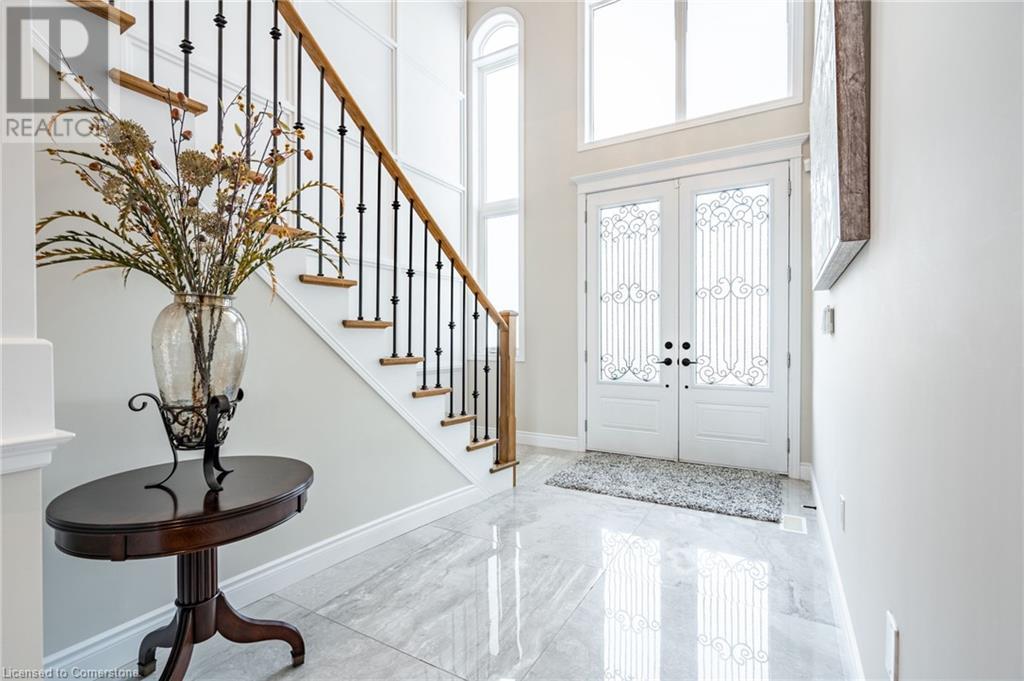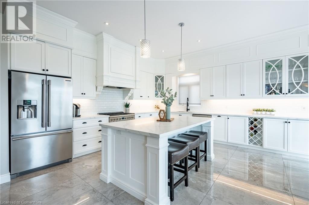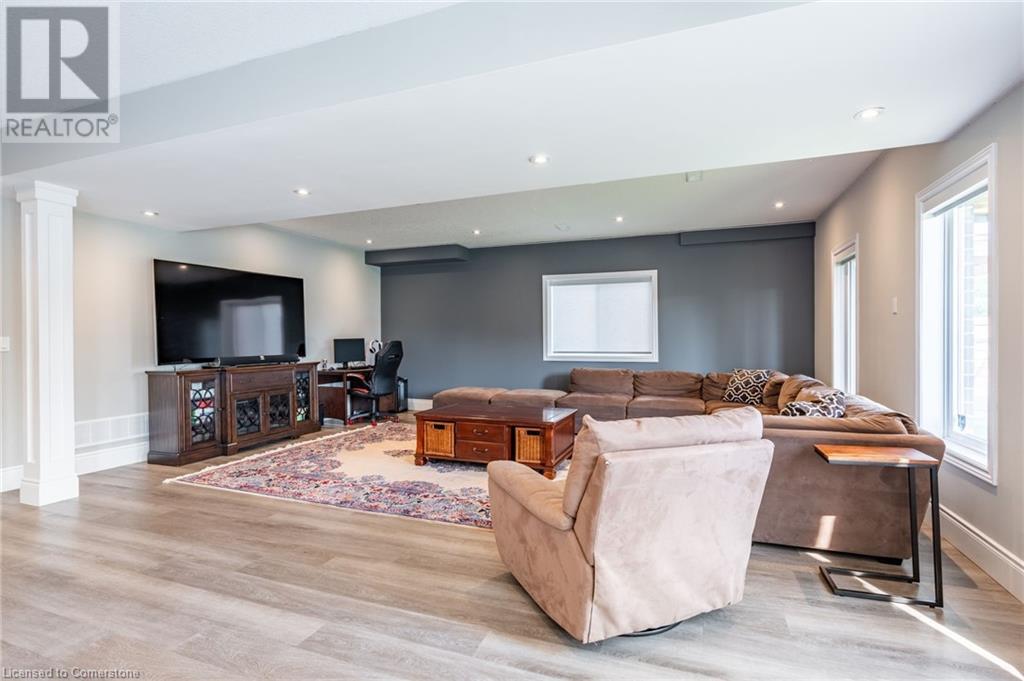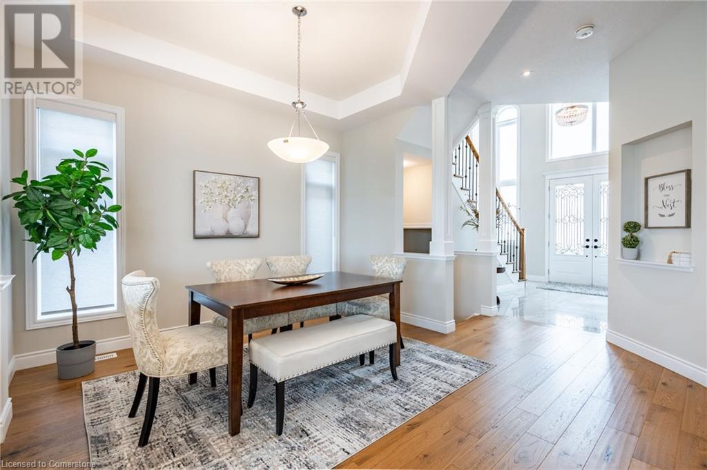Welcome to 23 Deerfield Lane, nestled amongst luxury homes of distinction in a prestigious gated enclave in the Meadowlands of Ancaster. Offering over 3,700 sqft of beautiful living space with a perfect blend of elegance and serenity, backing onto lush greenspace and water pond. Boasting 4 beds, 4.5 baths, hardwood and porcelain throughout, fully finished basement with walk-out to private yard. The open-concept main level features wall-to-wall windows, breathtaking gourmet kitchen with stainless steel appliances, bright breakfast area with access to deck, large living room with 10 ft coffered ceiling and gas fireplace, formal dining room, powder room, laundry and mudroom with inside garage entry. Upper level offers a large primary suite with 5-piece spa bath and walk-in closet. 2 bedrooms with Jack-and-Jill bathroom access, plus a 4th spacious bedroom and a 4-piece main bath. The finished basement offers 9 ft ceilings, a 3-piece bath and a private walk-out entry, ideal for a potential in-law suite or tenant. Minutes to all amenities including great schools, parks, shopping, restaurants and easy highway access. (id:55009)