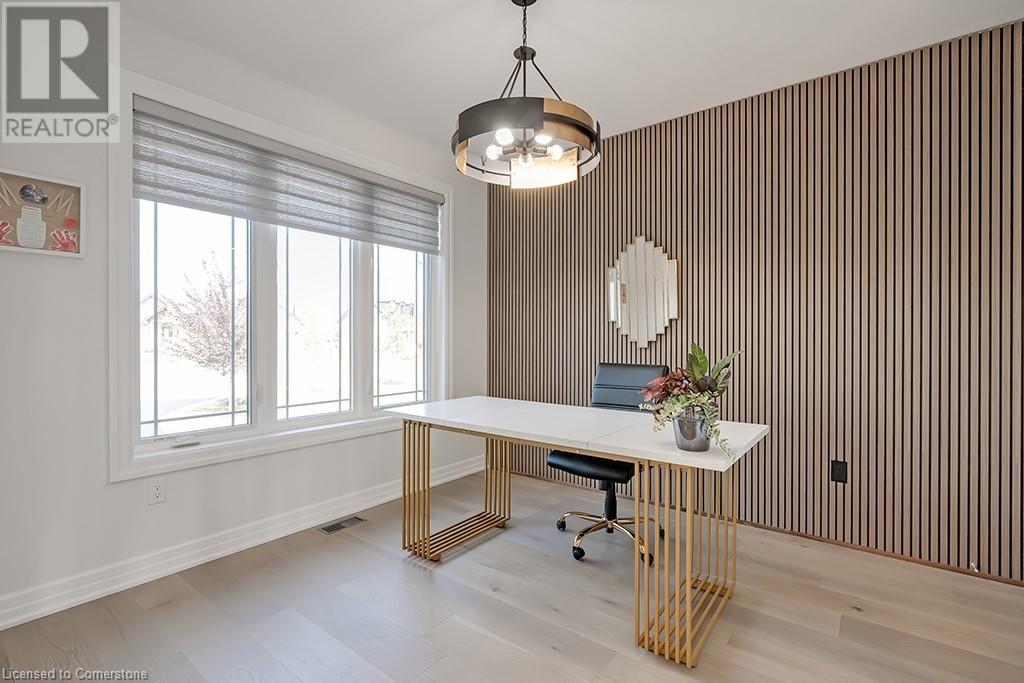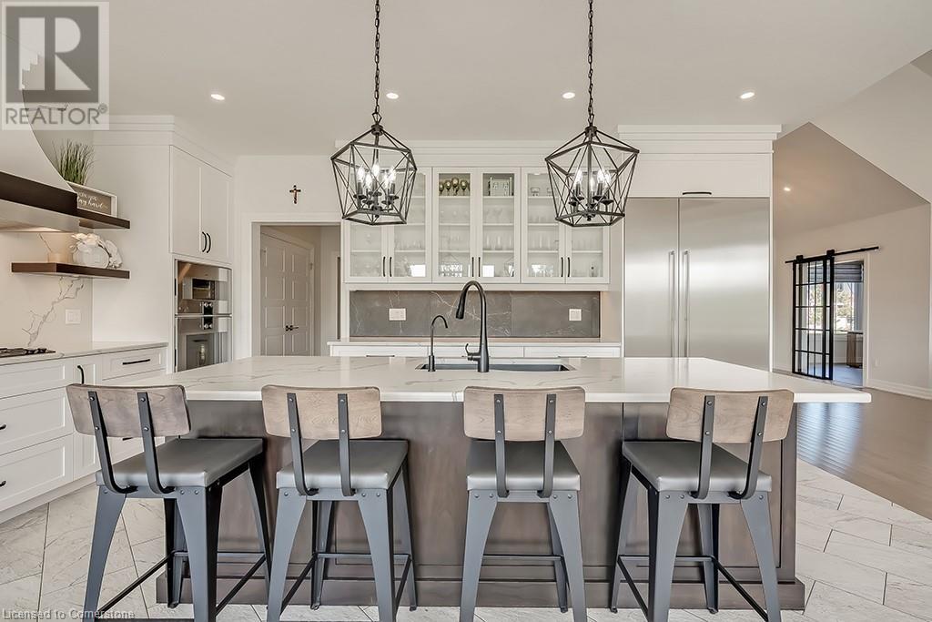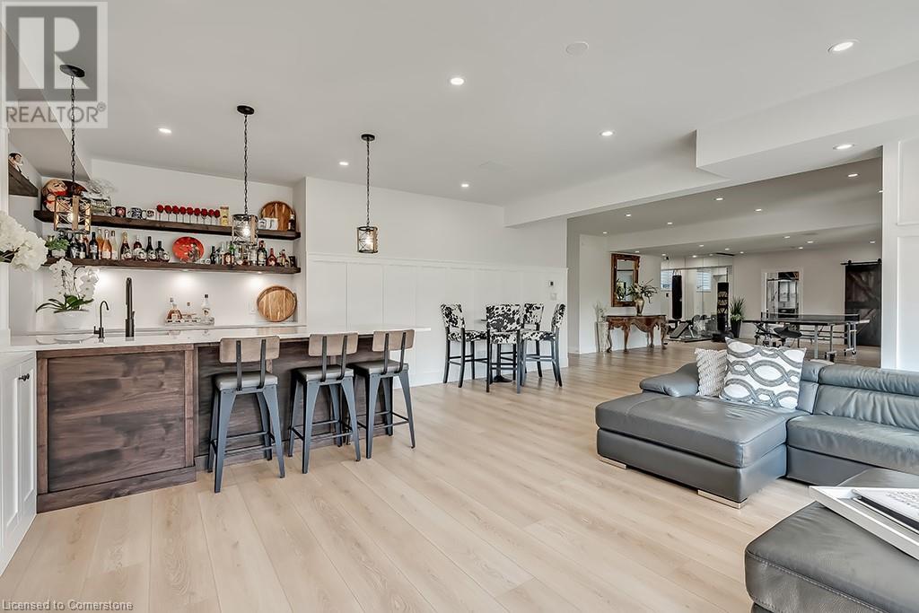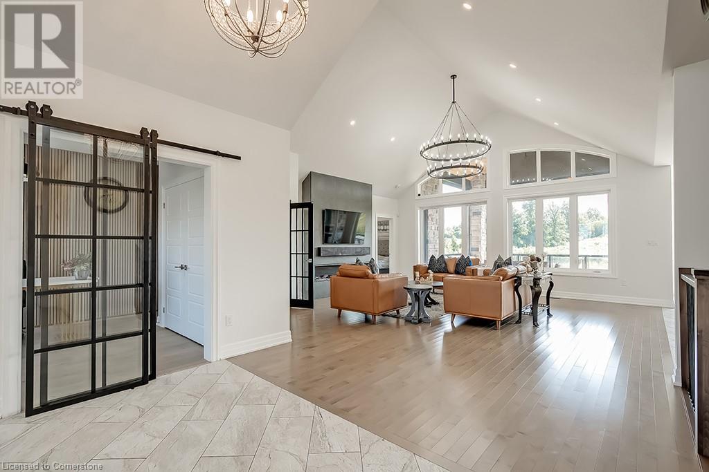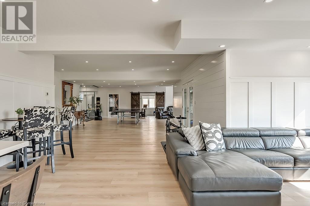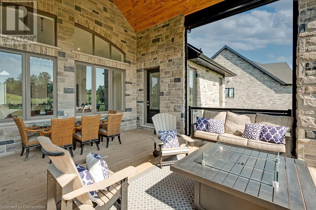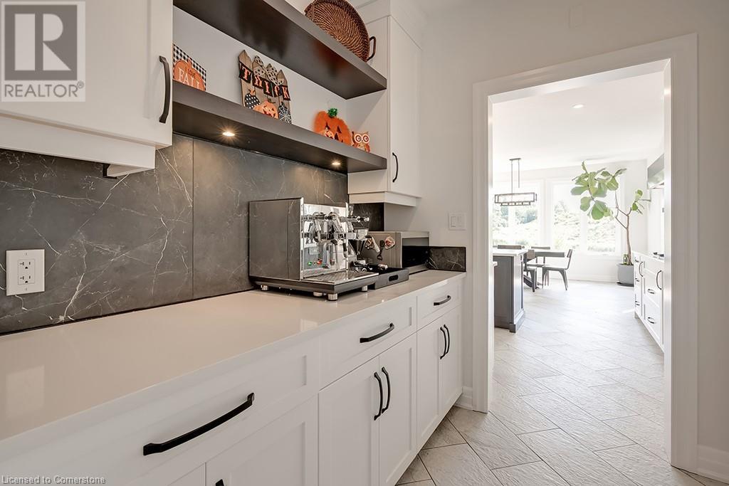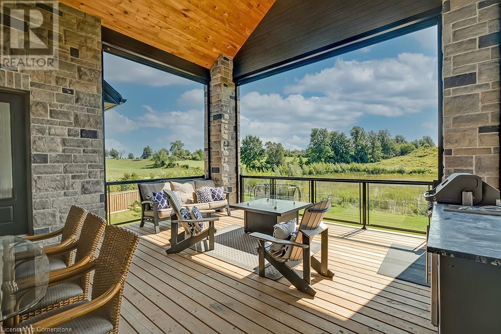 Amazing custom-built bungalow on a private pie shaped lot (over ½ an acre!) overlooking a picturesque pond/greenspace! This sprawling home boasts over 5100 square feet of top-quality finishes throughout including a finished WALK OUT lower level! This perfect home features 4+1 bedrooms, 3.5 bathrooms and an oversized triple car garage! The main entry boasts a vaulted foyer which leads to a stunning family room with soaring 15 ft ceilings and a stunning linear gas fireplace. The family room leads to the gourmet kitchen with top-of-the line Gaggenau appliances, an oversized island, quartz counter tops and a quartz backsplash. The kitchen also has a servery and access to the incredible porch with built-in BBQ / kitchen & motorized screens! The primary bedroom includes a spa-like 5-piece ensuite with heated tiles, a walk-in closet with custom organizer and access to the private porch! The main level includes 3 other bedrooms (one currently being used as an office) and a powder room, 4-piece main bath and a large mud/laundry room with garage access. The finished lower level features a wet bar, large rec room with a gas fireplace, spacious bedroom (currently set up as home gym) a den/office and a walkout to a large stone patio with a hot tub. The landscaped exterior includes a fenced yard, large custom shed and plenty of parking! This home is situated close to all amenities, schools, parks and a public transportation. Amazing premium lot completely surrounded by nature! (id:55009)