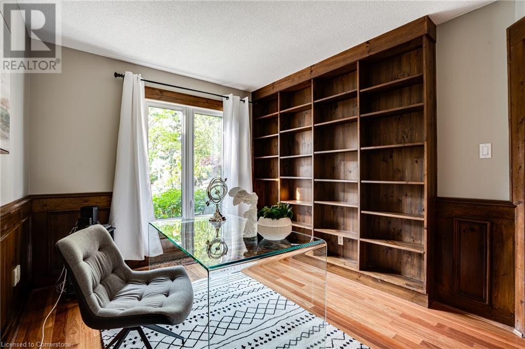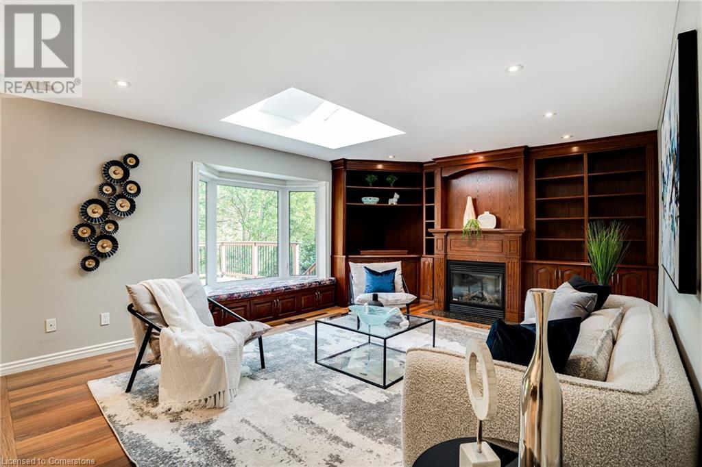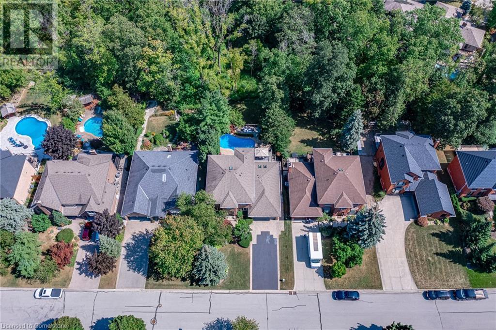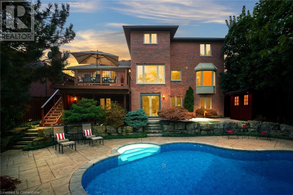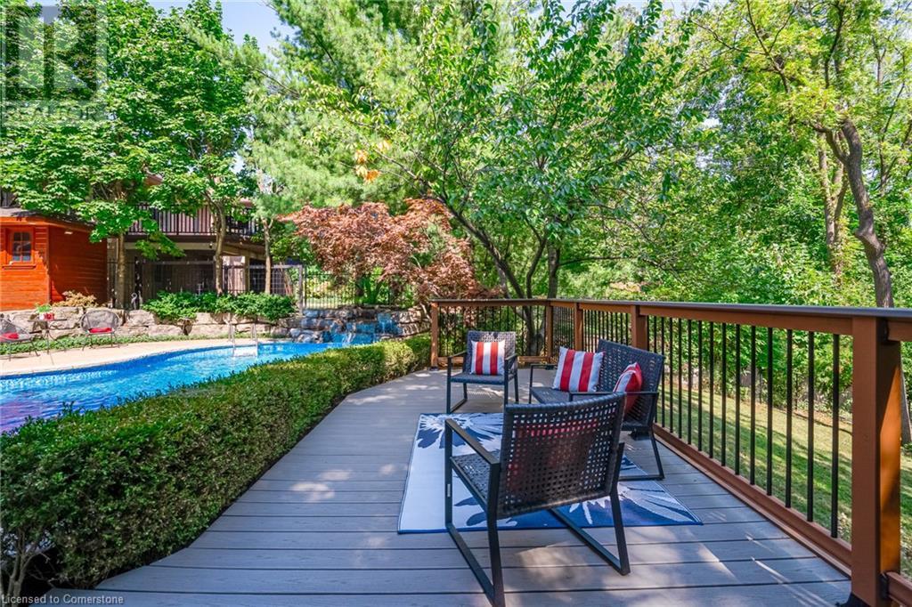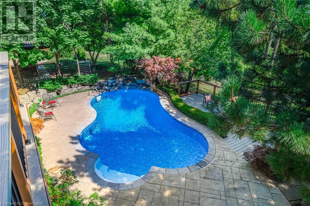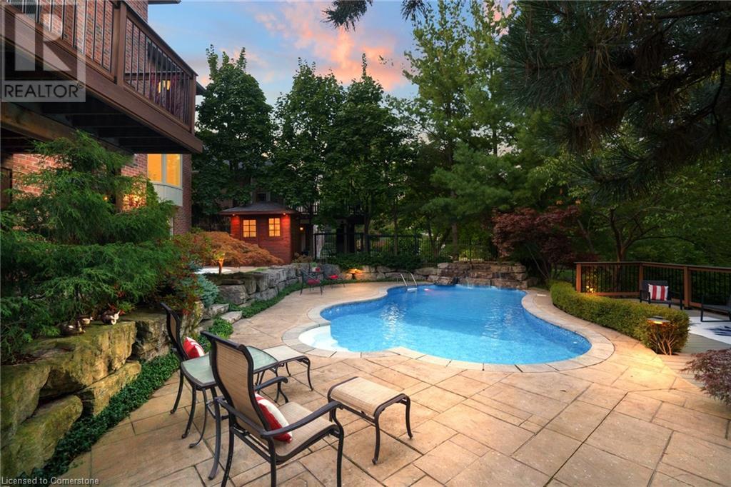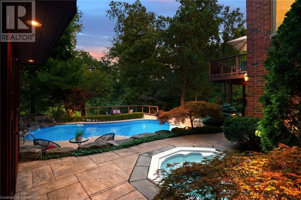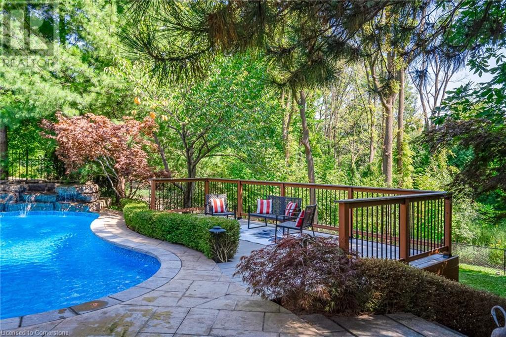 This amazing Tyandaga, rarely offered Ravine Estate home, offers over 4400 Sq. Ft. of finished living space. Enter your private retreat though the new custom front door. The main floor office is located away from the family room and kitchen and is ideal for work from home. The formal living room looks out onto the profess. landscaped gardens. Hardwood floors and stone tile is the primary flooring on the main level and the family sized kitchen offers an abundance of storage and a huge island with a walk-out to the new composite deck. The spacious family room with a new gas fireplace, custom built-in cabinetry and lovely widow seat, huge skylight, overlooking the incredible backyard. The 2nd floor offers 4 spacious bedrooms and the Principal suite offers views of the pool and ravine area, a renovated ensuite bath and walk-in closet with an adjoining 4th bed/den/nursery. 4 Updated baths throughout the incredible home with heated floors in the 2nd floor baths and basement bath. 4 spacious bedrooms on the 2nd floor, there is also a 5th bed. on the walk-out basement level. A Huge recreation room with a gas fireplace and tons of storage. The backyard oasis has heated salt water Inground pool, and hot tub and waterfall, new pool liner(2024), new pool heater(2021), New composite deck(2020), wifi activated pool cleaner, Cabana w/new roof(2022), gas line for BBQ, inground sprinkler system, newer windows, new doors(2020). An entertainment paradise! (id:55009)