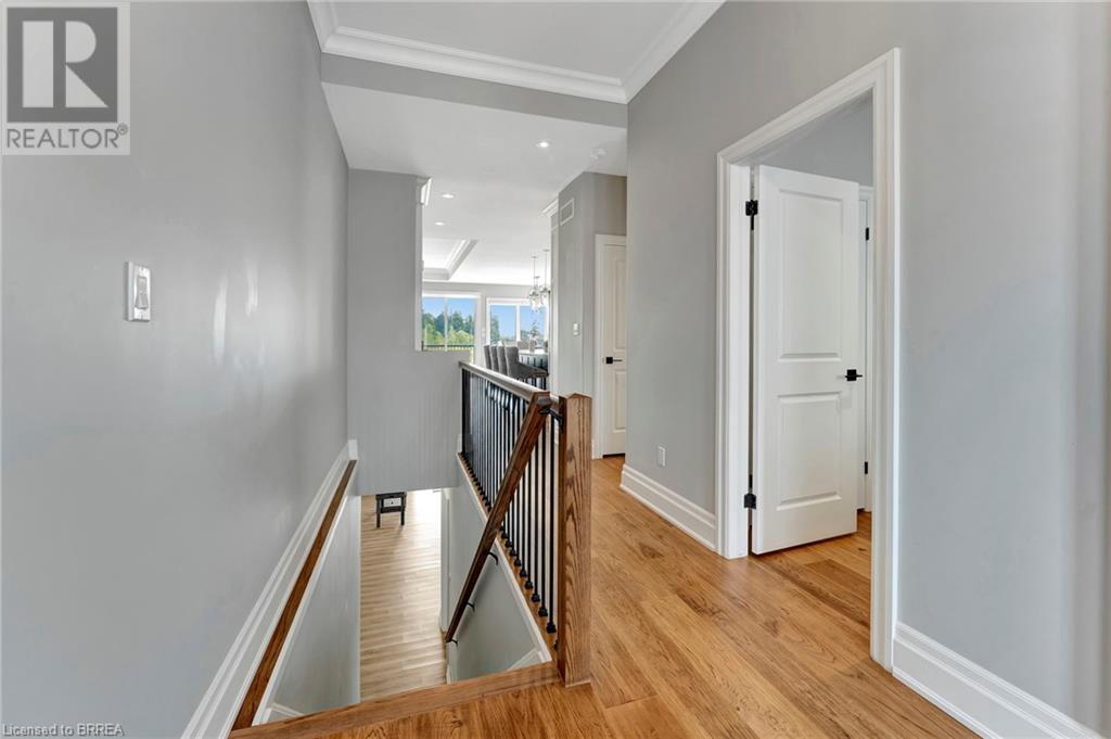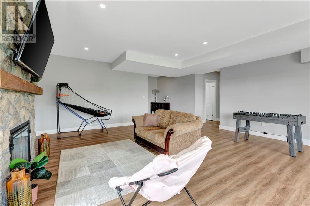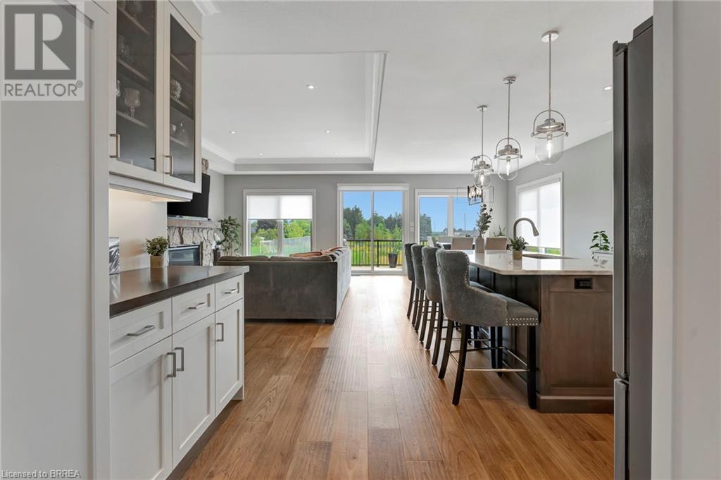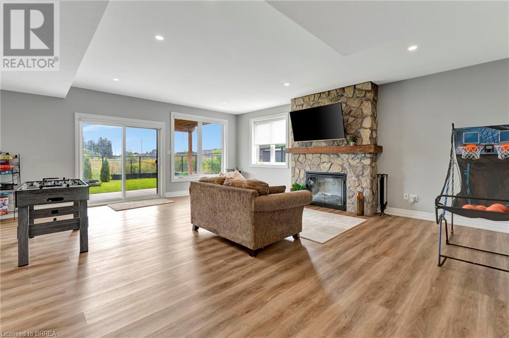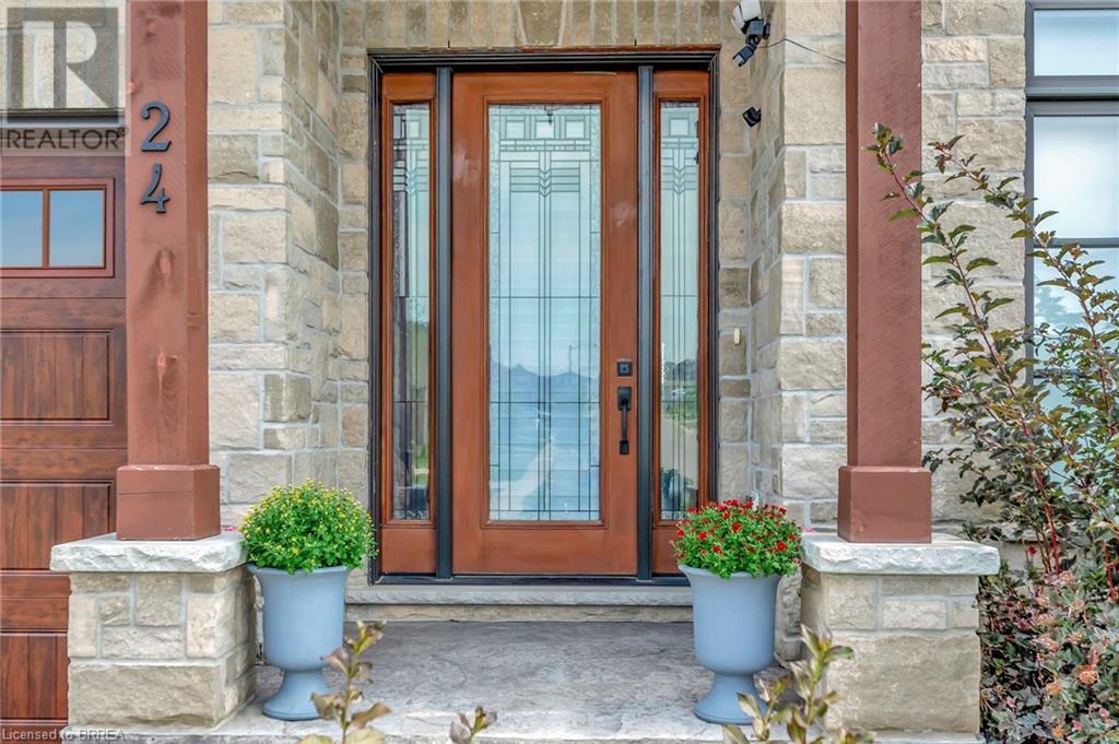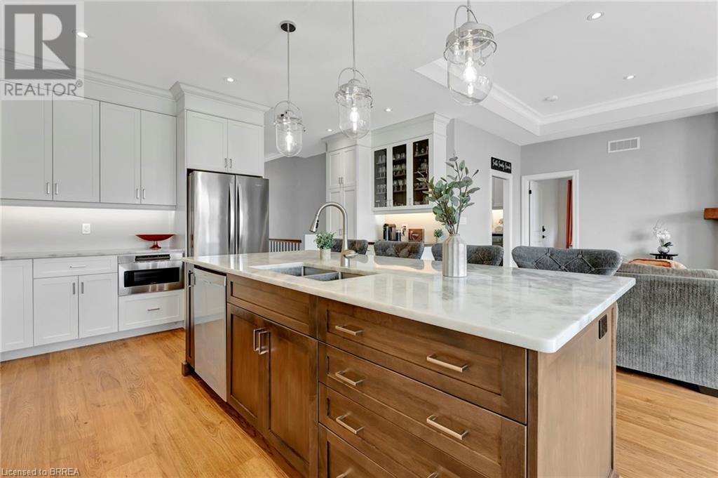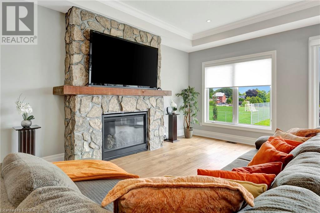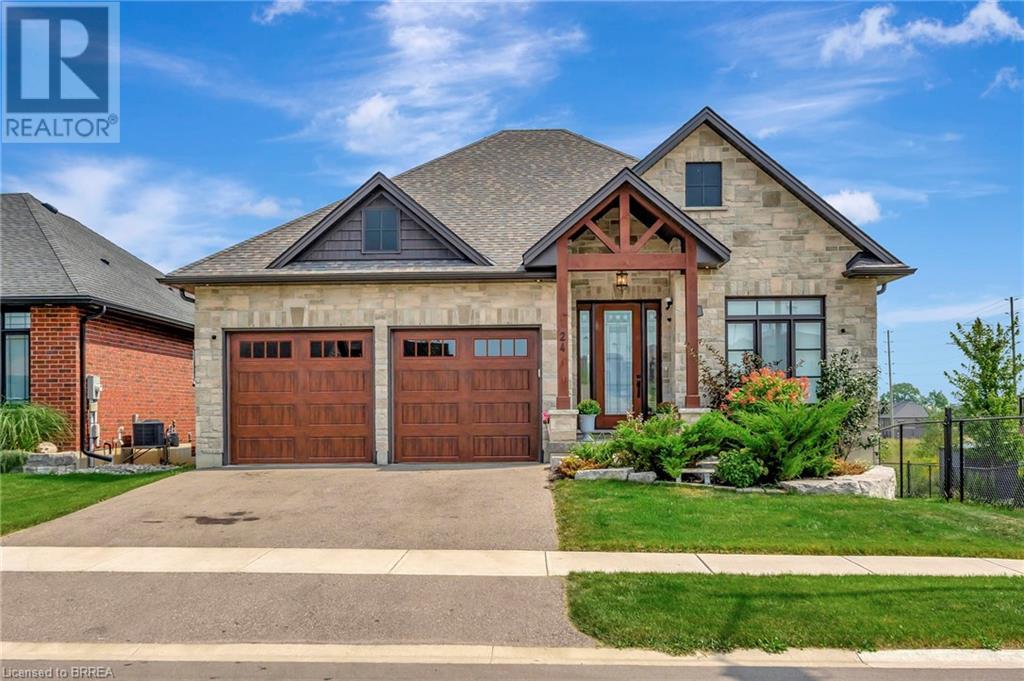 Welcome to 24 Whiting Drive in the picturesque town of Paris, ON. Immerse yourself in a sophisticated neighborhood designed for upscale family living. This meticulously crafted home seamlessly blends contemporary design with opulent comfort. Every detail has been thoughtfully attended to in this immaculate property, featuring multiple elegant upgrades such as gleaming hardwood floors, dazzling pot lights, exquisite crown molding, stunning tray ceilings, and two impressive stone-surround gas fireplaces. Step inside this turnkey dream home to discover a light and airy open-concept kitchen, dining area, and living room that make entertaining a delight. The custom kitchen showcases luxurious quartz countertops, stylish shaker-style cabinetry, ambient undermount lighting, a large central island, a custom coffee bar, and high-end stainless steel appliances. The main level primary bedroom offers a serene oasis with a spacious walk-in closet and a spa-like ensuite bathroom, complete with dual vanities, a sleek glass shower, and a sumptuous free-standing soaker tub. The beautifully finished lower level provides an expansive living and entertainment area, featuring a stone-surround gas fireplace, pot lights, 9-foot ceilings, cold room, three additional bedrooms, and an elegant four-piece bathroom. The exterior of this home is equally impressive, offering two separate graceful walk-outs to the backyard—one from the dining area leading to a raised deck with a picturesque park view, and a secondary walk-out from the lower level family room leading to a cozy covered patio where you can enjoy tranquil morning sunrises or relaxing shade in the afternoon. This residence is truly a sanctuary, harmoniously combining luxury and an ideal location for relaxation and entertainment. With convenient access to Highway 403, downtown, shopping, schools, and parks, this property offers the perfect blend of serenity and practicality. Don’t miss your chance to make this exquisite home yours. (id:55009)