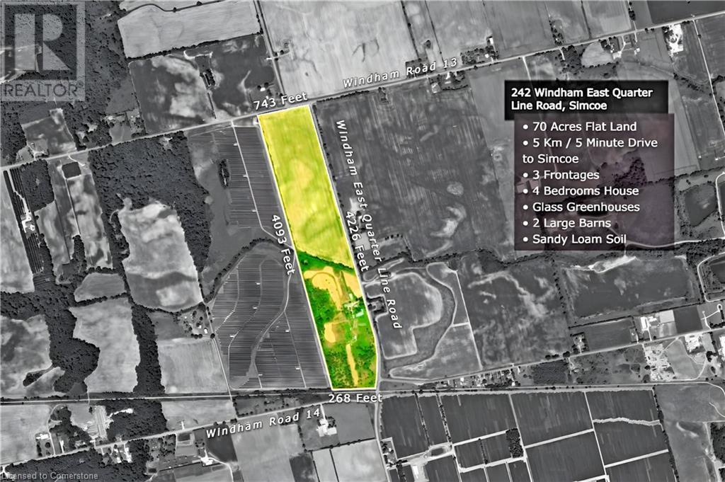Farm for sale in Norfolk County, or Ontario's Garden. Just 3-5 minutes from the City of Simcoe, HWY-24, HWY-3, and 50 minutes from the City of Hamilton. This 70.3-acre farm has three wide frontages (4226 x 743 x 268 feet) at four busy road intersections. The property includes natural gas and 3-phase power. It features completely renovated houses and buildings. The owner has invested over one million dollars in recent years on this property. The 2600 sq ft house has been renovated both inside and out and includes 4 bedrooms, 2 bathrooms, a new fridge, stove, washer, dryer, electric light fixtures, and central air. The property also has two barns (7200 sq ft and 3400 sq ft) and one greenhouse (4000 sq ft) with new insulation, gas, water, a concrete floor throughout, and an upgraded growing system. It also has a huge upgraded hydro power transfer system, sufficient for large commercial farming operations. This farm is ideal for all kinds of indoor and outdoor growing businesses, storage, nursery, fruit/vegetable, cash crop, and animal farming. It is also suitable for the installation of large commercial greenhouses or a garden center, and for mushroom and edible insects farming operations. Currently, about 50 acres are leased out for growing cash crops. With these unique features, investment in this land is a surefire way to protect your portfolio from currency devaluation. This property will be sold as is. Do not miss out on this amazing opportunity ! (id:55009)