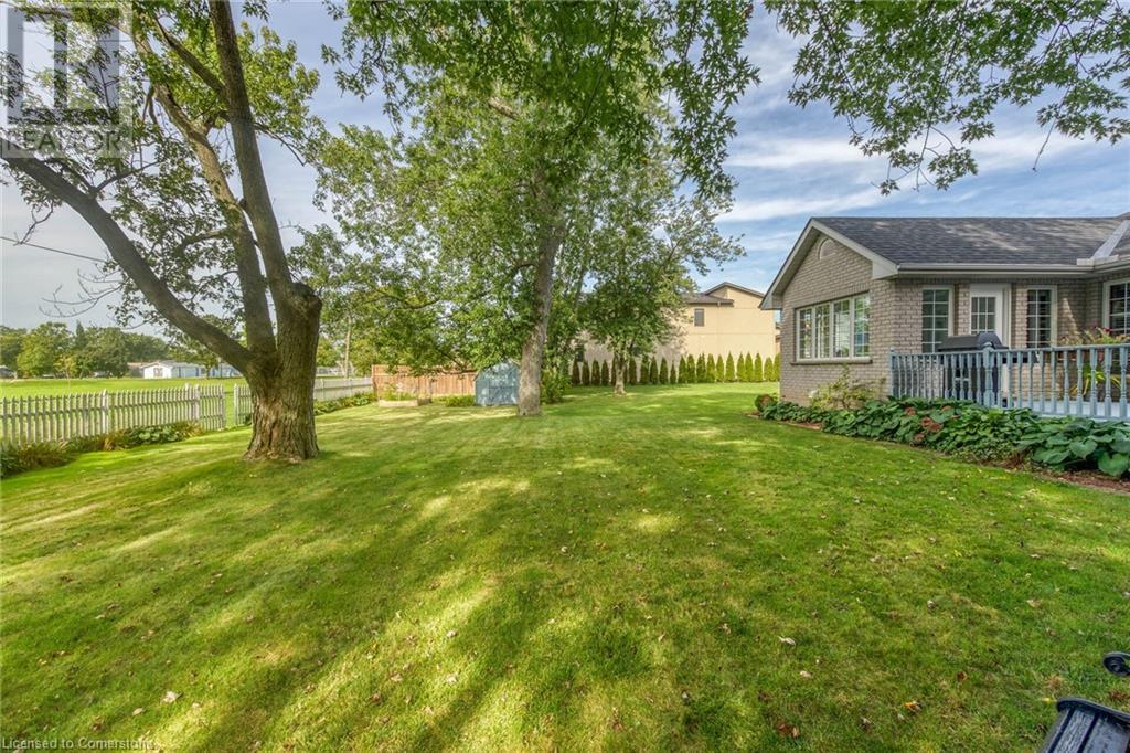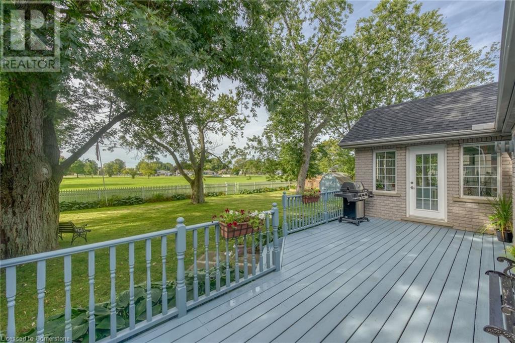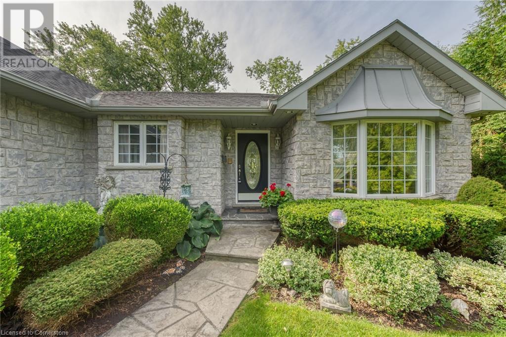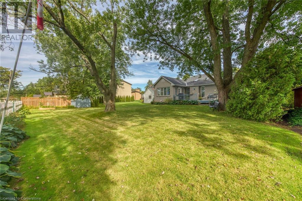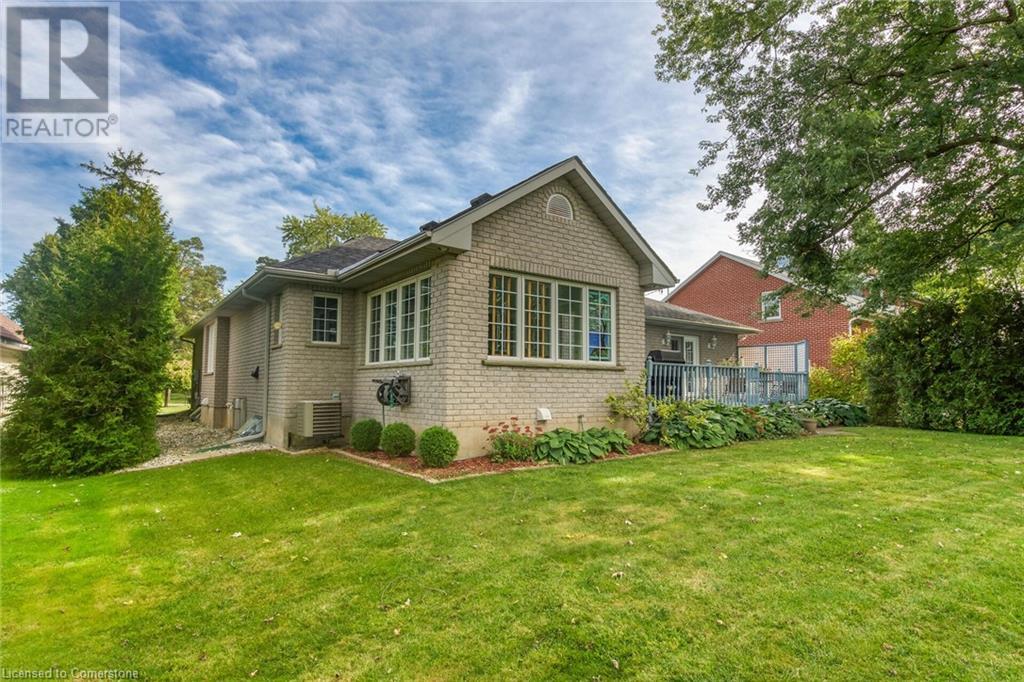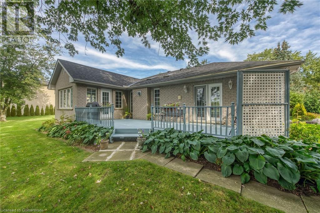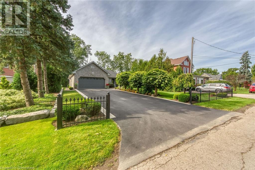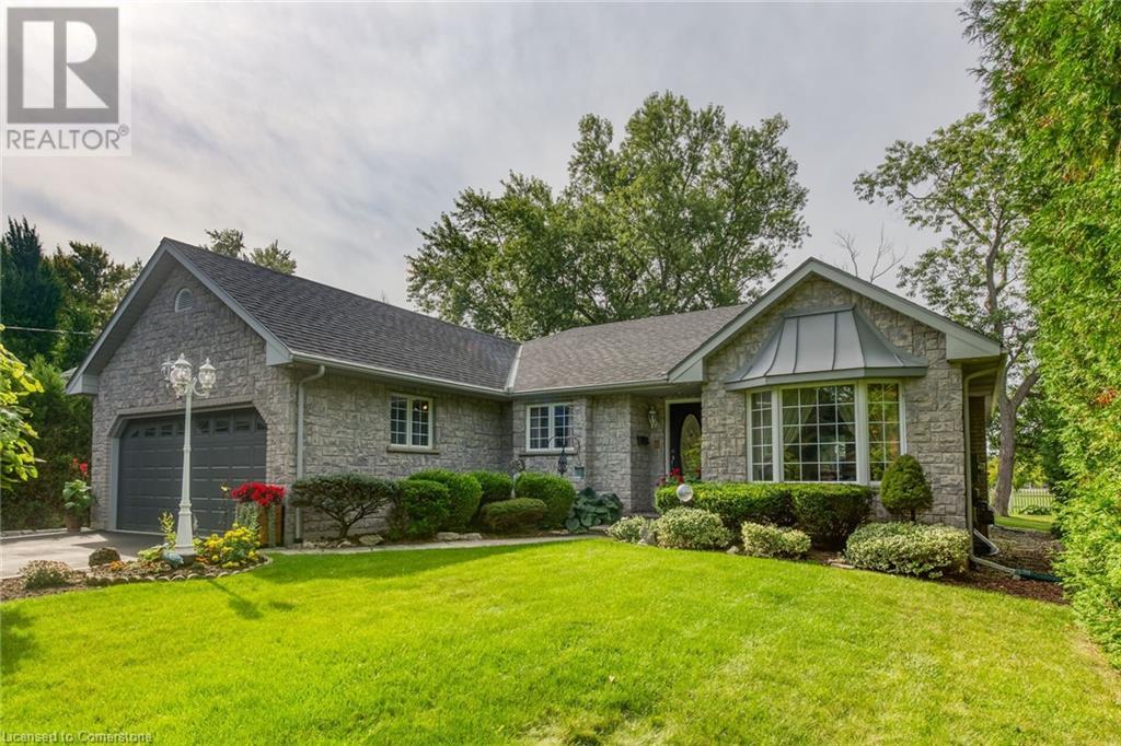Flawless stone/brick bungalow located in Hagersville's most prestigious area where properties rarely become available. Check out this first time offered, original owner 1993 custom built home positioned magically on oversized 0.28 acre lushly landscaped lot enjoying 60.04ft of frontage on iconic “Church Street” abutting a beautiful park - walking distance to schools, churches, Hospital, downtown shops & eateries - 30 min commute to Hamilton, Brantford & Hwy 403. Prepare to be awe struck as you enter past the impressive wrought iron fence to paved driveway enhanced w/concrete curbing w/quaint flag stone walk-way adorned w/ornamental shrubs leading to welcoming front entry door where expansive foyer introduces 2192sf of pristine living area, 2186sf lower level & 492sf double car garage. Classic French doors access traditional living room/dining room complimented w/crown moulded ceilings & accented w/gleaming hardwood flooring that carries thru-out main floor hallway, bedrooms & family room. Open concept kitchen highlights bright south wing sporting solid oak cabinetry, convenient island, corion countertops & newer SS built-in appliances - segues to adjacent family room boasting vaulted ceilings w/skylights & n/gas fireplace. French doors open to gorgeous all-seasons sunroom incs wall to wall windows & walk-out to 360sf private entertainment deck overlooking park. Continues to luxurious primary bedroom offering garden door deck walk-out, walk-in closet & 4pc jacuzzi en-suite - 2 additional bedrooms, 4pc main bath, desired main floor laundry incs direct garage entry. Spacious lower level is ideal for relaxing or having large family gatherings incs rec room ftrs 2nd gas fireplace & solid oak bar, 4th bedroom incs closet/storage room, 3pc bath, huge L-shaped, super-tidy finished workshop & several built-in storage closets. Extras - gas furnace/AC-2014, roof-2017, insulated RU garage door-2020, 200 amp hydro & extensive amount of oak woodwork. A Truly Special Property! (id:55009)