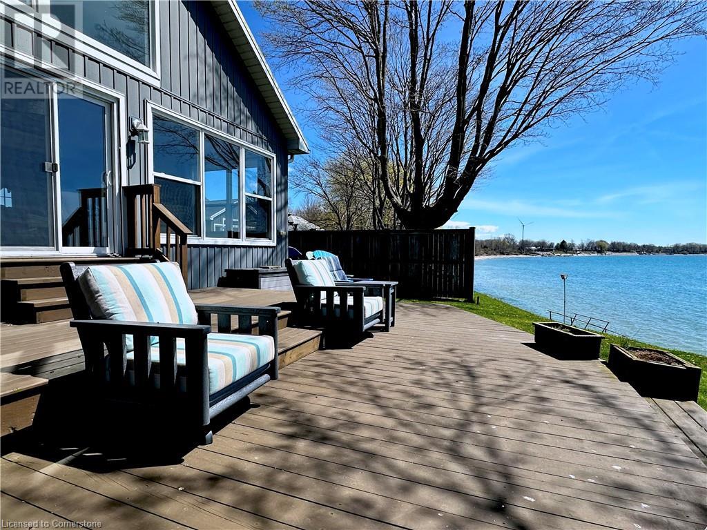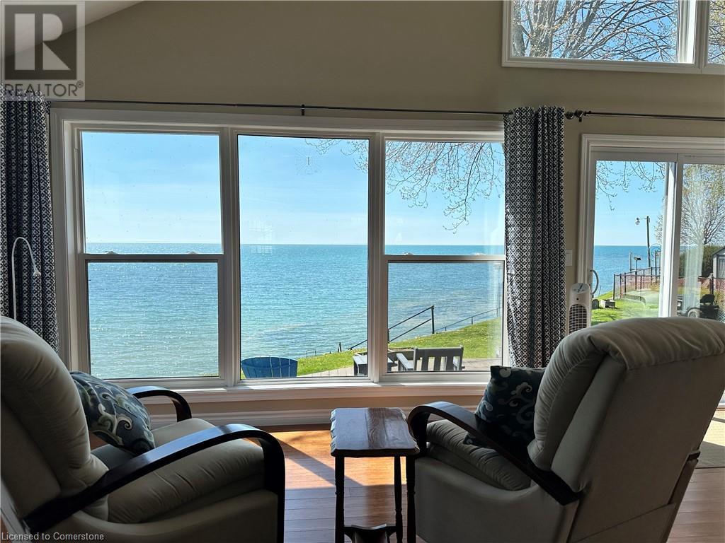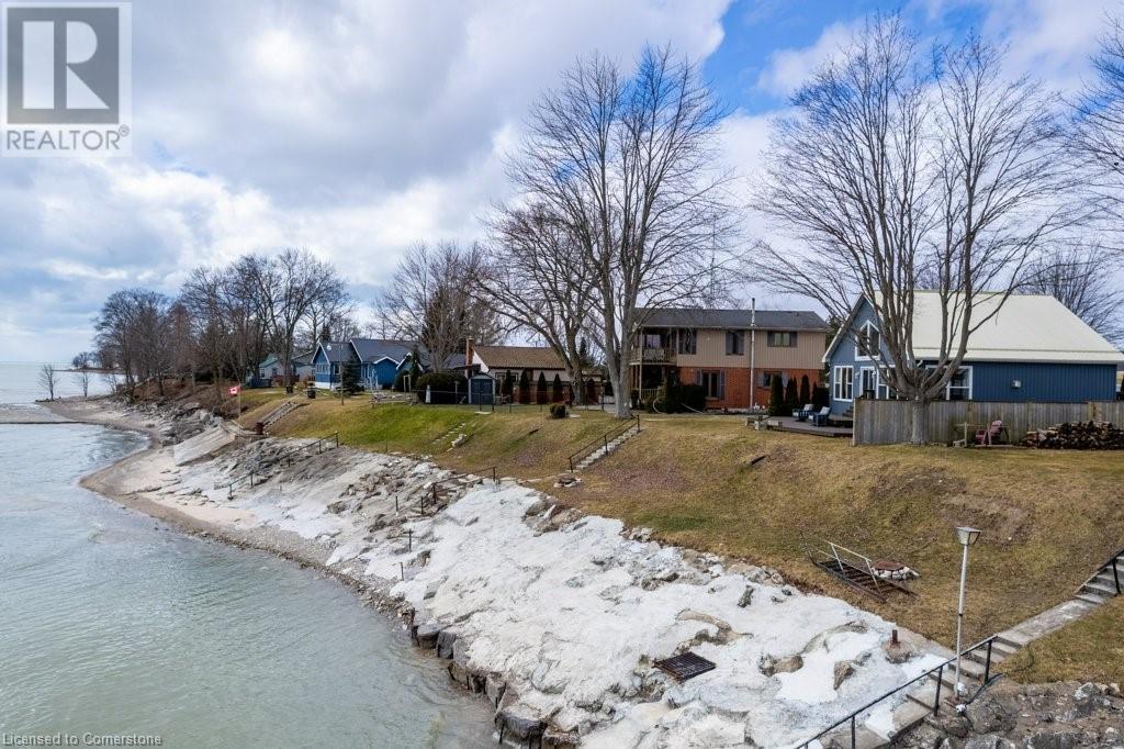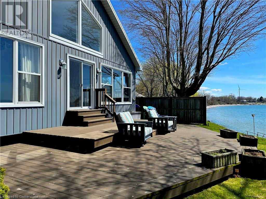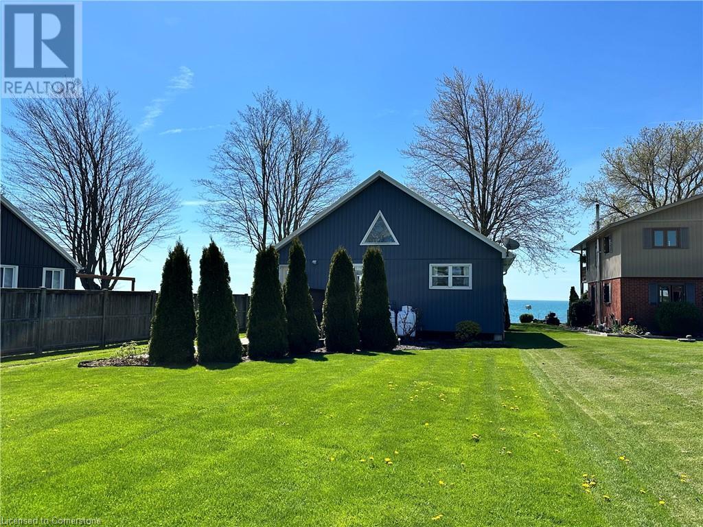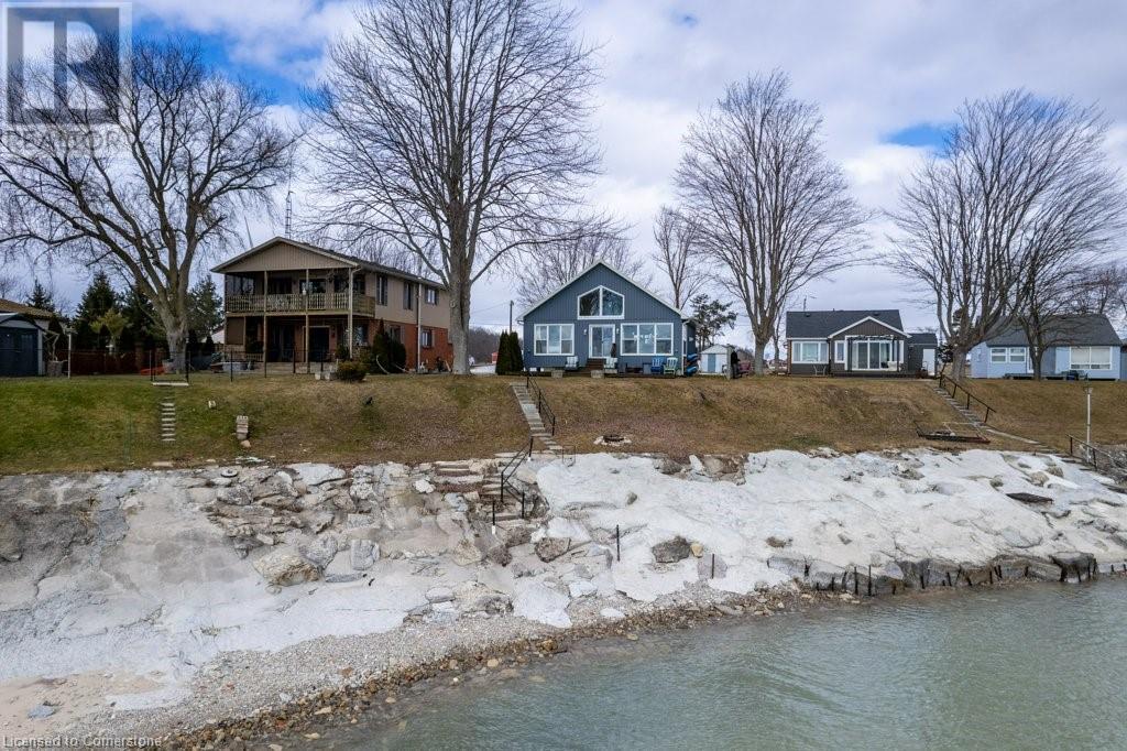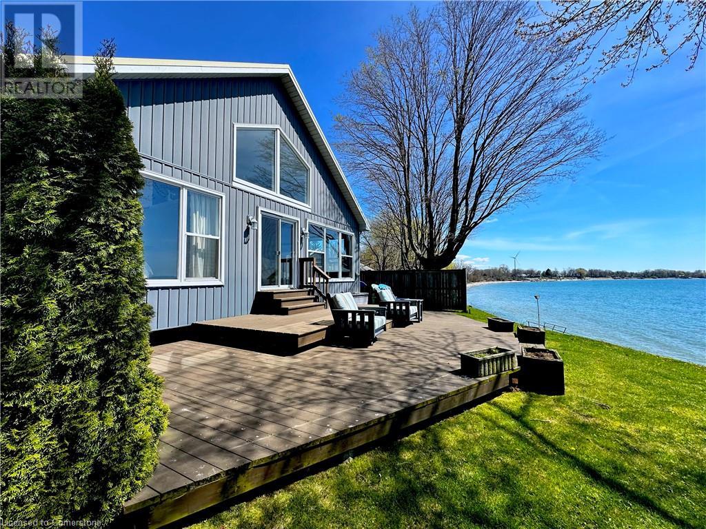 Custom built waterfront gem. This gorgeous cottage offers 180 degree views of Lake Erie. Open concept living space, vaulted ceiling in LR, propane fireplace, spacious bedrooms, bonus loft, 3pc bath, large bright kitchen. Armour stone and concrete break wall with steps to water, fantastic deck. Set back from the road, bonus detached single garage. Metal roof. Conveniently located minutes to town. (id:55009)