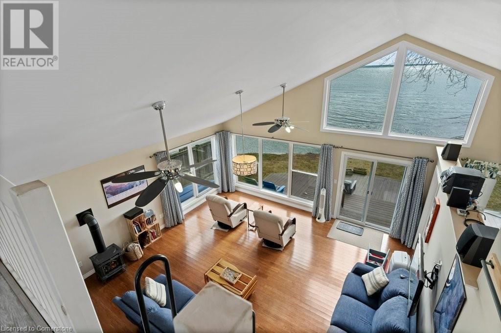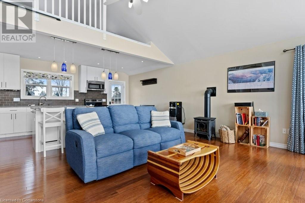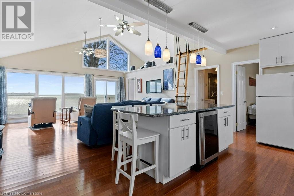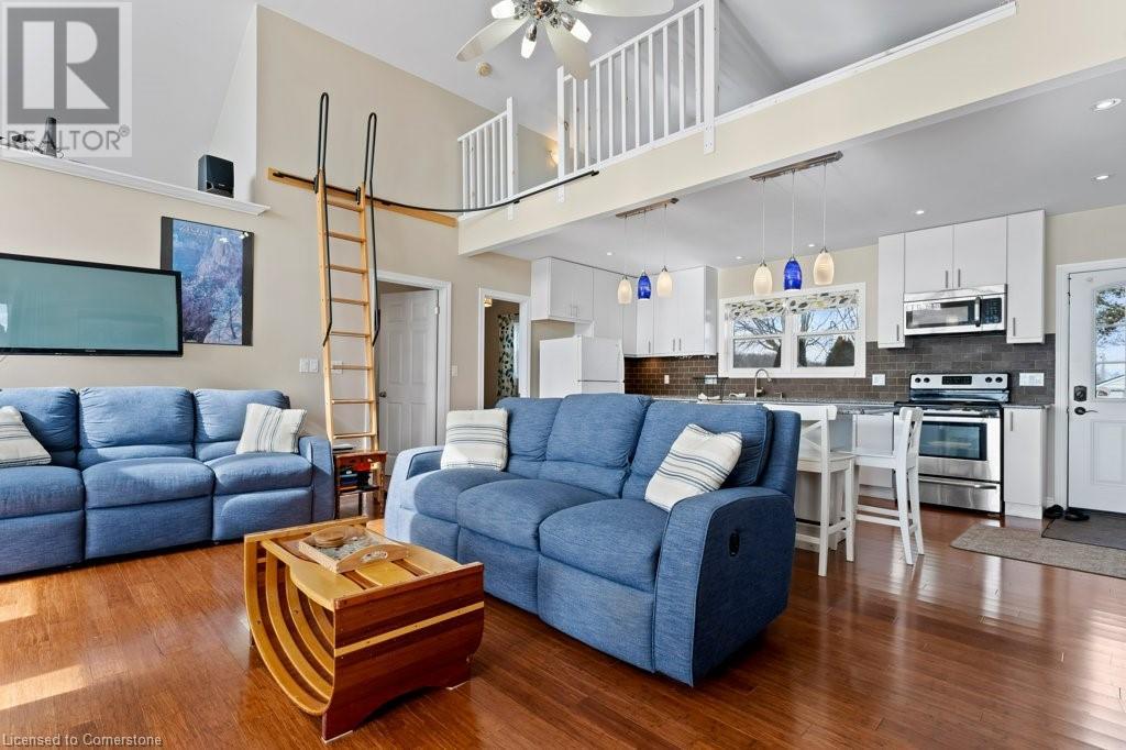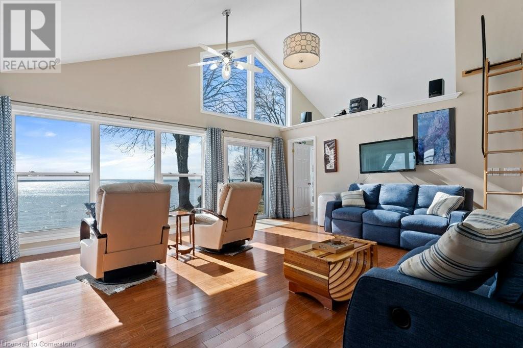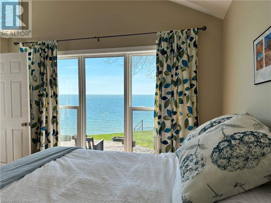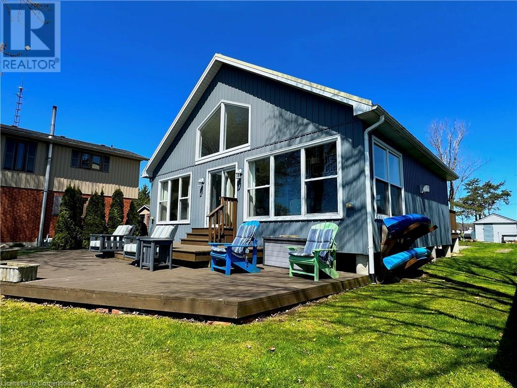 Custom built waterfront gem. This gorgeous cottage offers 180 degree views of Lake Erie. Open concept living space, vaulted ceiling in LR, propane fireplace, spacious bedrooms, bonus loft, 3pc bath, large bright kitchen. Armour stone and concrete break wall with steps to water, fantastic deck. Set back from the road, bonus detached single garage. Metal roof. Conveniently located minutes to town. (id:55009)