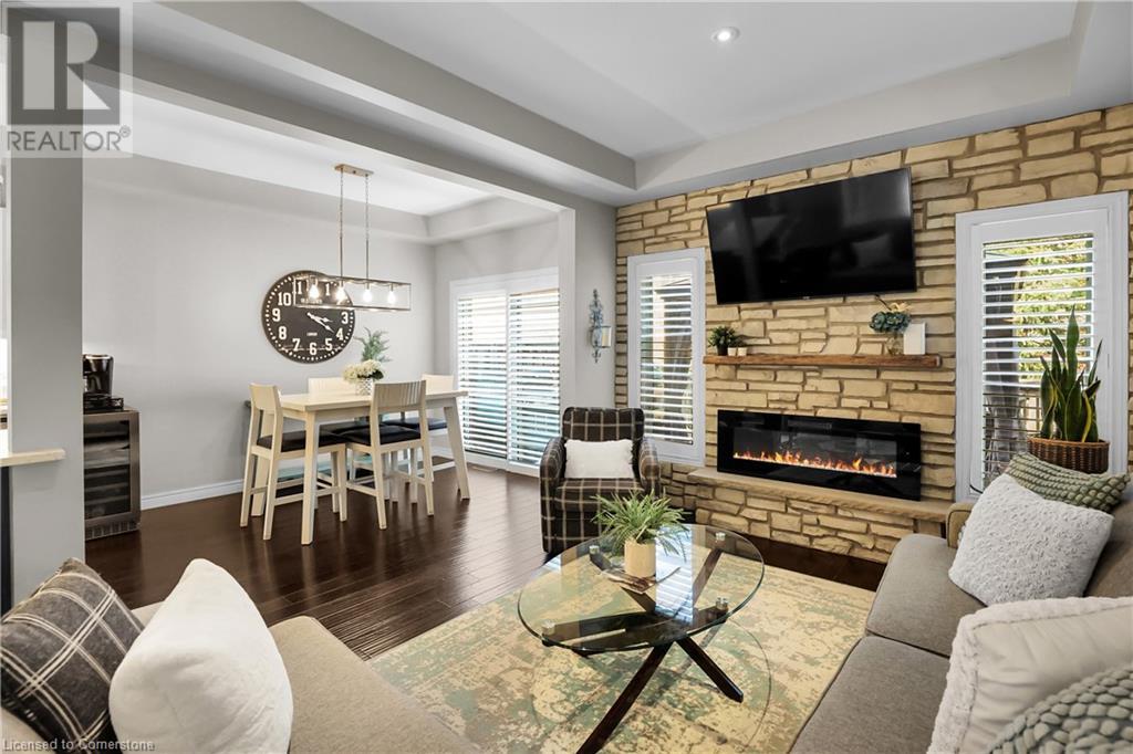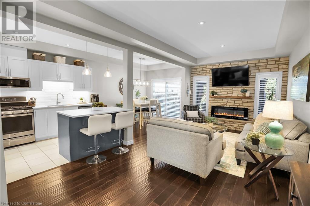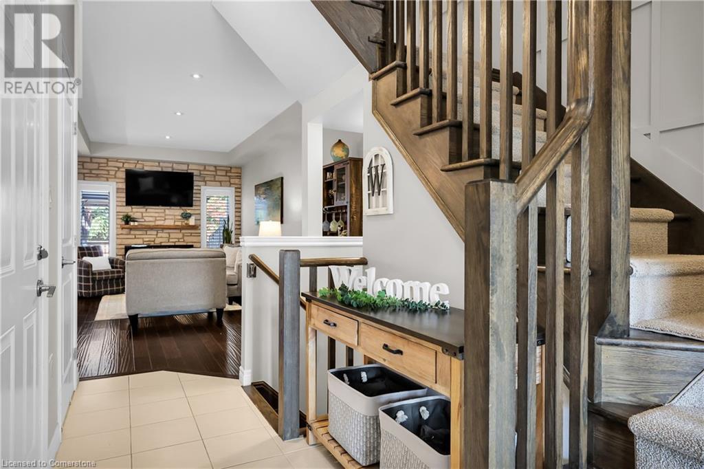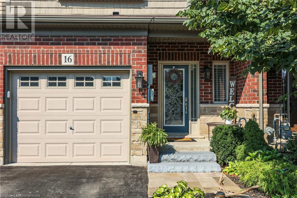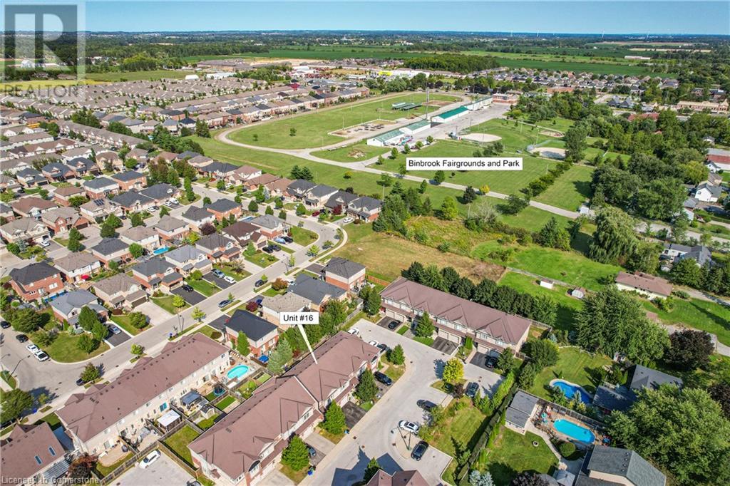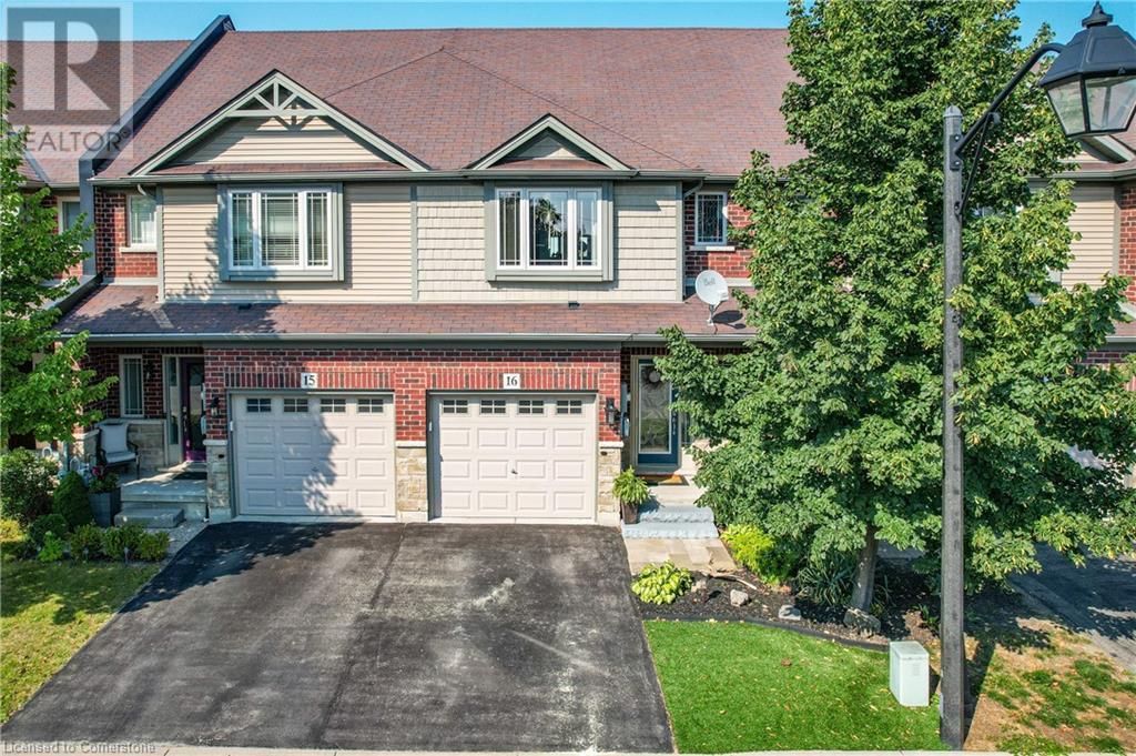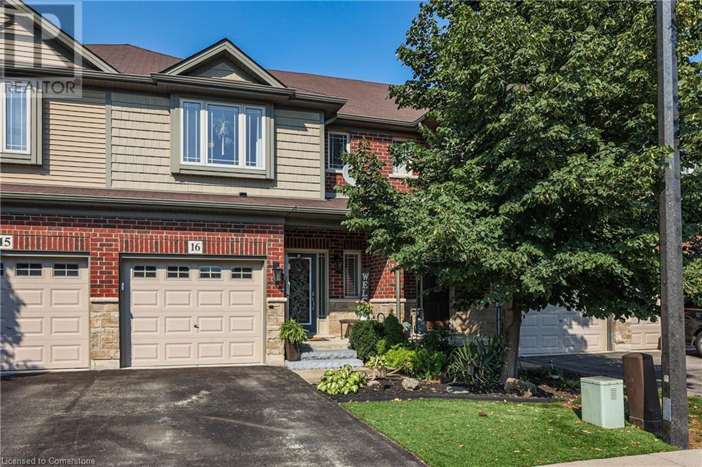 STUNNING FREEHOLD TOWNHOME ... Located in a trendy, family-friendly neighbourhood in Binbrook, find 16-310 Fall Fair Way. Central location close to great schools, Fairground Community Park, walking trails, restaurants, shopping & more. This STYLISH & FULLY FINISHED, 3 + 1 bedRm, 3 bath, 1490 sq ft townhome boasts many gorgeous upgrades throughout! OPEN CONCEPT main level offers a beautifully upgraded kitchen featuring white QUARTZ countertops & brkfst bar island, S/S appliances, upgraded pendant light fixtures & potlights, opening to living area w/updated electric fireplace w/brick surround & wood mantle. WALK OUT from dining area through sliding glass doors to fully fenced, maintenance-free yard w/deck & PRIVACY from tree-lined back fence. 2-pc bath & inside access to attached garage complete the level. Hardwood staircase w/runner & gorgeous feature wall leads to upper level, offering primary bedRm w/walk-in closet PLUS double closets & ensuite privilege to 4-pc bath w/QUARTZ counters; 2 more bedrooms & convenient LAUNDRY. Fully finished lower level offers IN-LAW POTENTIAL w/rec room w/wet bar/kitchenette, bedRm/office, 2-pc bath & storage. Great curb appeal, front landscaping & BONUS Turf in front & back yard means NO LAWN MAINTENANCE! UPDATES include A/C '22, kitchen '21 & MORE. Low road fee of $128/mo includes garbage removal & maintenance of grass & snow in common areas. CLICK ON MULTIMEDIA for video tour, drone photos & more. (id:55009)
